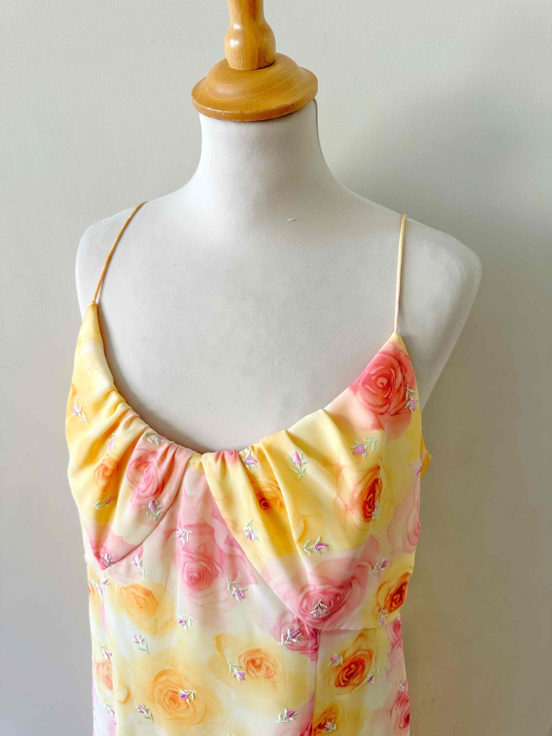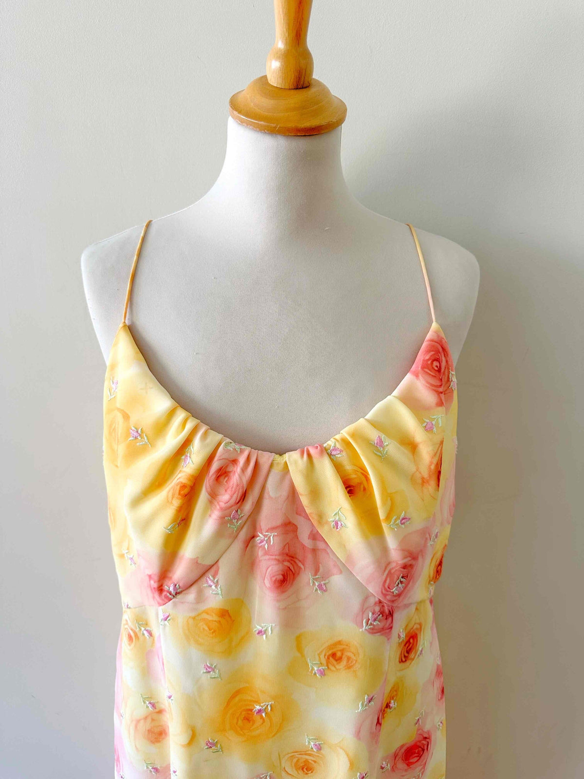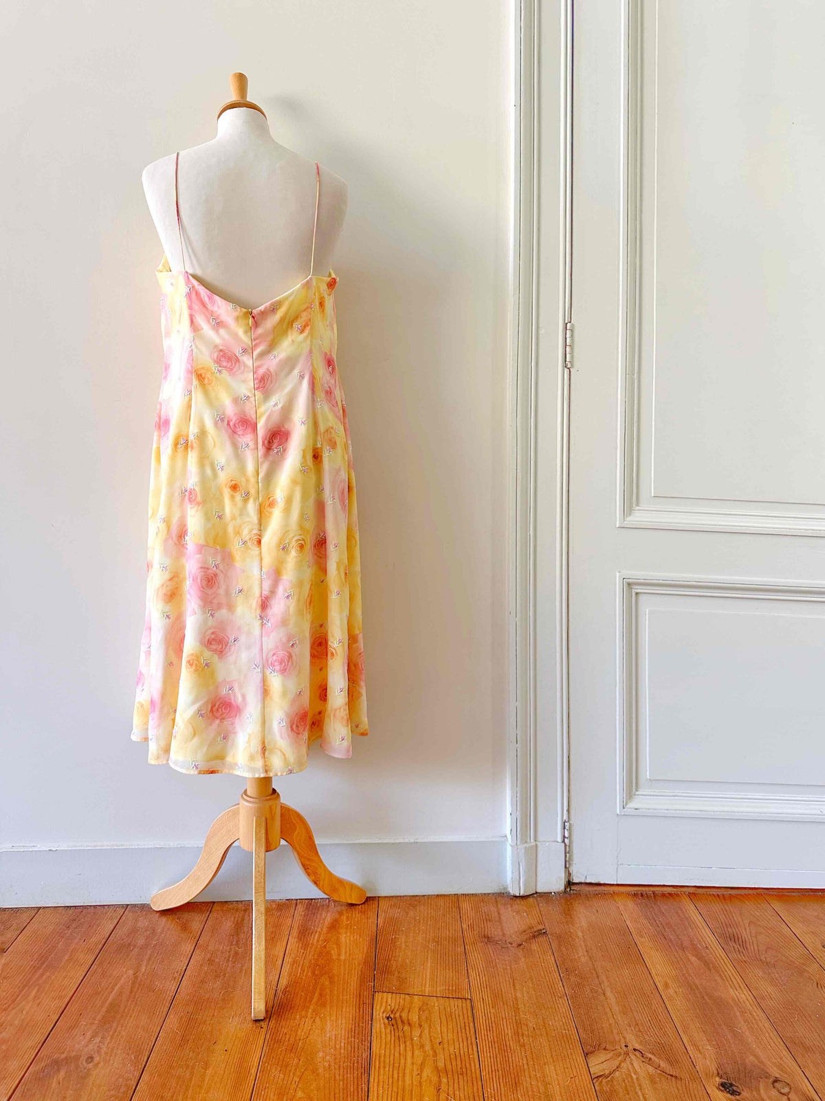 Prix unitaire parRobe nuisette Escada, en soie jaune et voile imprimé de fleurs roses, oranges et jaunes, rebrodé de petites fleurs roses et vertes.