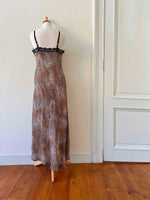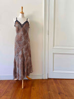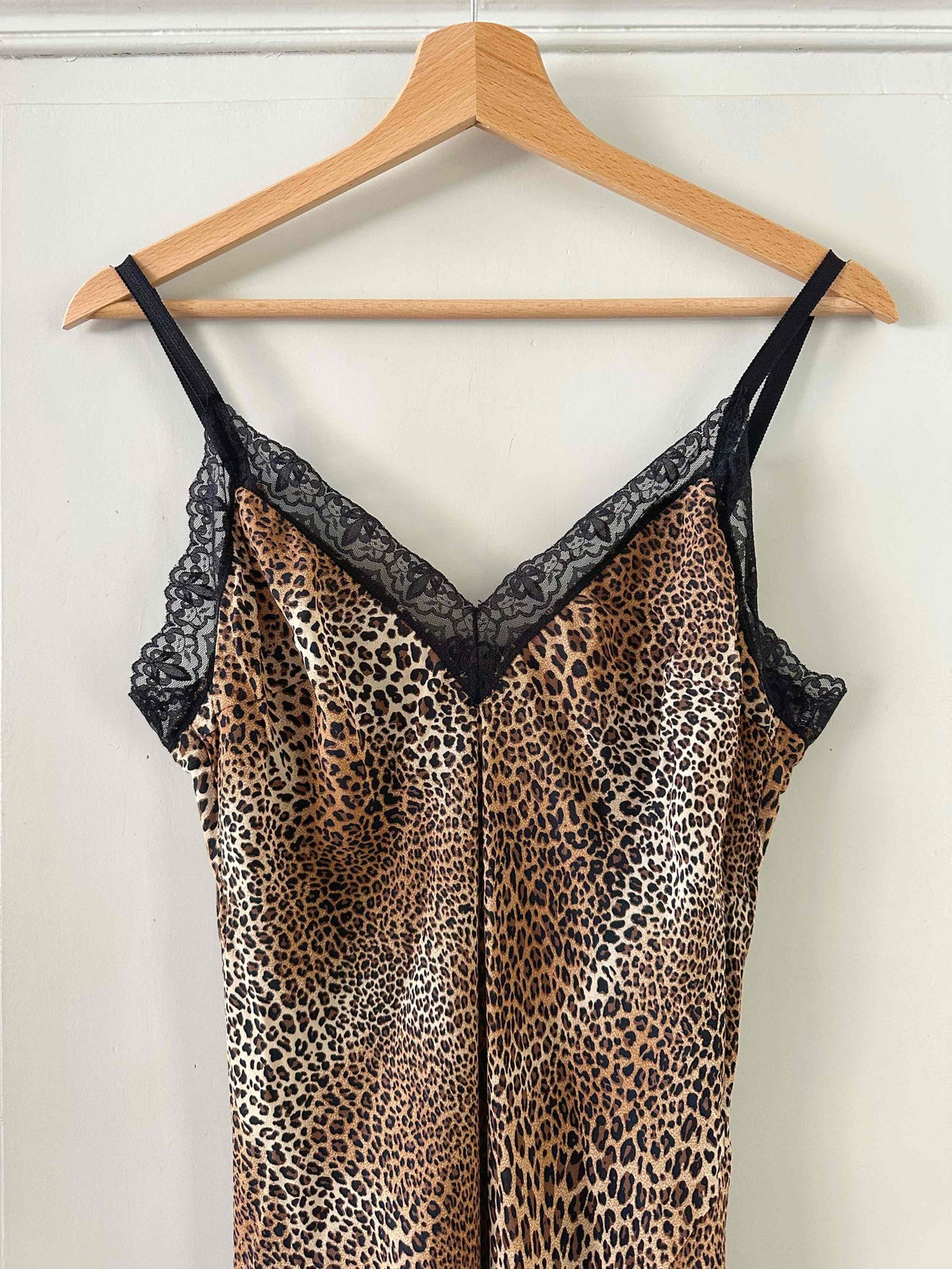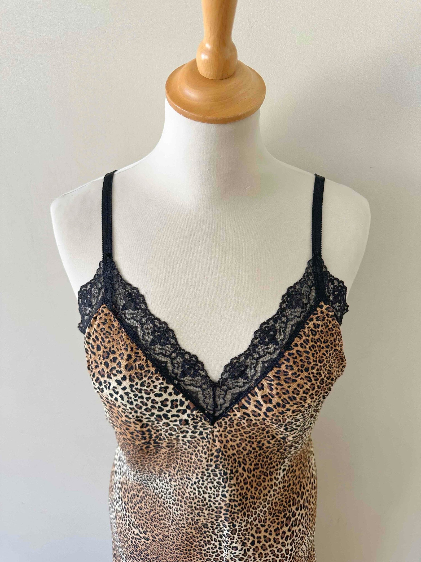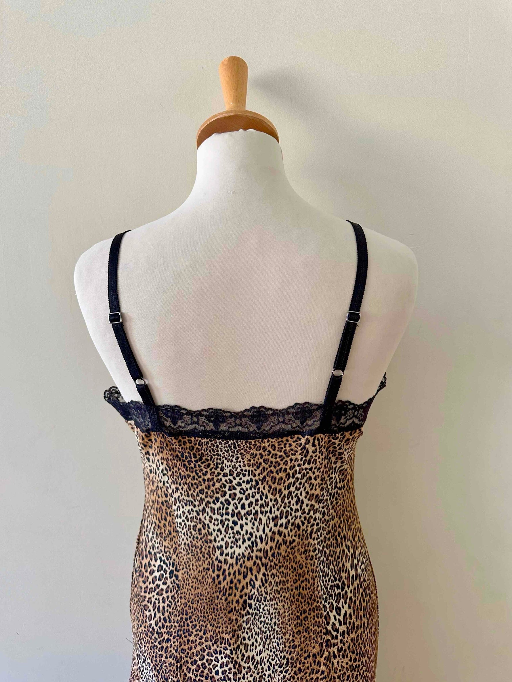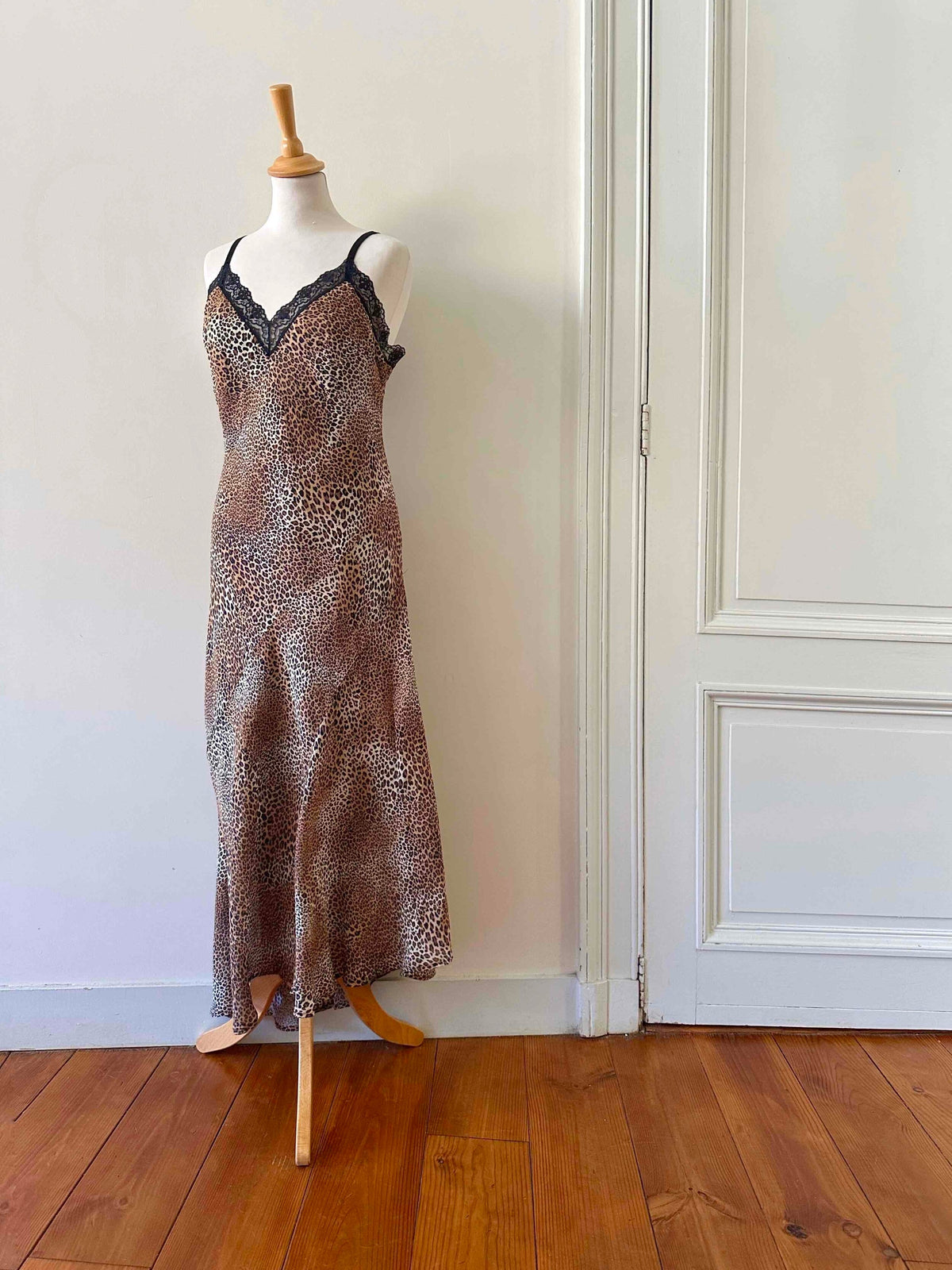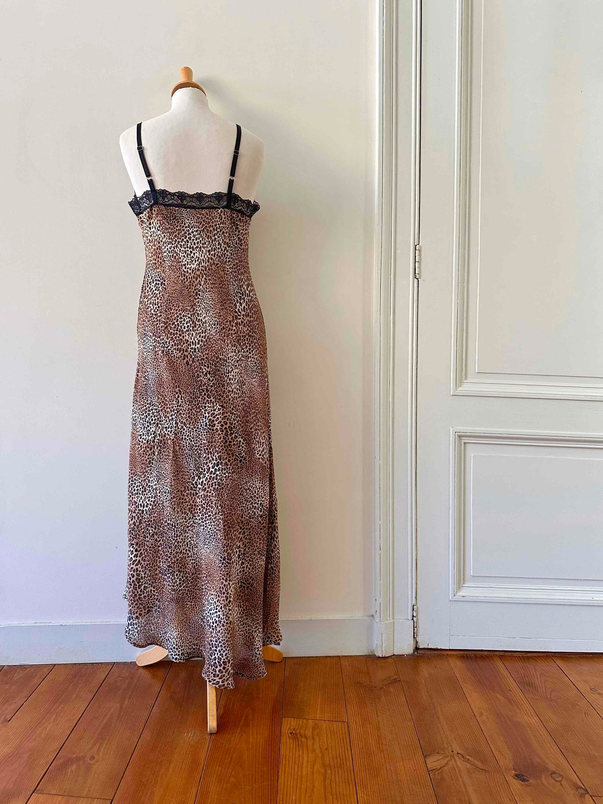 Robe nuisette léopard, en viscose imprimé motifs léopard chocolat, camel, beige et noir. Bretelles spaghettis réglables, encolure brodée de dentelle noire, bas sirène, taillée en biais, fabriquée en Italie, taille 38 portée ici sur un mannequin T36, aisselles 46cm.