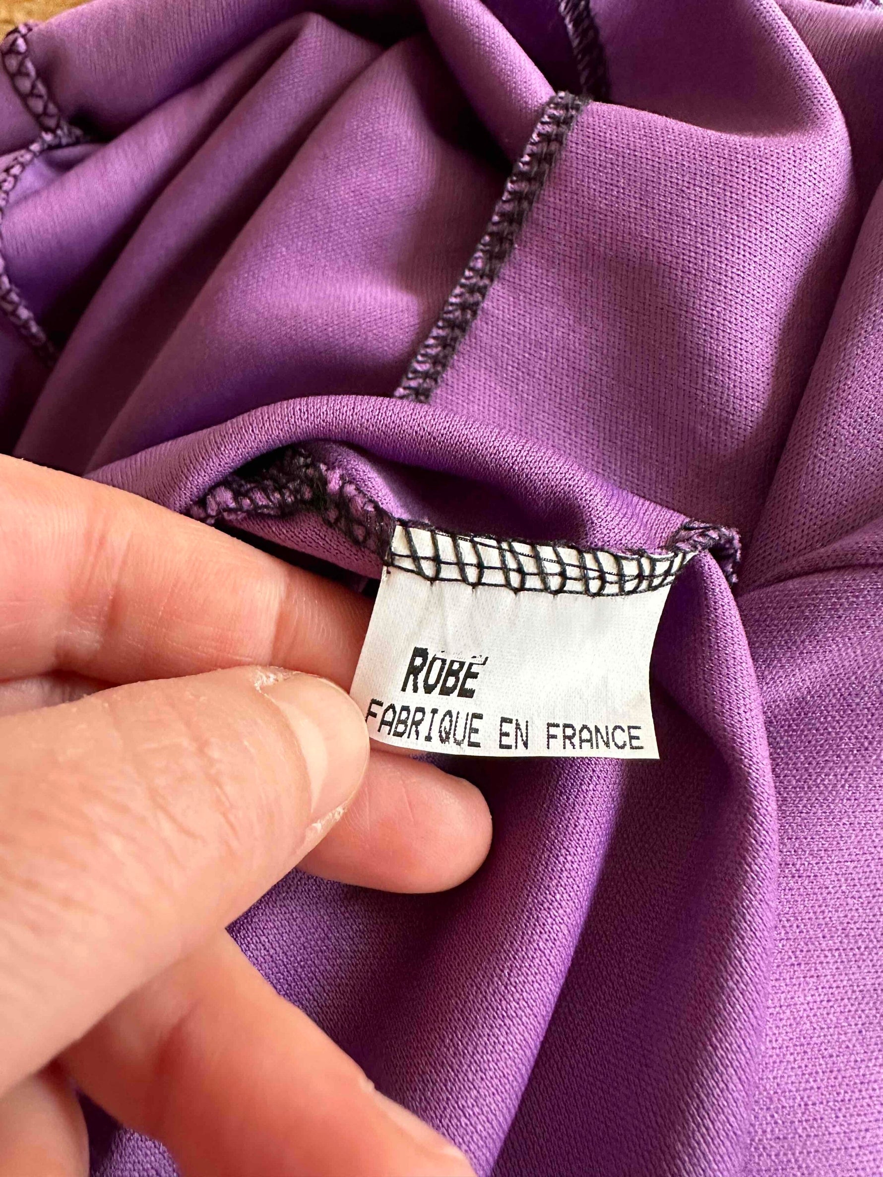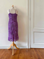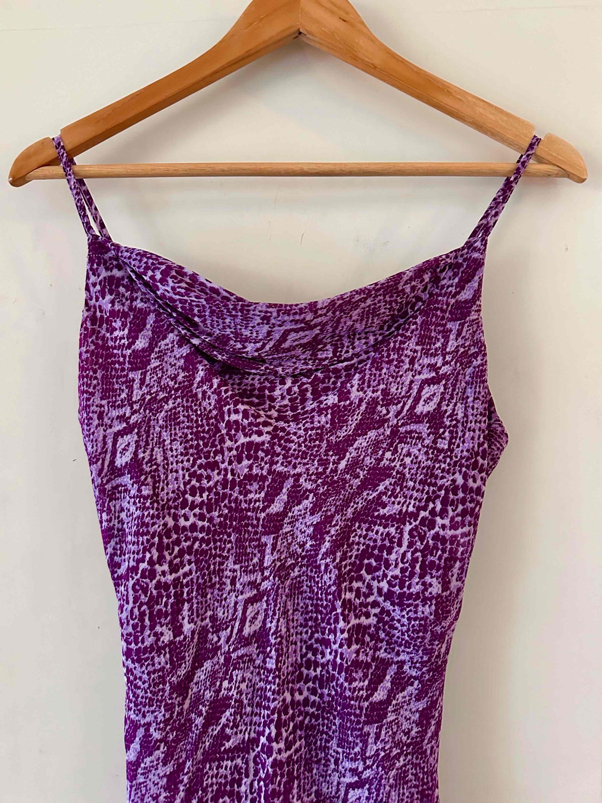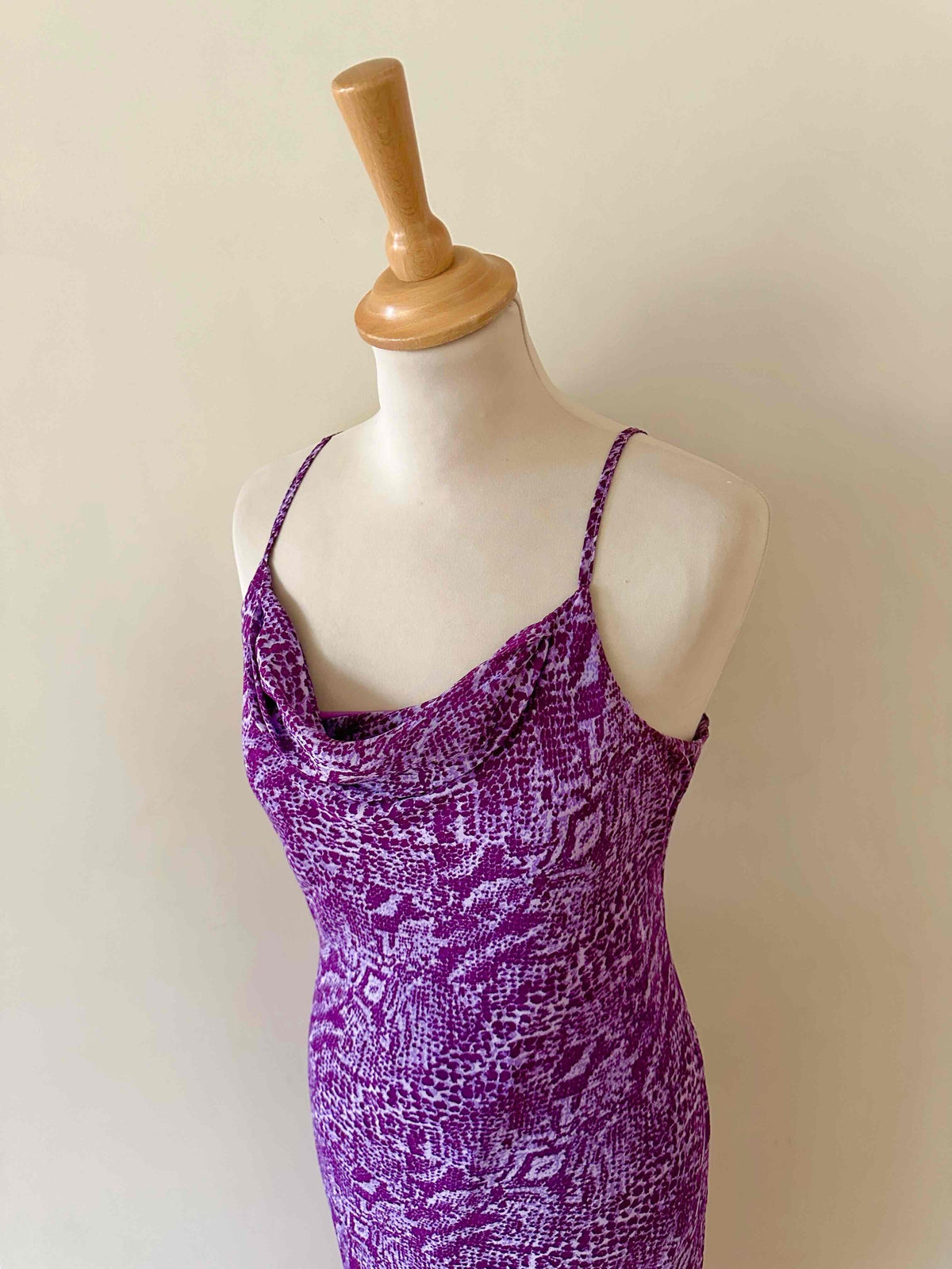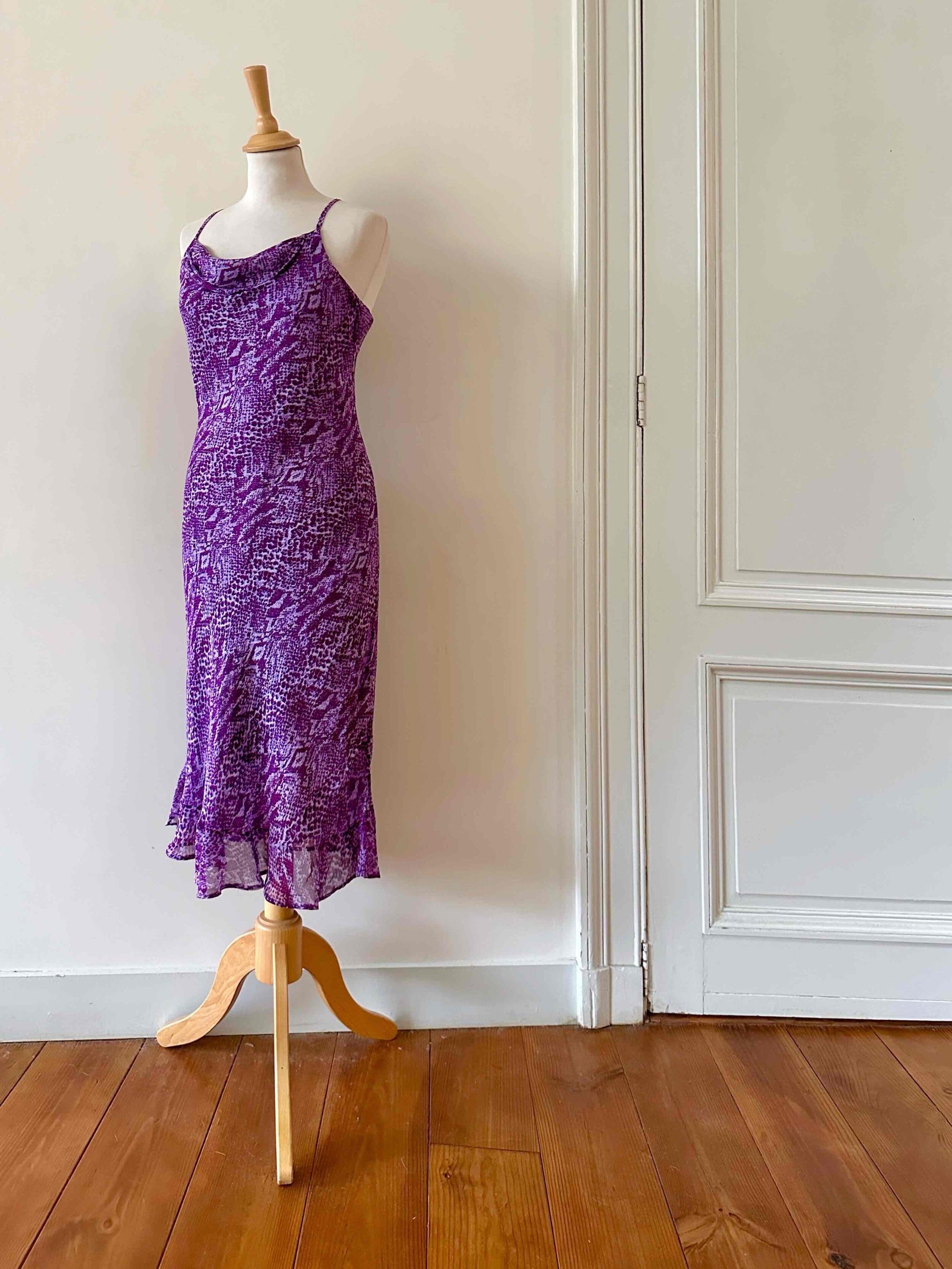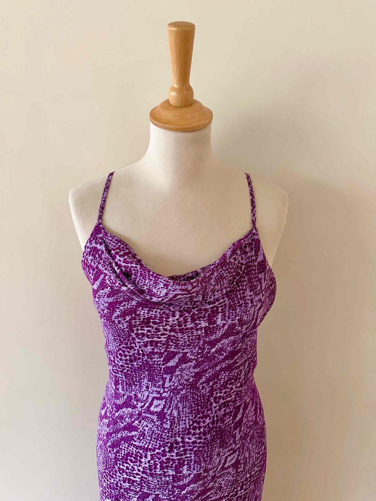 Robe nuisette wild, en voile viscose doublé violette, imprimée reptile python lilas, bretelles spaghettis slip dress, encolure drappée benitier, forme fit and flare en biais et bas volanté, fabriquée en France, taille 36 portée ici sur un mannequin T36, aisselles 43cm.