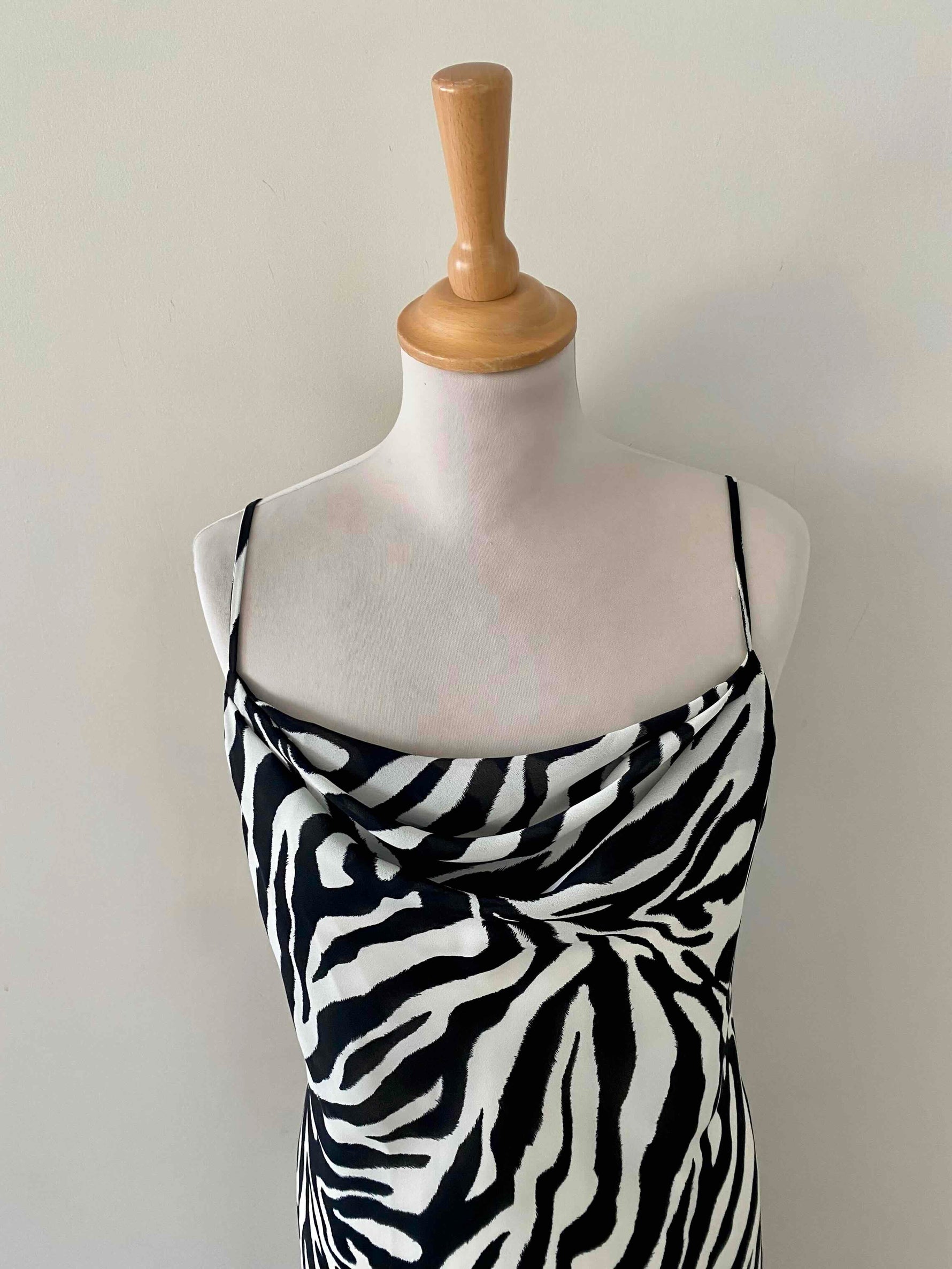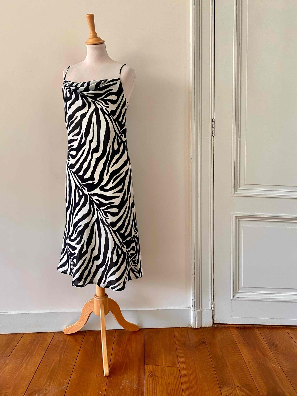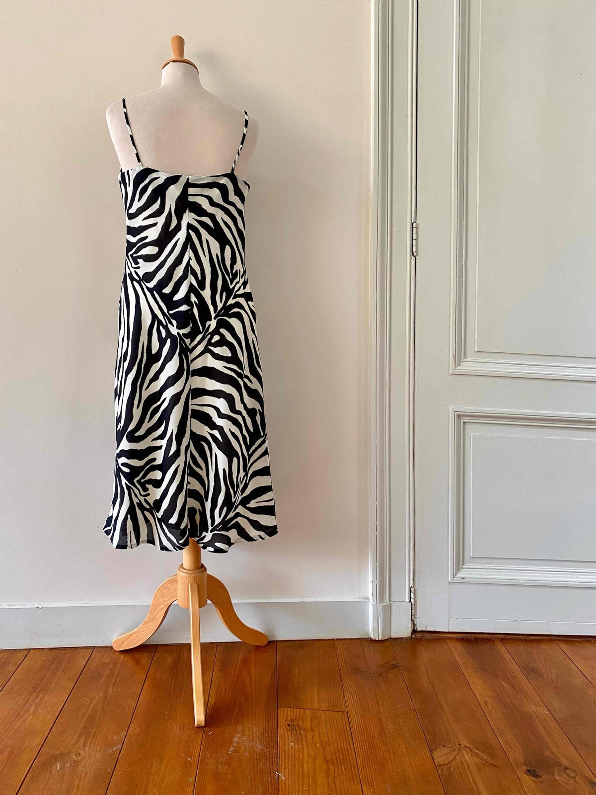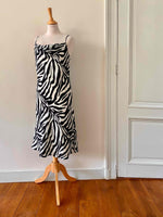 Robe nuisette zébrée, en voile viscose doublée blanche imprimée grand motif zèbre noir, bretelles spaghettis, encolure benitier drappée, forme fit and flare en biais, fabriquée en France, taille 36 et 38 portée ici sur un mannequin T36, aisselles 44cm.