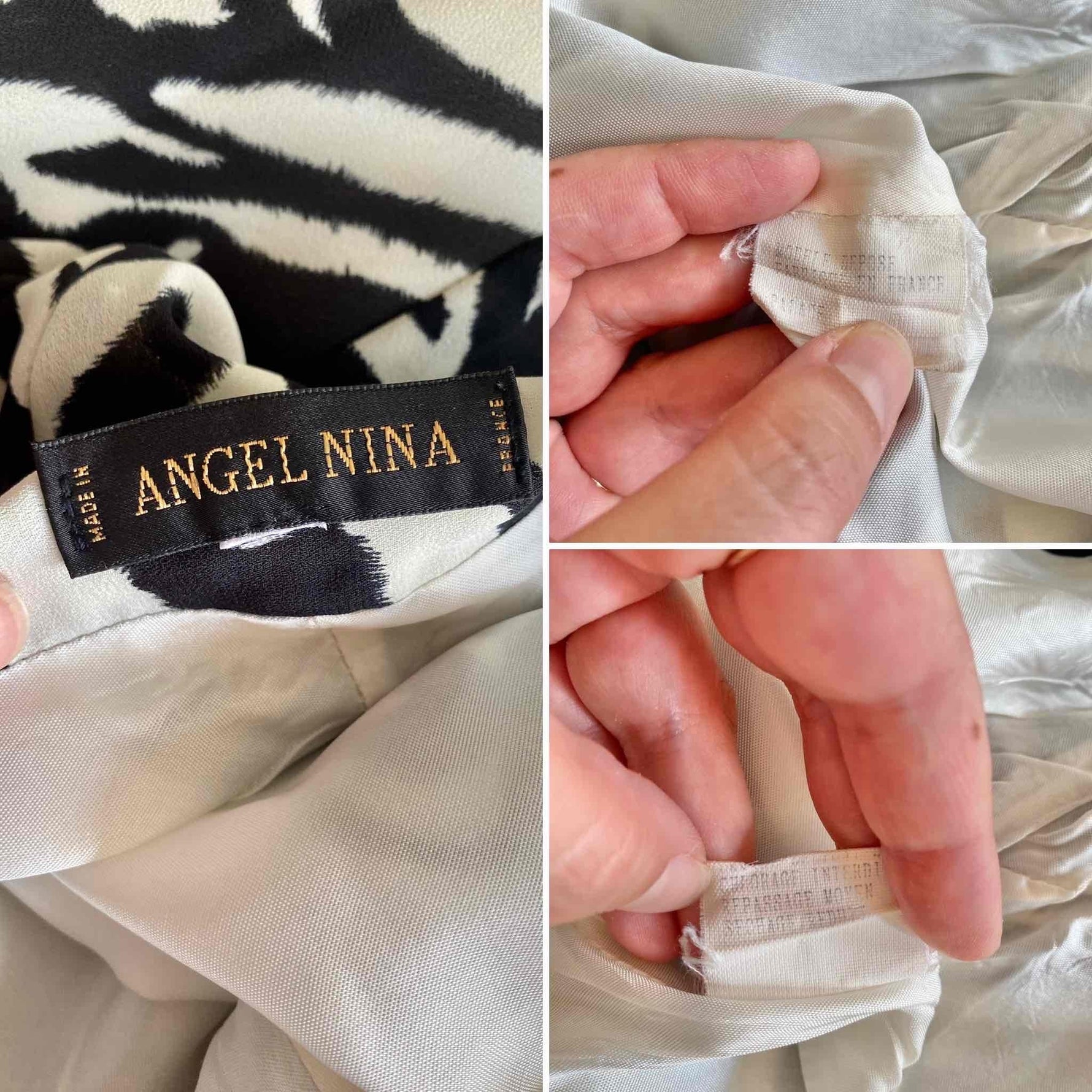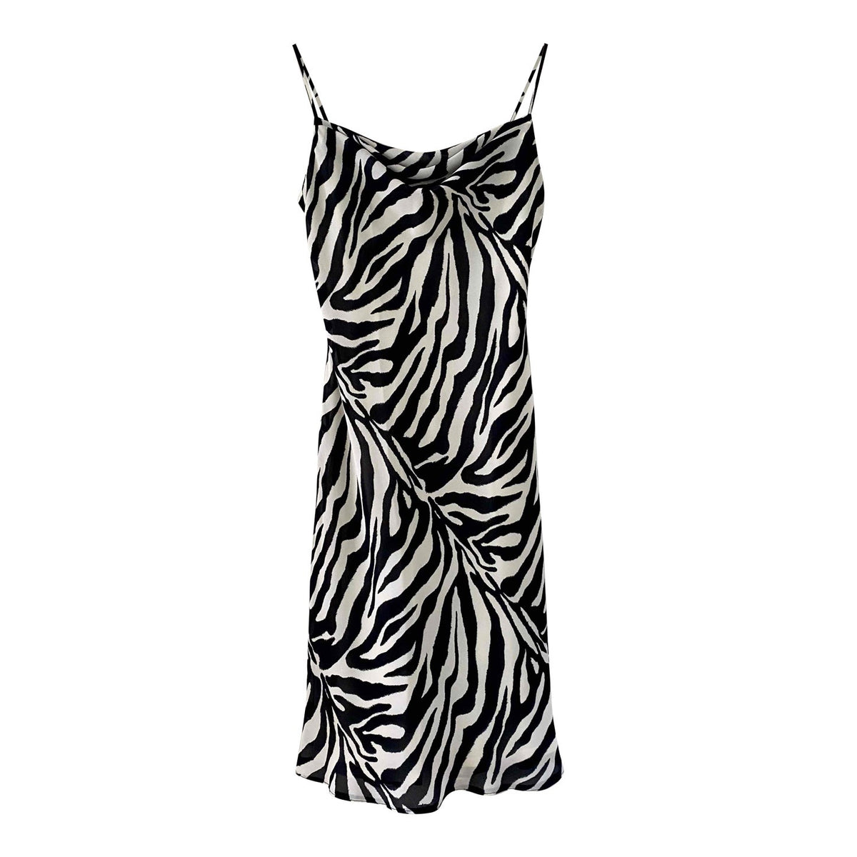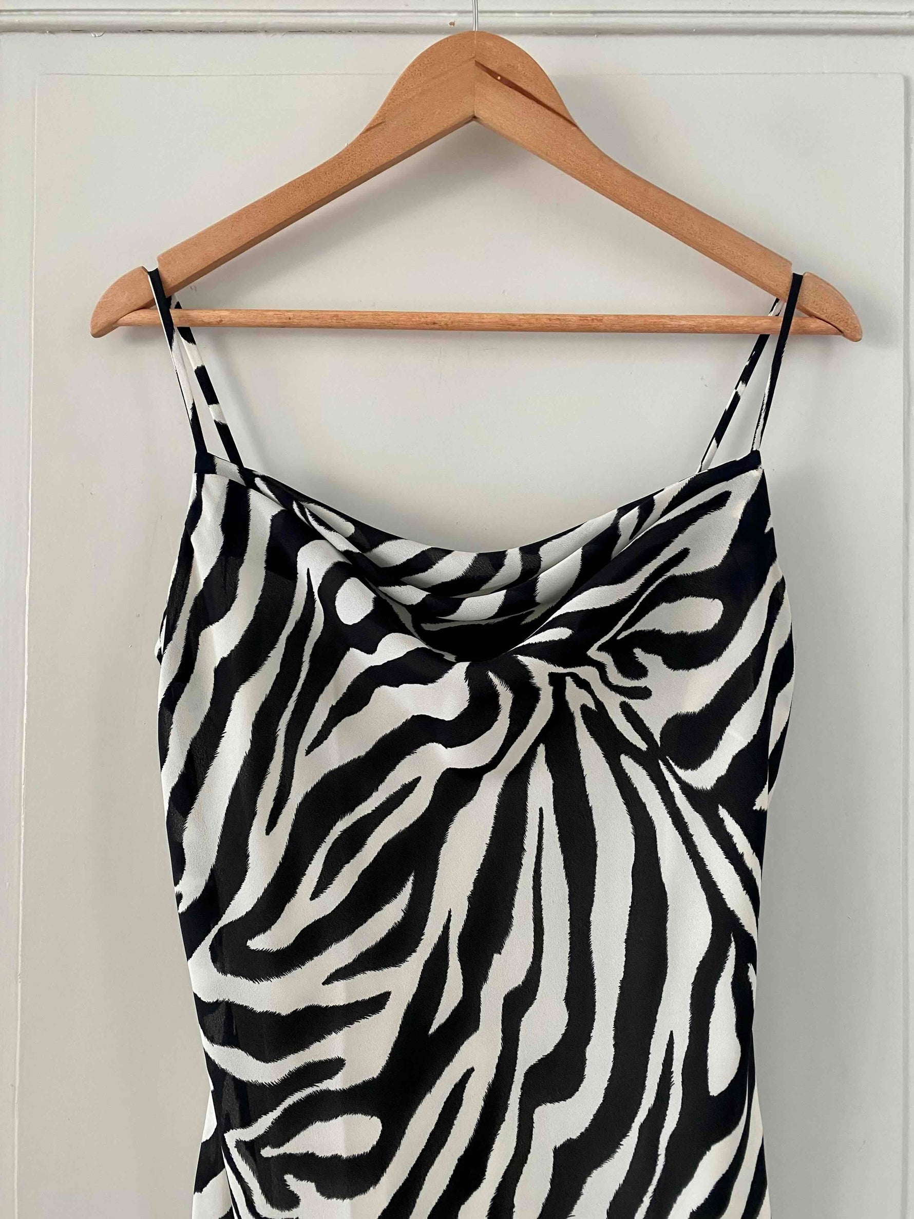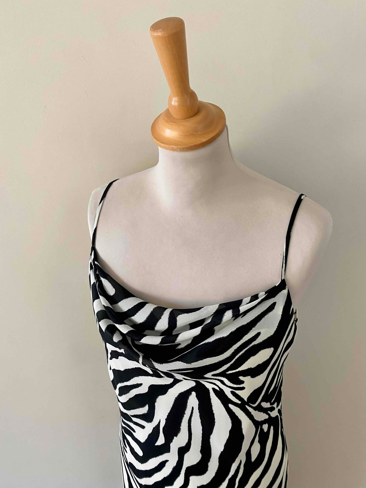 Robe nuisette zébrée, en voile viscose doublée blanche imprimée grand motif zèbre noir, bretelles spaghettis, encolure benitier drappée, forme fit and flare en biais, fabriquée en France, taille 36 et 38 portée ici sur un mannequin T36, aisselles 44cm.