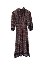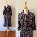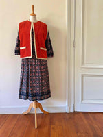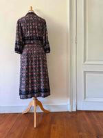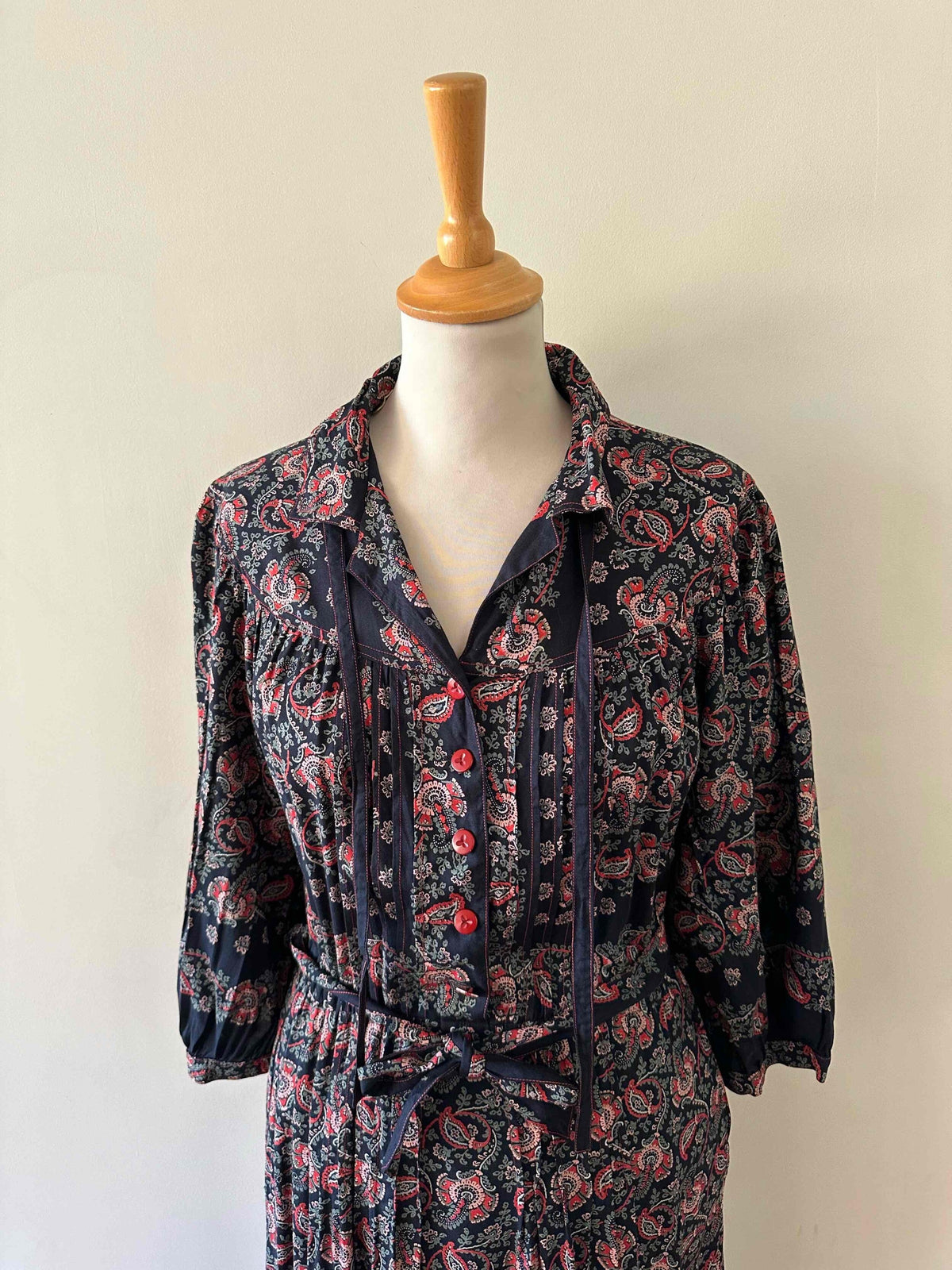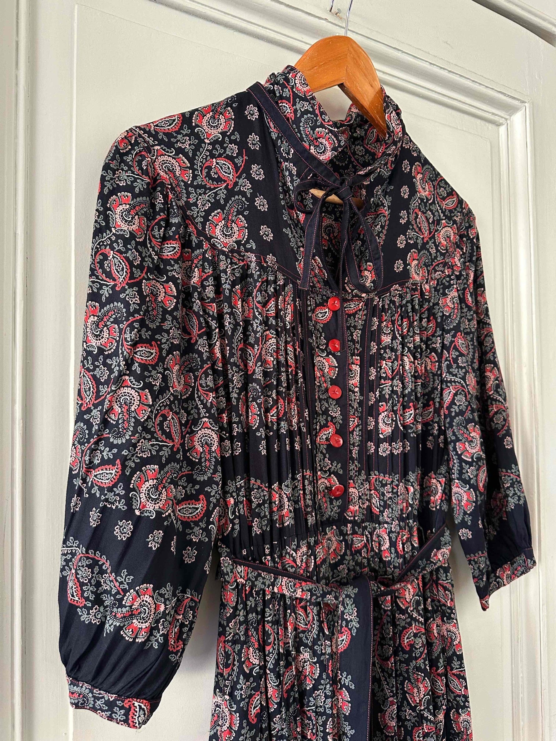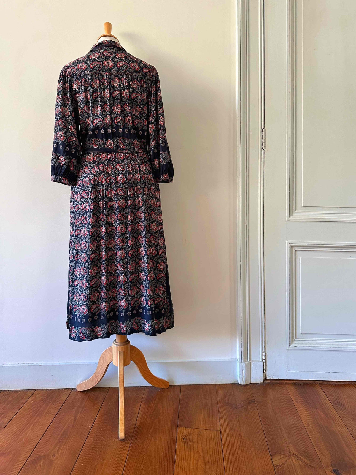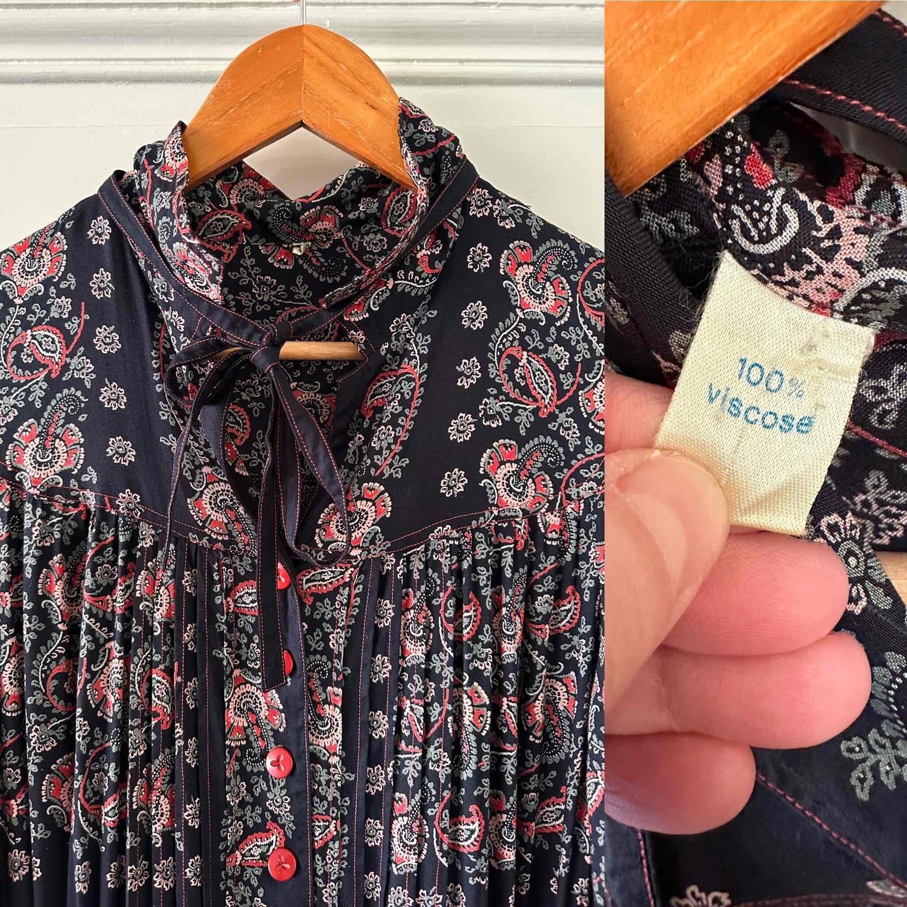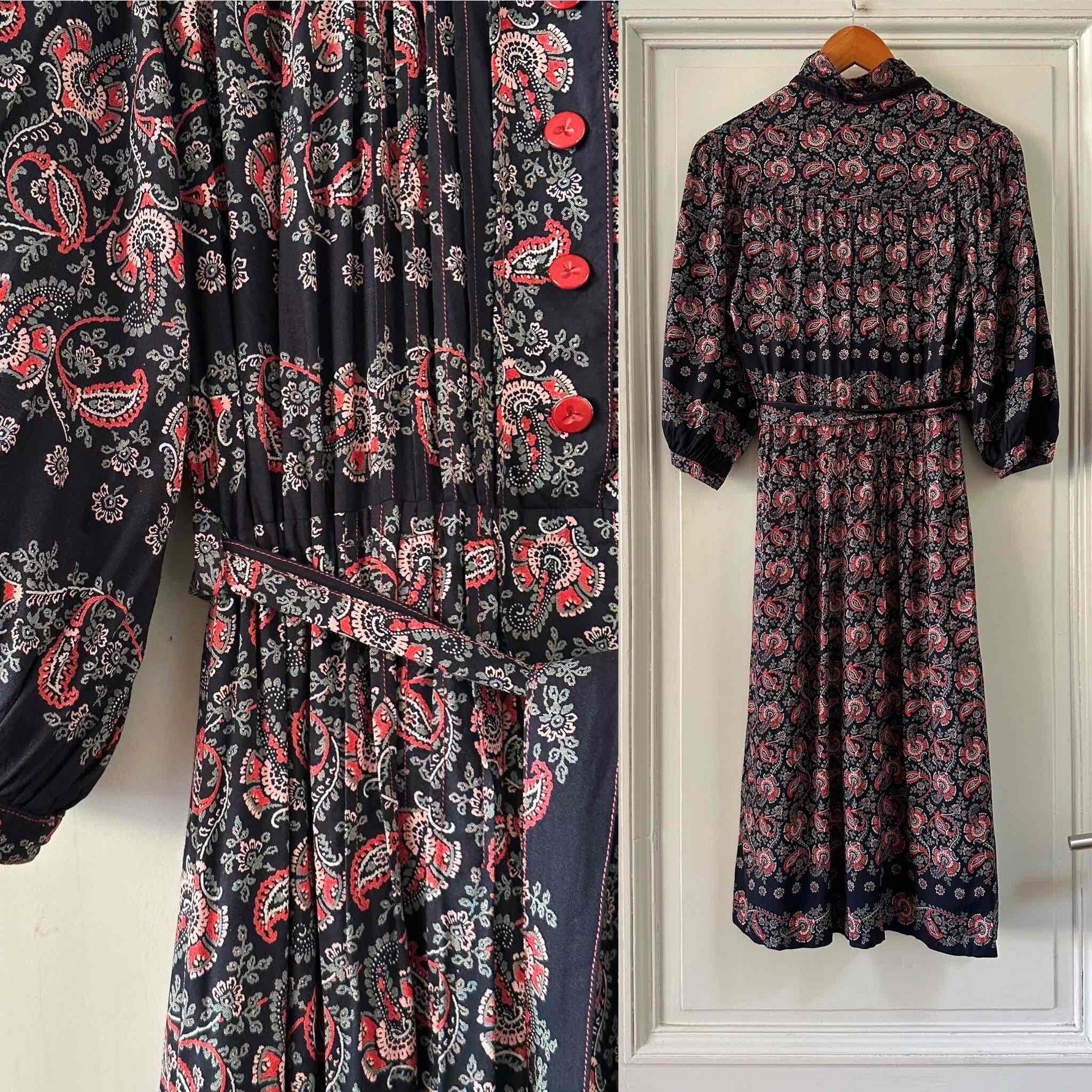 Robe paisley 70s, en viscose flanelle noire imprimée motifs paisley dans les tons oranges terracotta, vert amandes et écrus, haut boutonné orange, col chemisier à nouer lavallière, fermeture éclair côté, ceinture taille à nouer, manches longues ballons, fabriquée en France, taille 36 portée ici sur un mannequin T36, aisselles 45cm.