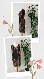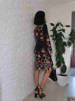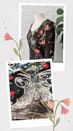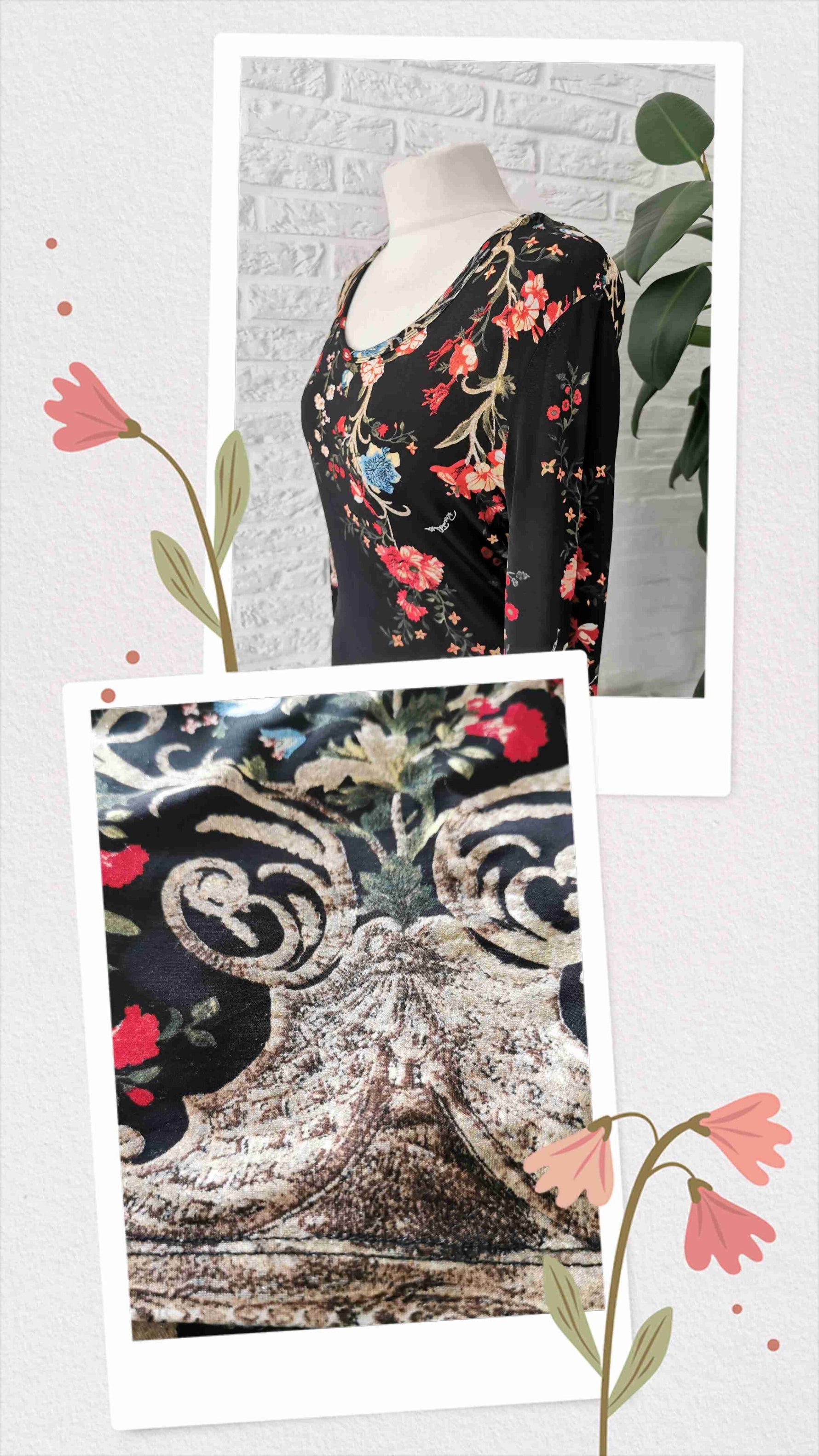 Fleurs rouge, bleu, beige et du lurex dans le bas des manches et la base