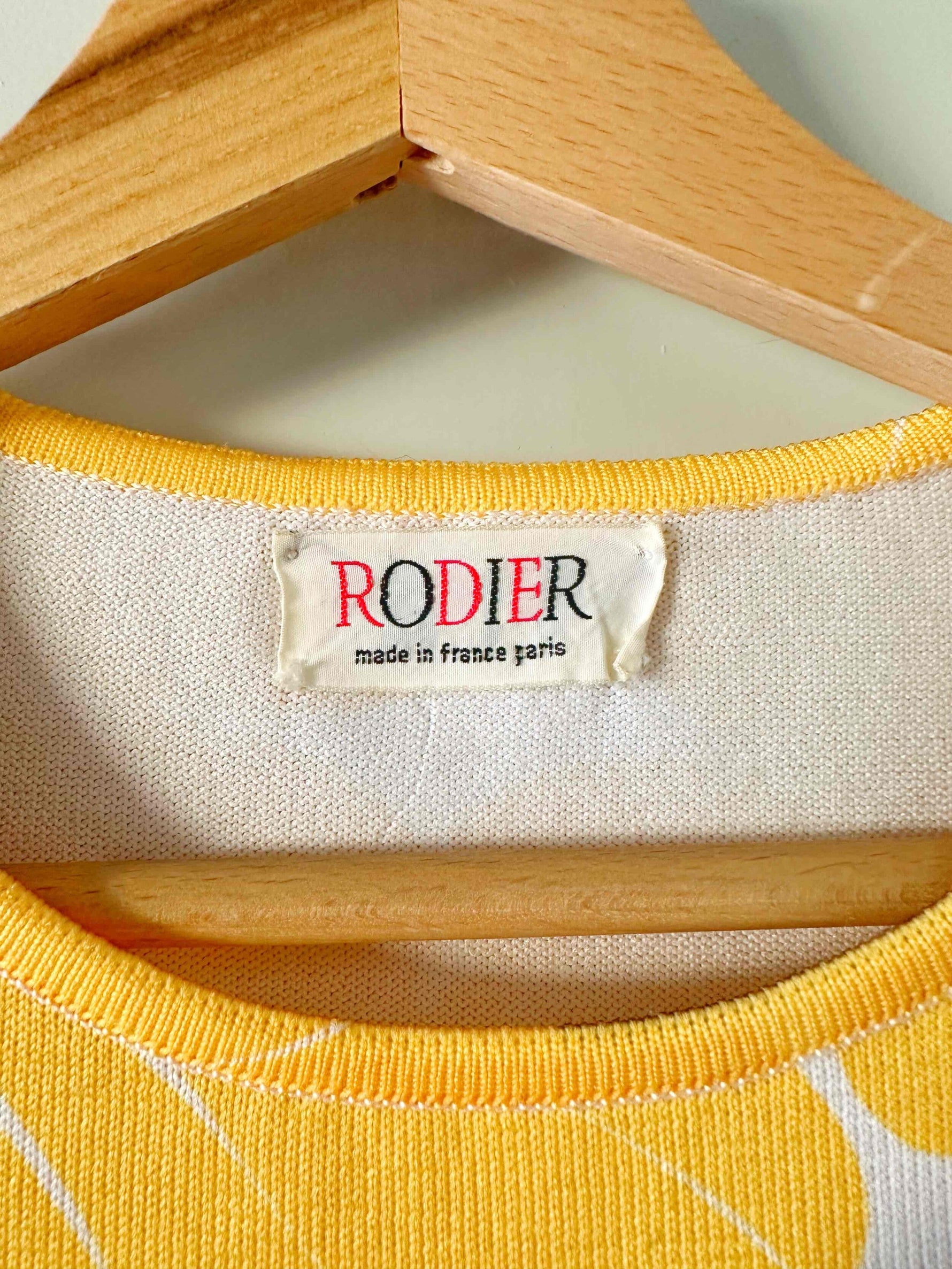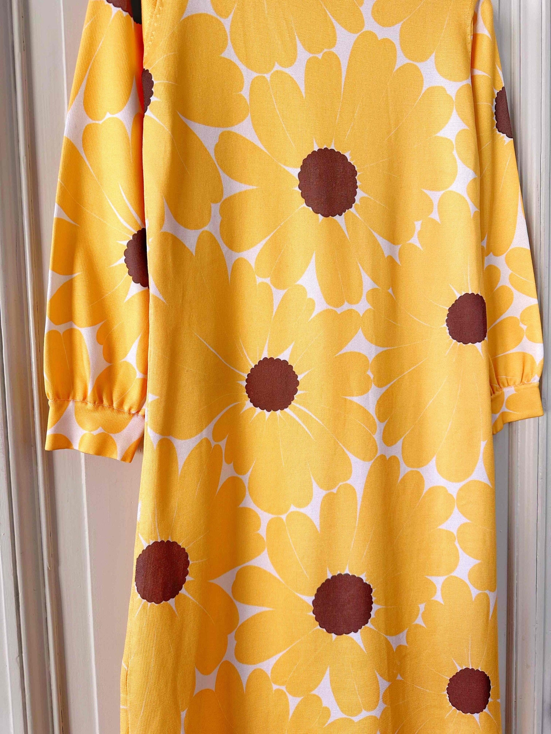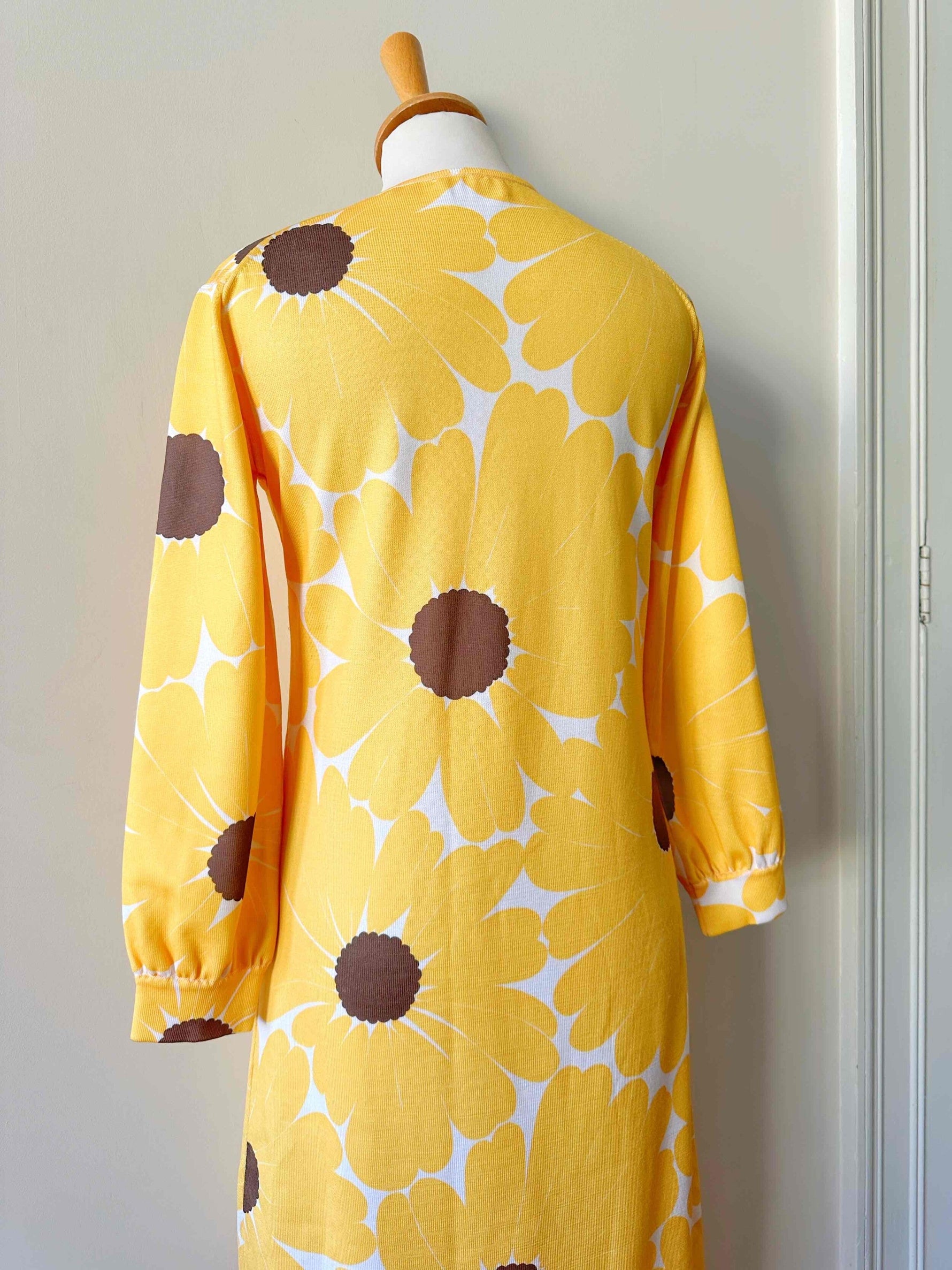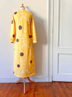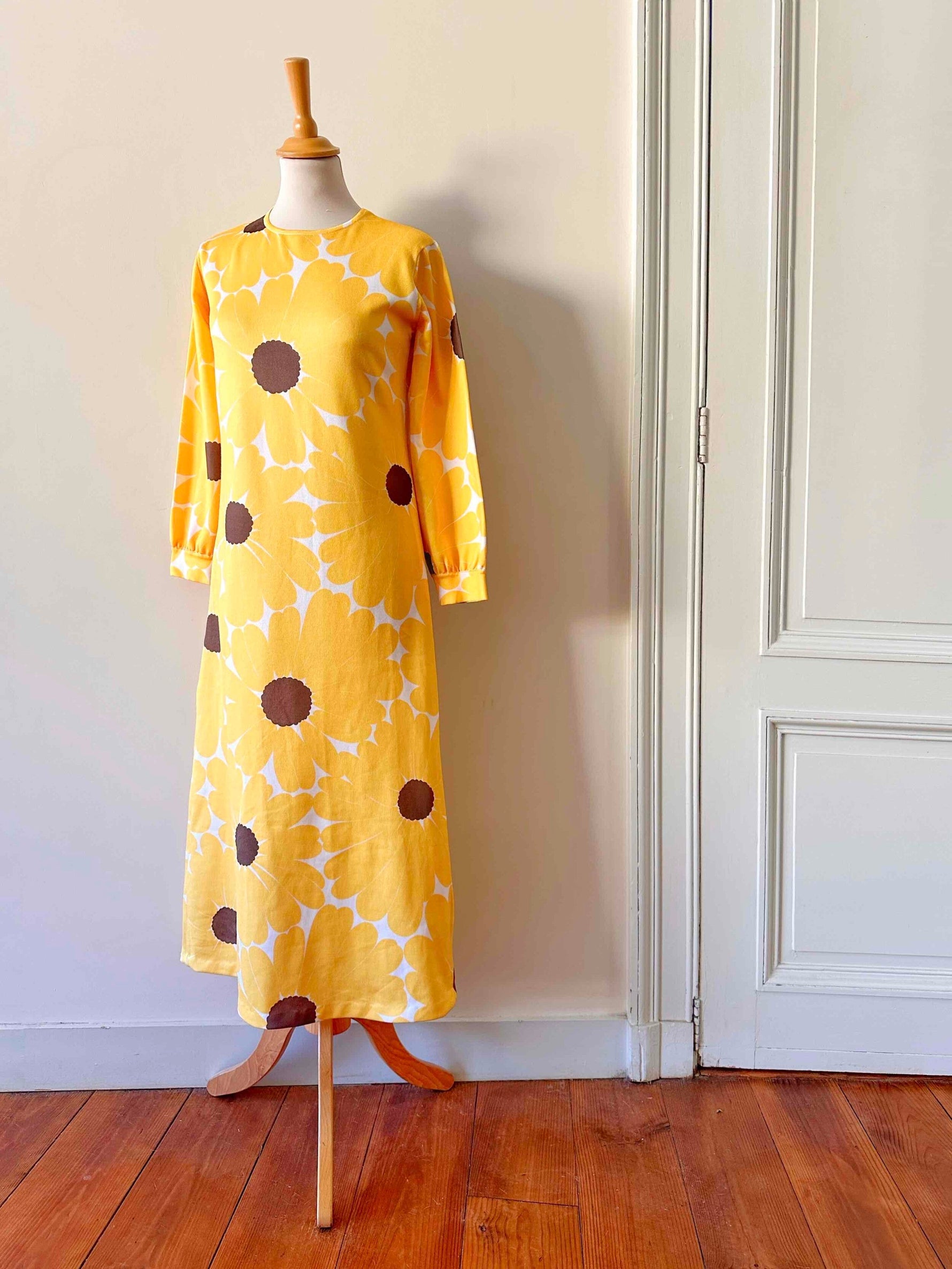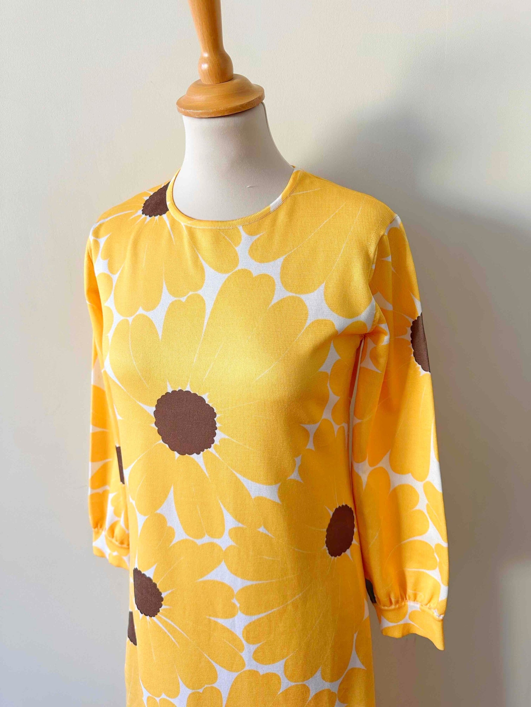 Prix unitaire parRobe a fleurs Rodier, en maille fine coton acrylique, blanc imprimée grand fleurs marguerites jaunes et marrons, manches ballons 3/4, longue et trapèze, années 70s, taille 36 portée ici sur un mannequin T36, aisselles 44cm.