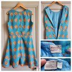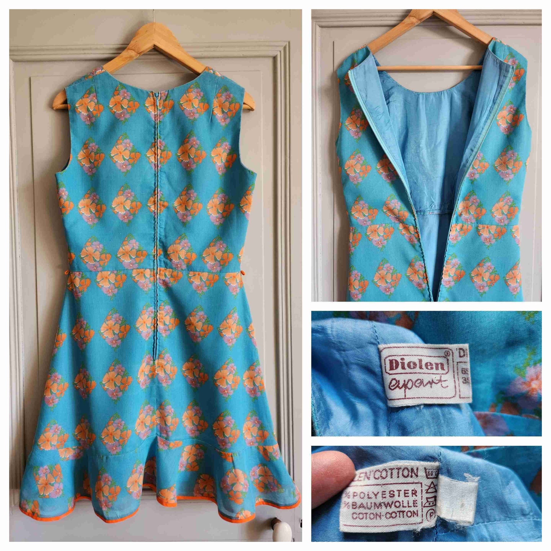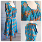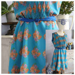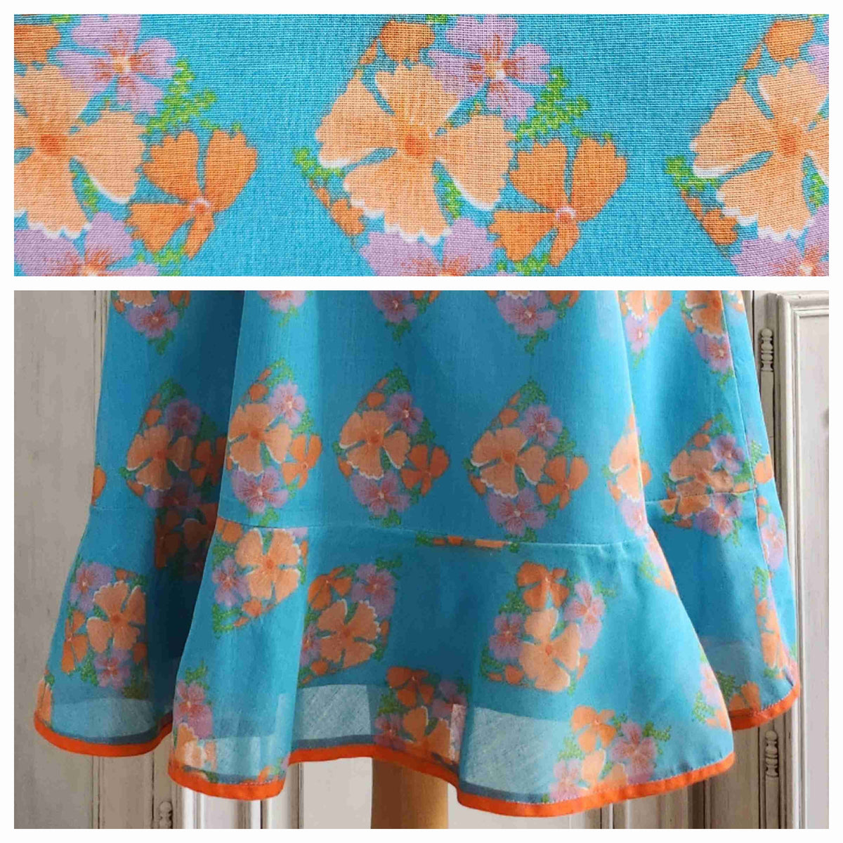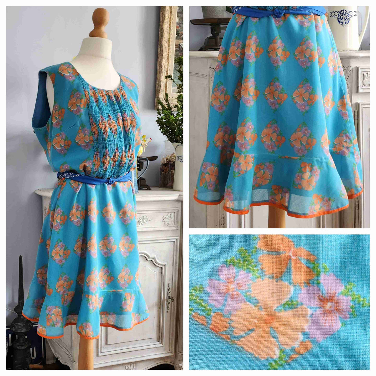 Prix unitaire parRobe sans manches en voile coton mélangé, à fleurs orangé sur fond turquoise, corsage à smocks devant, taille marquée, jupe corolle base volant ondulant finition biais orangé. Mini passants pour ceinture (non fournie). Doublée. Zippée au dos. Poitrine 47 cm.