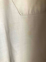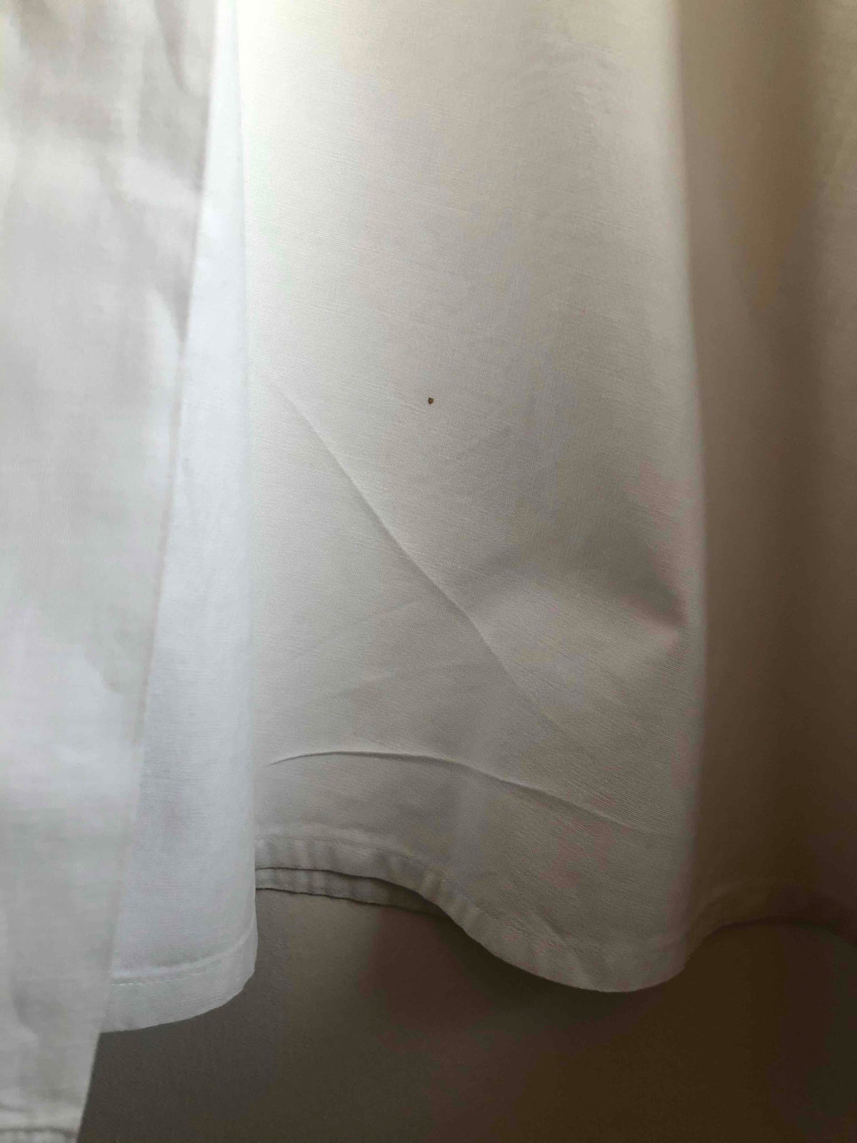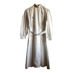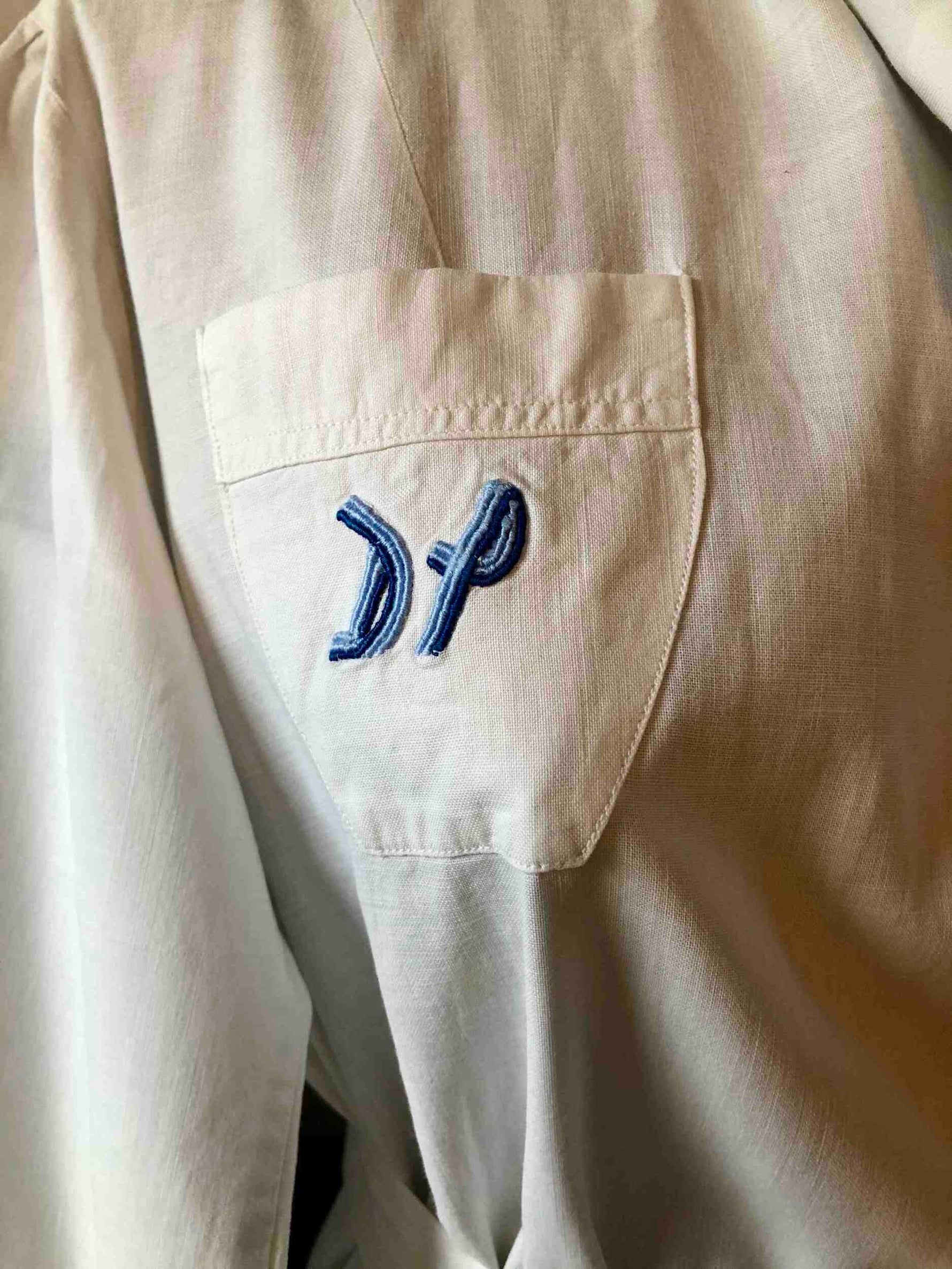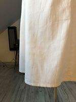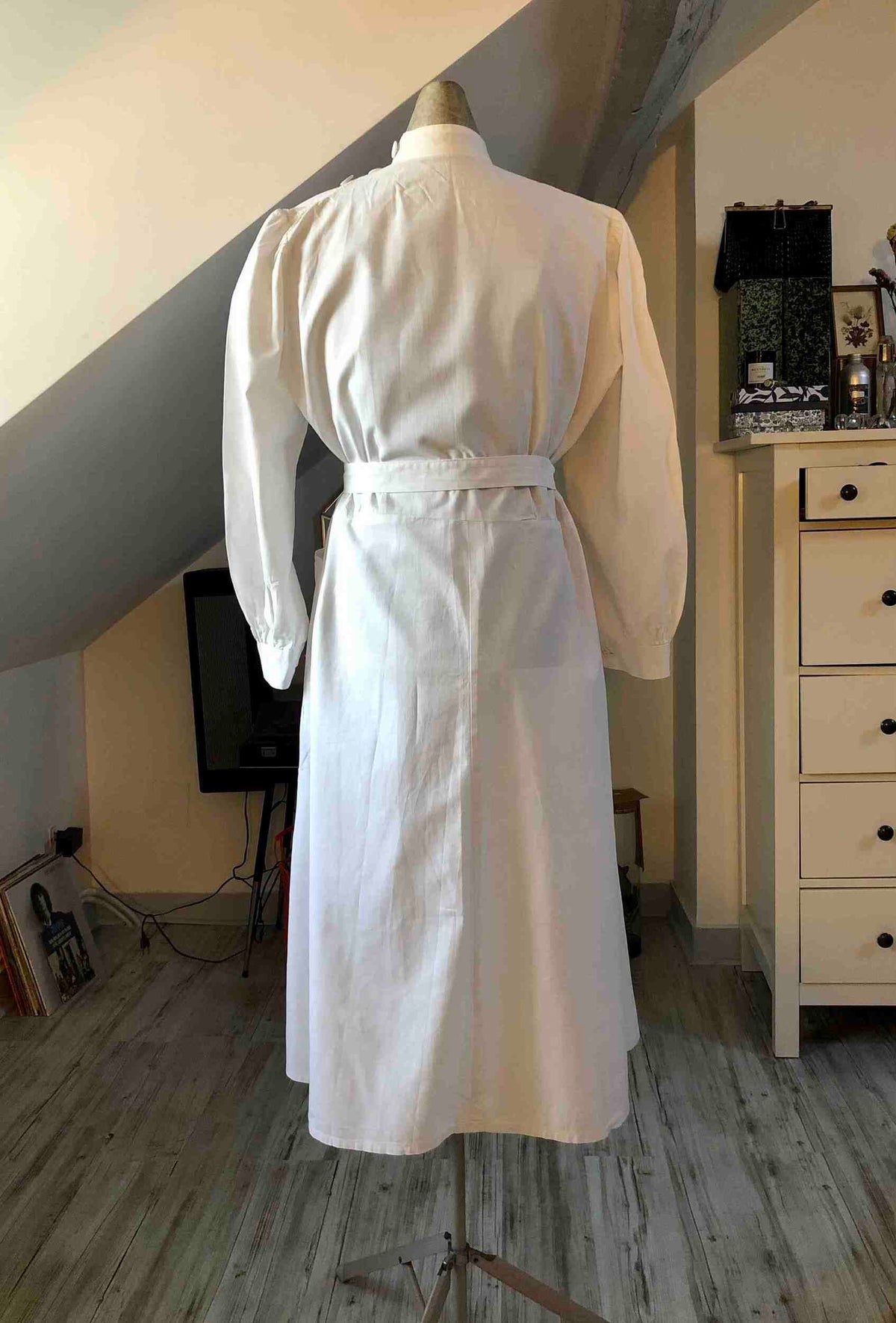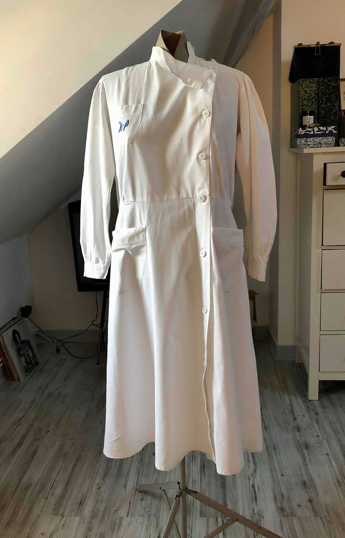Prix unitaire parRobe tablier en coton blanc, uniforme de lycéenne des années 40. Travail de couturière. La coupe est droite en haut (resserrée par une ceinture) et s’évase à partir de la taille. Elle se ferme par des boutons déportés à gauche. Col boutonné, pinces à la taille et dans le dos, fronces aux épaules et aux poignets, 3 poches plaquées, broderie sur la poche poitrine réalisée à la main. C’est une rareté, en bel état de conservation. Largeur de la ceinture : 36,5cm.