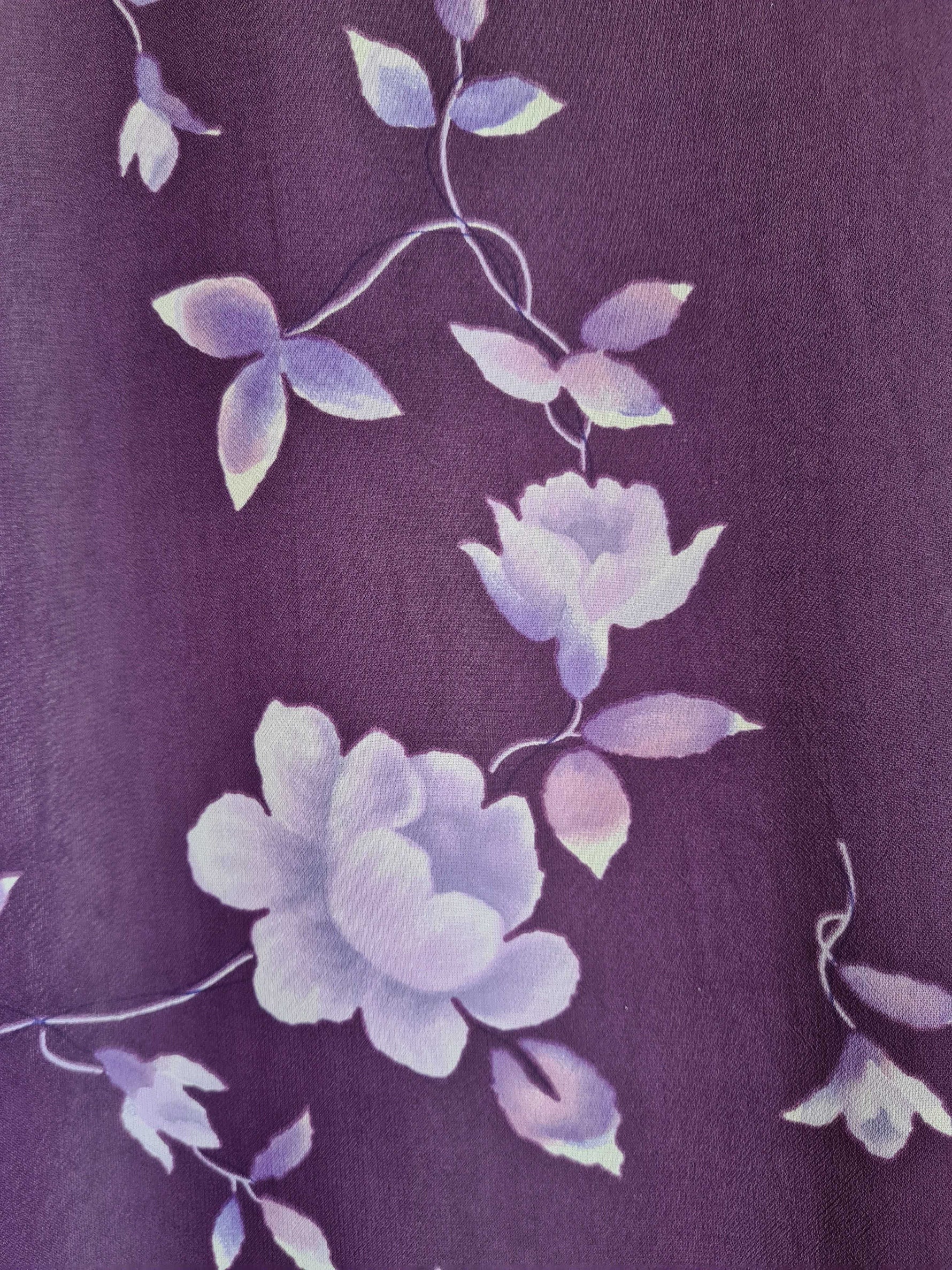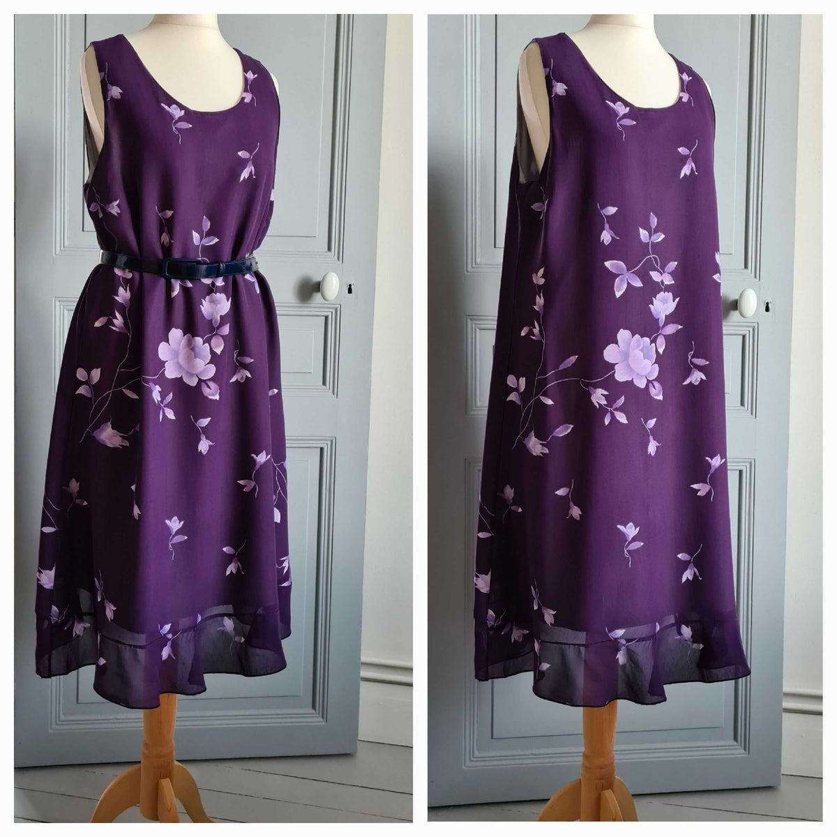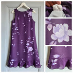 Prix unitaire parRobe trapèze à fleurs lilas sur fond violet, sans manches, à enfiler. Doublée. Coupe fluide, petit volant à la base. Pièce 100% viscose, fabriquée en France. Poitrine 48 cm (ceinture non fournie).