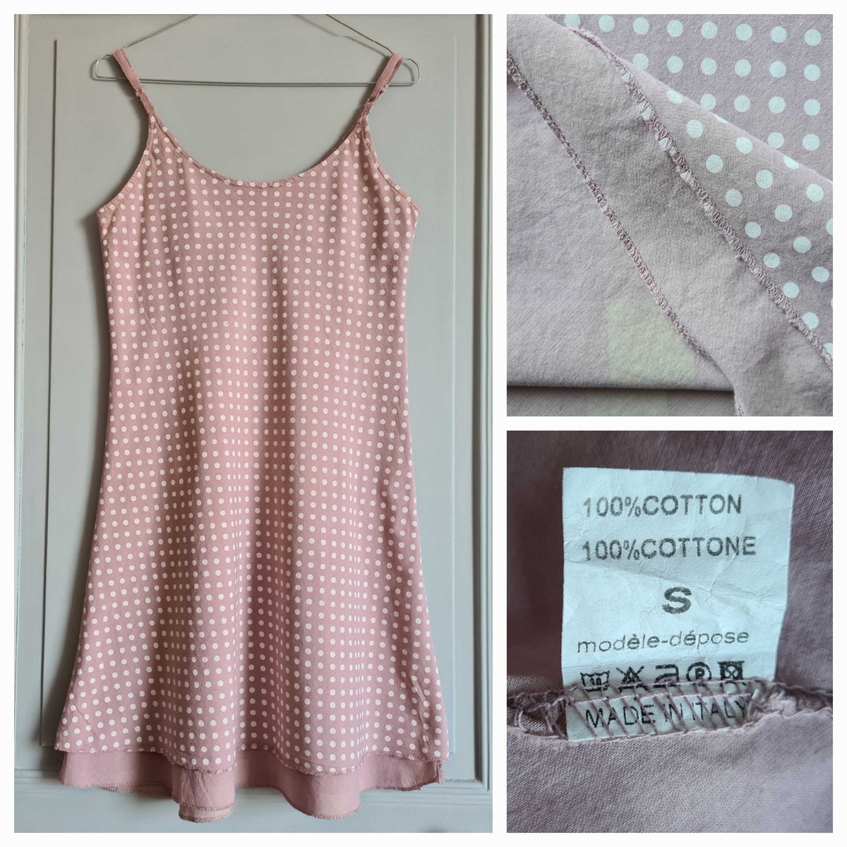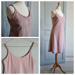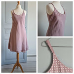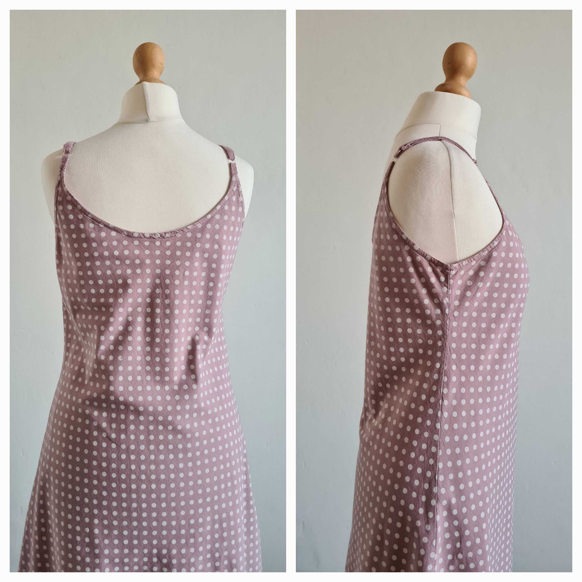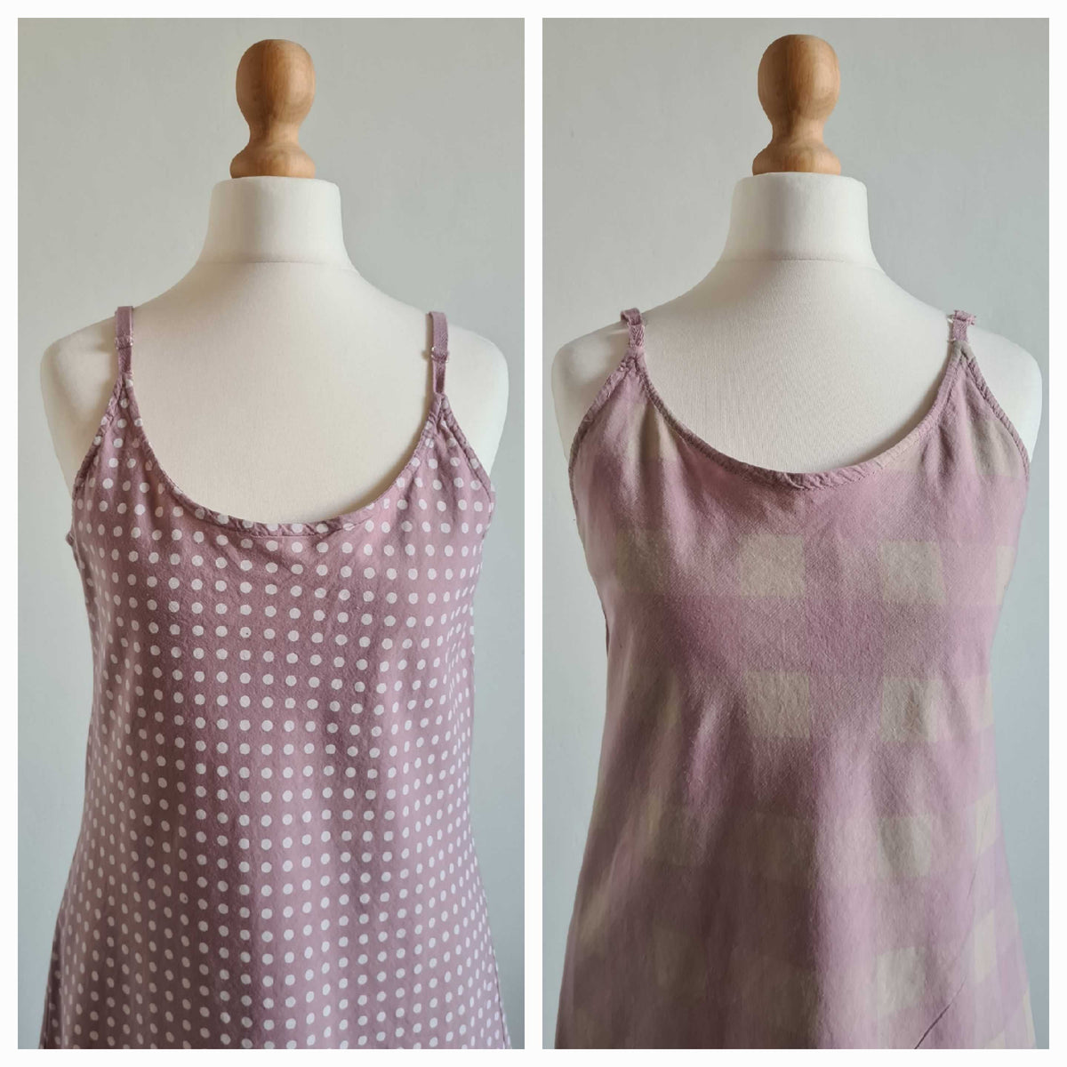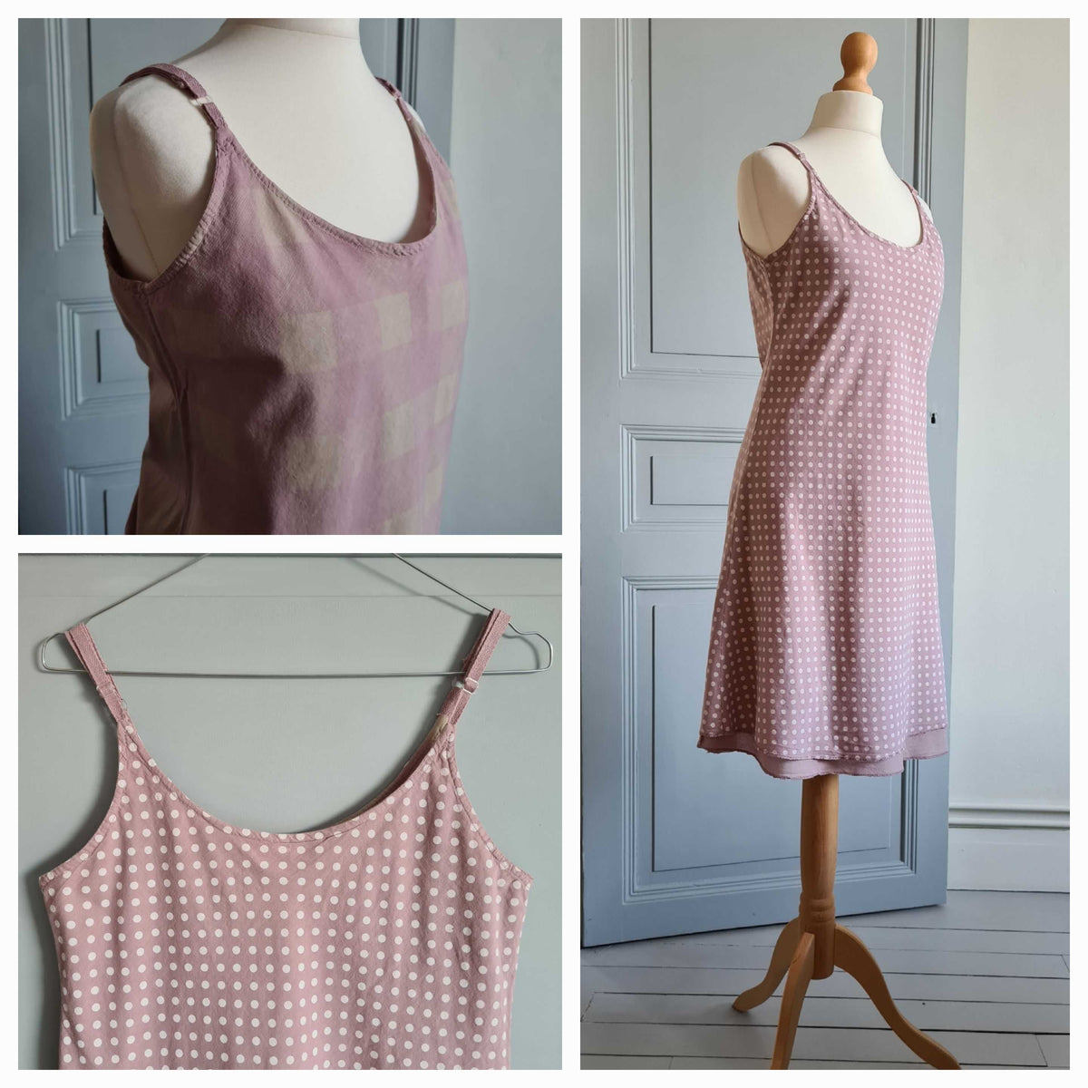 Prix unitaire parRobe à bretelles en coton parme à pois blanc, doublée d'un coton coordonné à carreaux. Réversible. Coupe trapèze. Bretelles réglables. À enfiler. Pièce fabriquée en Italie. Poitrine 41 cm.