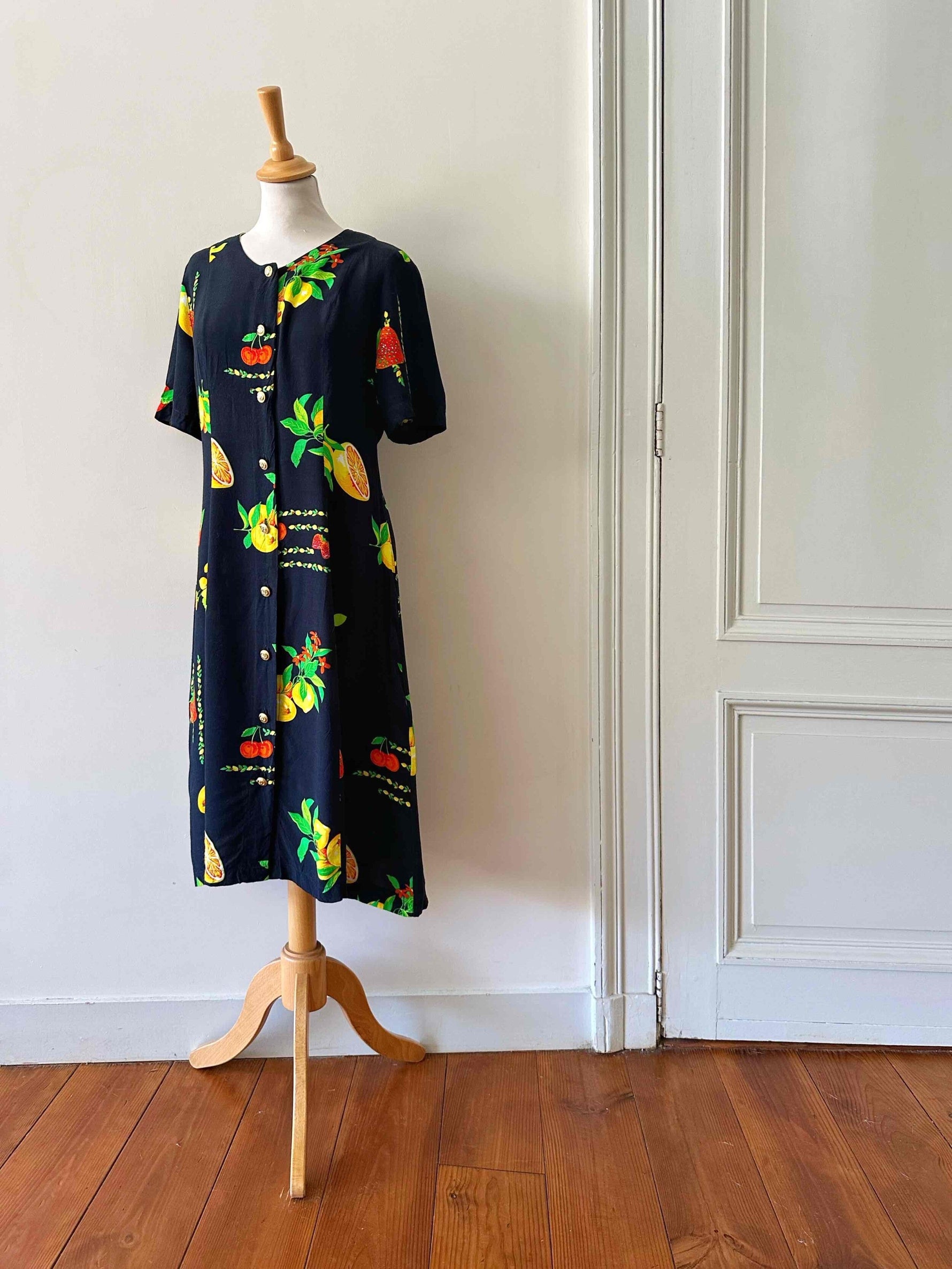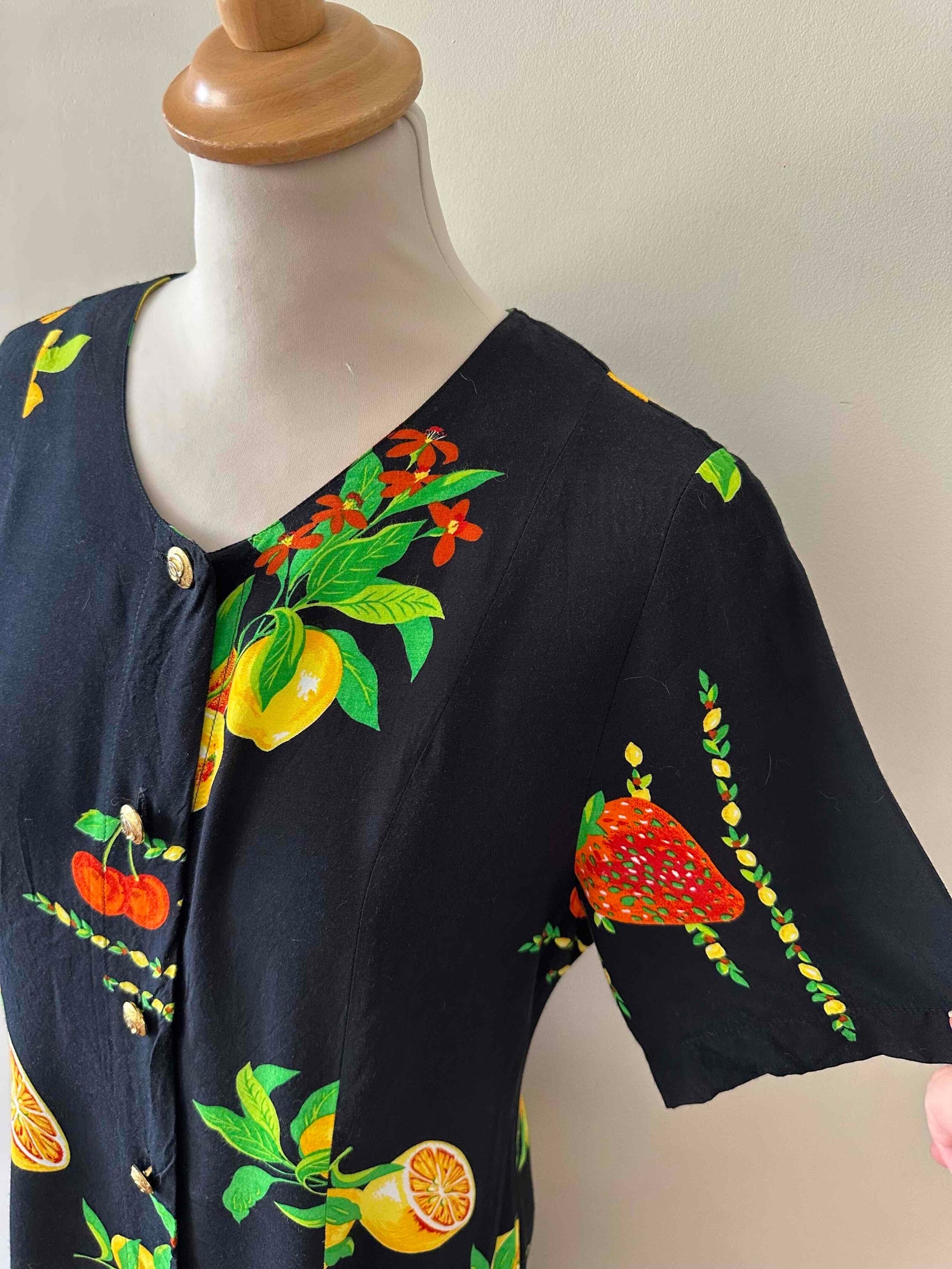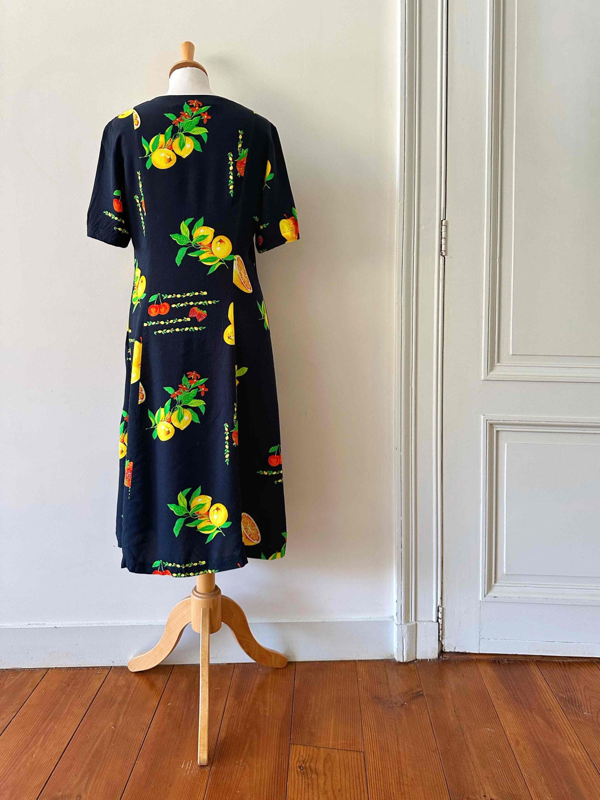 Prix unitaire parRobe tutti-frutti, en viscose noire imprimée motifs citrons, fraises, cerises et fleurs, boutons dorés, fabriquée en Suisse, taille 36 portée ici sur un mannequin T36, aisselles 44cm.