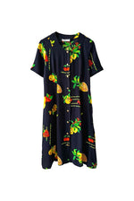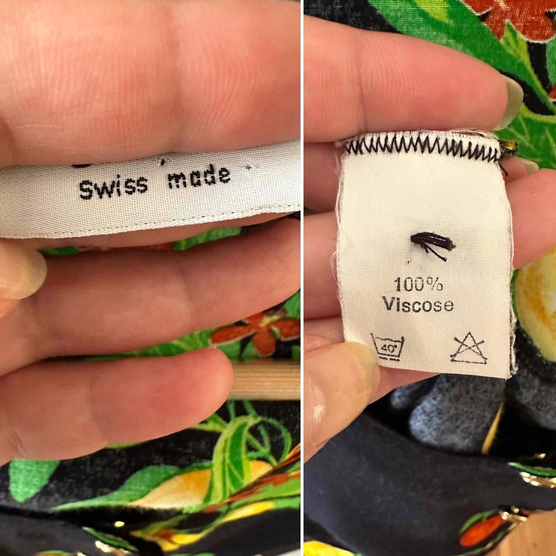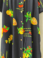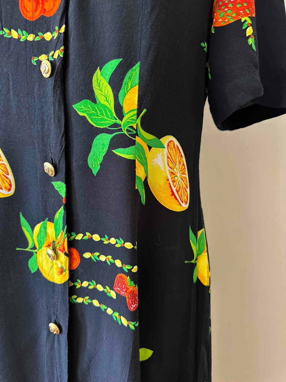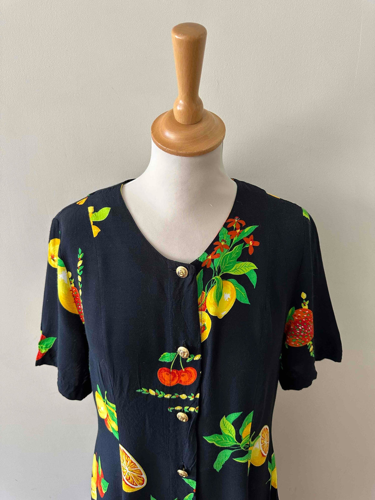 Prix unitaire parRobe tutti-frutti, en viscose noire imprimée motifs citrons, fraises, cerises et fleurs, boutons dorés, fabriquée en Suisse, taille 36 portée ici sur un mannequin T36, aisselles 44cm.