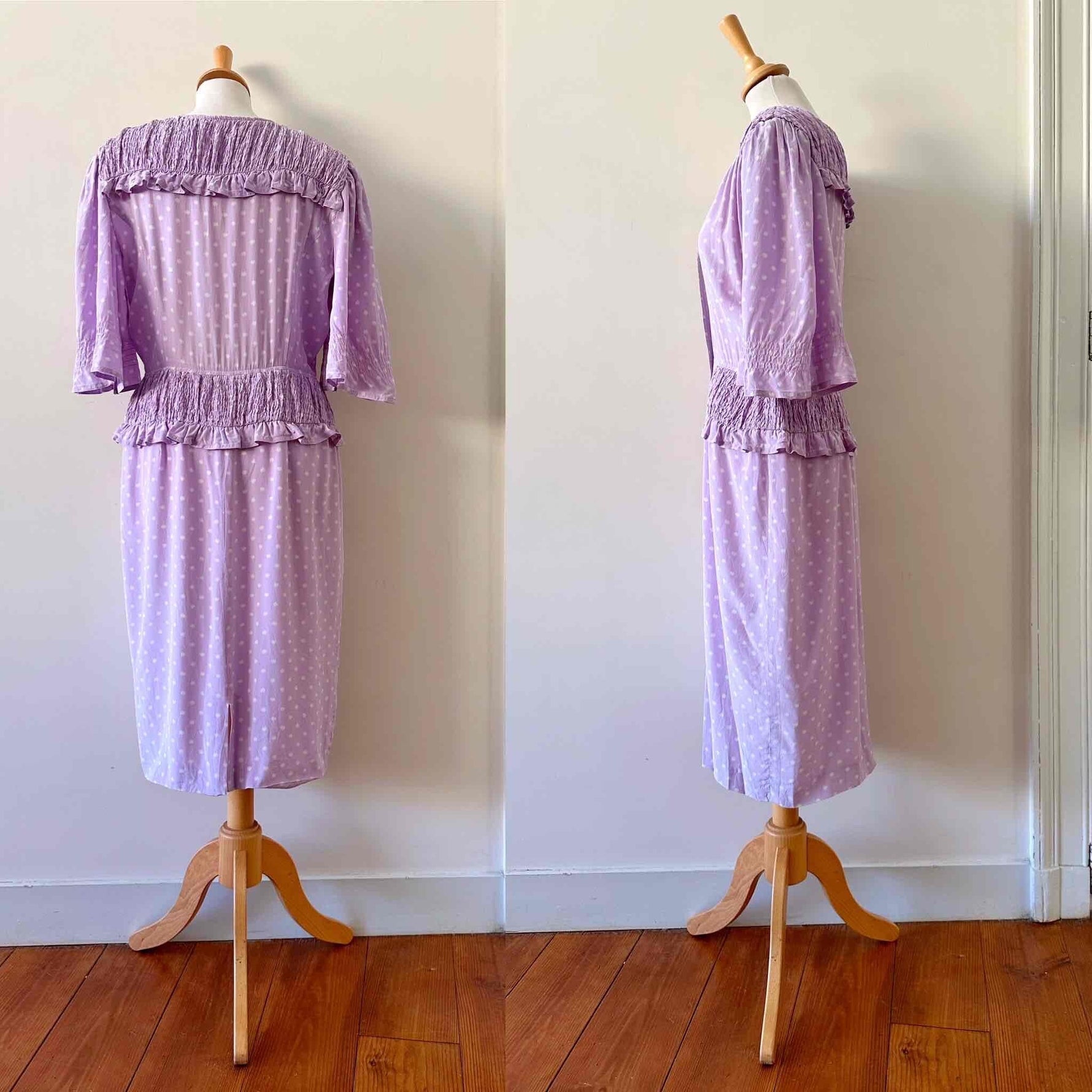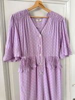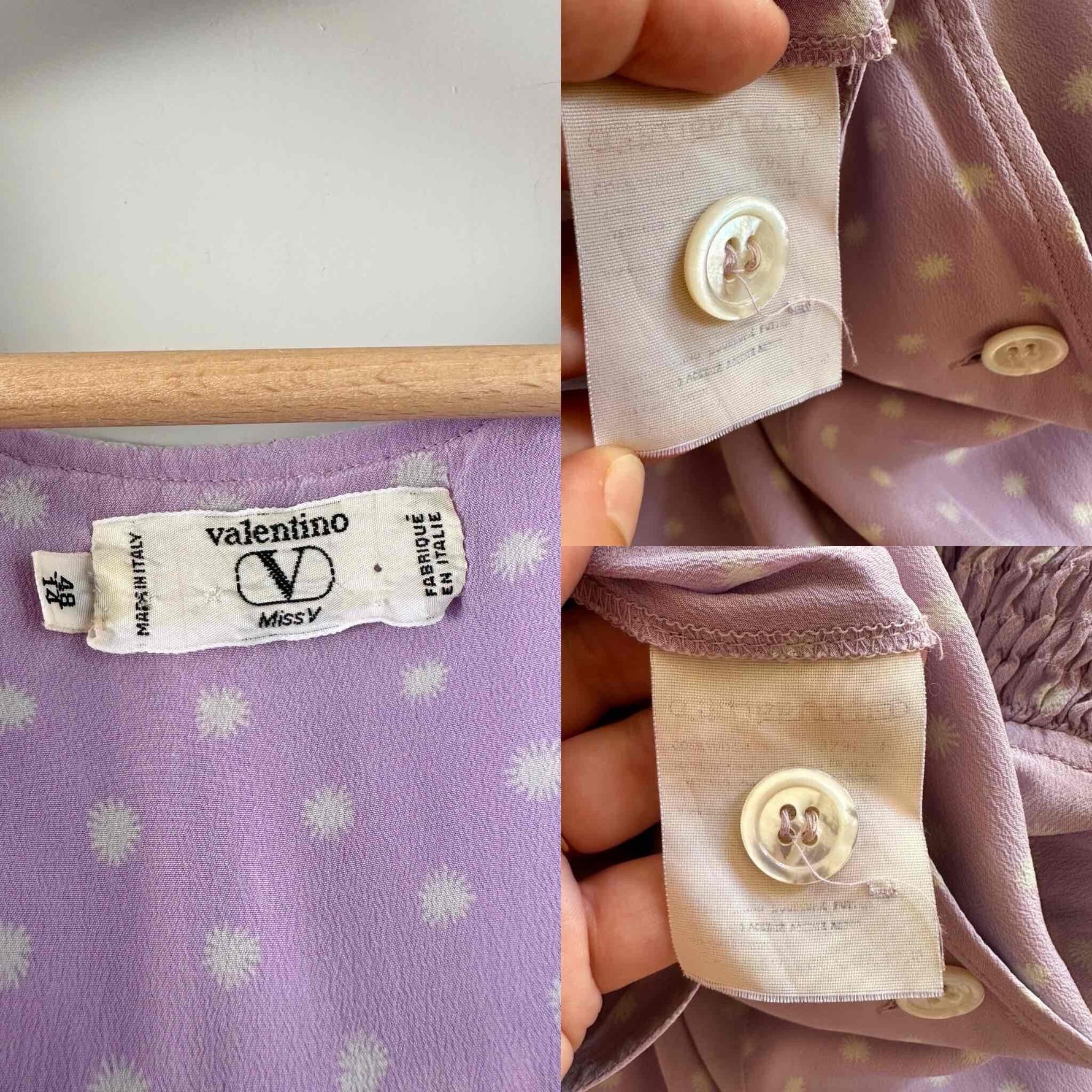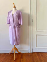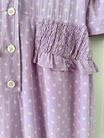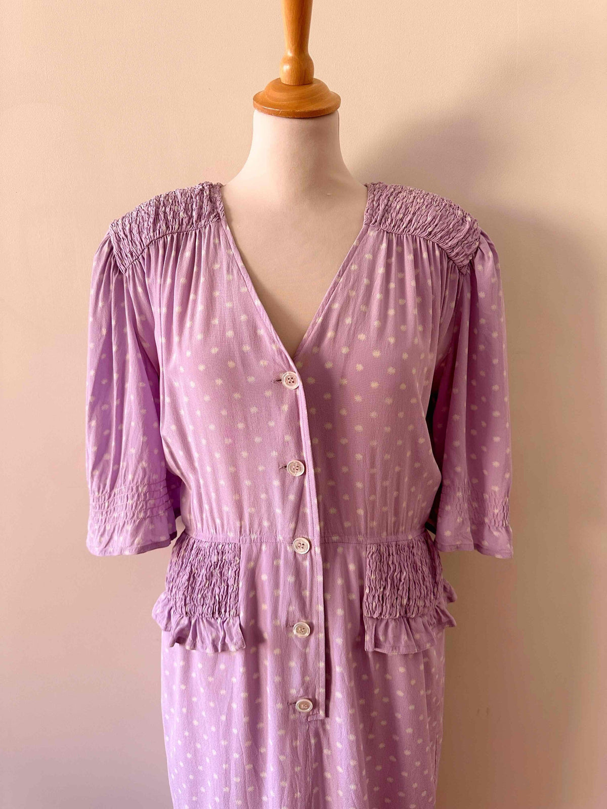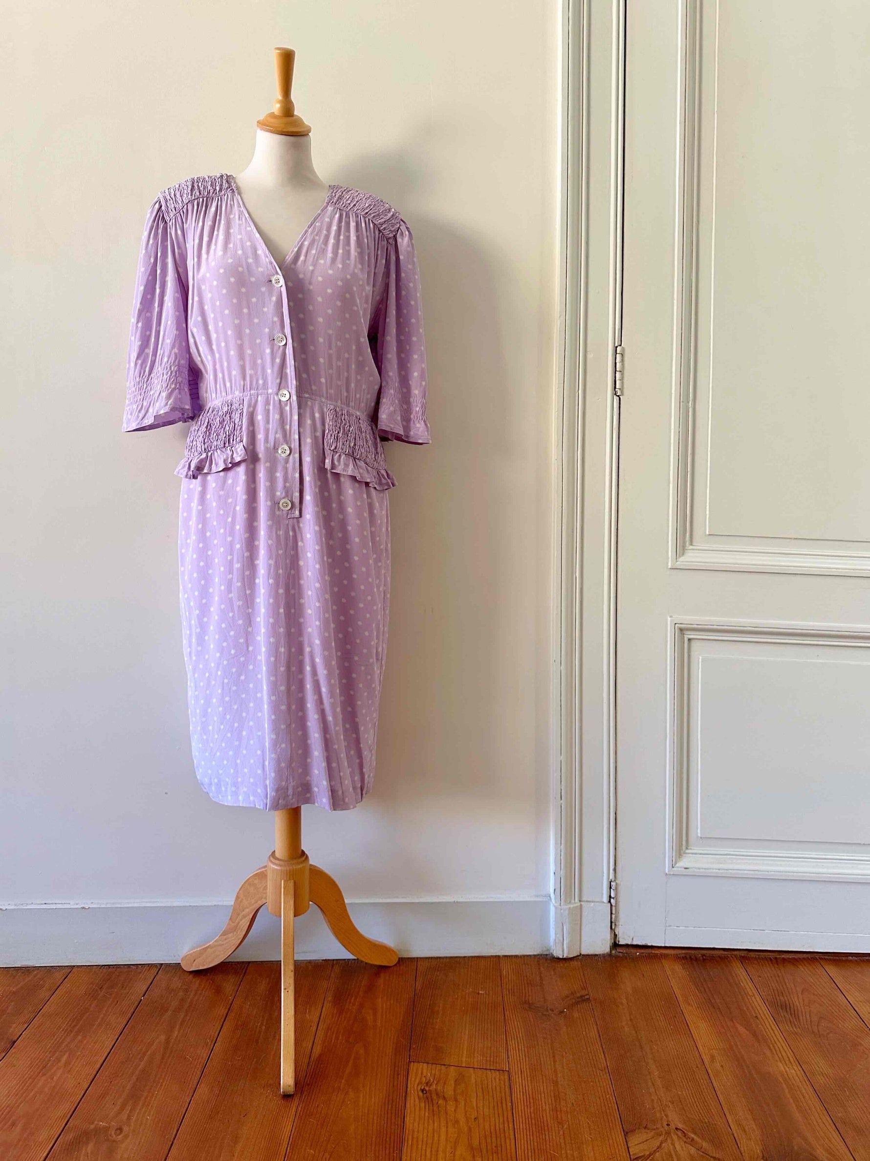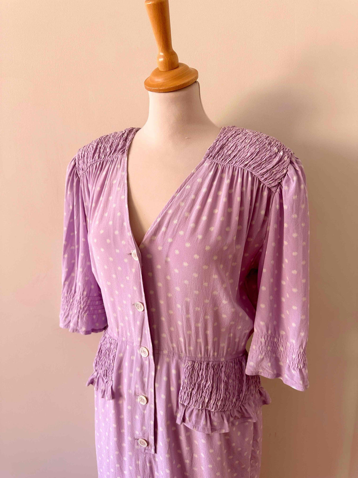 Prix unitaire parRobe en soie Valentino, soie lilas imprimée fleurs étoiles blanches, épaules et taille froncées à smocks, manches ballons, boutonnée jusqu’à la taille, fabriquée en Italie, taille 38, portée ici sur un mannequin T36, aisselles 47 cm.