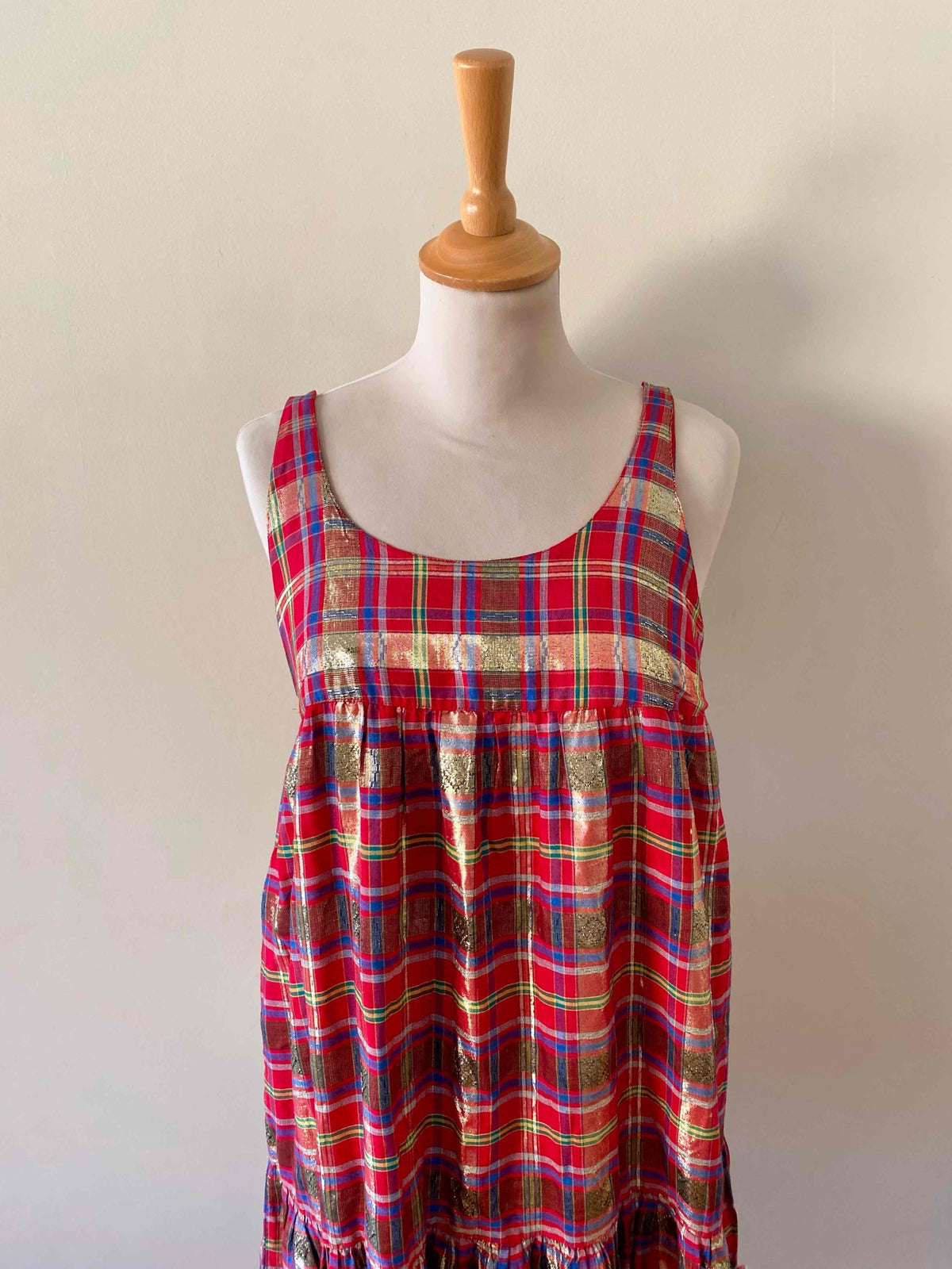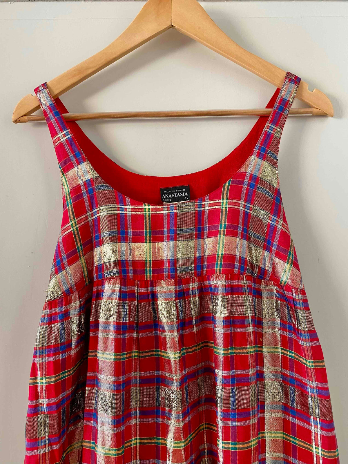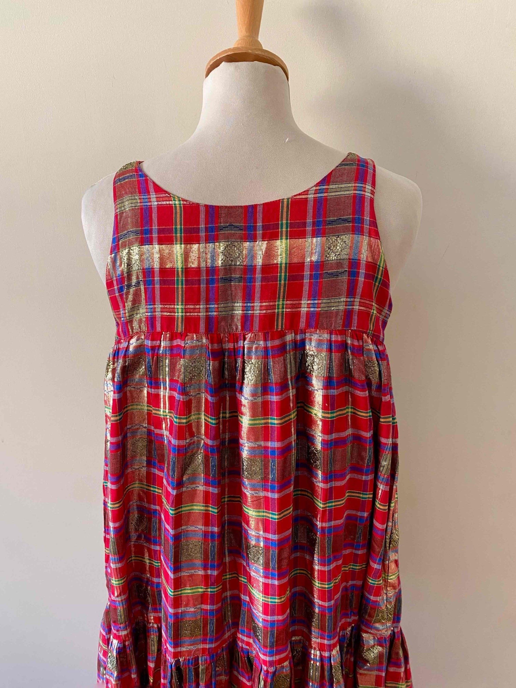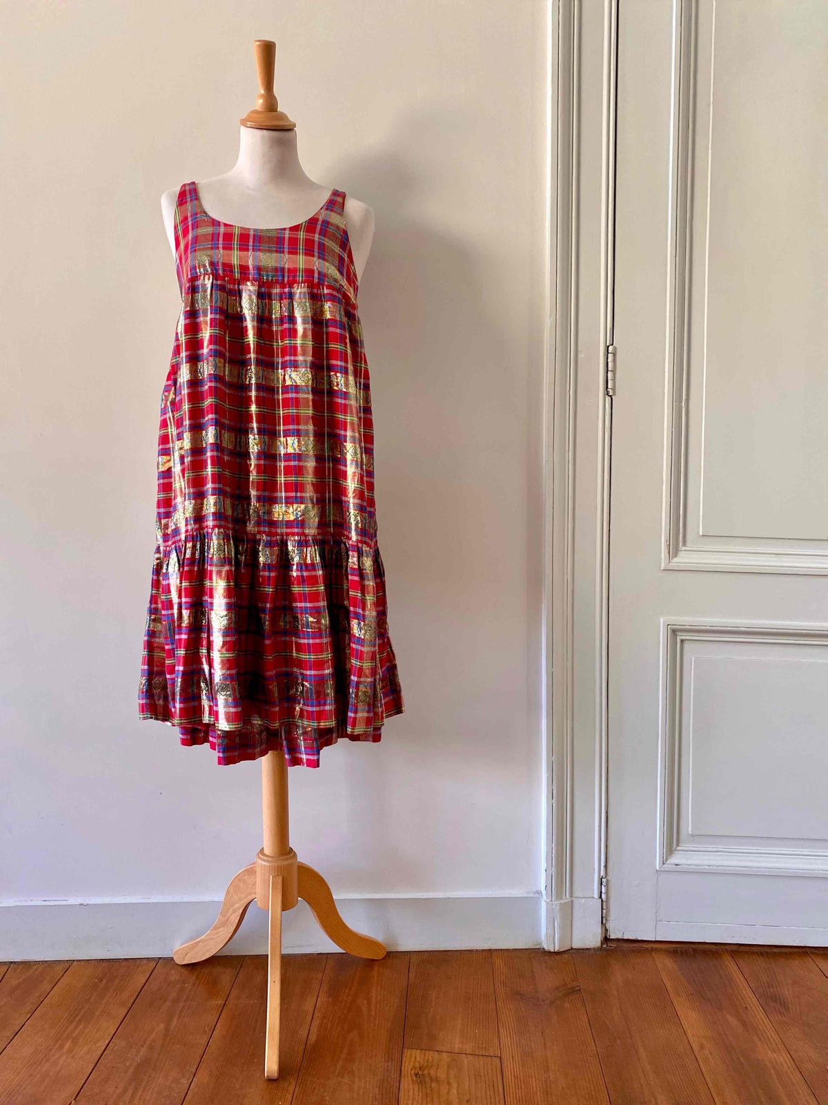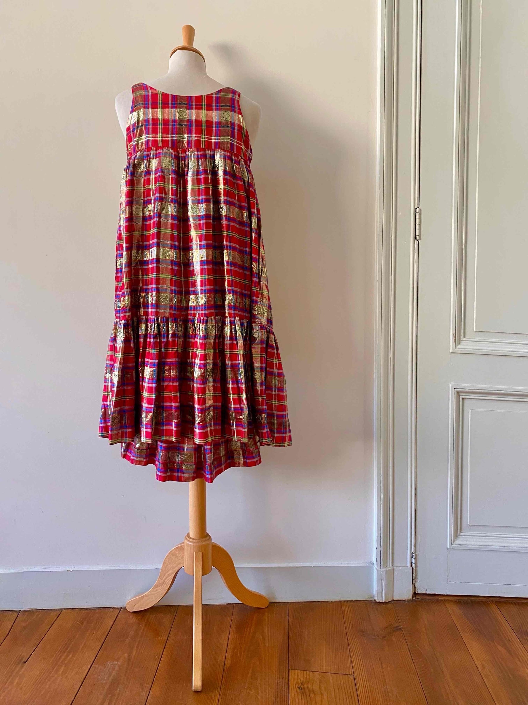 Prix unitaire parRobe vichy métallisée, en coton et lurex rouge et doré, carreaux tartans bleus et verts, forme chasuble trapèze à volants, fabriquée en France, taille 34 et 36 portée ici sur un mannequin T36, aisselles 41cm.