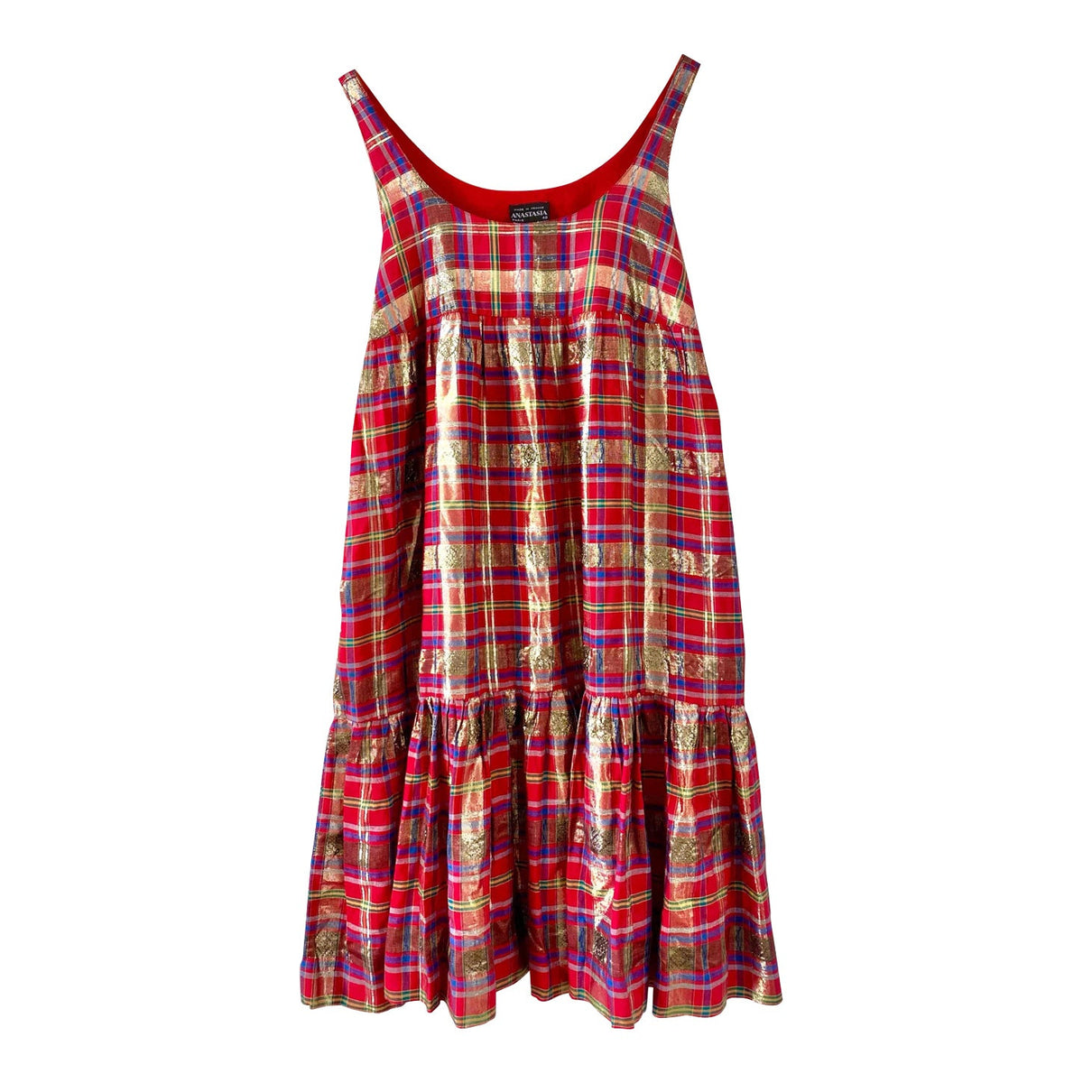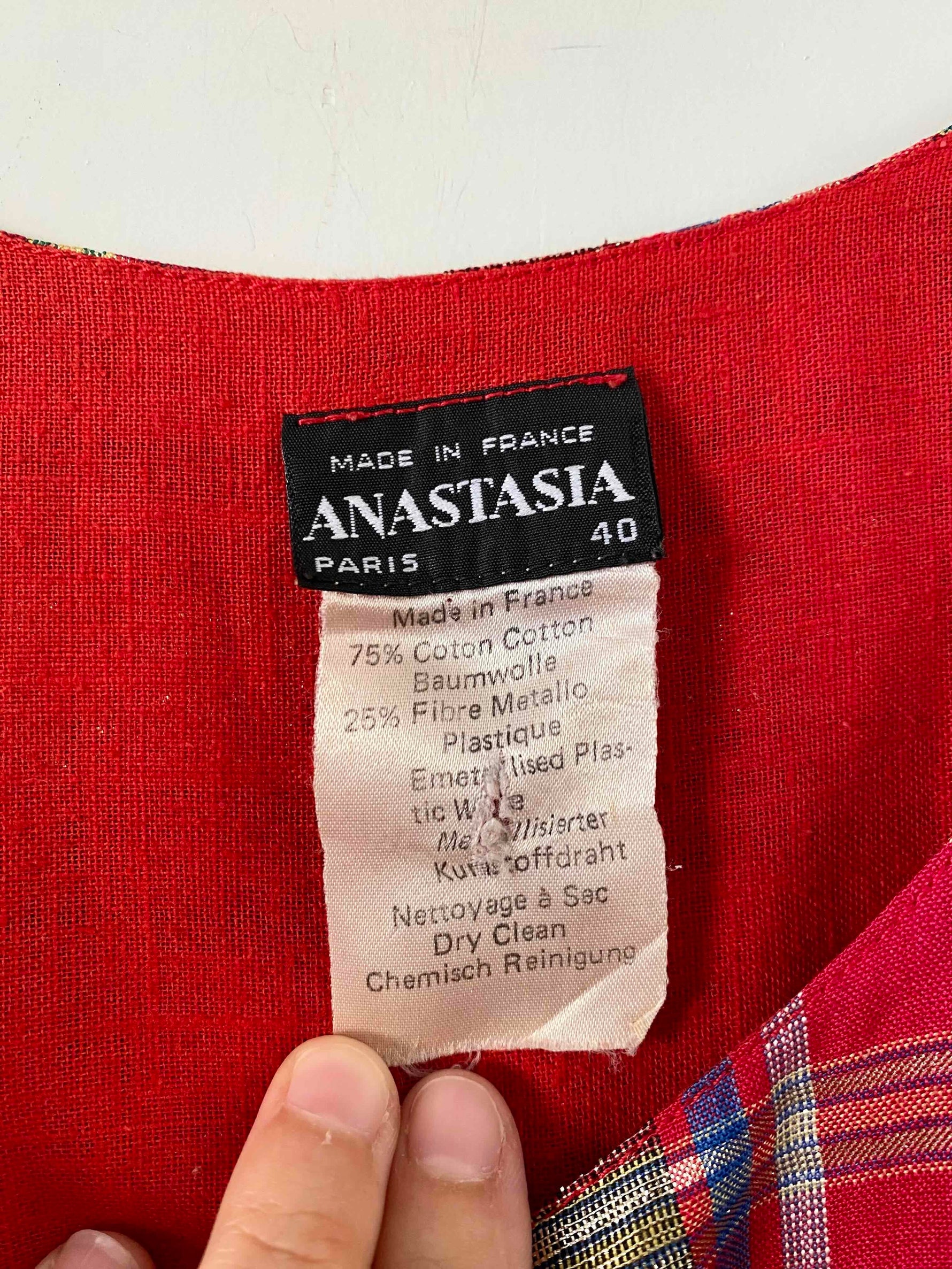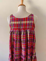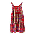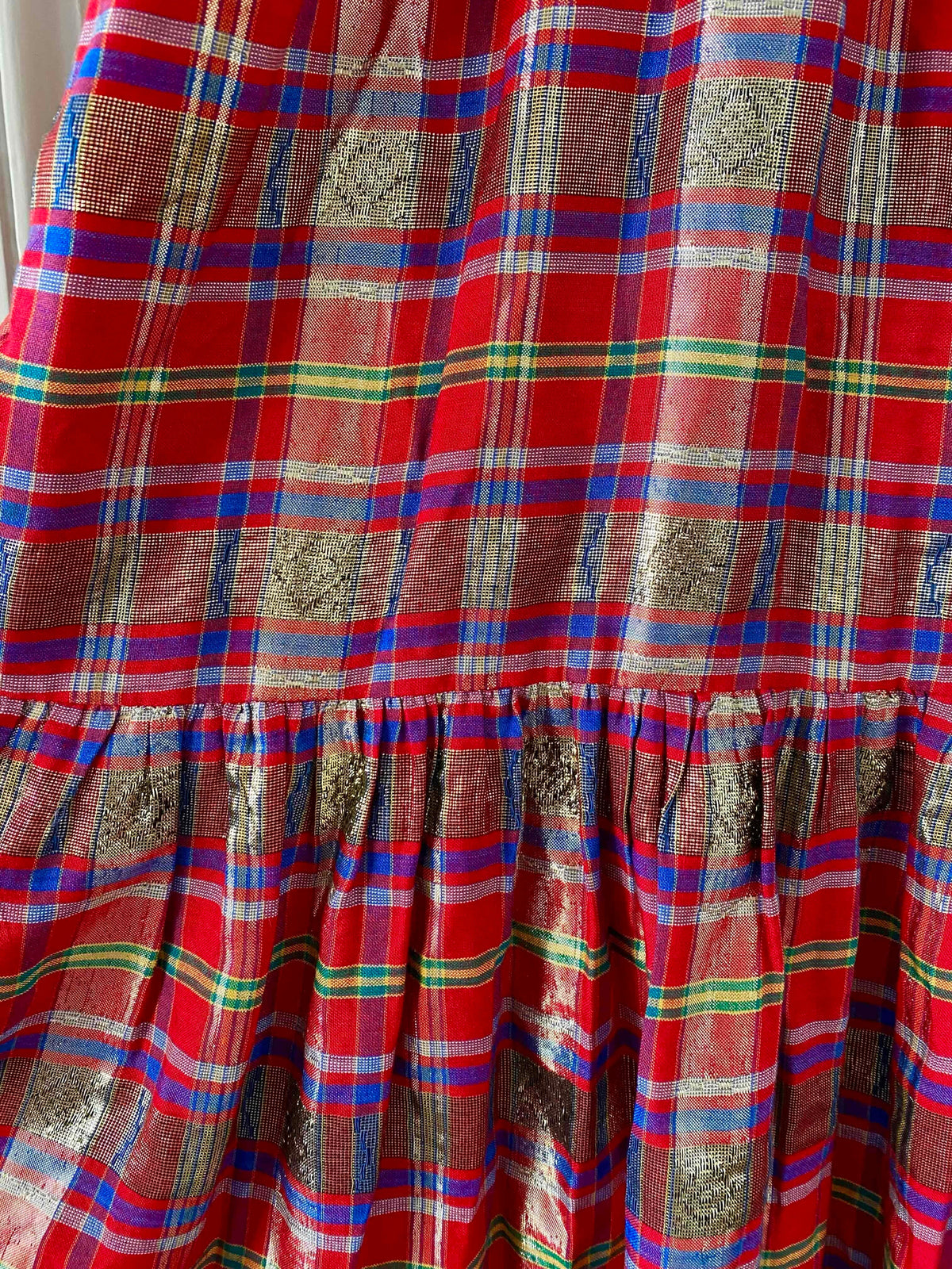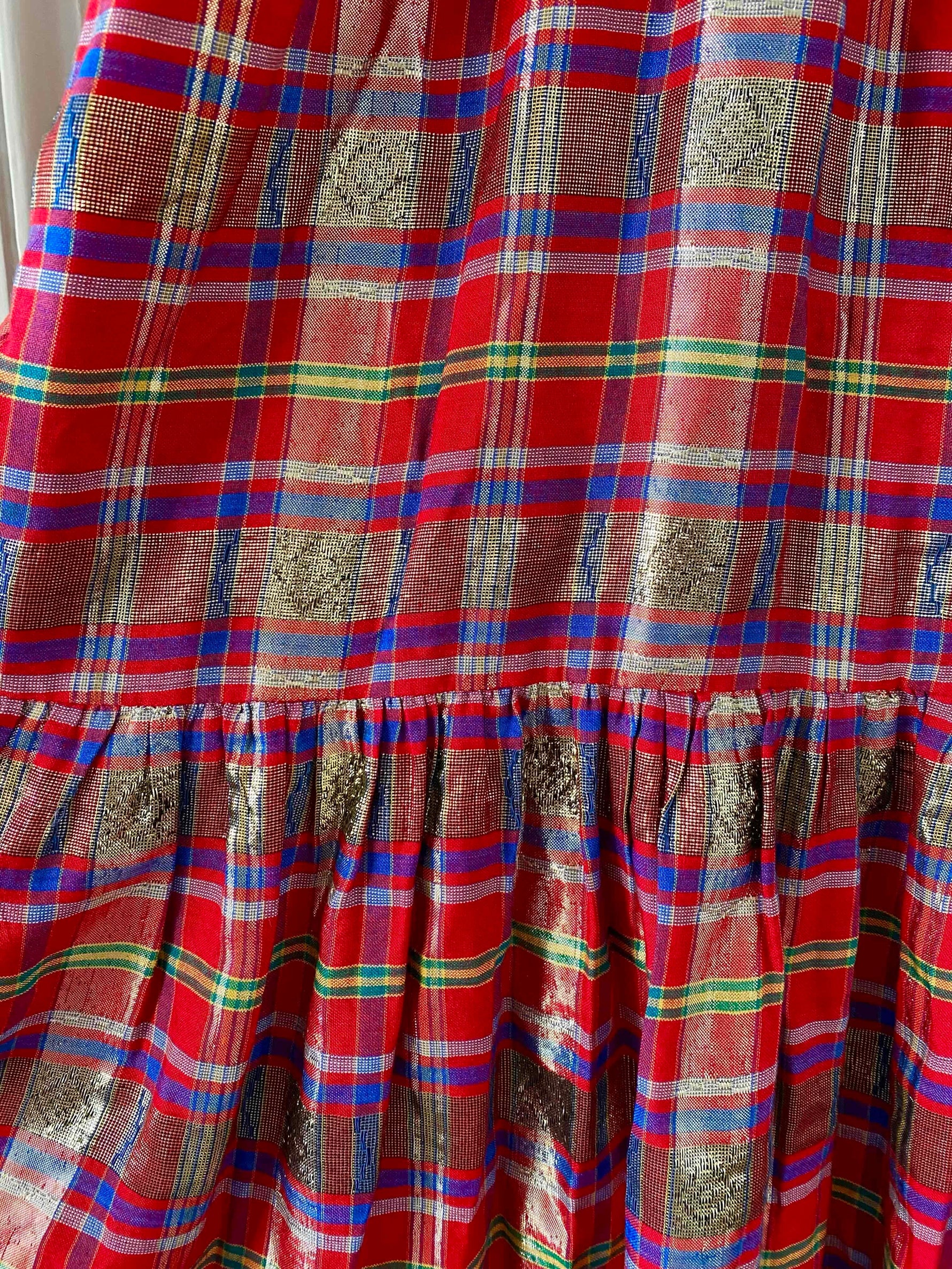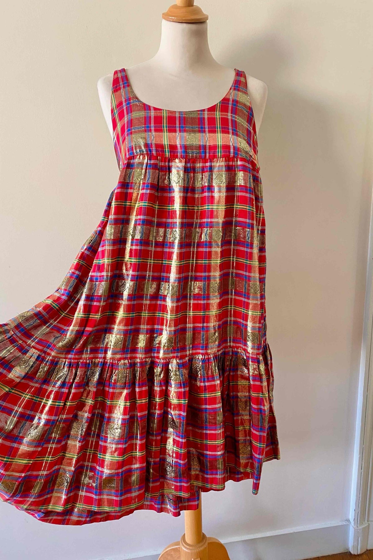 Prix unitaire parRobe vichy métallisée, en coton et lurex rouge et doré, carreaux tartans bleus et verts, forme chasuble trapèze à volants, fabriquée en France, taille 34 et 36 portée ici sur un mannequin T36, aisselles 41cm.