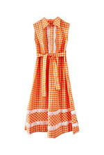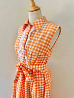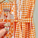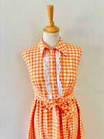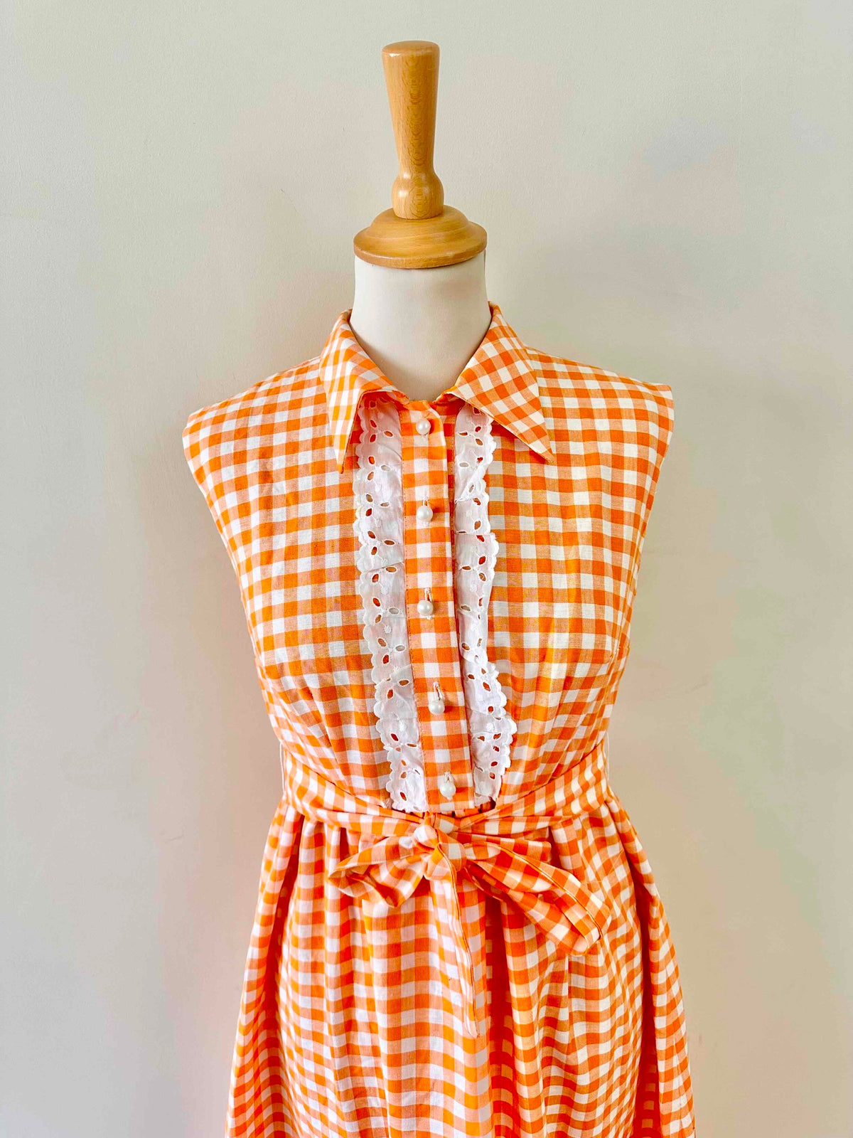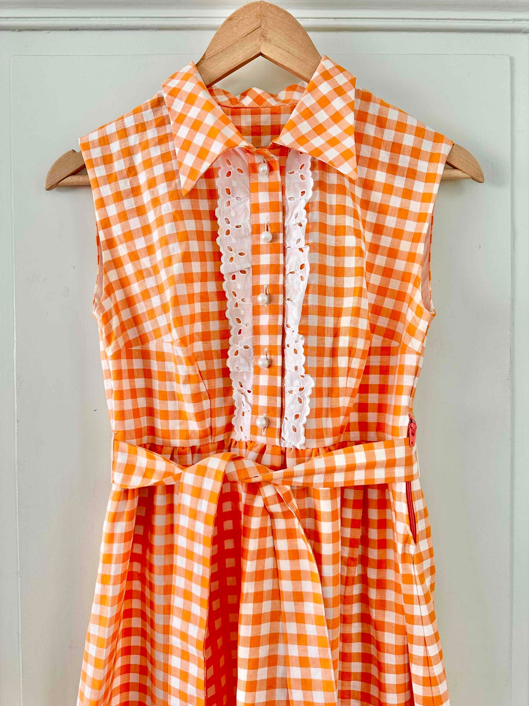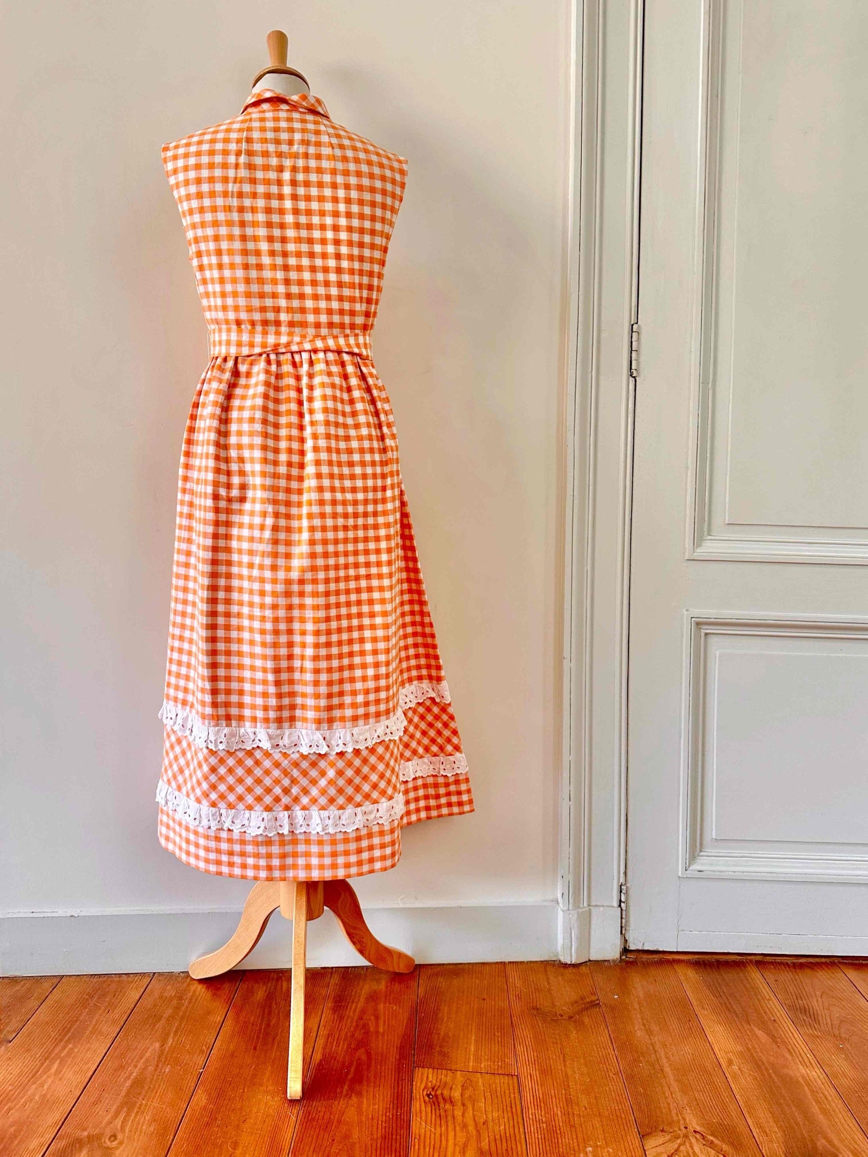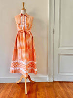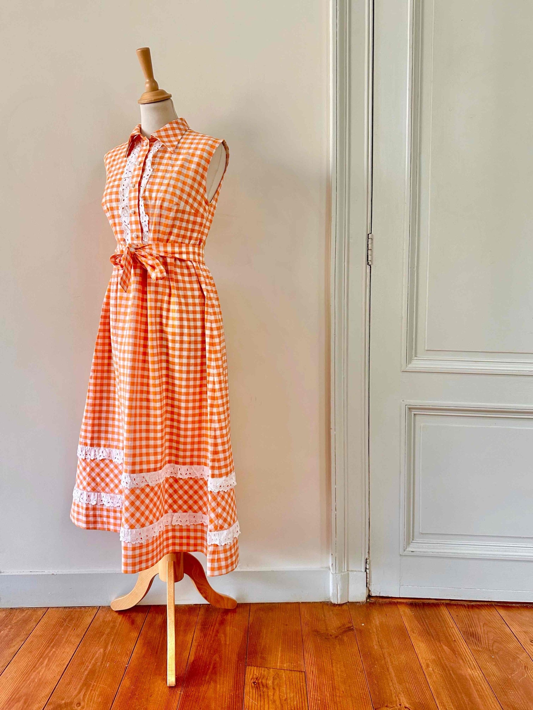 Prix unitaire parRobe vichy 70s, en 100% coton, carreaux vichy orange et blanc, détail de broderies anglaises blanches et haut boutons perles, ceinture taille à nouer, fermeture Éclair côté, années 70s, taille 34, portée ici ouverte sur un mannequin T36. Aisselles 43 cm.