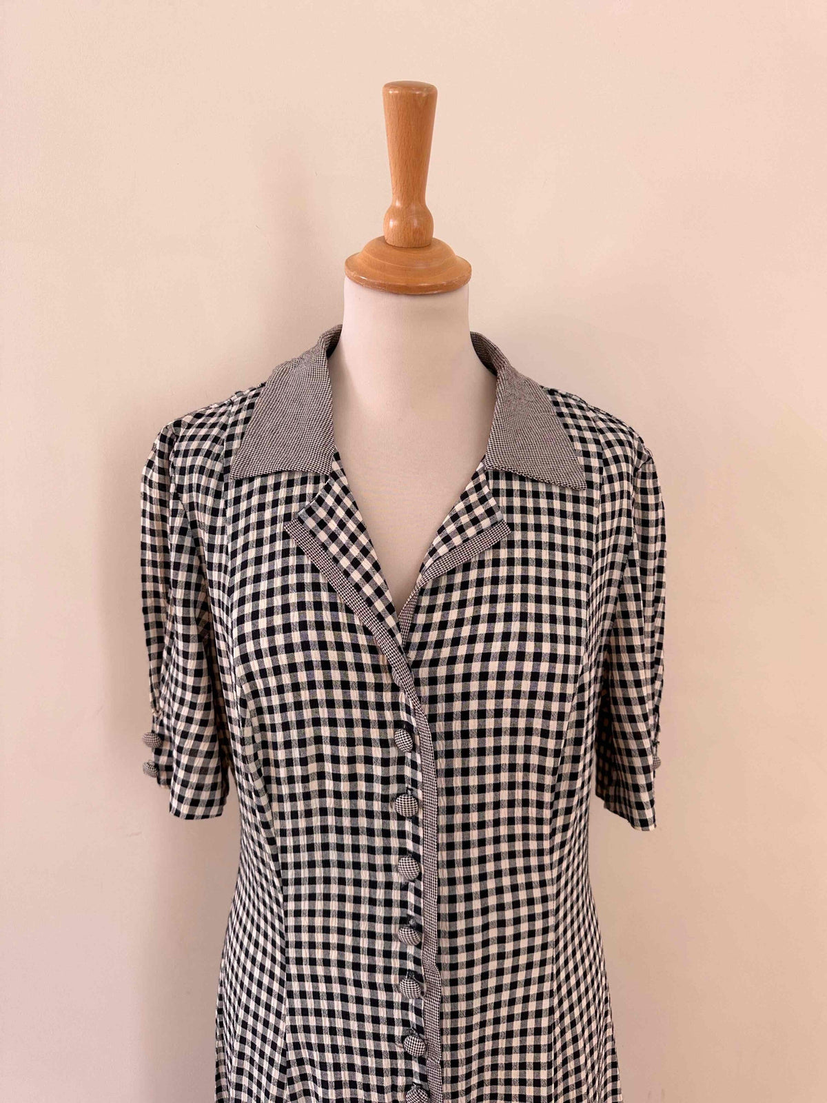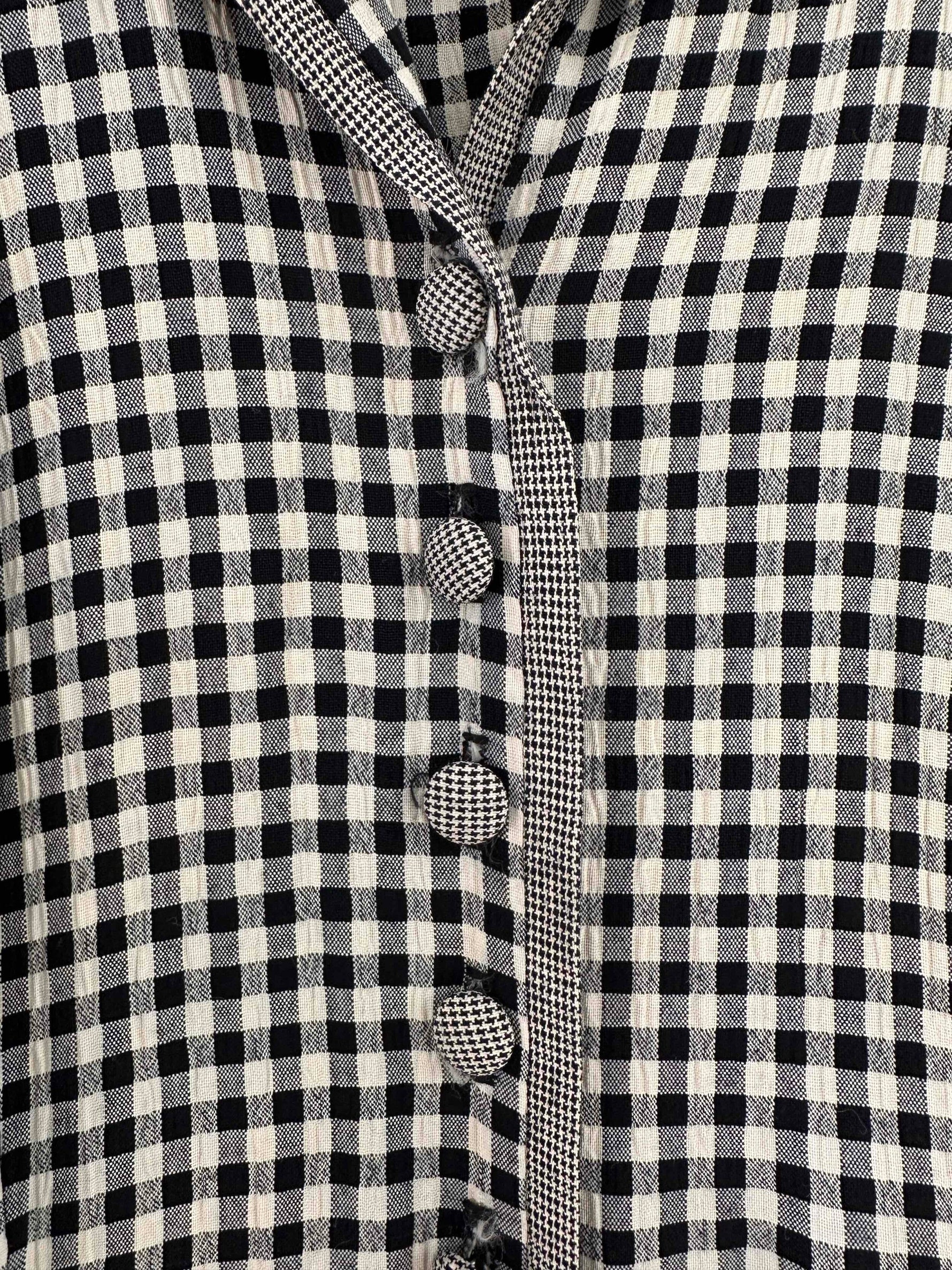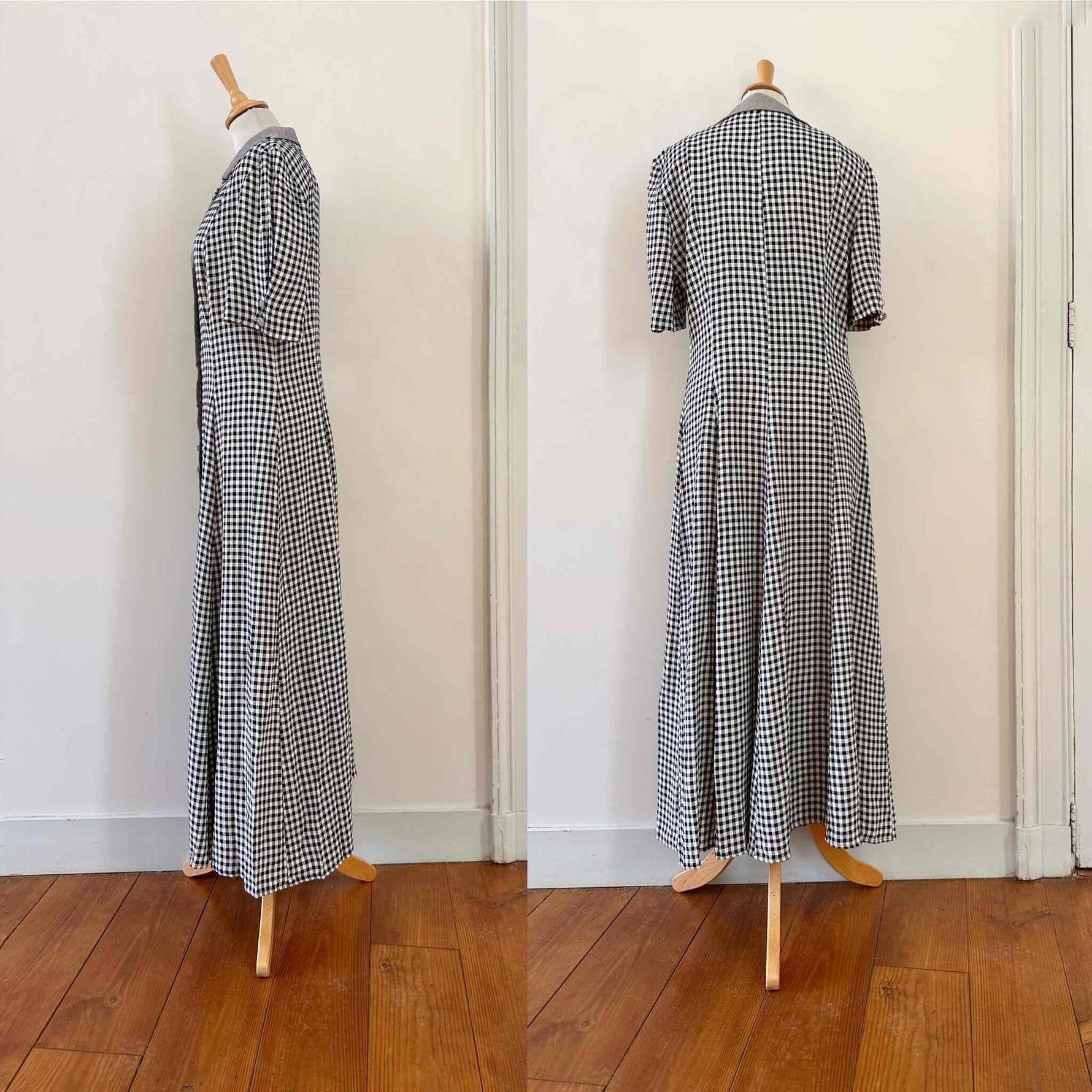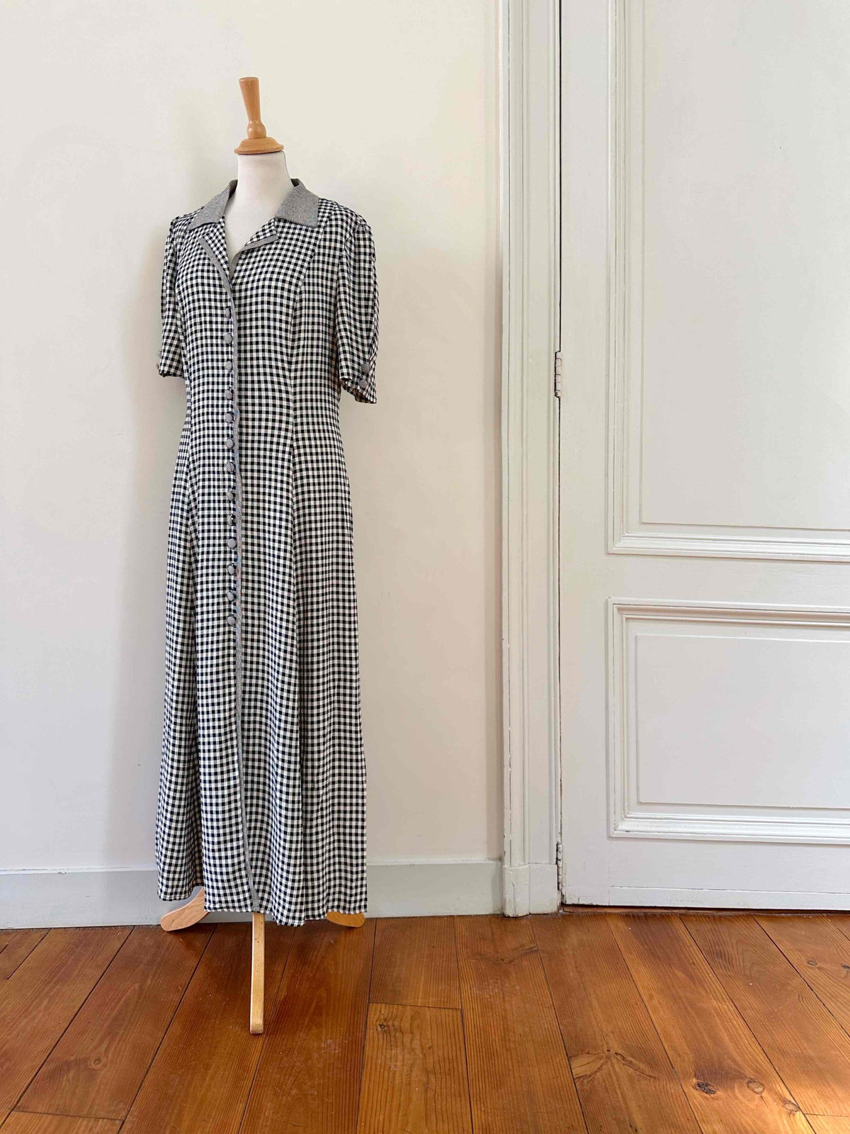 Prix unitaire parRobe longue vichy, en viscose acétate, carreaux vichy noirs et blancs, col et boutons à plus petit vichy, boutonnée, manches ballons, fabriquée aux USA, taille 36 et 38, portée ici sur un mannequin T36, aisselles 45 cm.