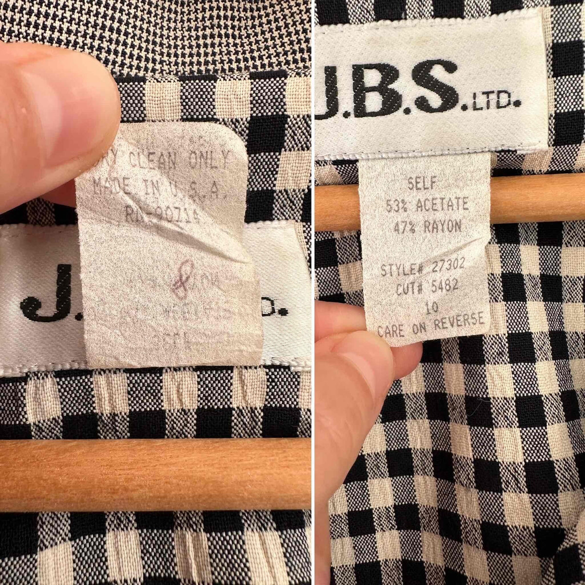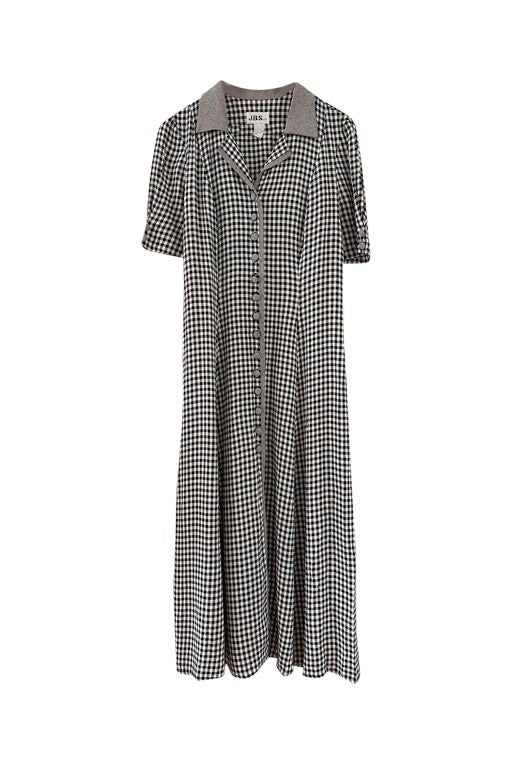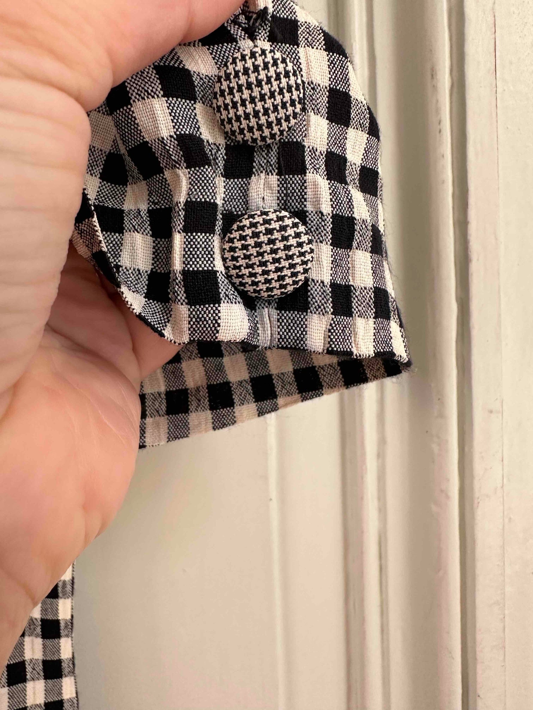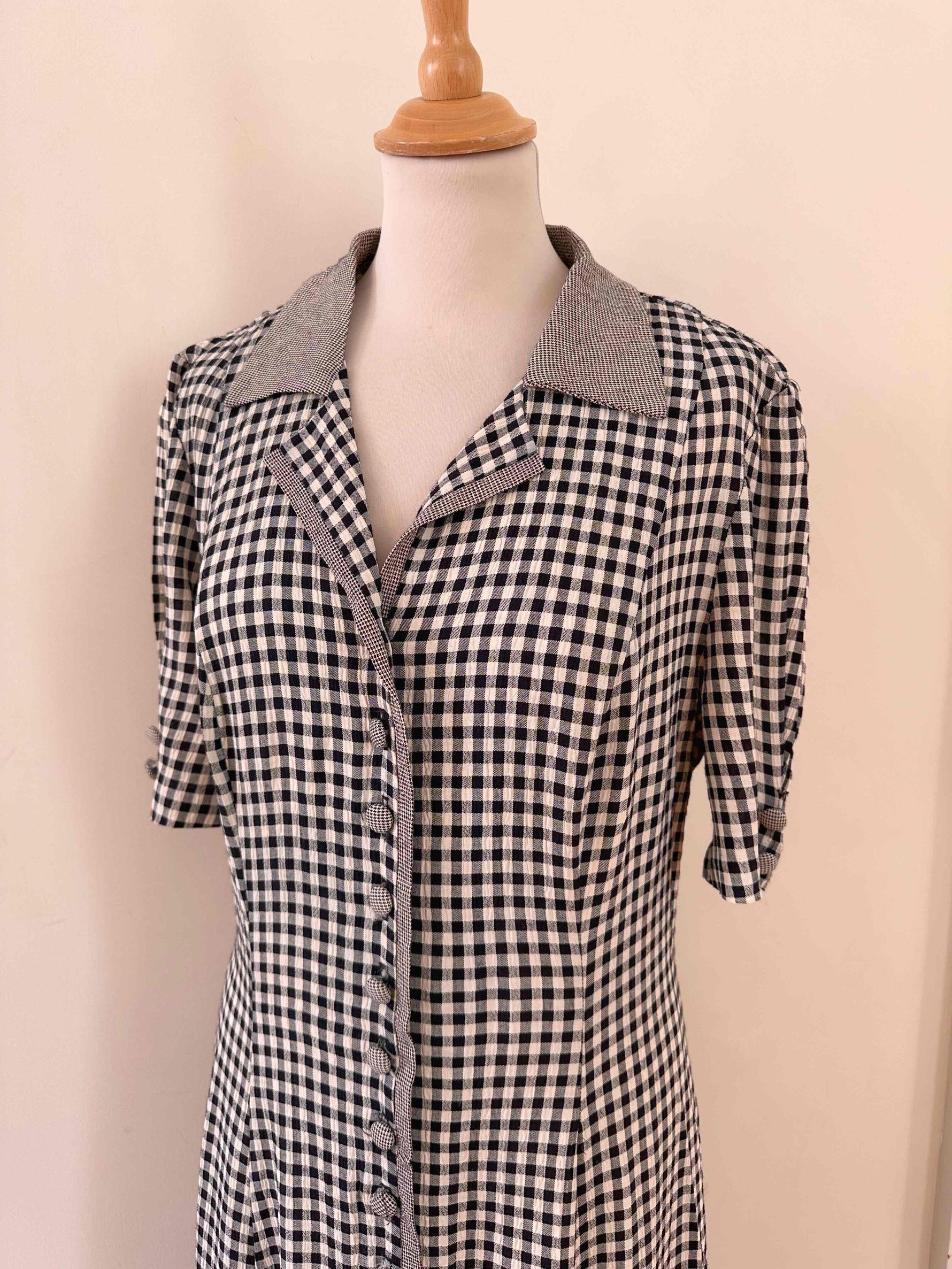 Prix unitaire parRobe longue vichy, en viscose acétate, carreaux vichy noirs et blancs, col et boutons à plus petit vichy, boutonnée, manches ballons, fabriquée aux USA, taille 36 et 38, portée ici sur un mannequin T36, aisselles 45 cm.