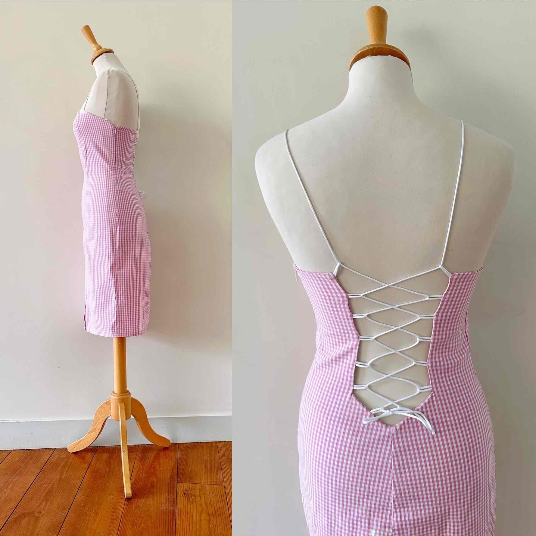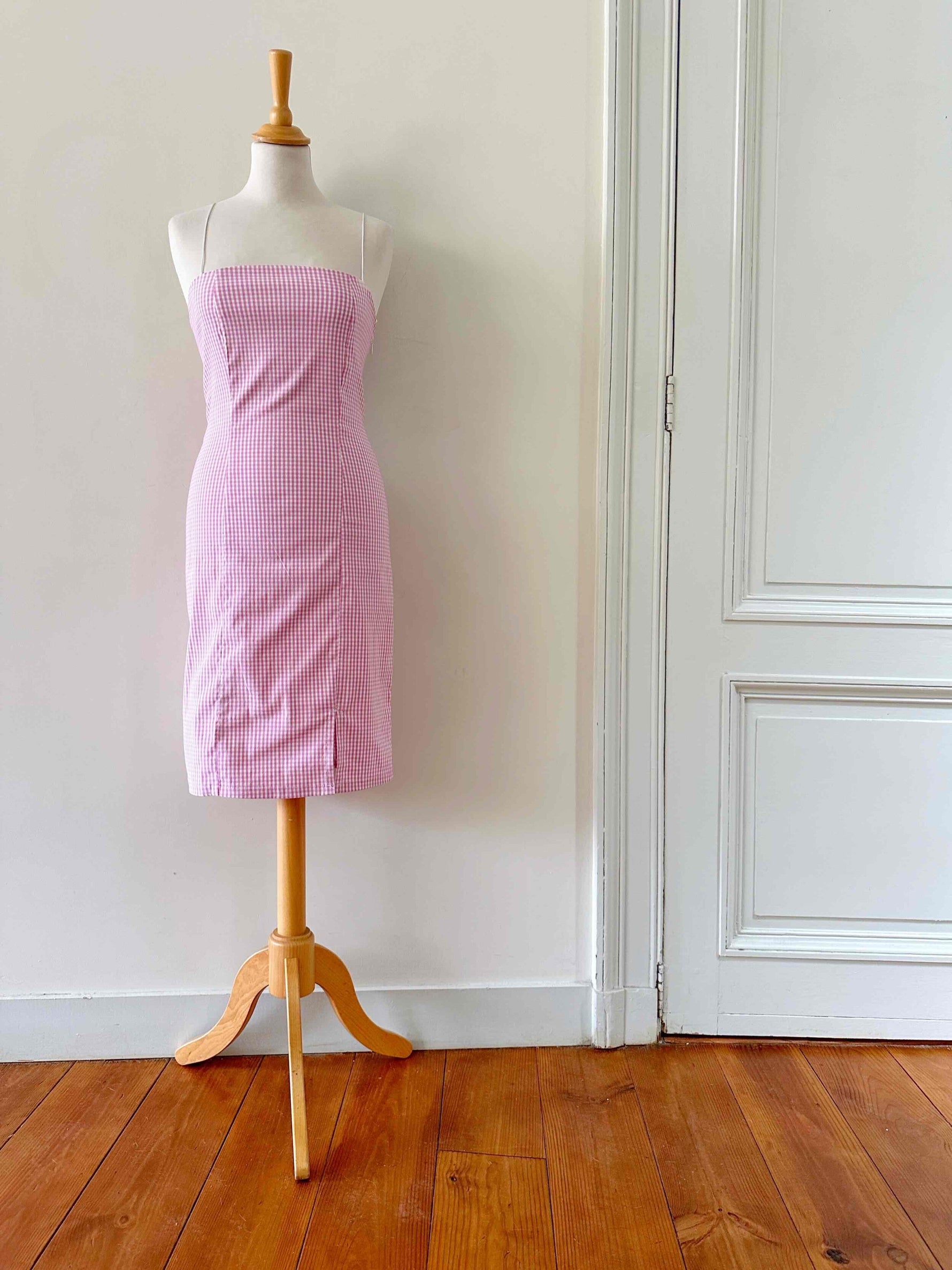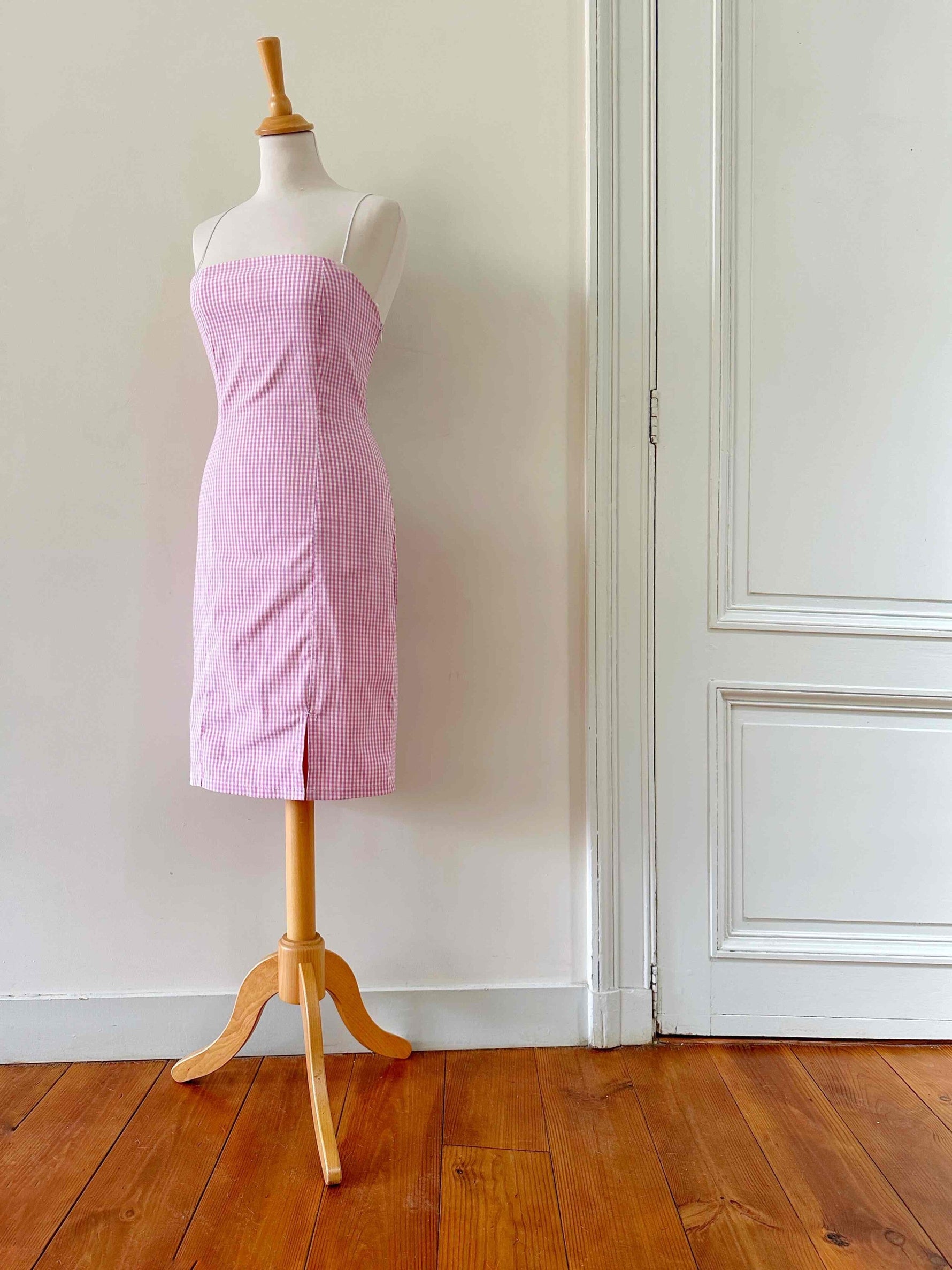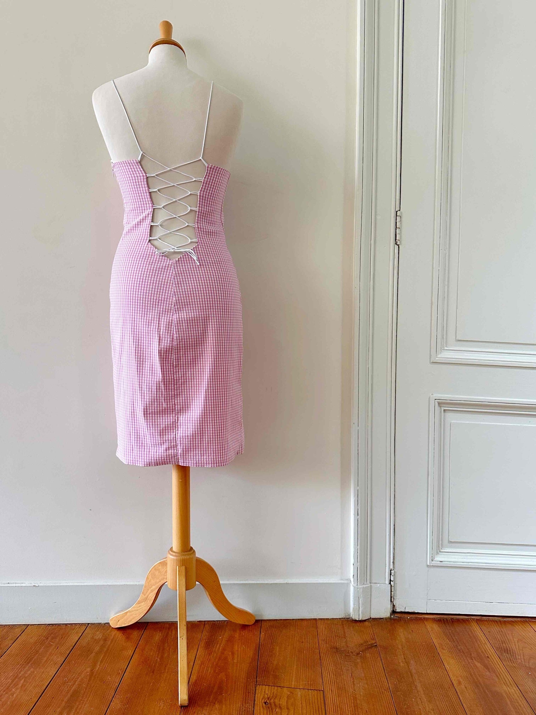 Prix unitaire parRobe vichy dos nu, en viscose elasthanne matiere gainante à carreaux vichy roses et blancs, forme bustier, bretelles spaghettis satinées blanches qui se noue dans le dos nu plongeant et laçage, fabriquée en France, taille 34 et 36 portée ici sur un mannequin T36, aisselles 43cm.
