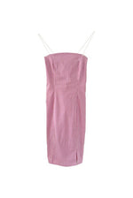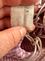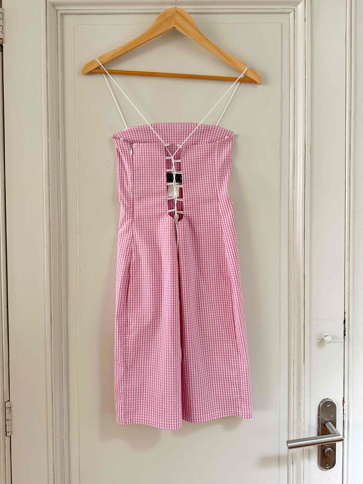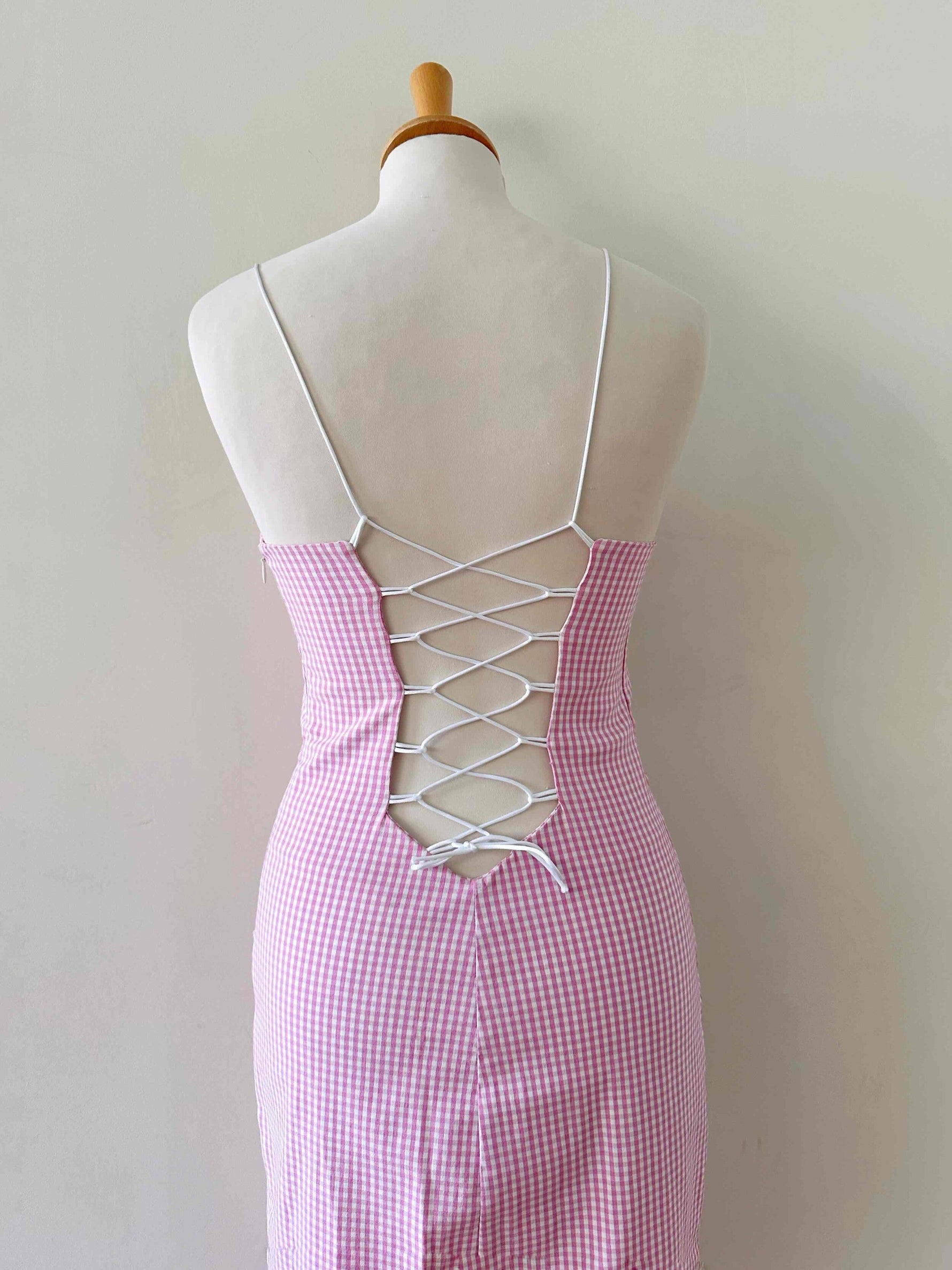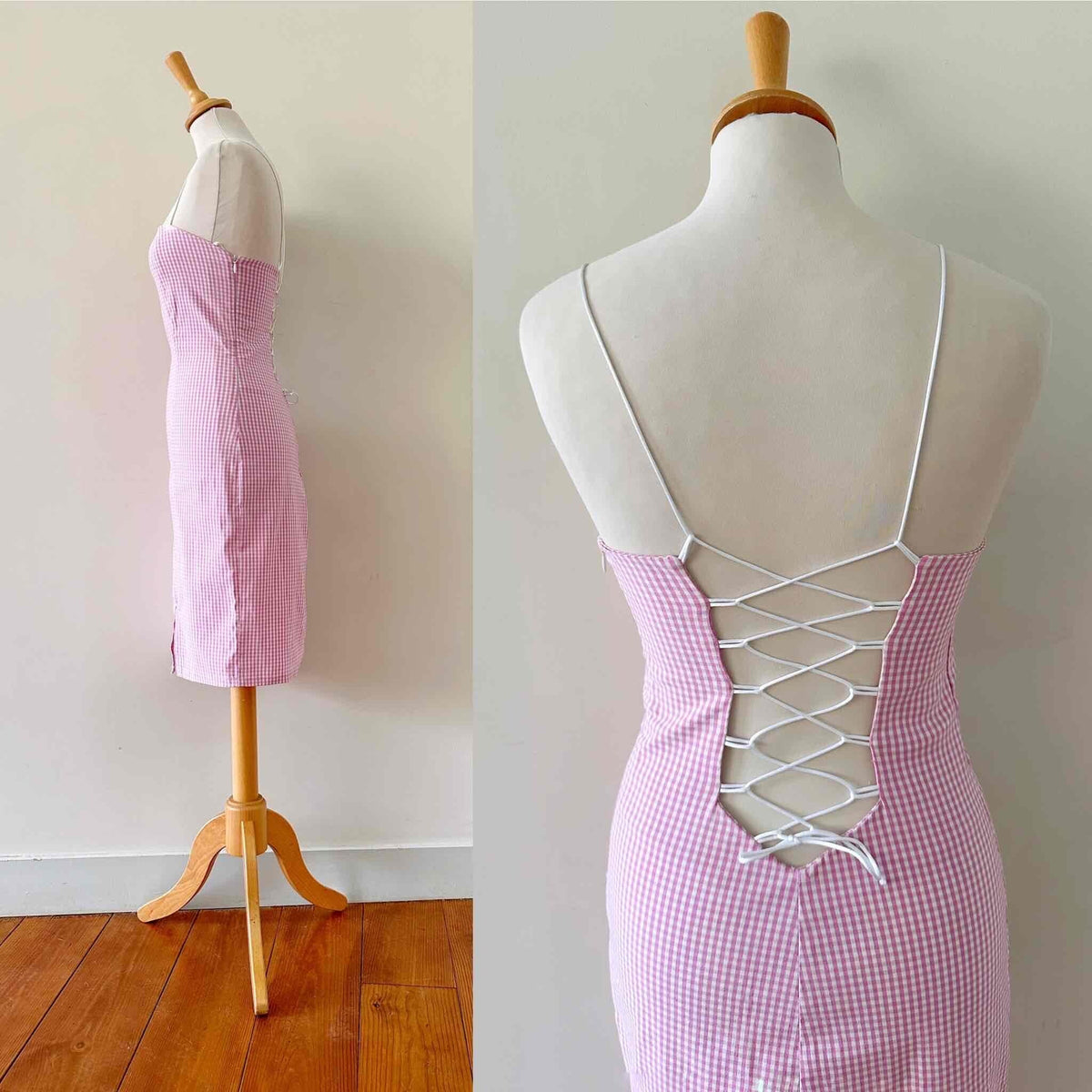Prix unitaire parRobe vichy dos nu, en viscose elasthanne matiere gainante à carreaux vichy roses et blancs, forme bustier, bretelles spaghettis satinées blanches qui se noue dans le dos nu plongeant et laçage, fabriquée en France, taille 34 et 36 portée ici sur un mannequin T36, aisselles 43cm.