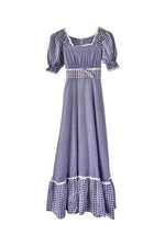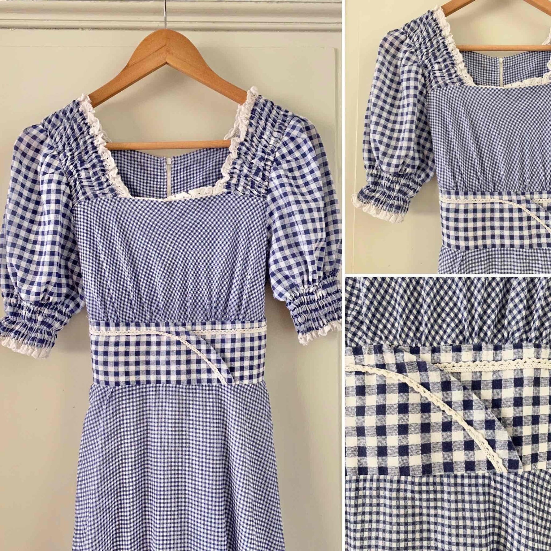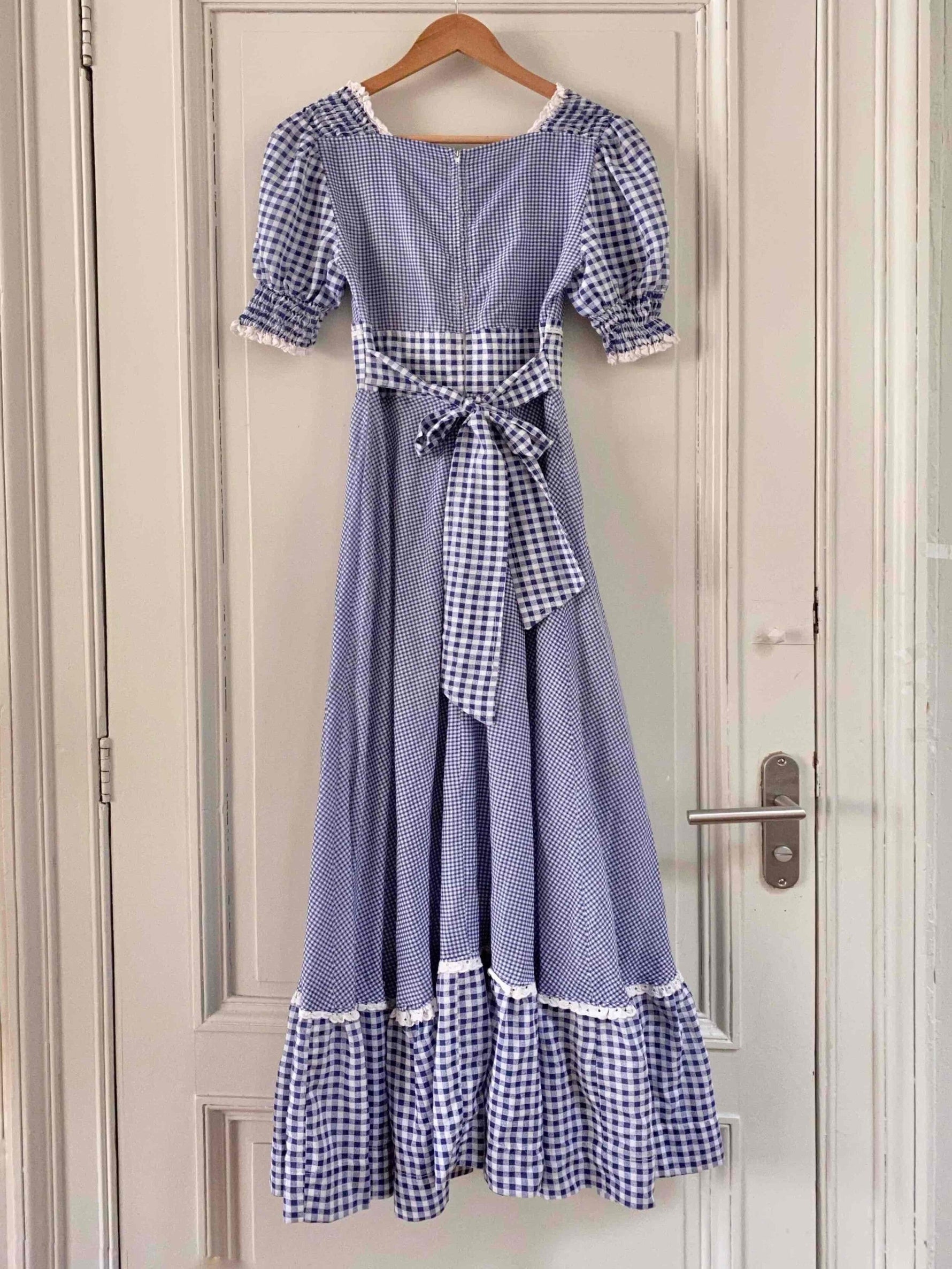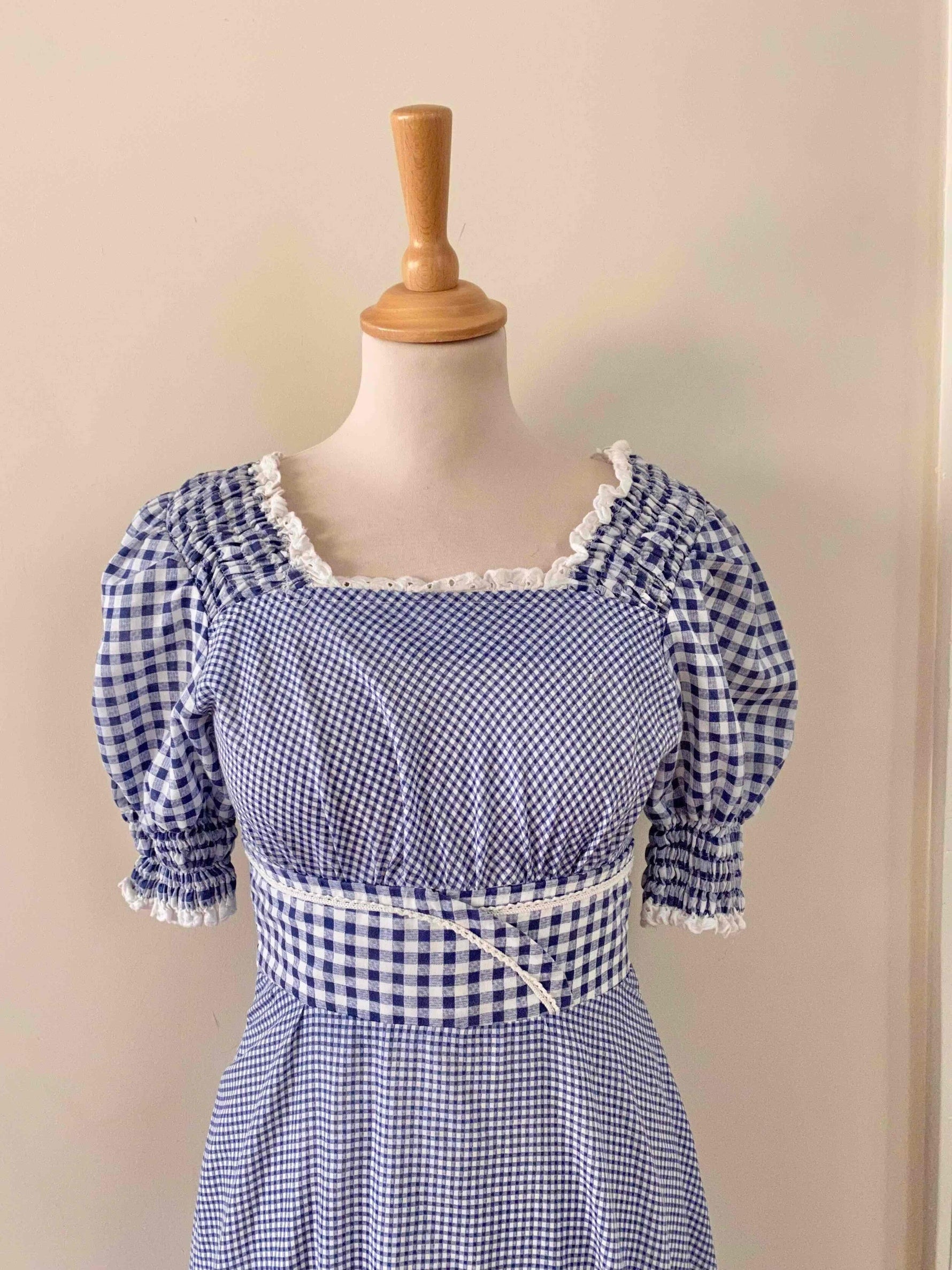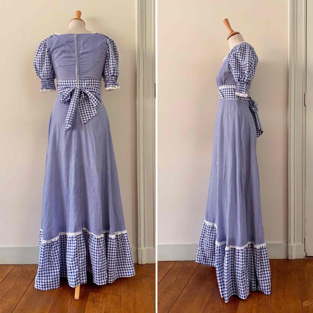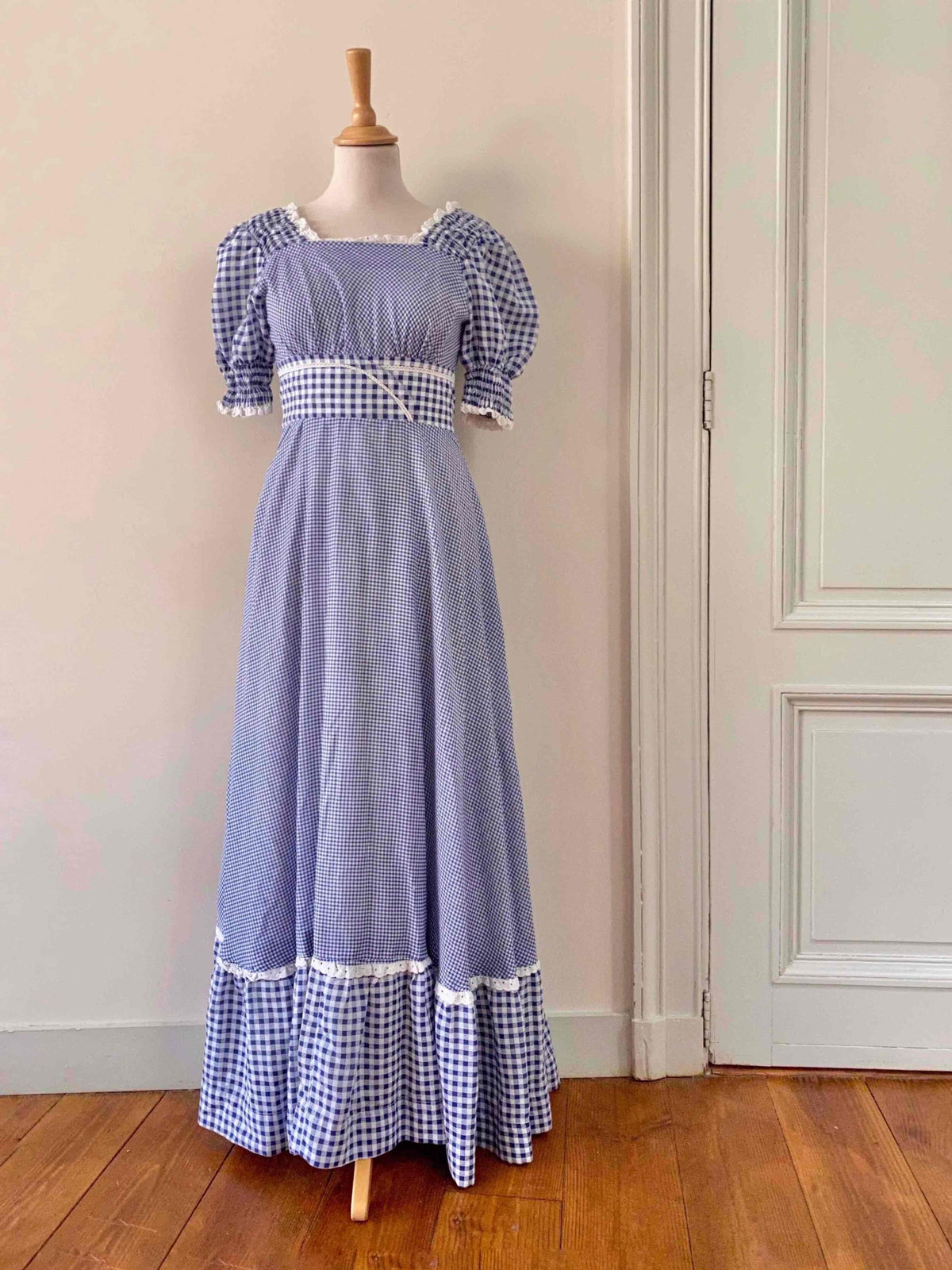 Prix unitaire parRobe longue vichy 70s, en coton mélangé à carreaux vichy bleus et blancs, bordée de dentelle et broderies anglaises blanches, manches ballons, encolure corsage smockée, ceinture taille à nouer, bas à jupon volantés, années 70, taille 36, portée ici sur un mannequin T36, aisselles 43 cm.