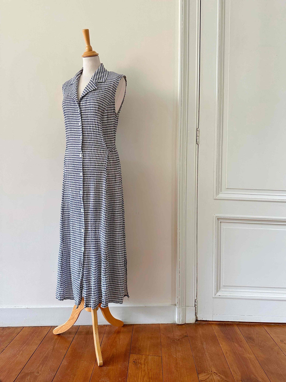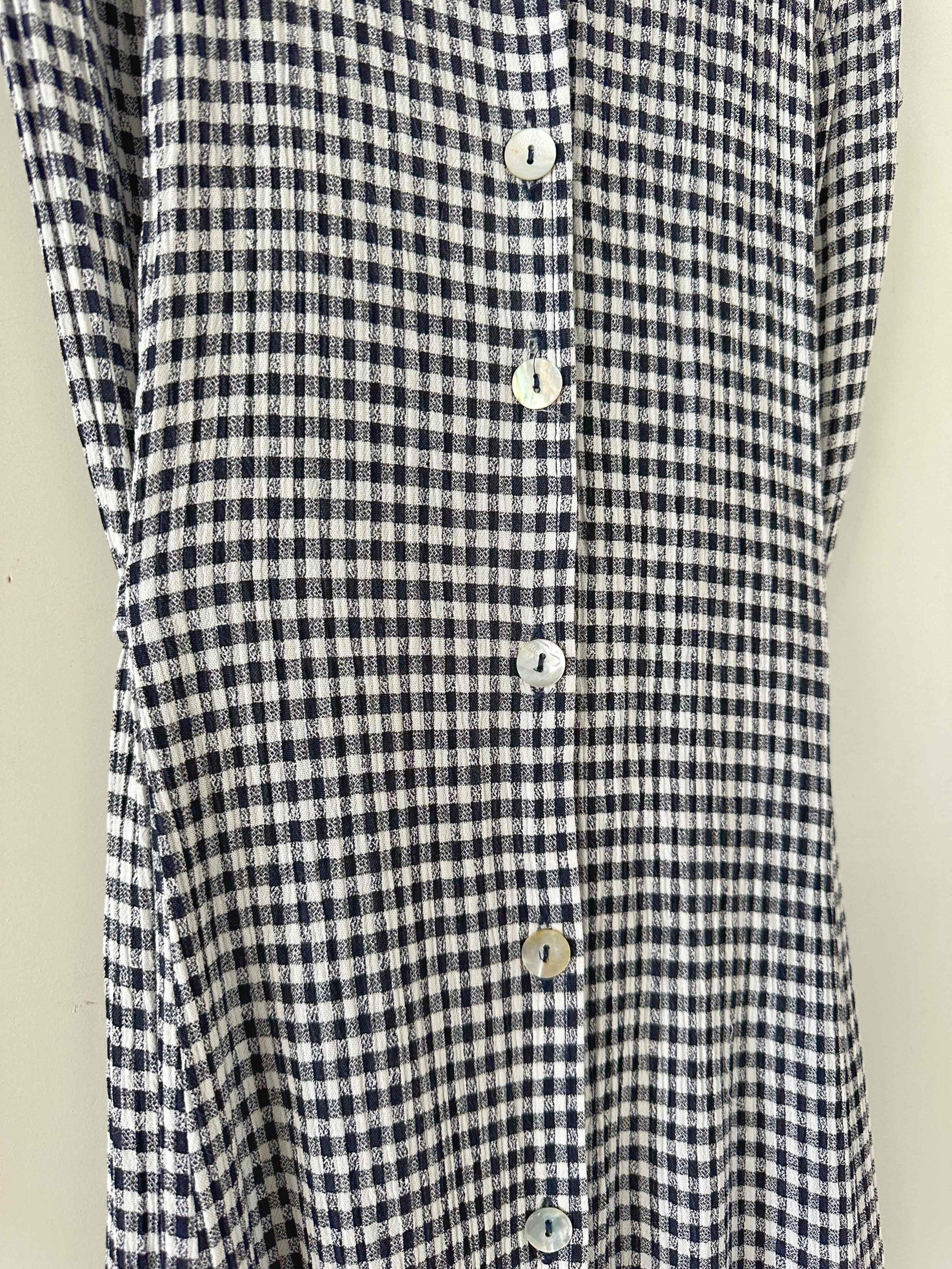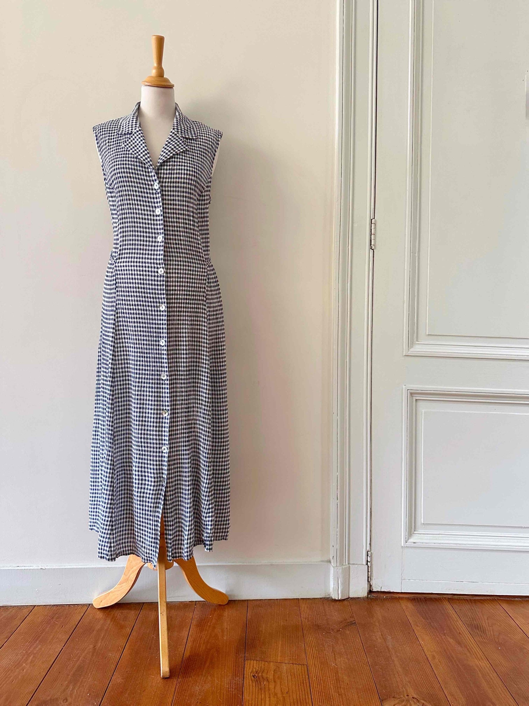 Prix unitaire parRobe boutonnée vichy, en viscose plissée à carreaux vichy noirs et blancs, sans manches, col chemisier, boutons en nacres, taille à nouer devant ou dos, années 90s, taille 36 portée ici sur un mannequin T36, aisselles 44cm.