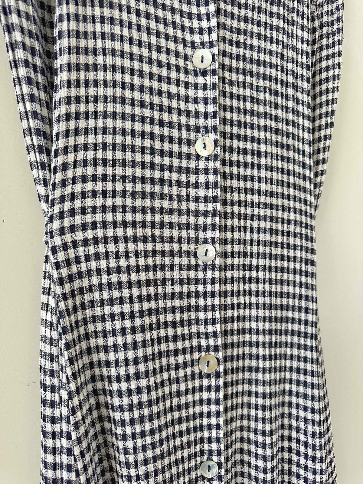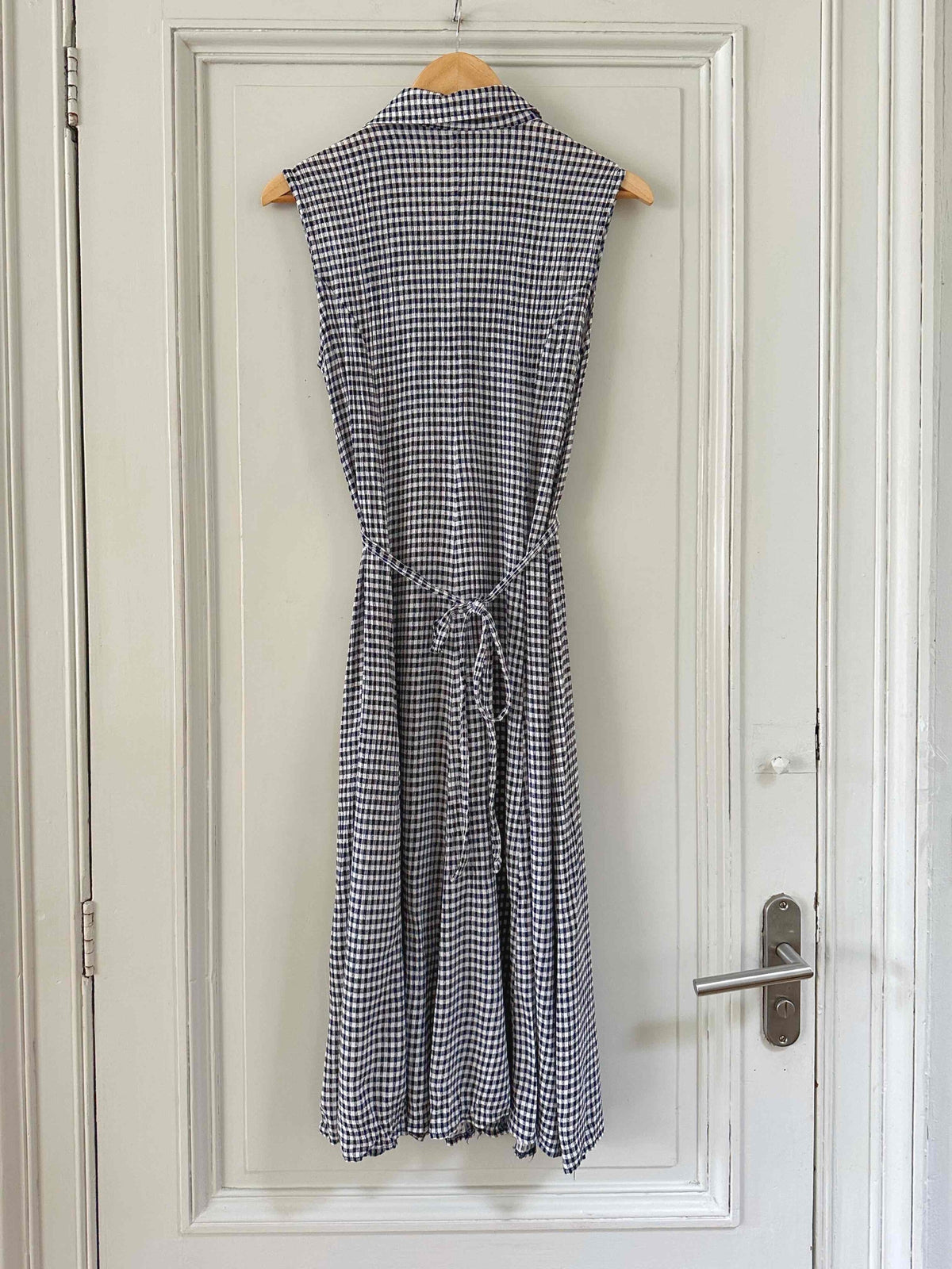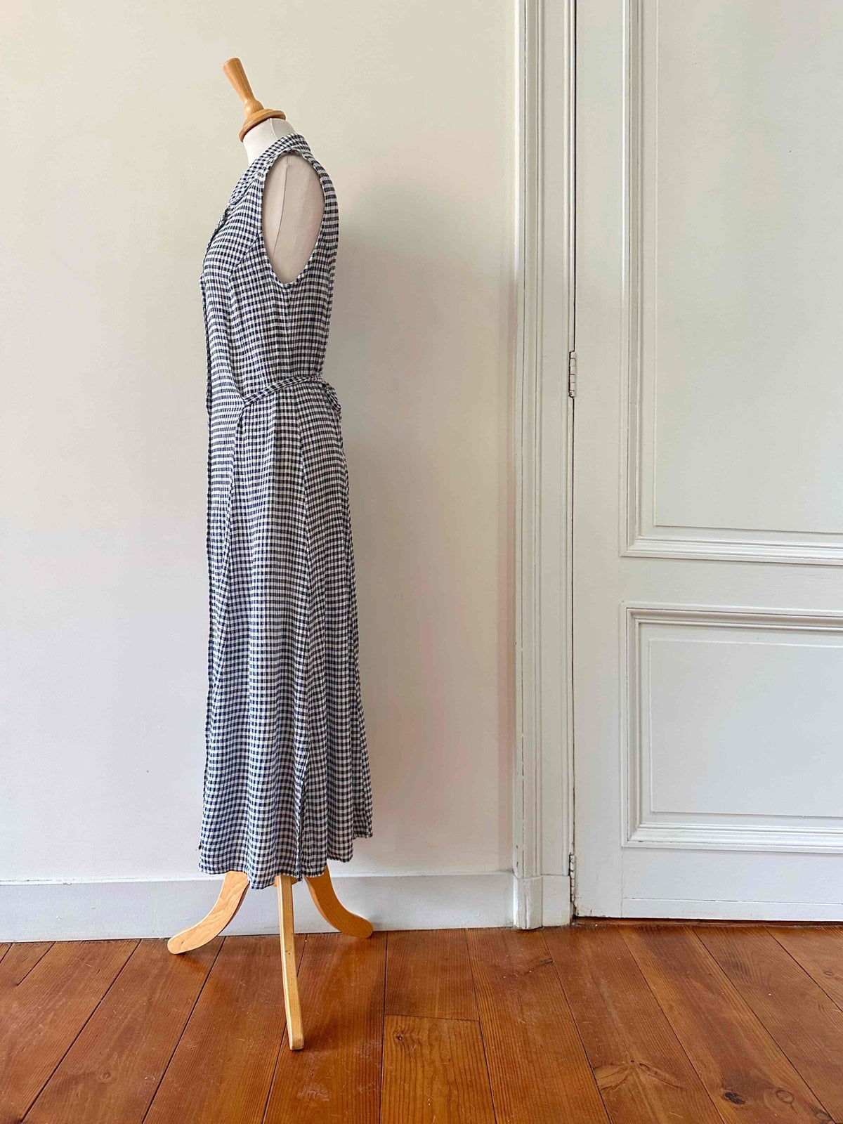 Prix unitaire parRobe boutonnée vichy, en viscose plissée à carreaux vichy noirs et blancs, sans manches, col chemisier, boutons en nacres, taille à nouer devant ou dos, années 90s, taille 36 portée ici sur un mannequin T36, aisselles 44cm.