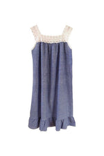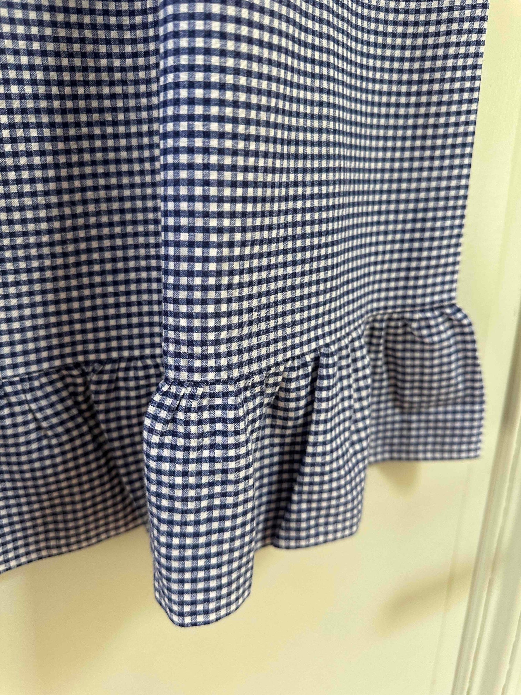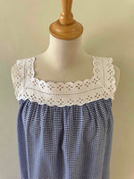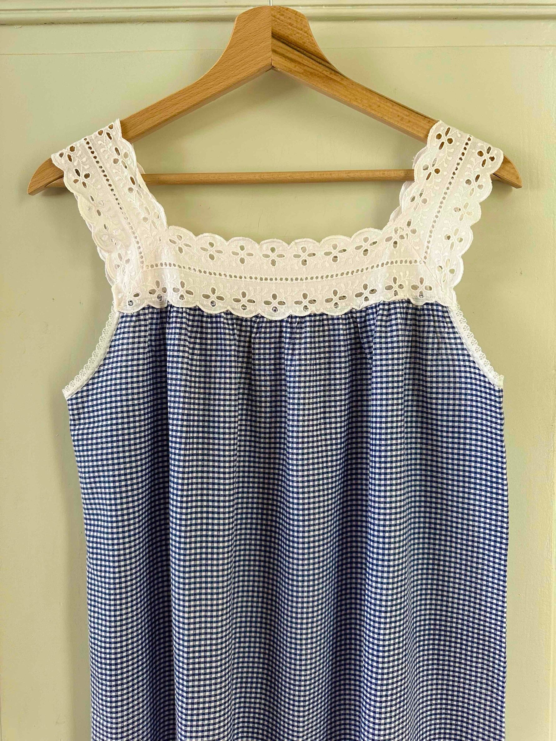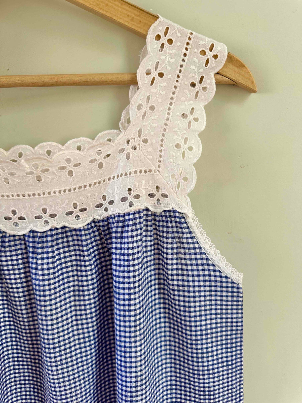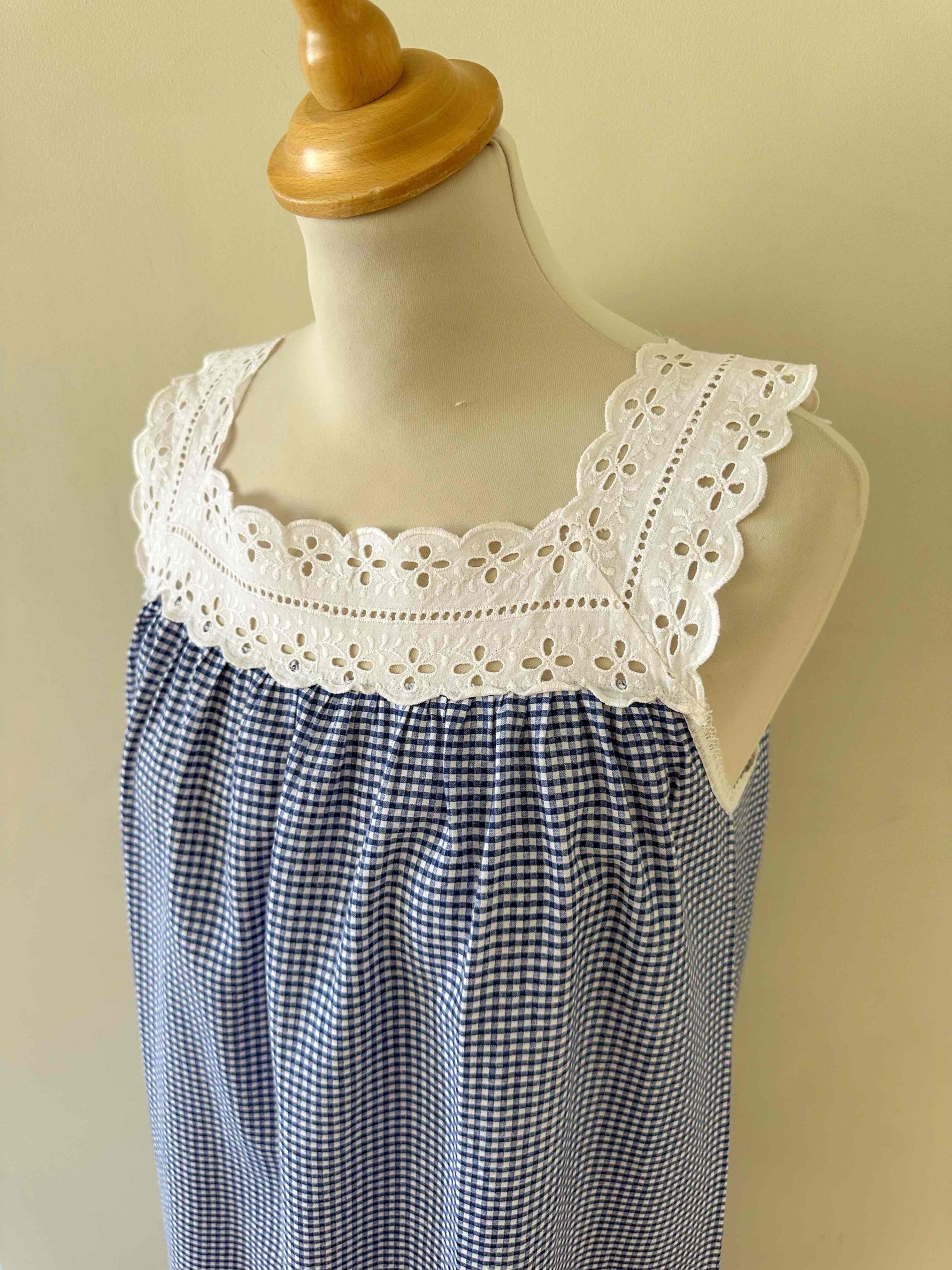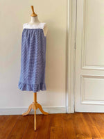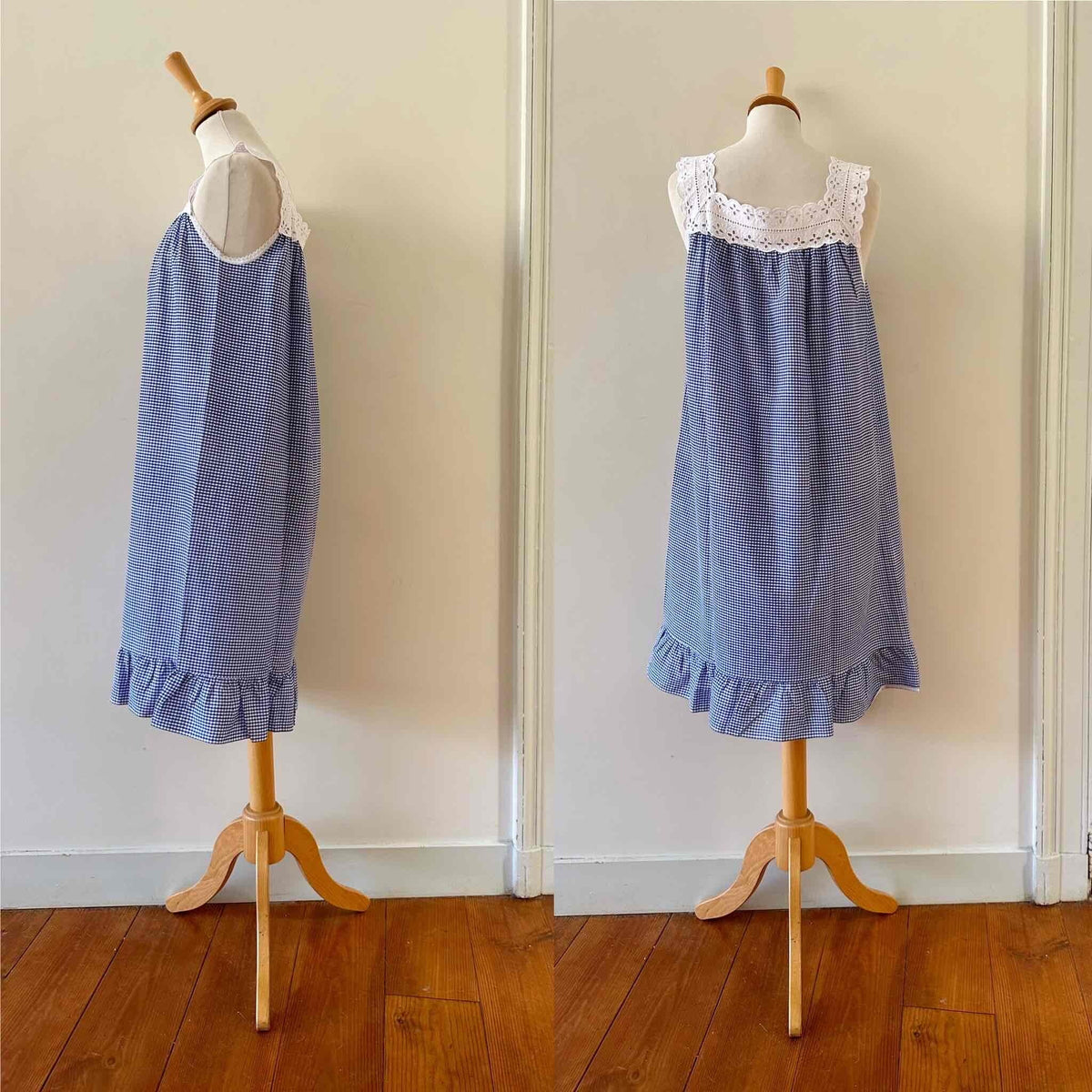 Prix unitaire parRobe vichy 70s, en coton à carreaux vichy bleus et blancs, encolure et bretelles en broderies anglaises ajourées blanches, faite main, forme évasée babydoll, années 70s, convient aux tailles 36 et 38, portée ici sur un mannequin T36, aisselles 45 cm.