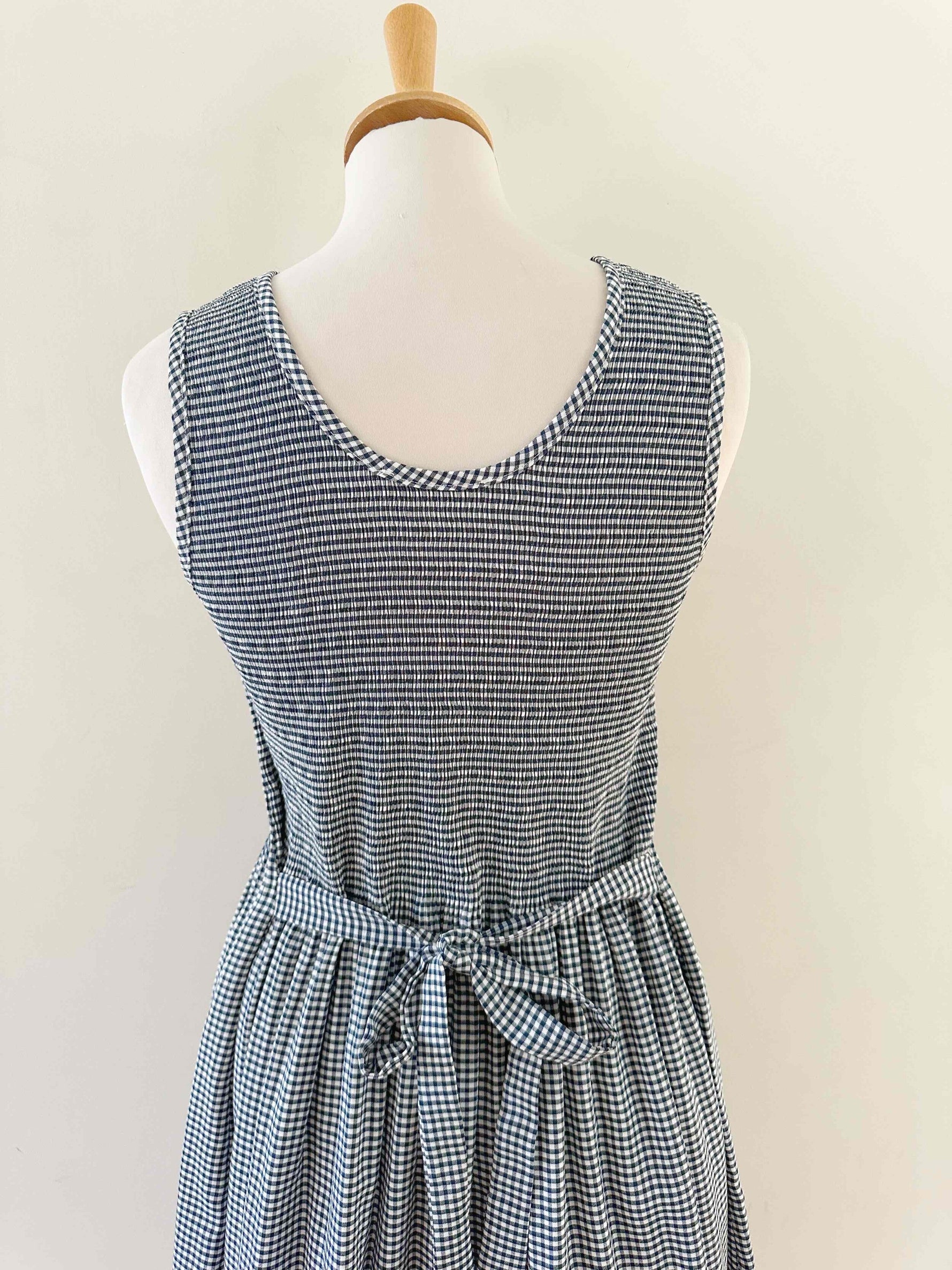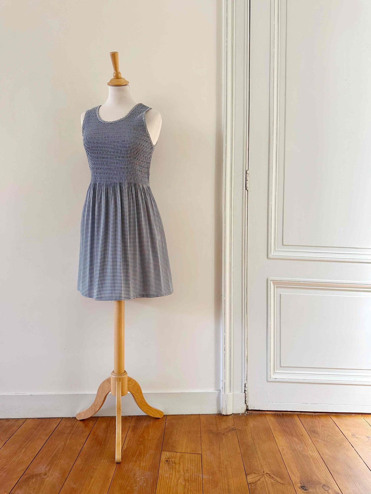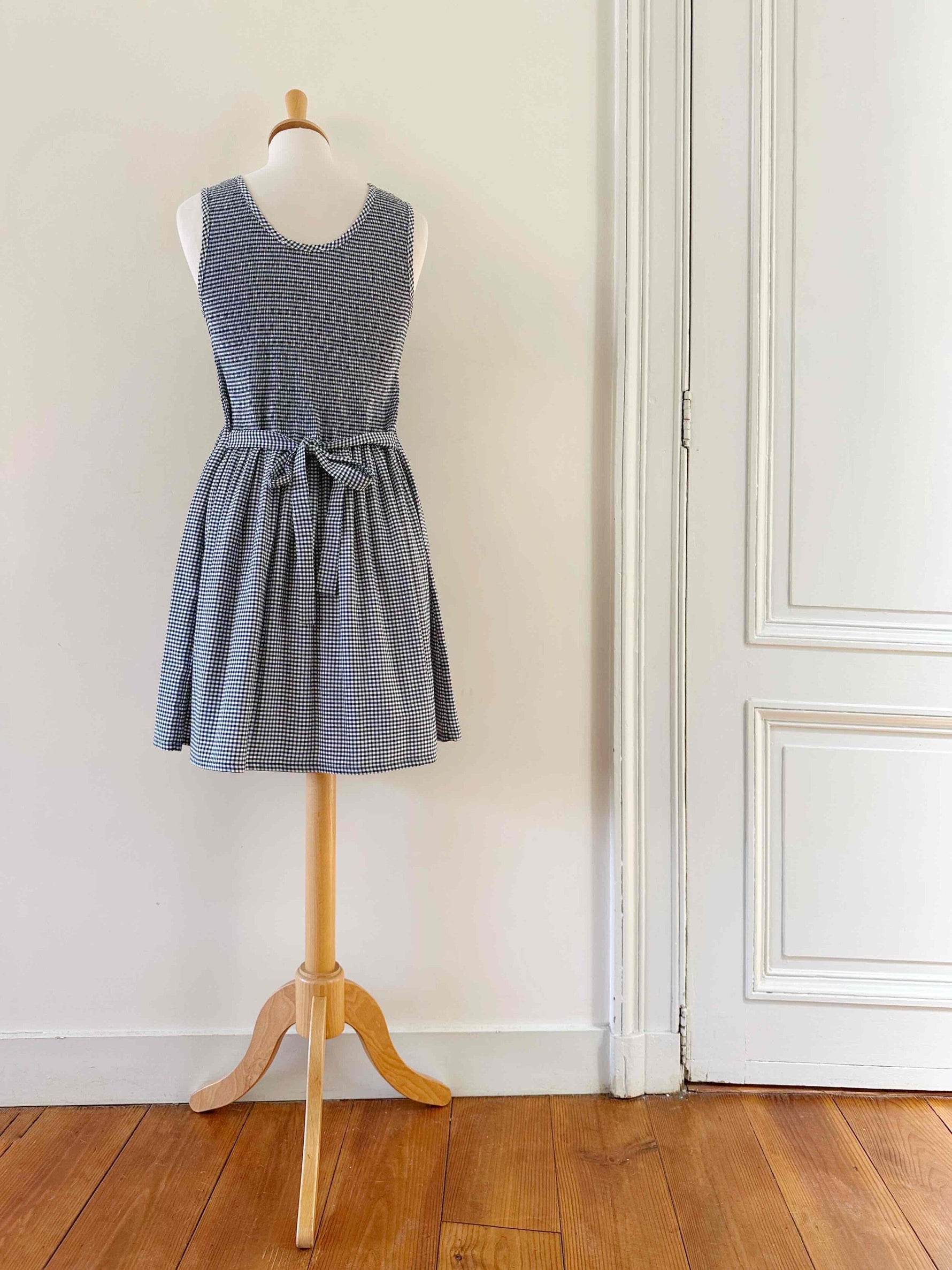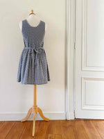 Prix unitaire parRobe mini vichy, en viscose mélangée, haut smocks élastique, carreaux vichy bleu foncé et blancs, ceinture taille a nouer, longueur maxi, fabriquée en France, convient aux tailles 36 et 38 grâce à son haut smock exstensible, portée ici sur un mannequin T36.