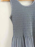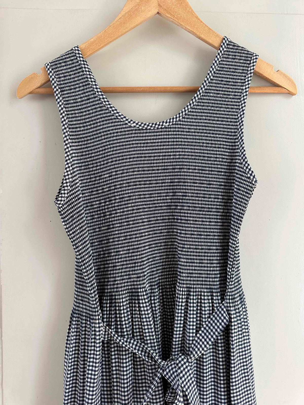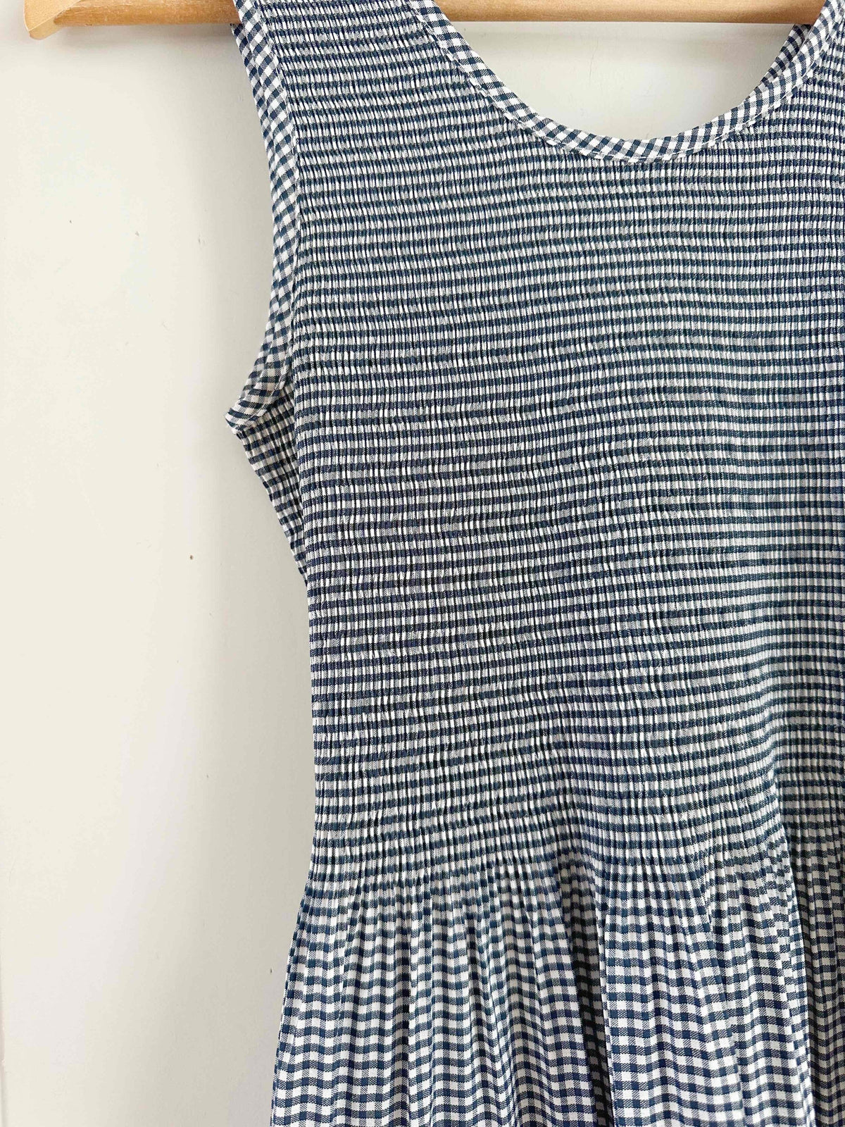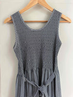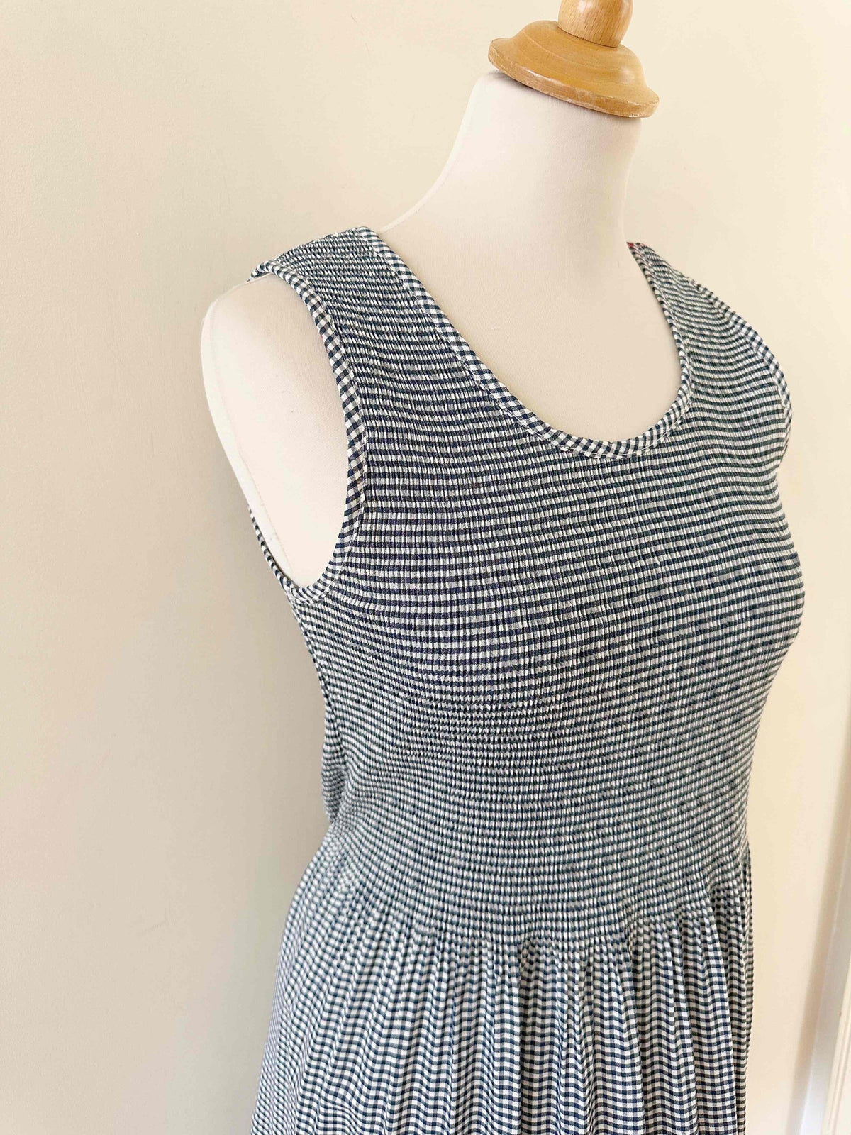 Prix unitaire parRobe mini vichy, en viscose mélangée, haut smocks élastique, carreaux vichy bleu foncé et blancs, ceinture taille a nouer, longueur maxi, fabriquée en France, convient aux tailles 36 et 38 grâce à son haut smock exstensible, portée ici sur un mannequin T36.