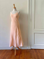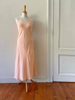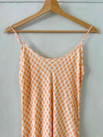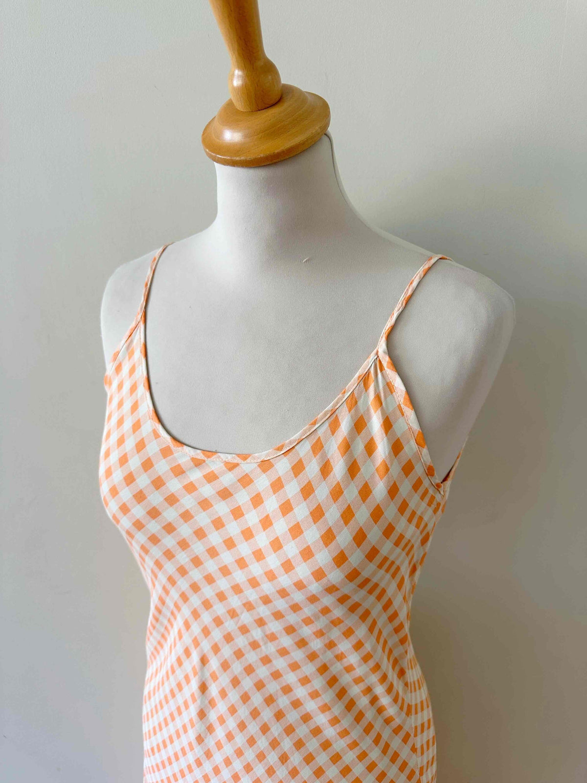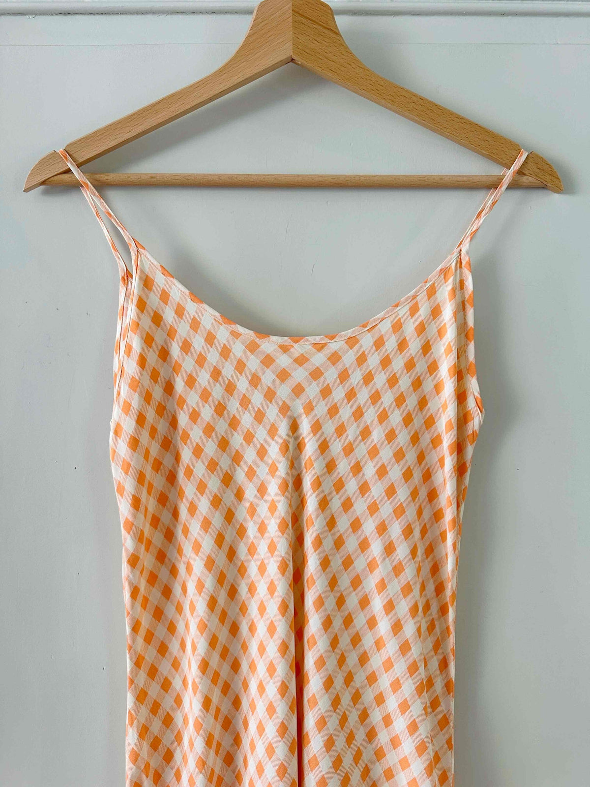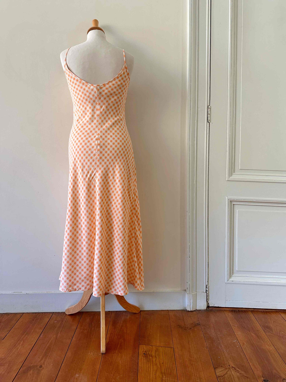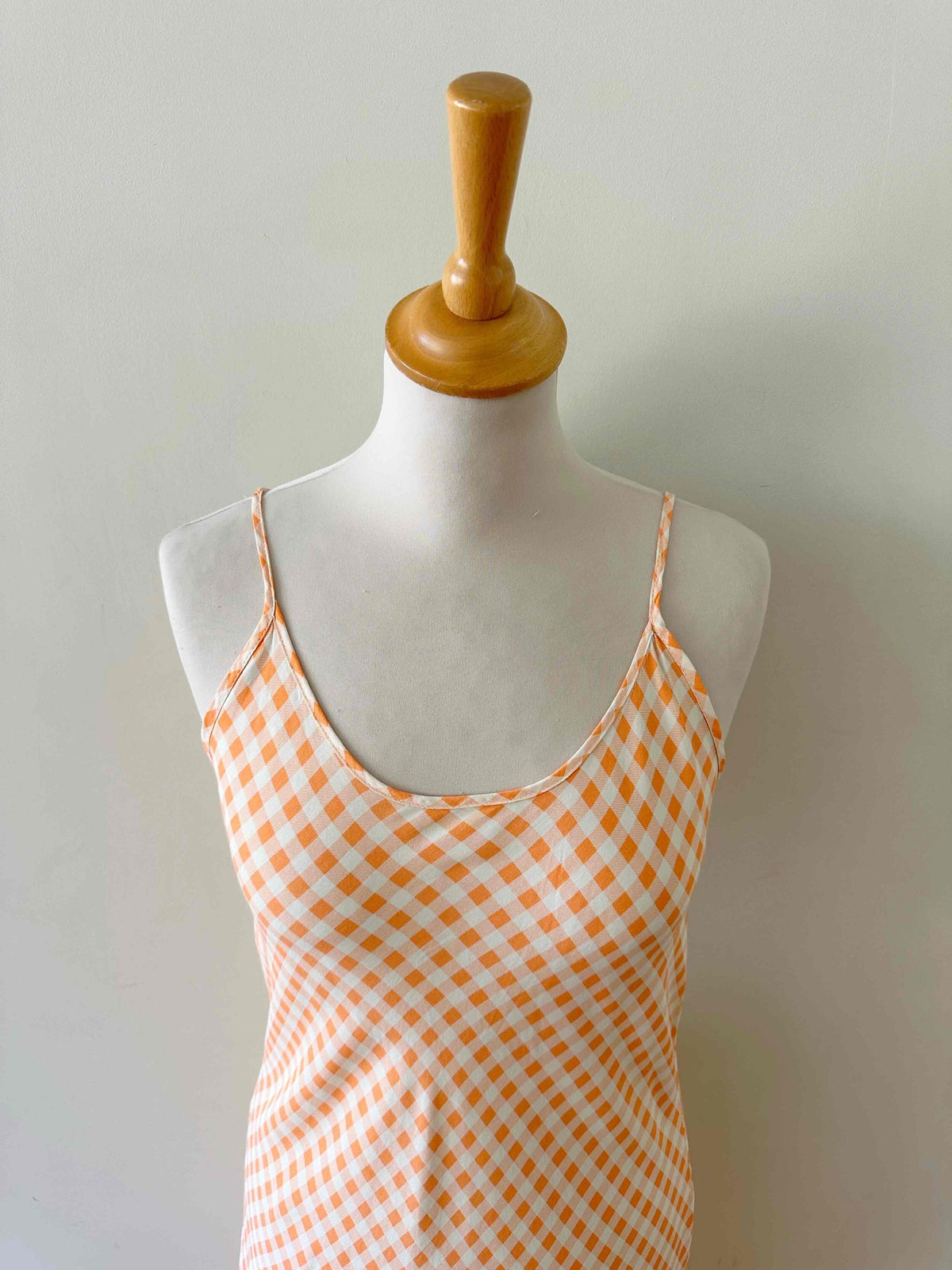 Prix unitaire parRobe nuisette vichy, en viscose à carreaux vichy orange melon et blancs, bretelles spaghettis, forme en biais, longueur maxi, fabriquée en France, taille 36 portée ici sur un mannequin T36. Aisselles 43cm.