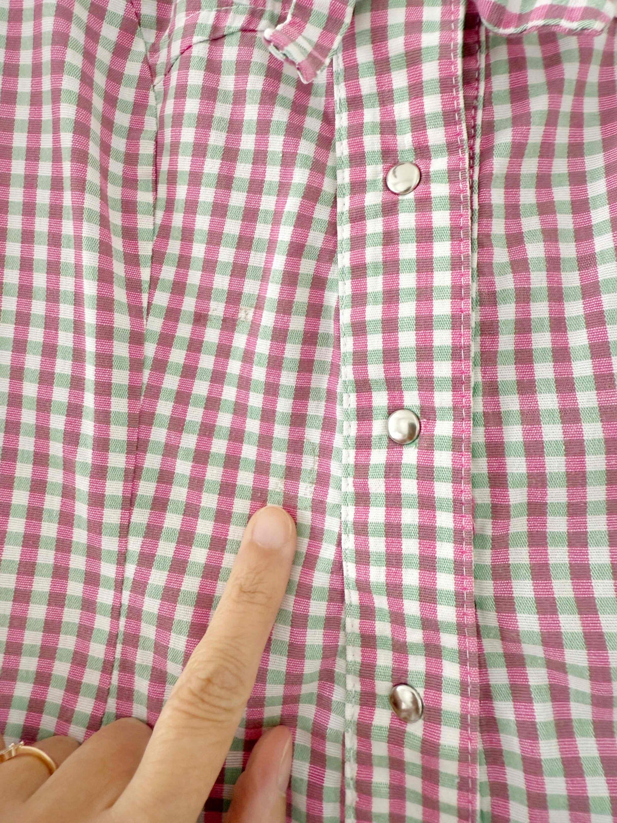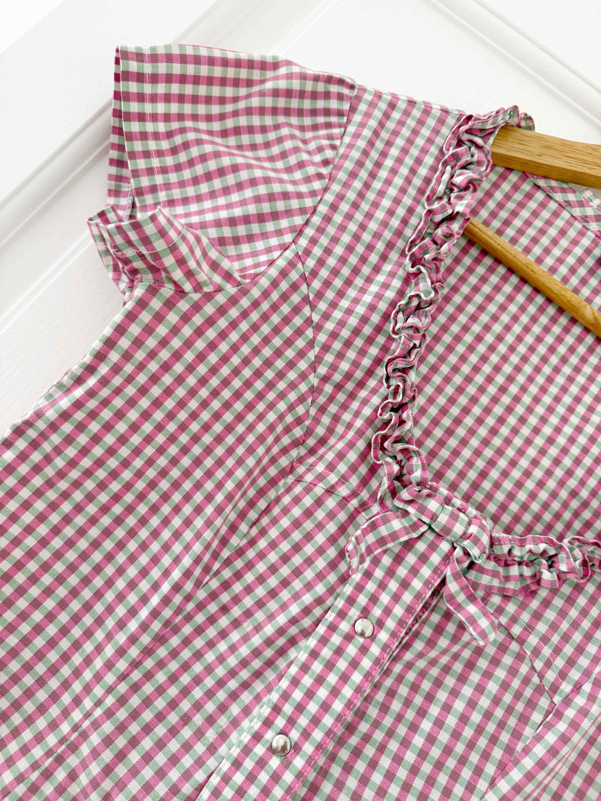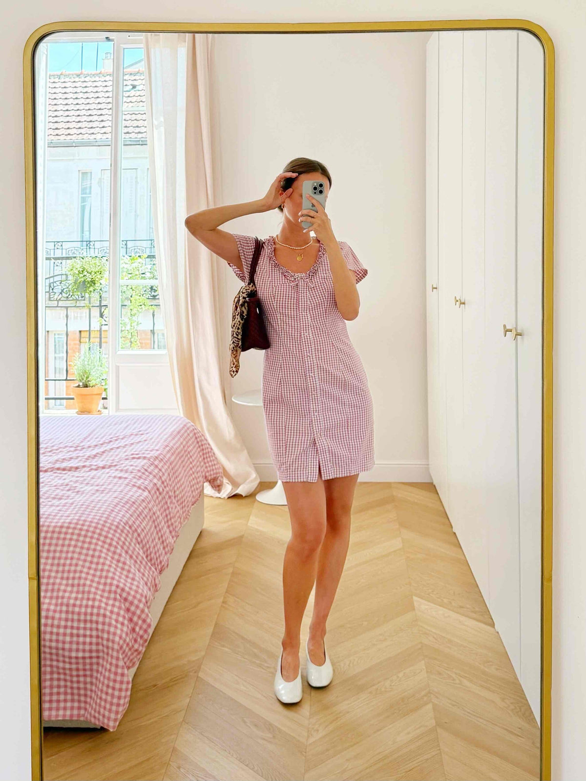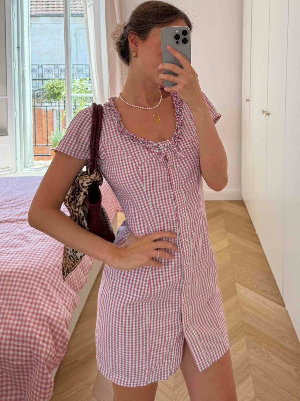 Prix unitaire parRobe vichy à petits carreaux roses, blancs et verts, boutonnée sur le devant.