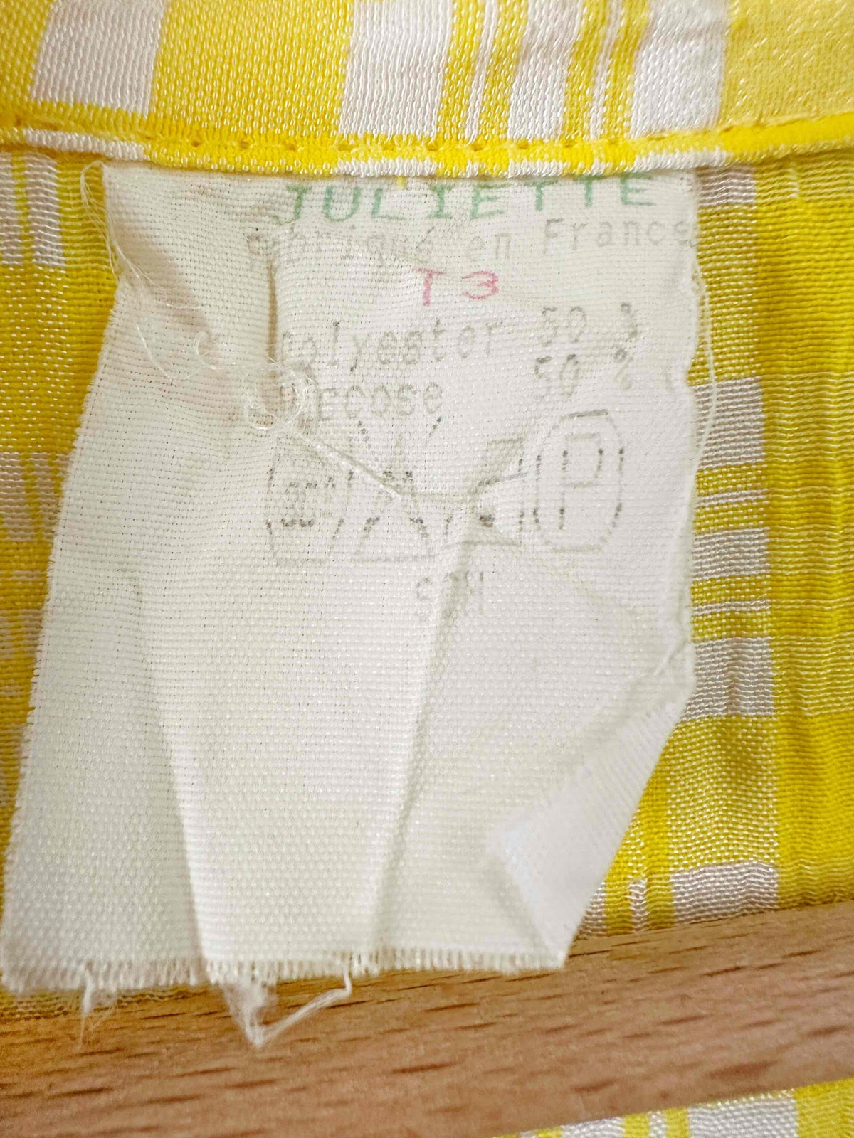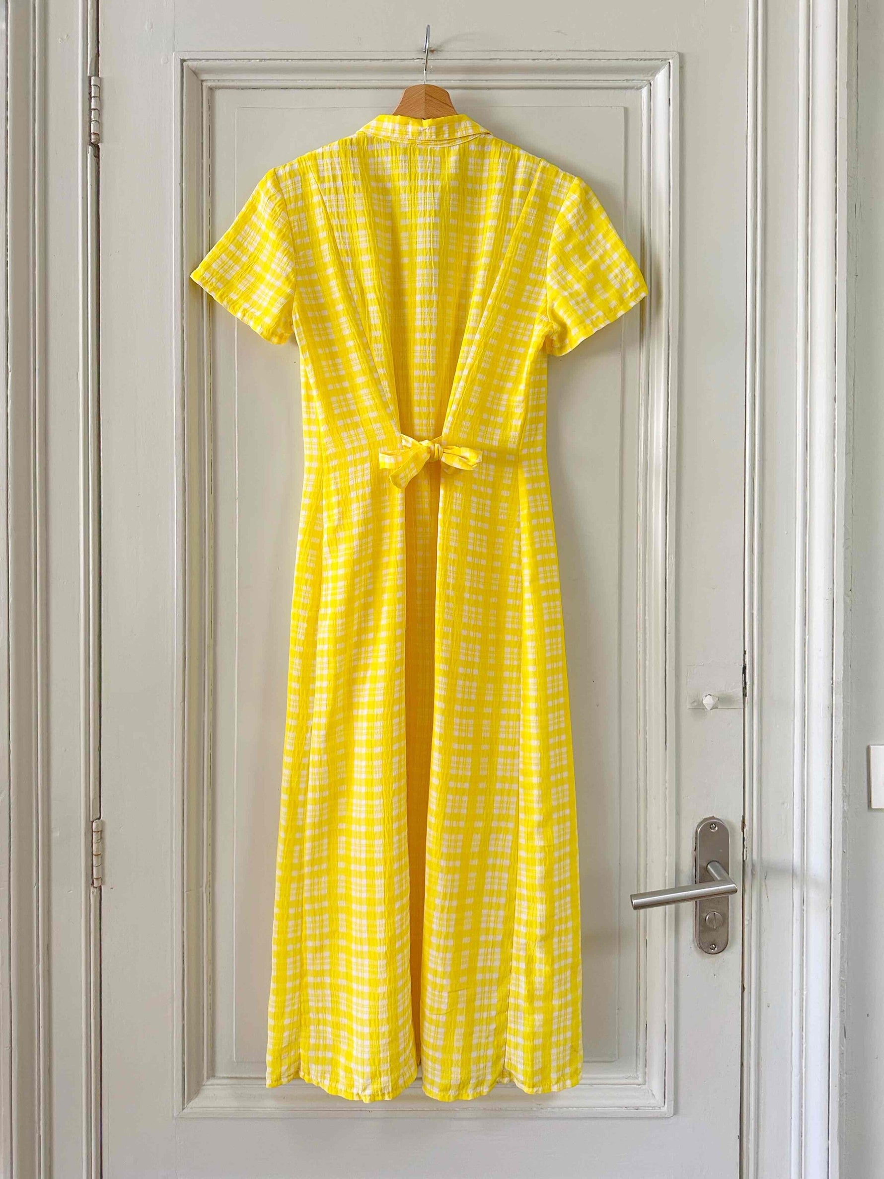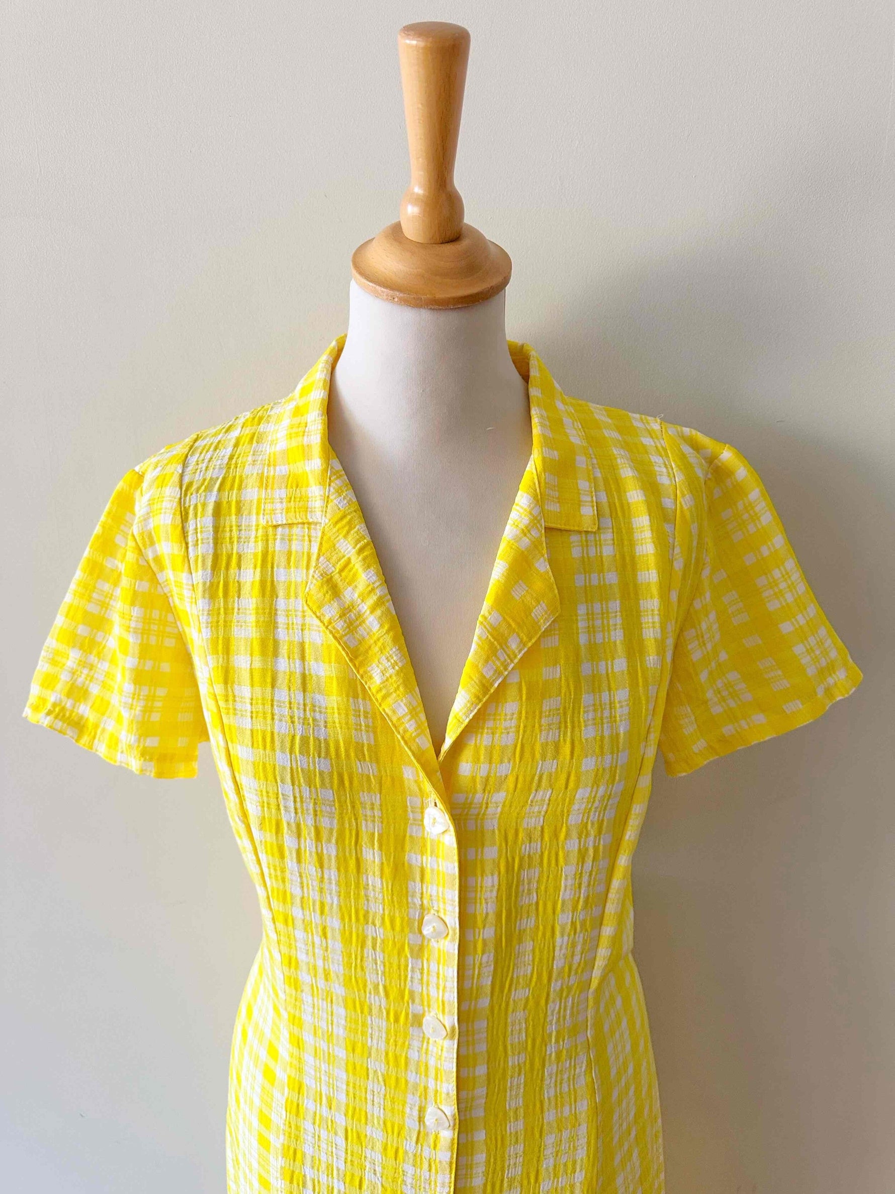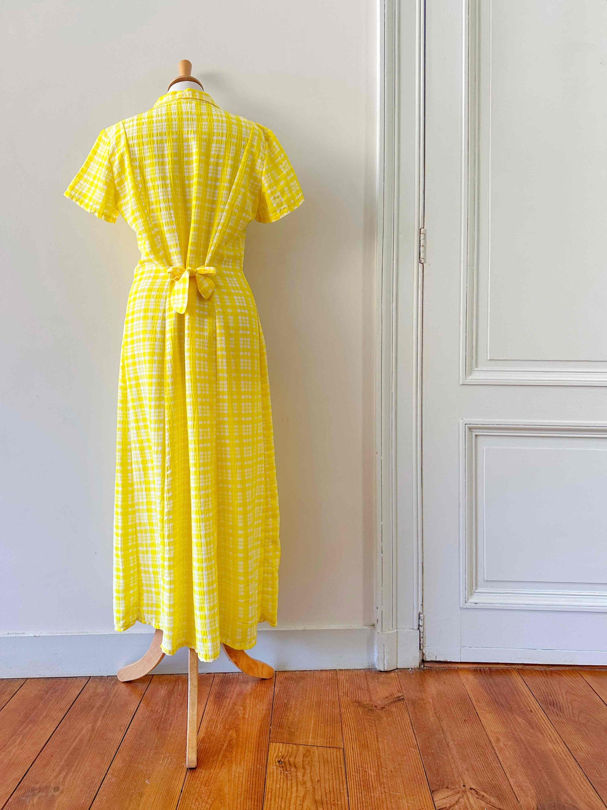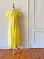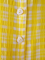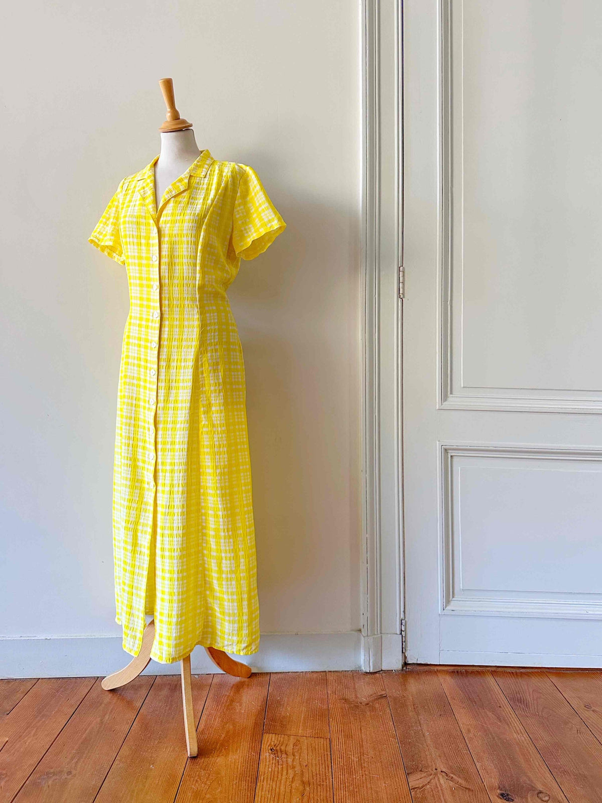 Prix unitaire parRobe boutonnée vichy, en viscose mélangée tissus gaufré, carreaux vichy jaune citron et blancs, boutons en forme de cœurs nacrés, taille dos à nouer, fabriquée en France, taille 36 portée ici sur un mannequin T36, aisselles 44cm.