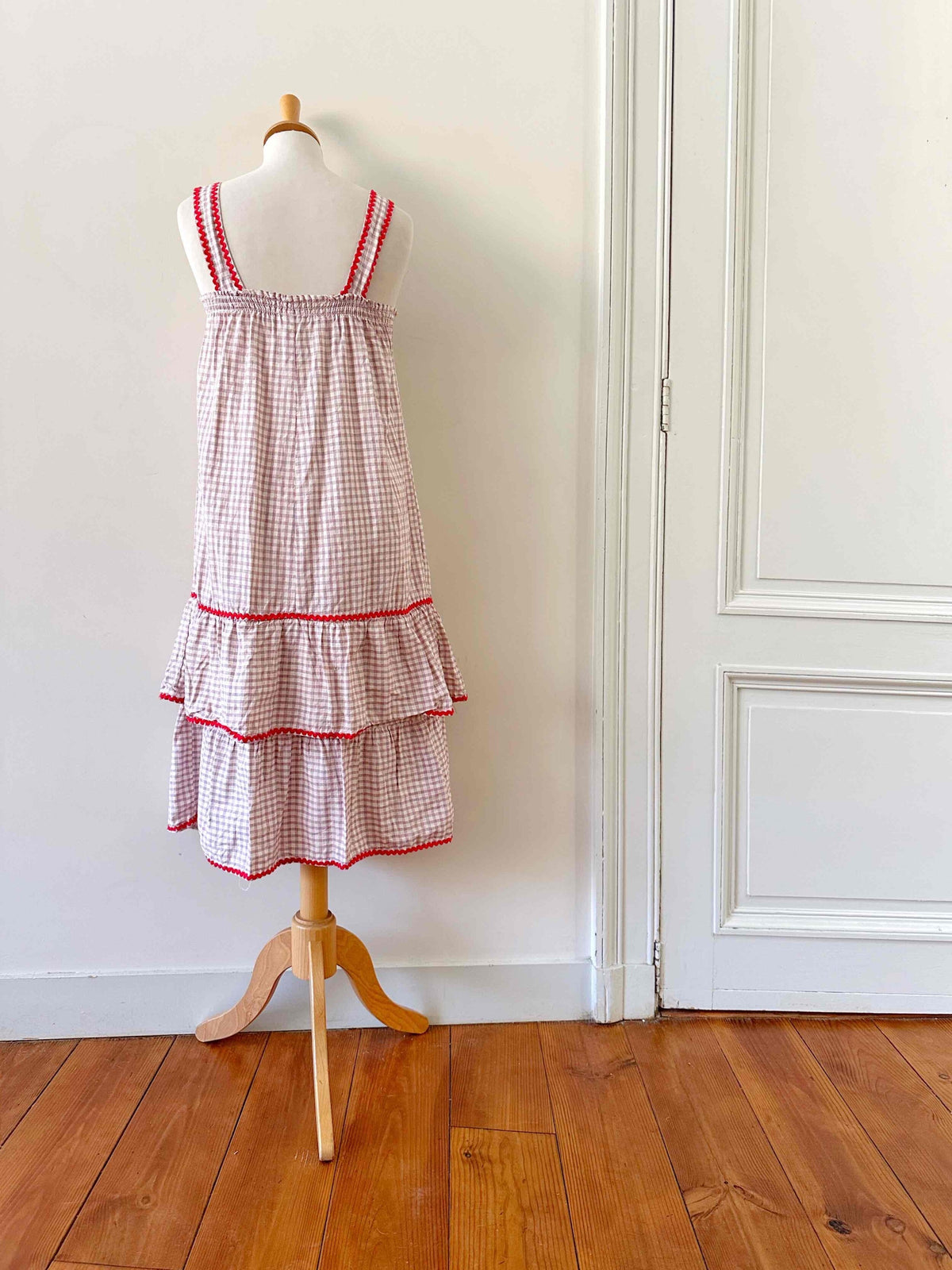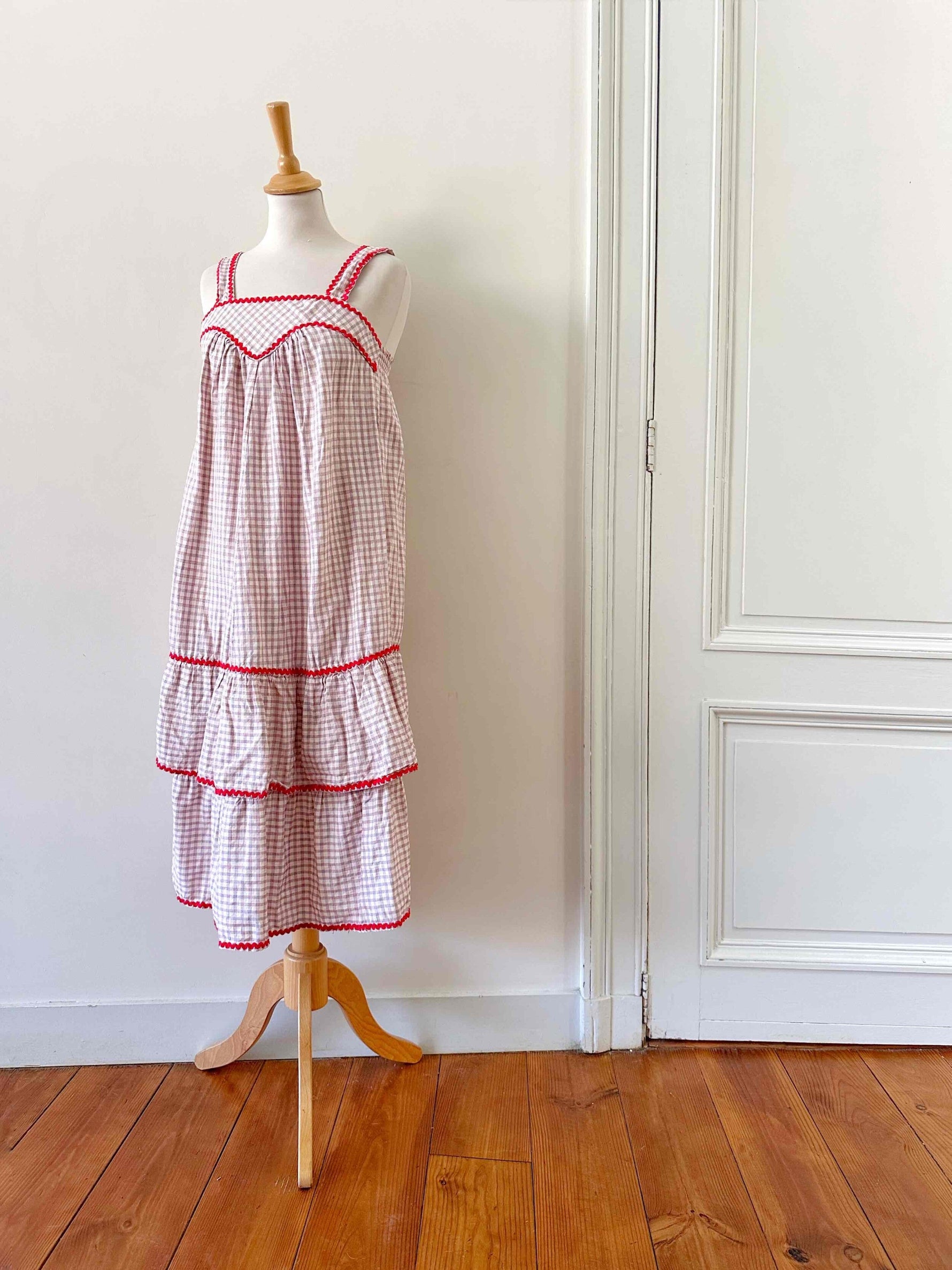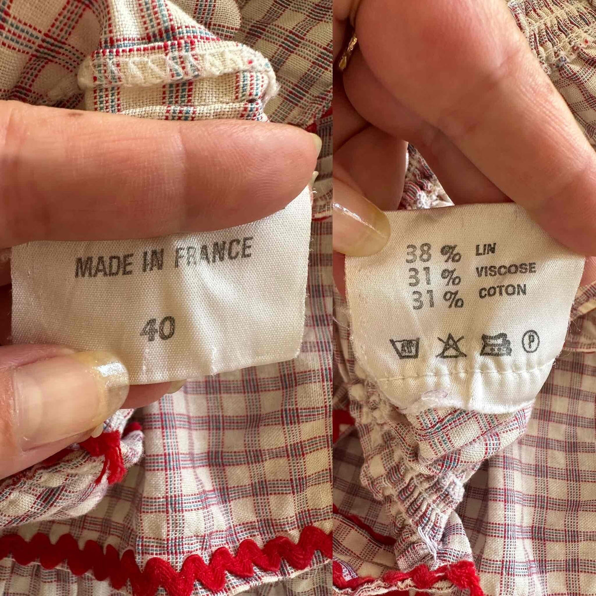 Prix unitaire parRobe vichy 70s, en lin, coton et viscose à carreaux vichy rouges et bleus fond écru, bretelles et bordures brodées de croquet rouge, dos élastique sous poitrine forme bustier, fabriquée en France, années 70s, taille 36 porté ici sur un mannequin T36. Aisselles 43cm.