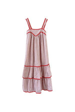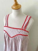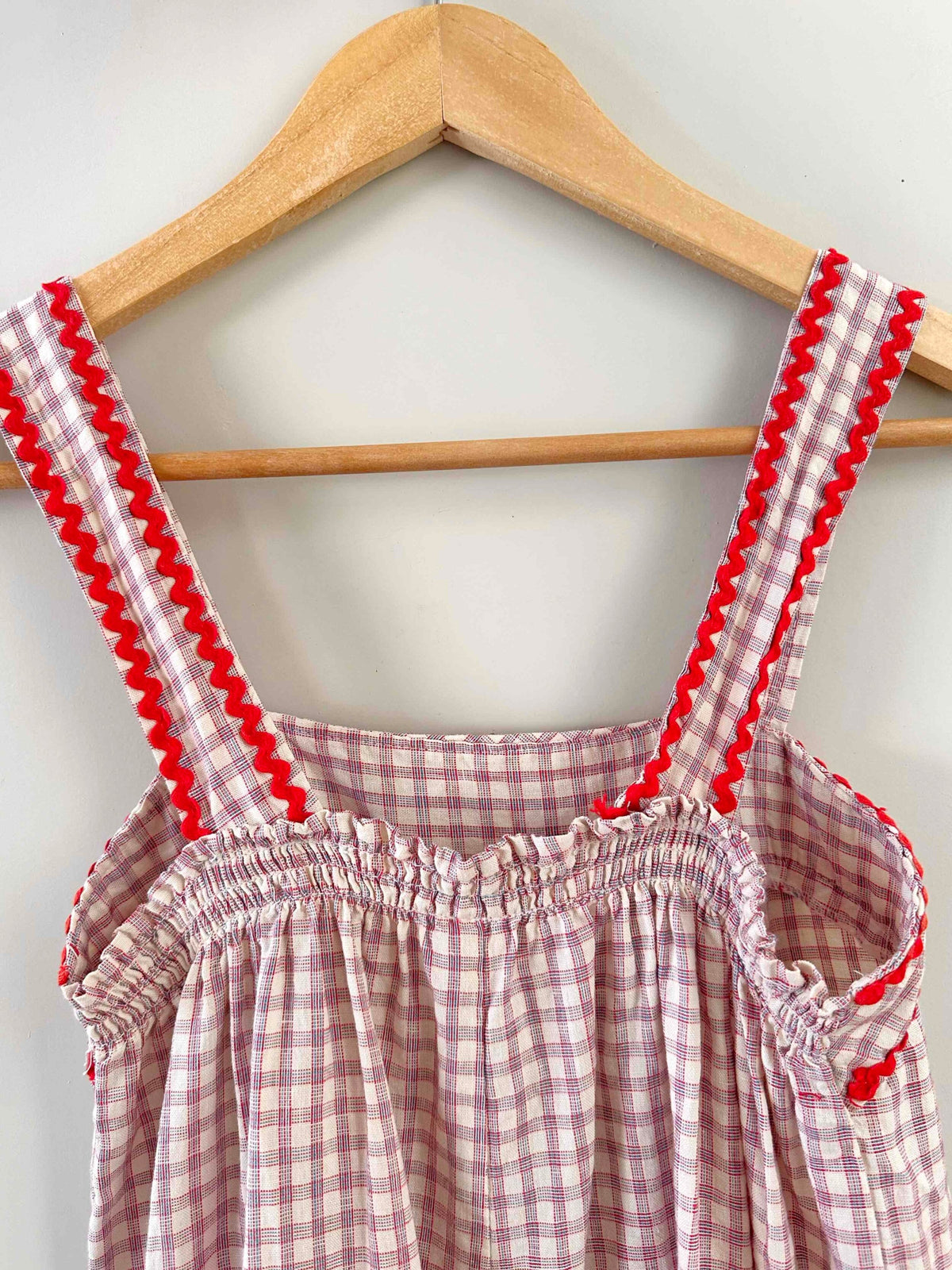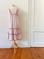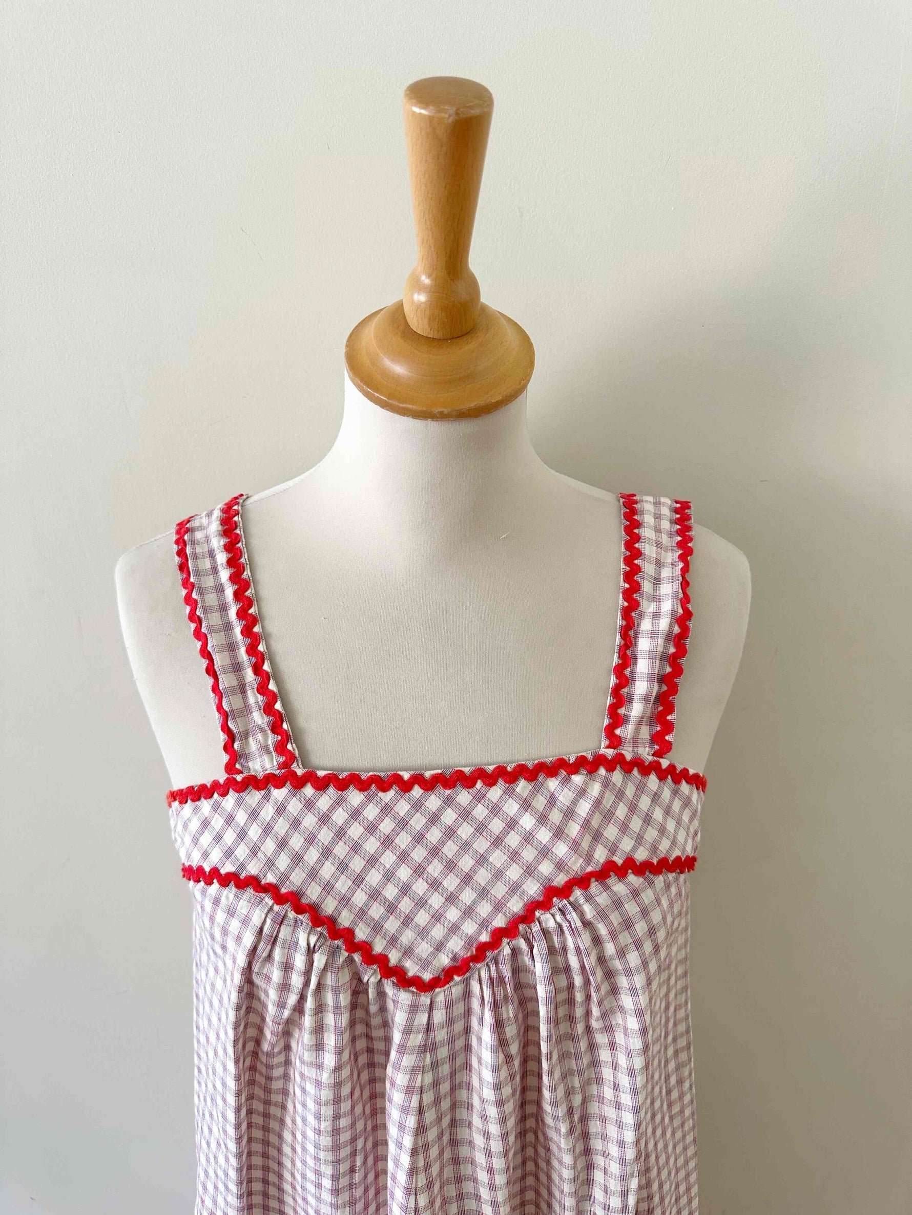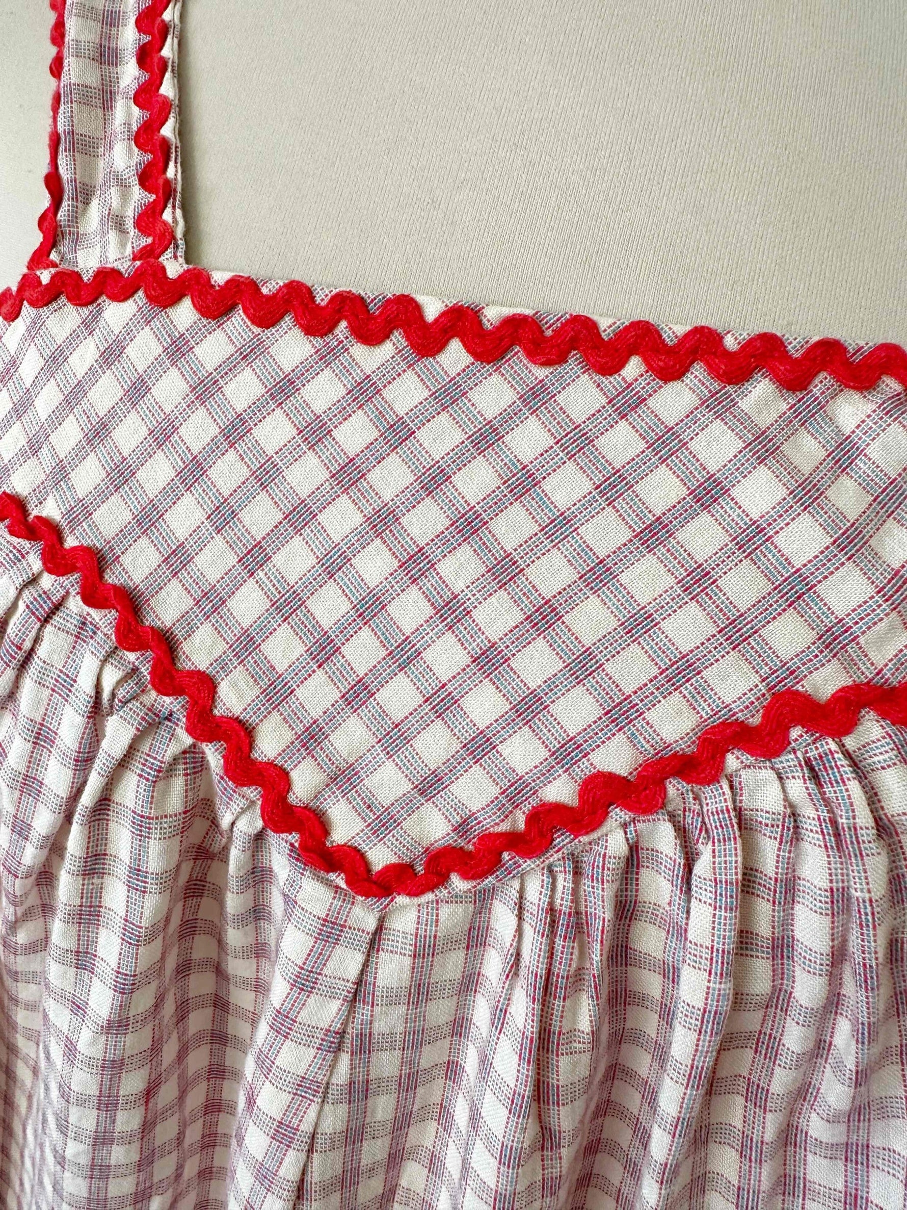 Prix unitaire parRobe vichy 70s, en lin, coton et viscose à carreaux vichy rouges et bleus fond écru, bretelles et bordures brodées de croquet rouge, dos élastique sous poitrine forme bustier, fabriquée en France, années 70s, taille 36 porté ici sur un mannequin T36. Aisselles 43cm.