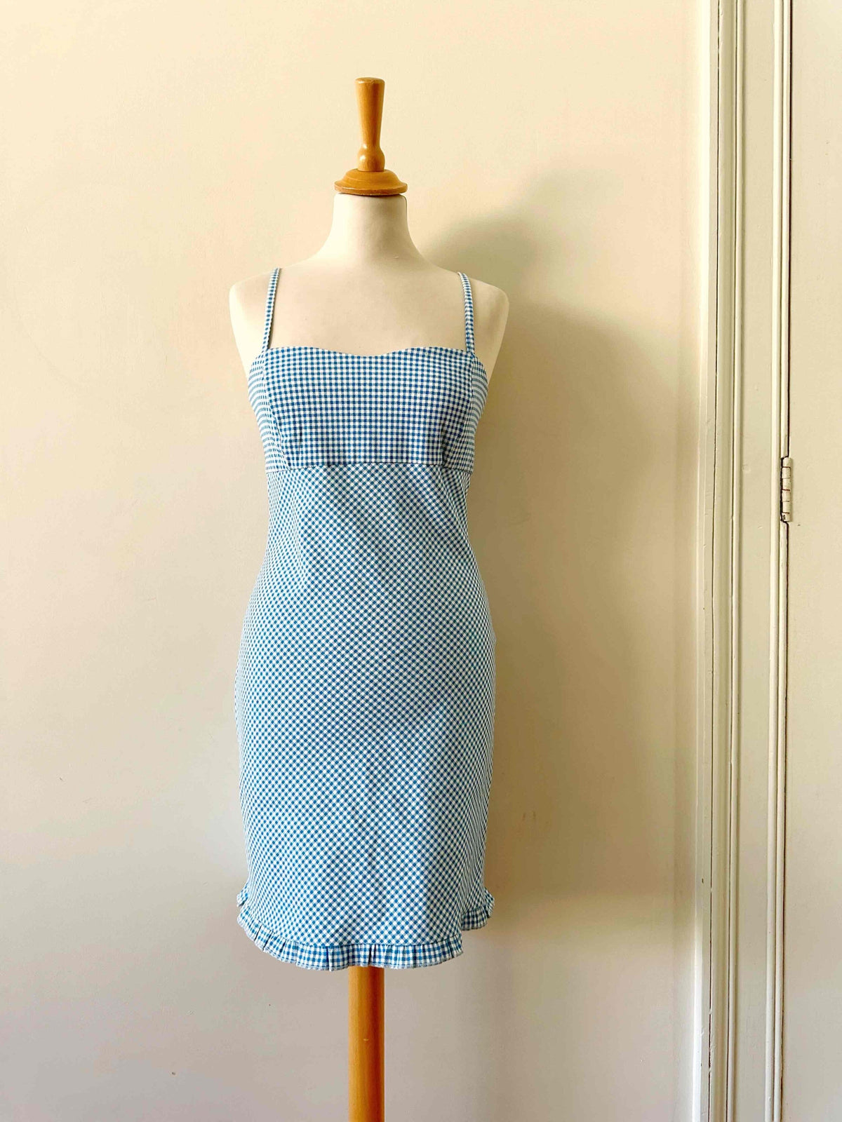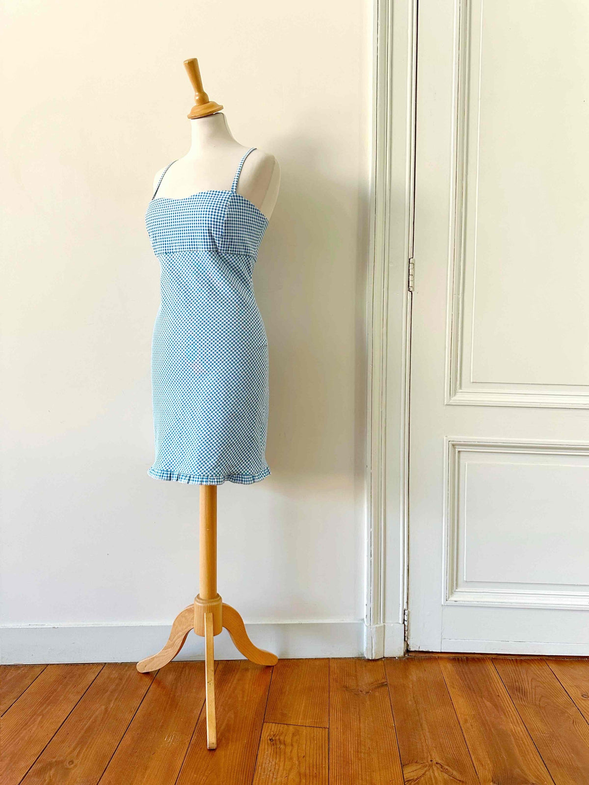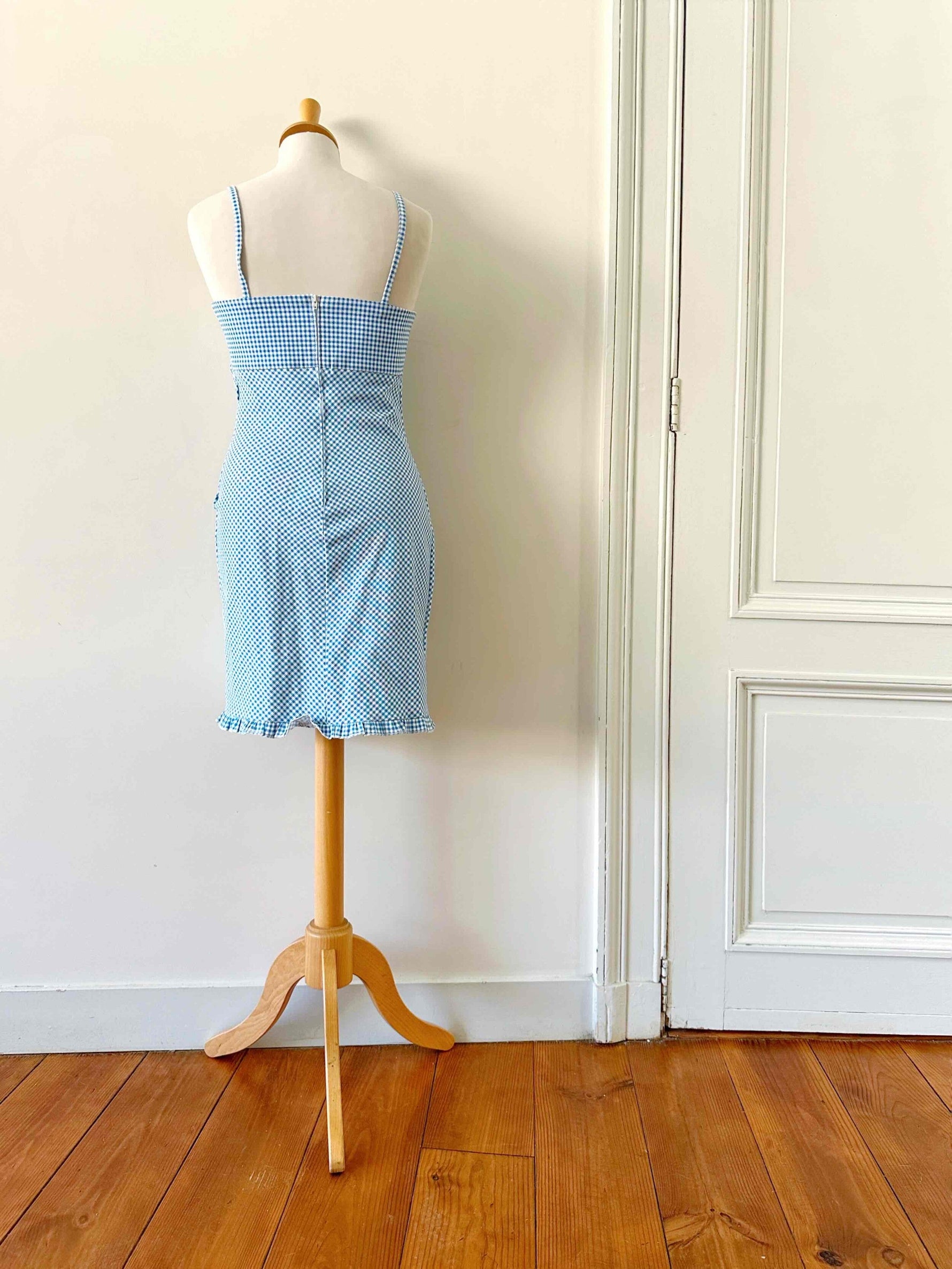 Prix unitaire parMini robe vichy, en viscose mélangée matière gainante effet gaufrée à carreaux vichy bleu piscine et blancs, fines bretelles, encolure corsage coeur, bas volanté petit froufrou, fabriquée en France, années 90's Taille 36 actuelle portée ici sur un mannequin T36.