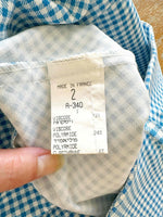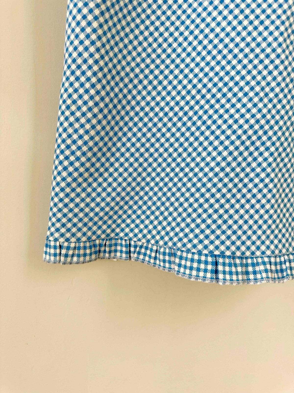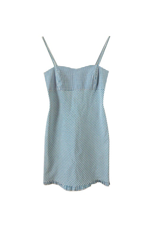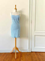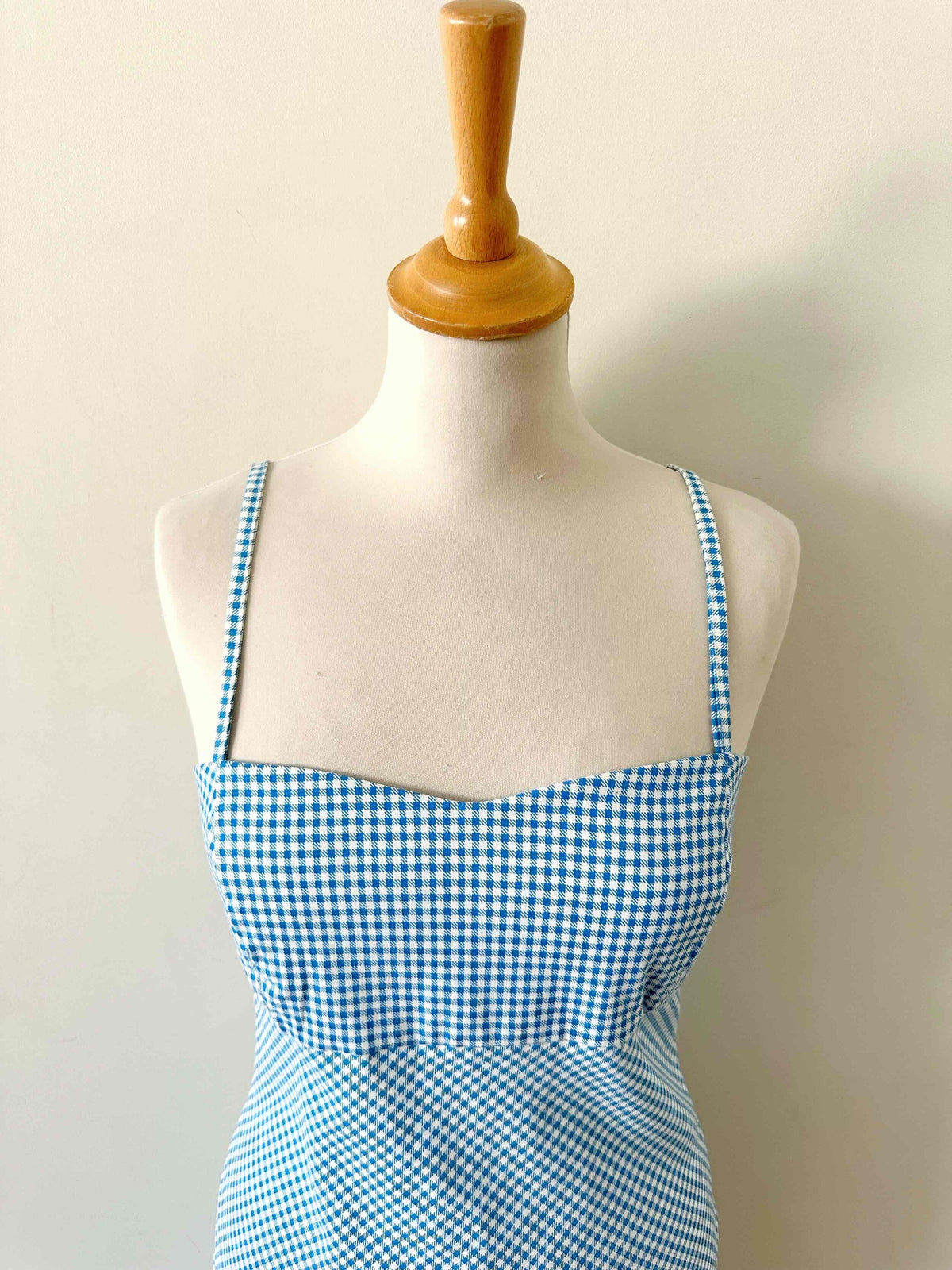 Prix unitaire parMini robe vichy, en viscose mélangée matière gainante effet gaufrée à carreaux vichy bleu piscine et blancs, fines bretelles, encolure corsage coeur, bas volanté petit froufrou, fabriquée en France, années 90's Taille 36 actuelle portée ici sur un mannequin T36.