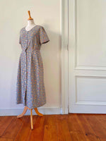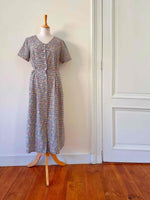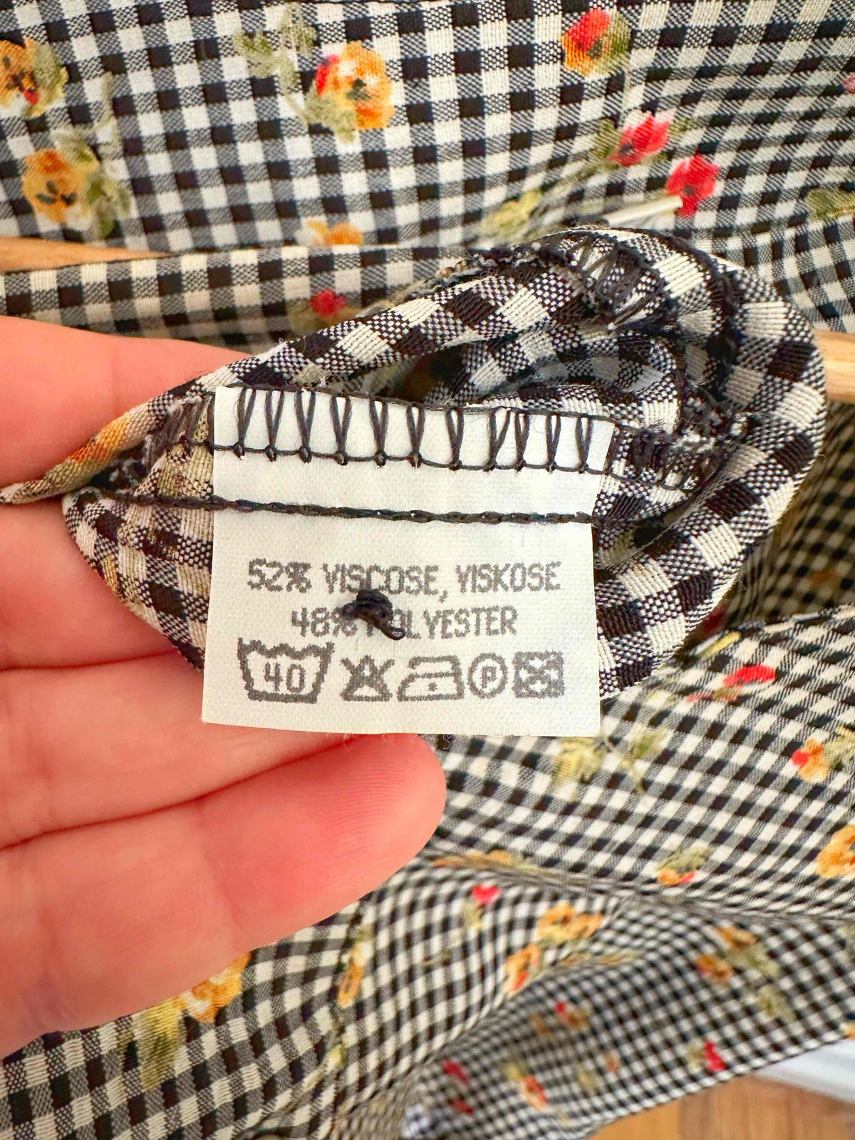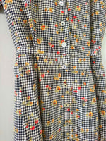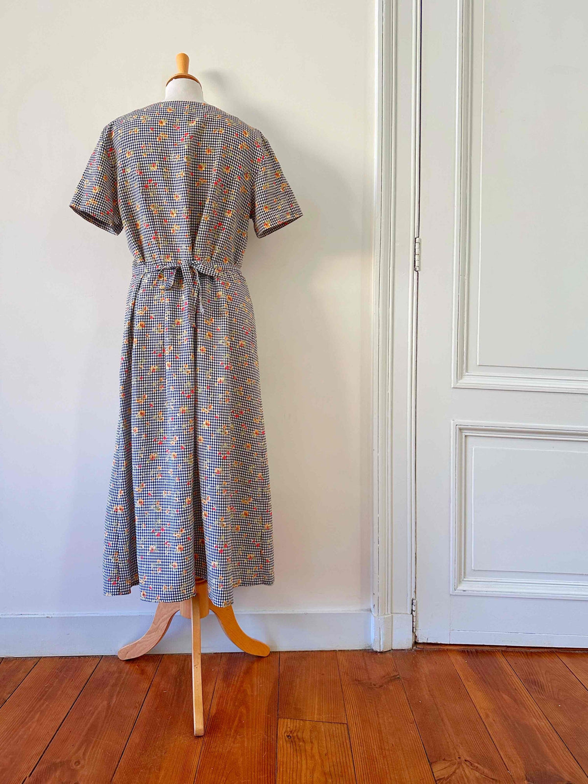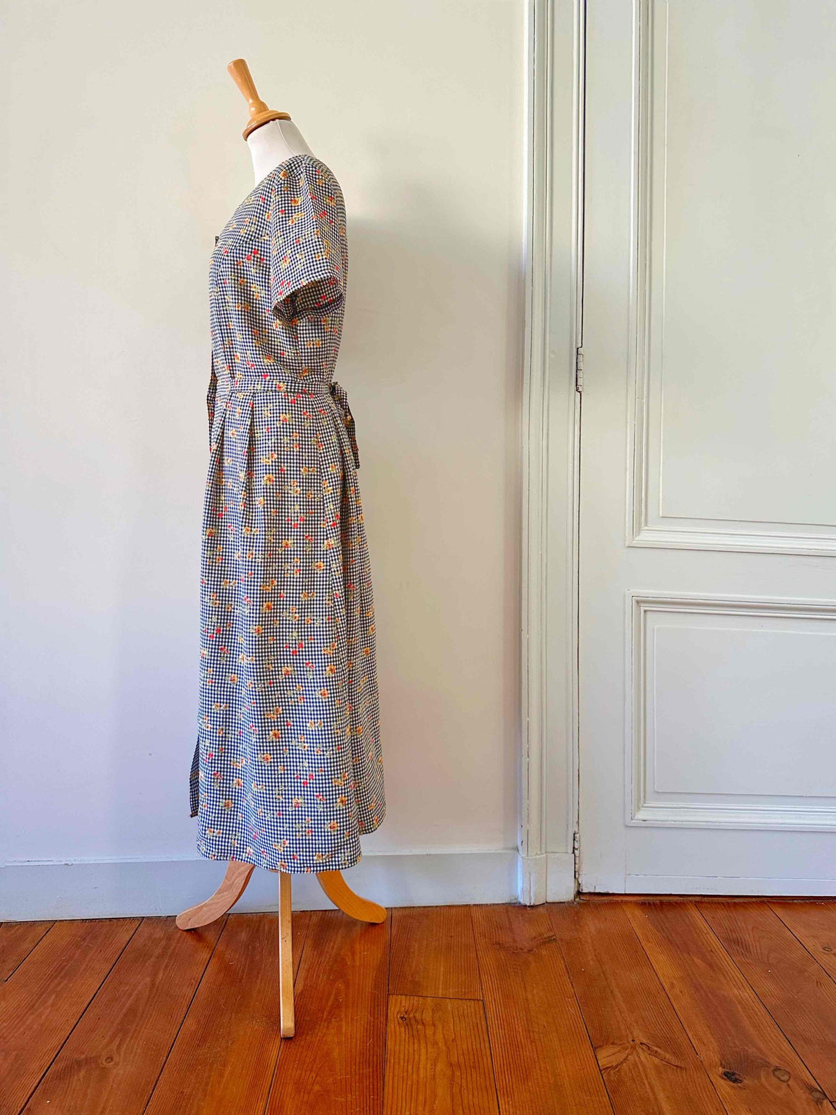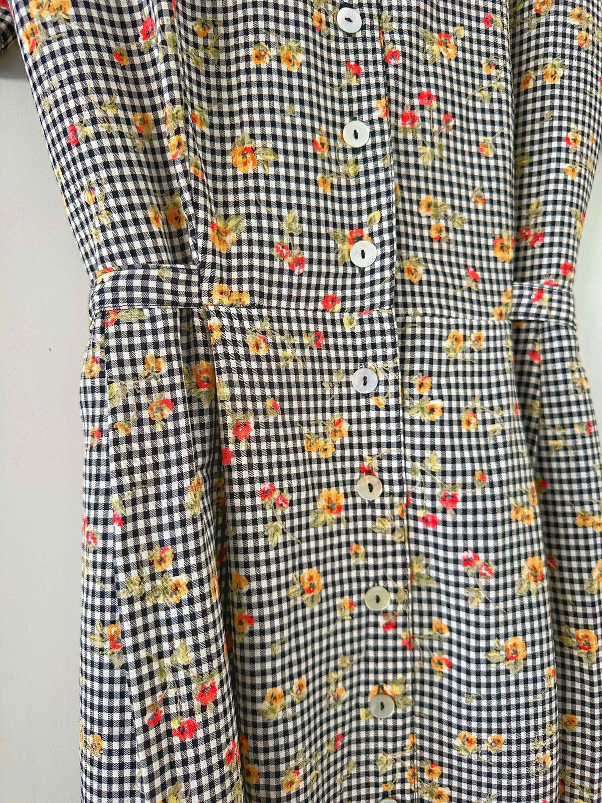Prix unitaire parRobe longue vichy et fleurs, en viscose melangée petits carreaux vichy noirs et blancs imprimé de petites fleurs rouges, jaunes, oranges et vertes, boutons en nacres, taille à nouer dos, années 90s, taille 36 et 38 portée ici sur un mannequin T36, aisselles 44 cm.