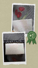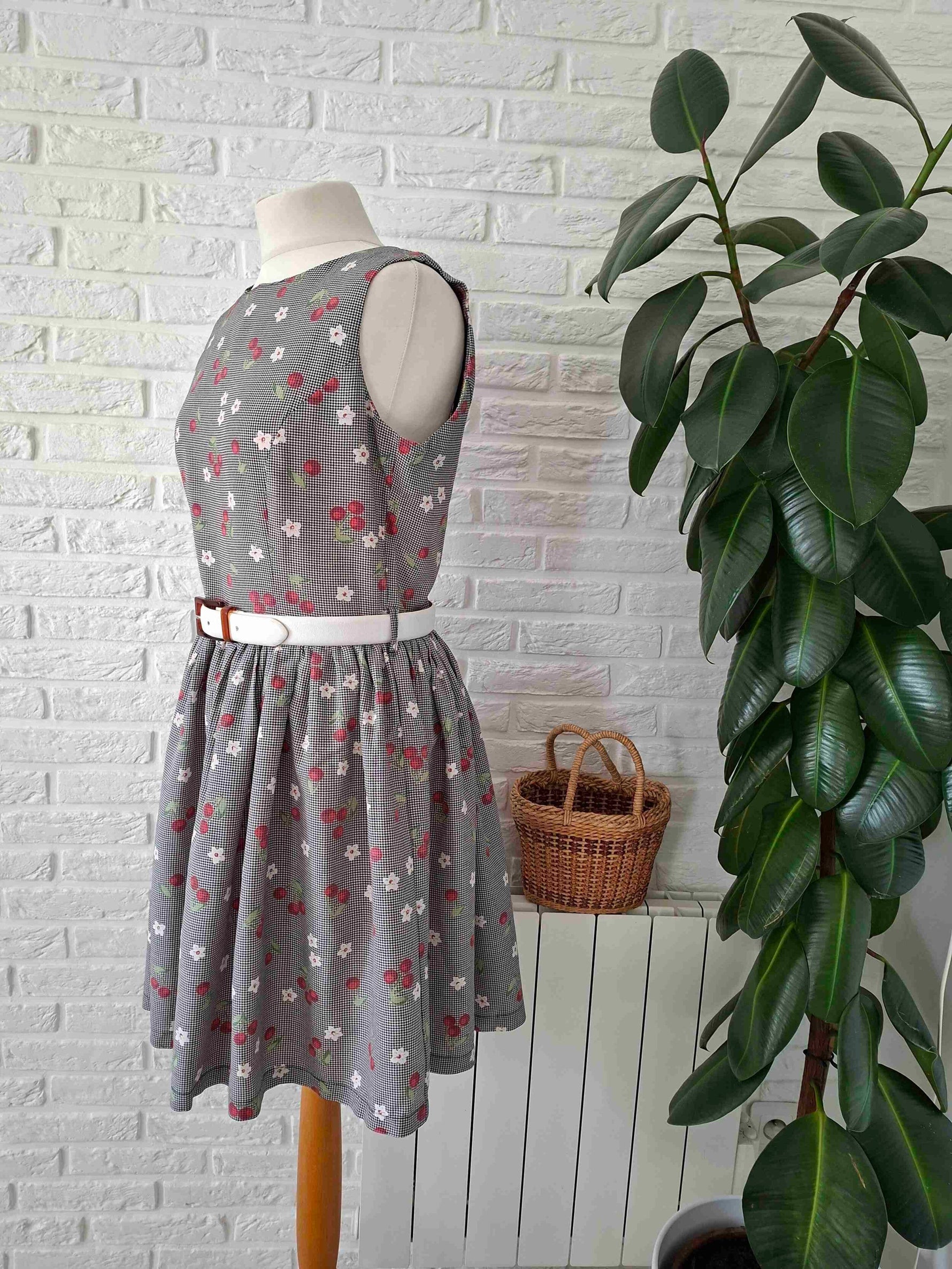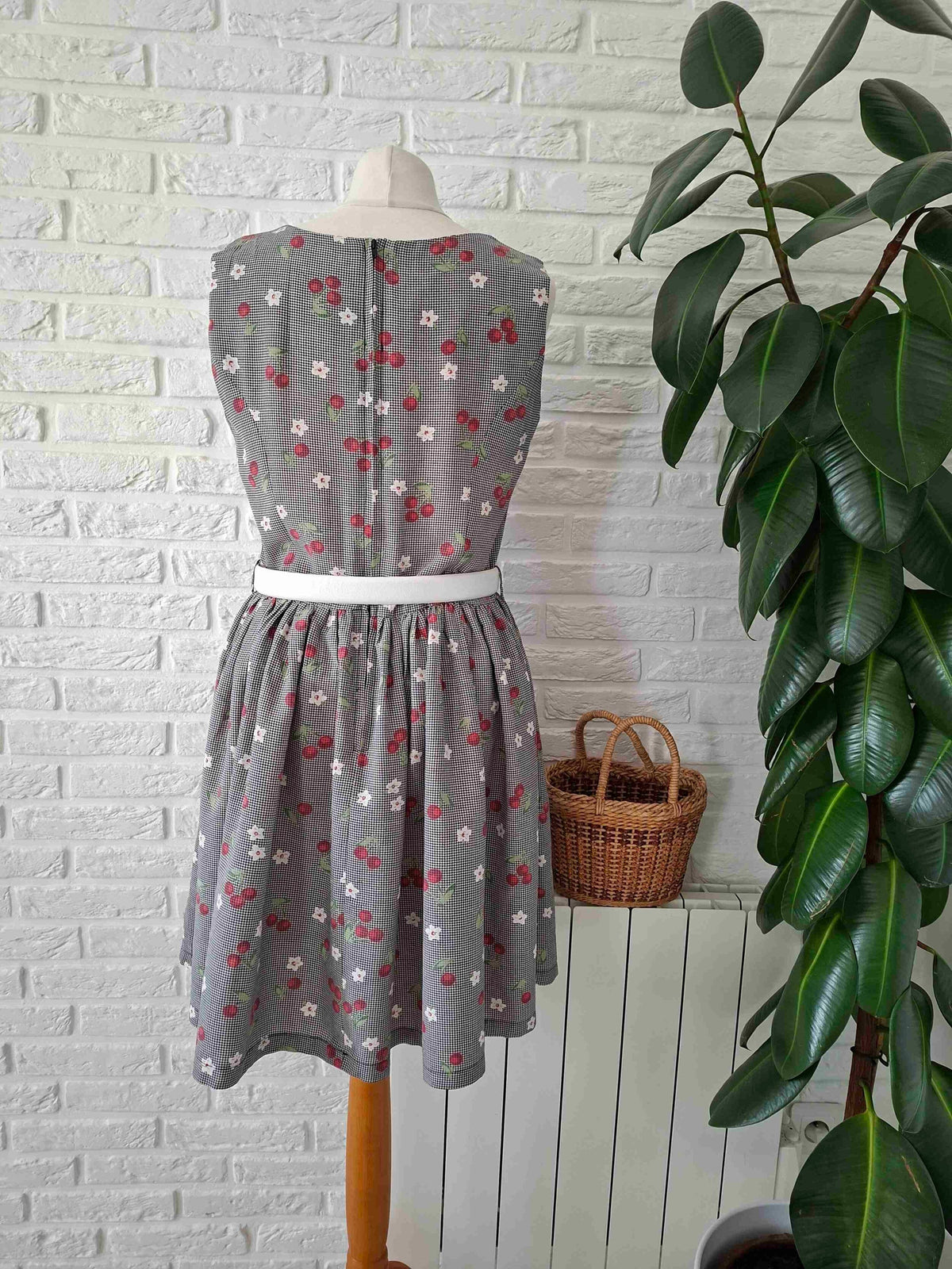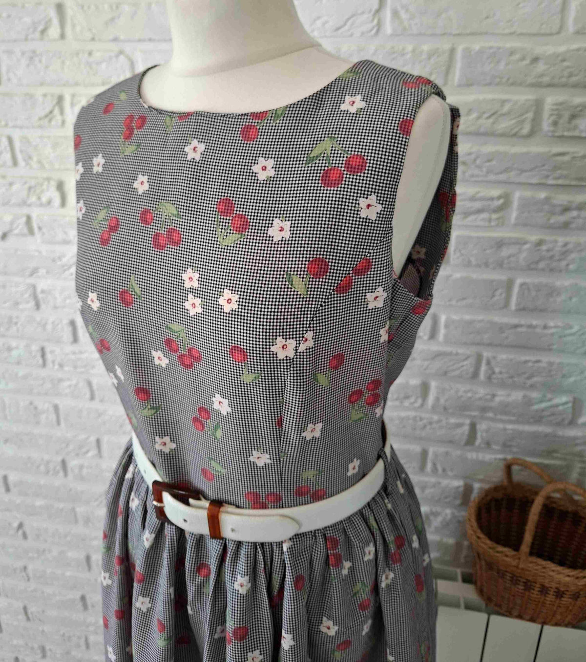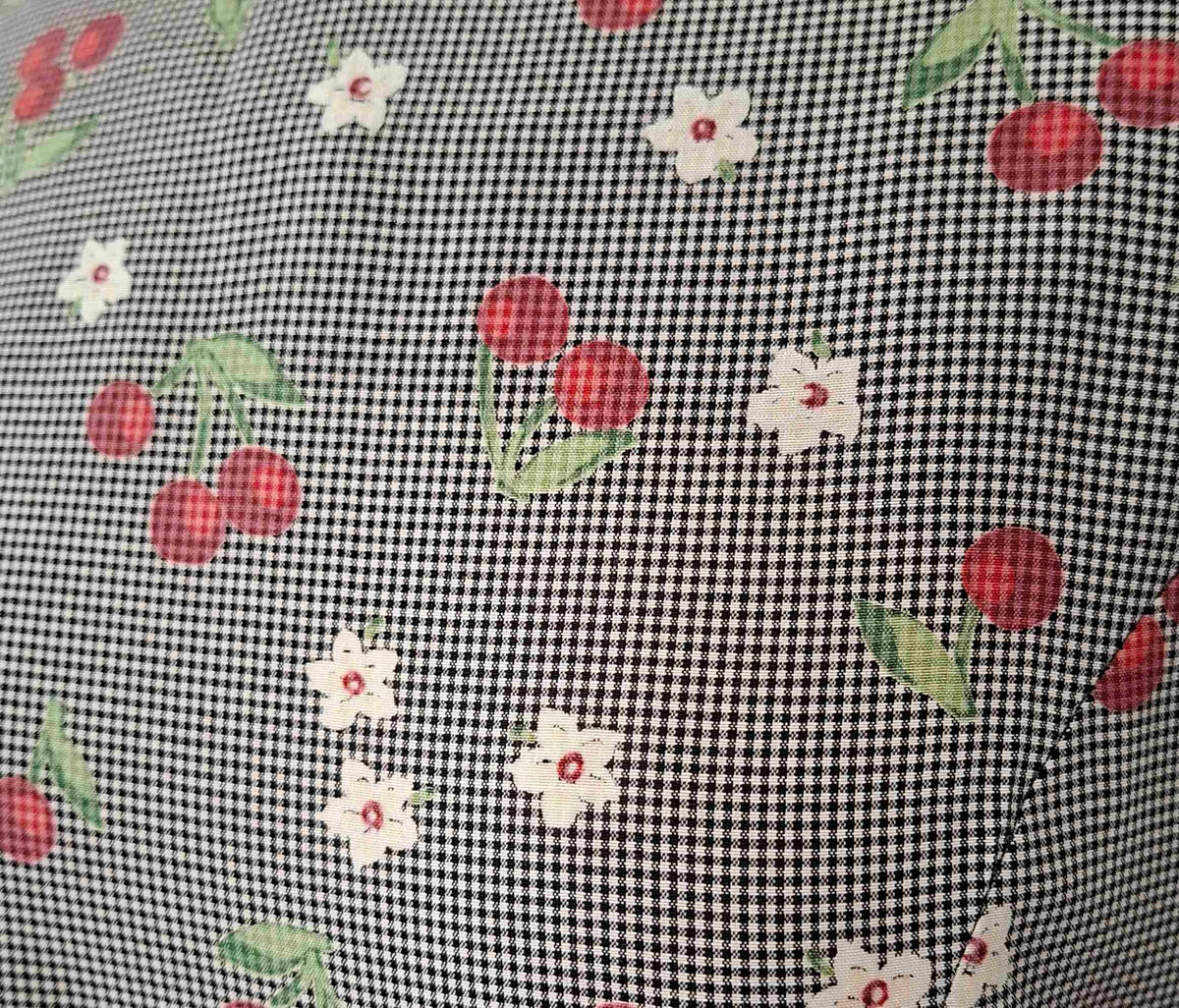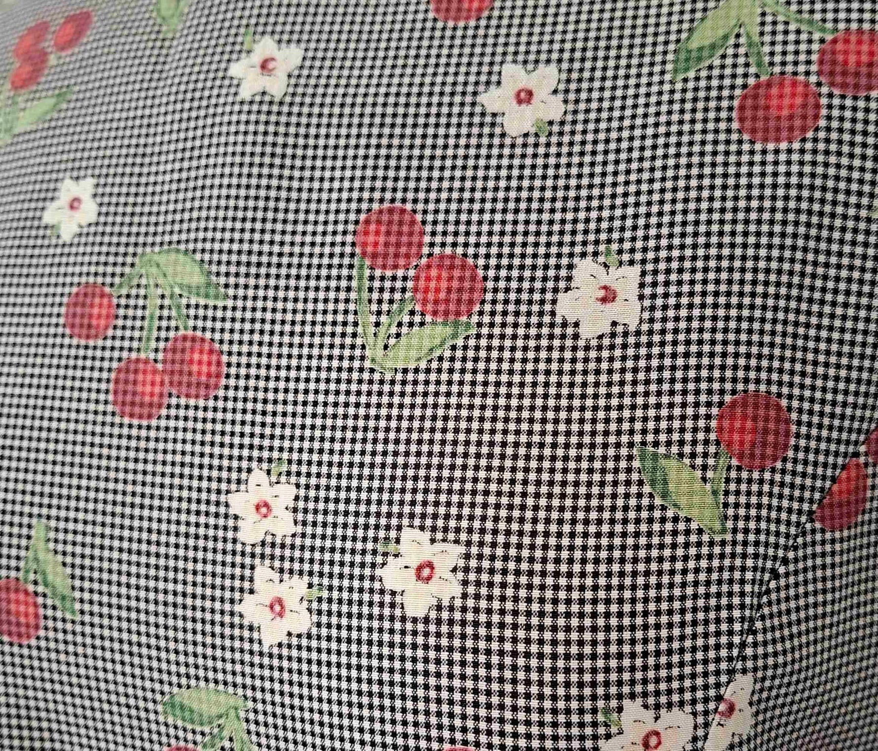 Imprimée de petites fleurs et de cerises sur fond vichy noir et blanc
