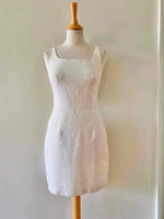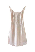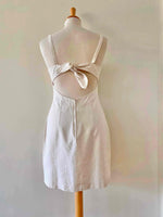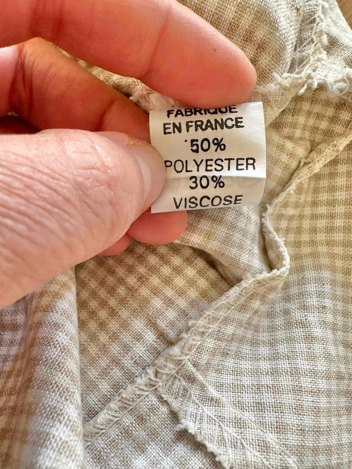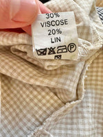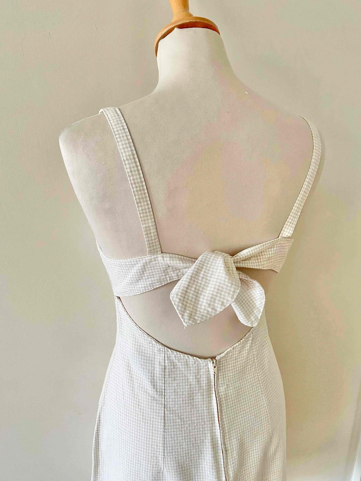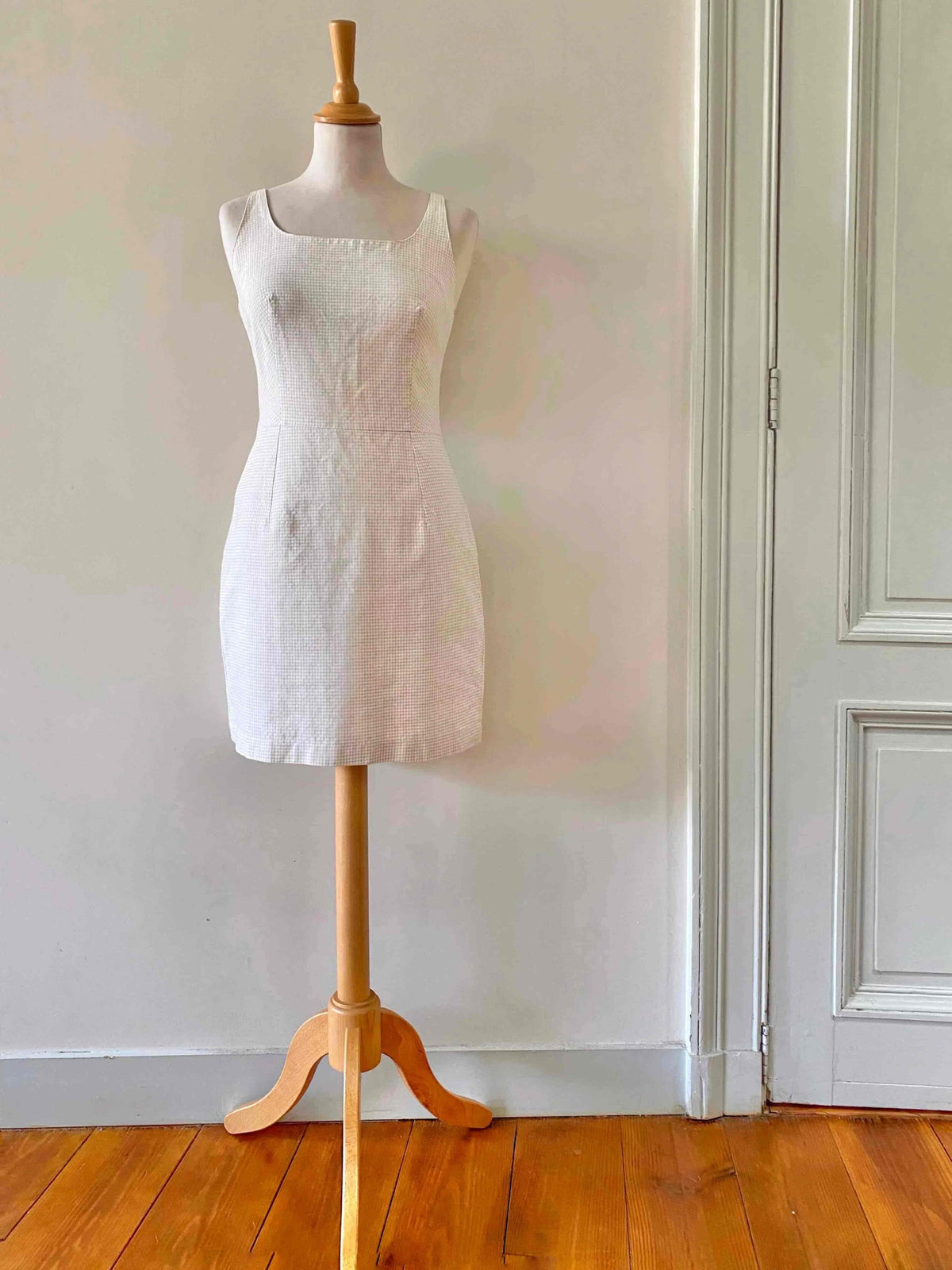 Prix unitaire parRobe vichy dos nu, en lin viscose mélangé à minis carreaux vichy beige et blancs, dos à nouer par un joli noeud, fabriquée en France, taille 36 actuelle portée ici sur un mannequin T36, aisselles 43cm