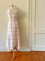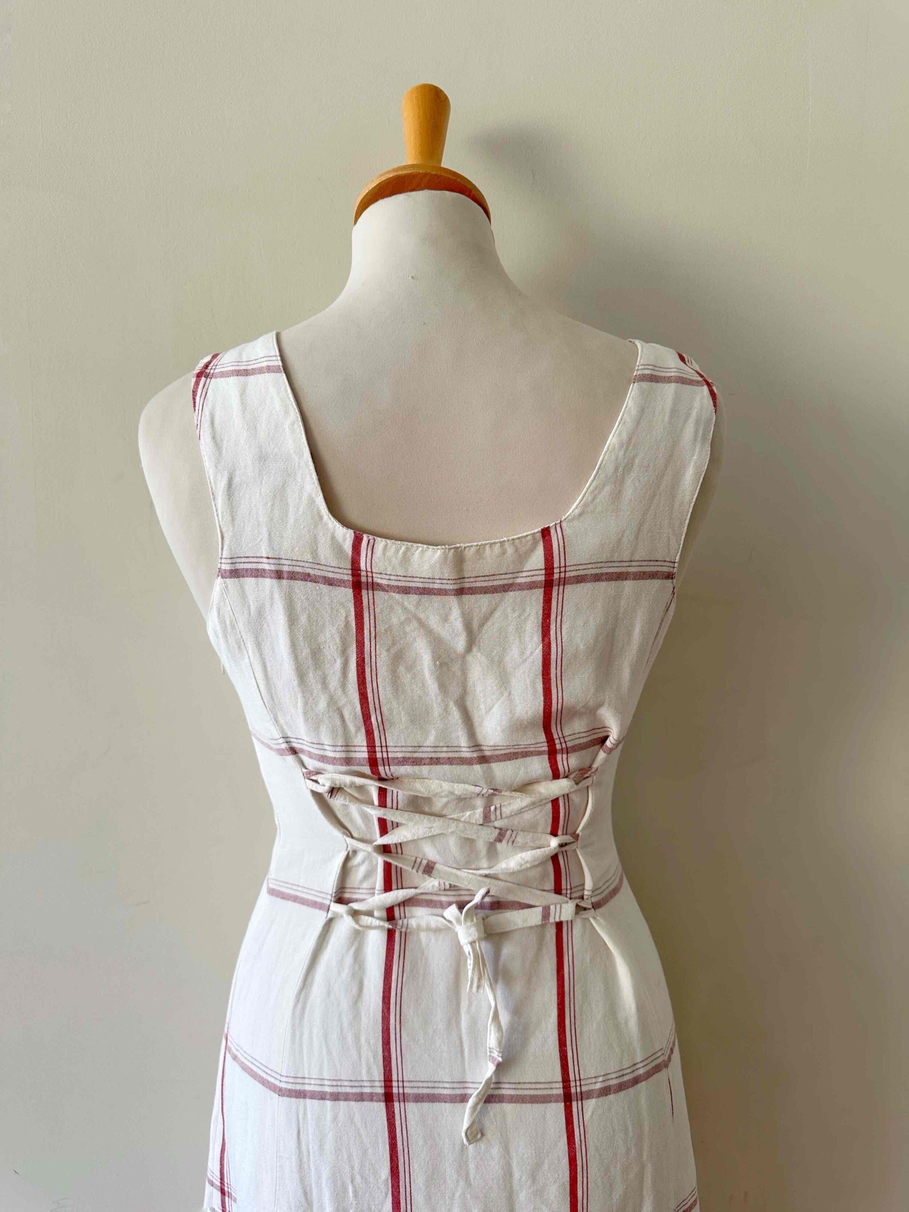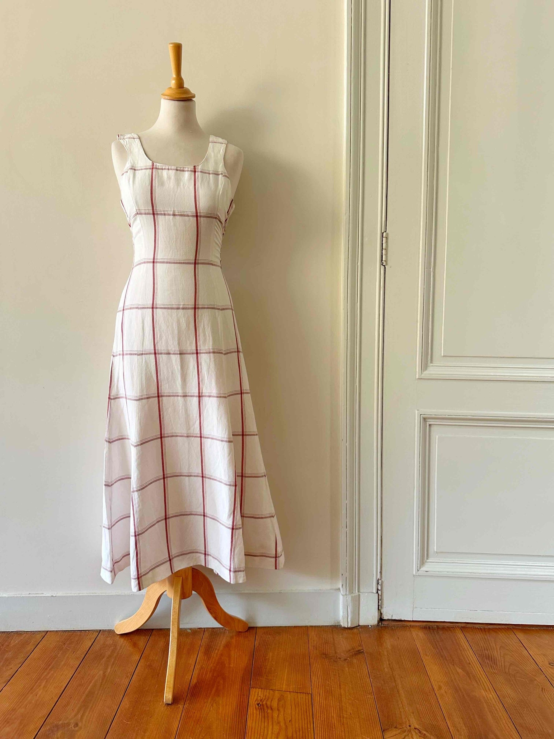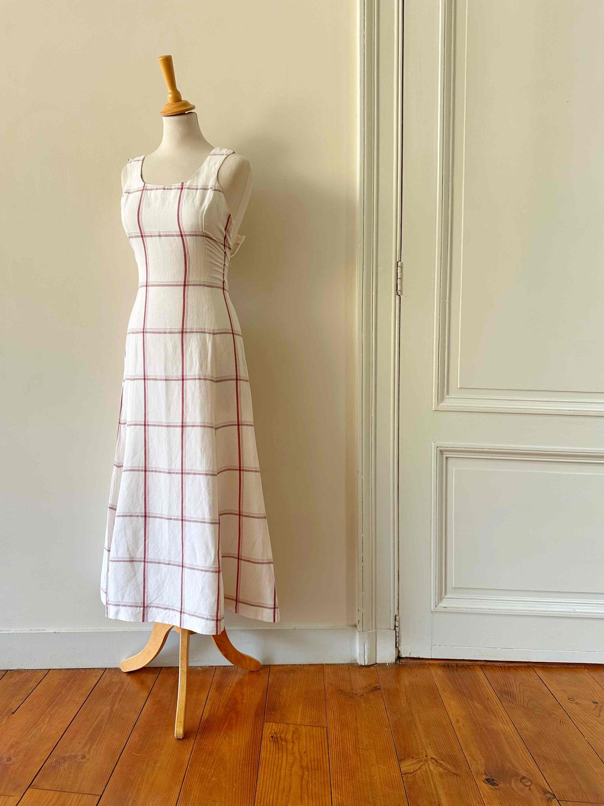 Prix unitaire parRobe vichy en lin, longue, en lin et viscose écru à carreaux tablier rouge foncé, taille dos à lacets, fermeture éclair côté, fabriquée en France, taille 34 portée ici sur un mannequin T36, aisselles 43cm.
