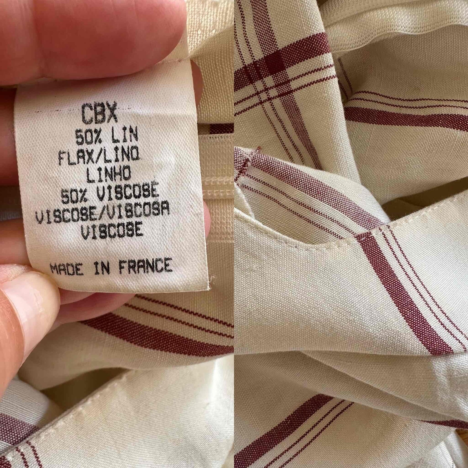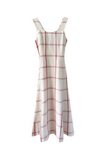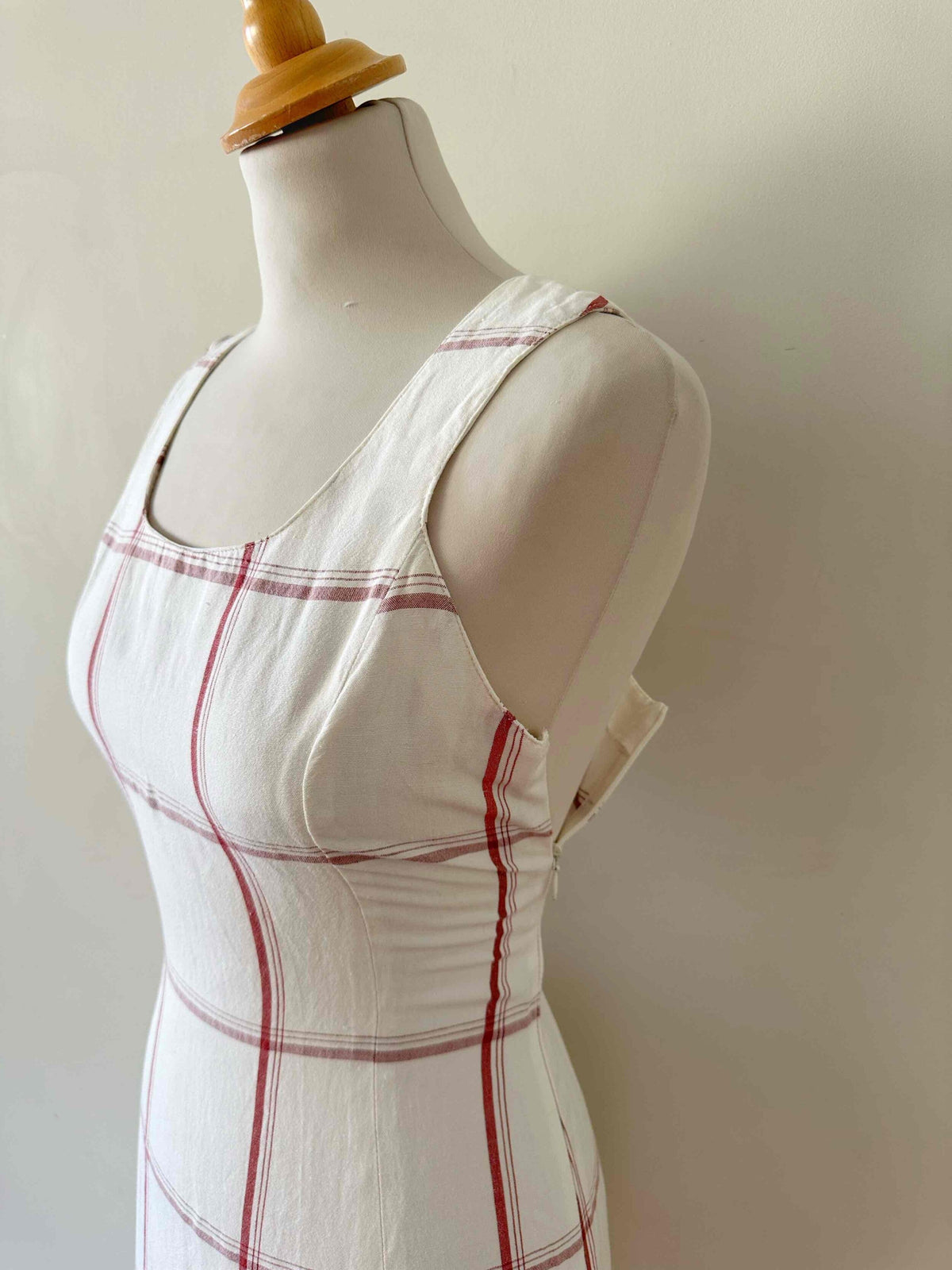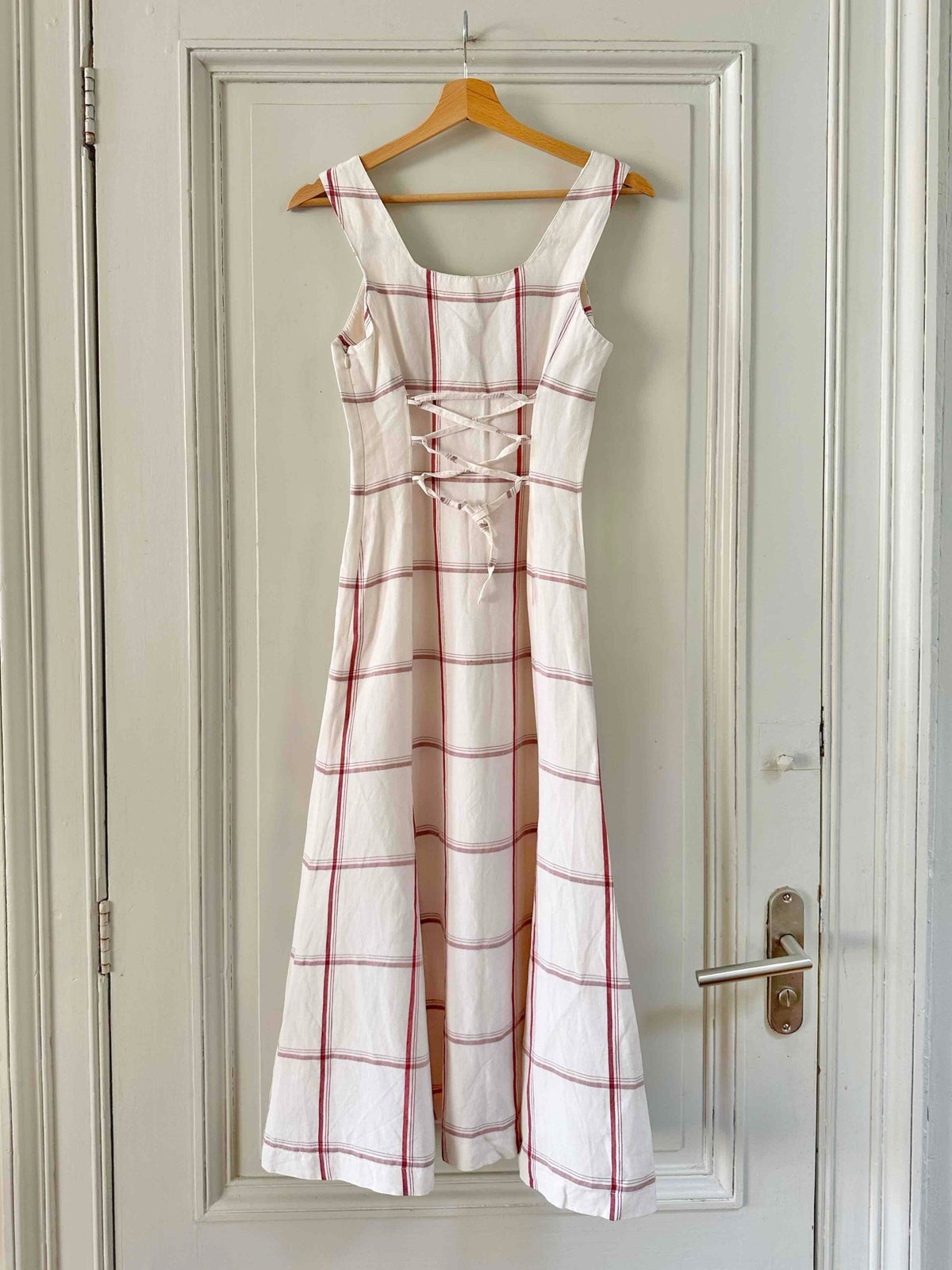 Prix unitaire parRobe vichy en lin, longue, en lin et viscose écru à carreaux tablier rouge foncé, taille dos à lacets, fermeture éclair côté, fabriquée en France, taille 34 portée ici sur un mannequin T36, aisselles 43cm.