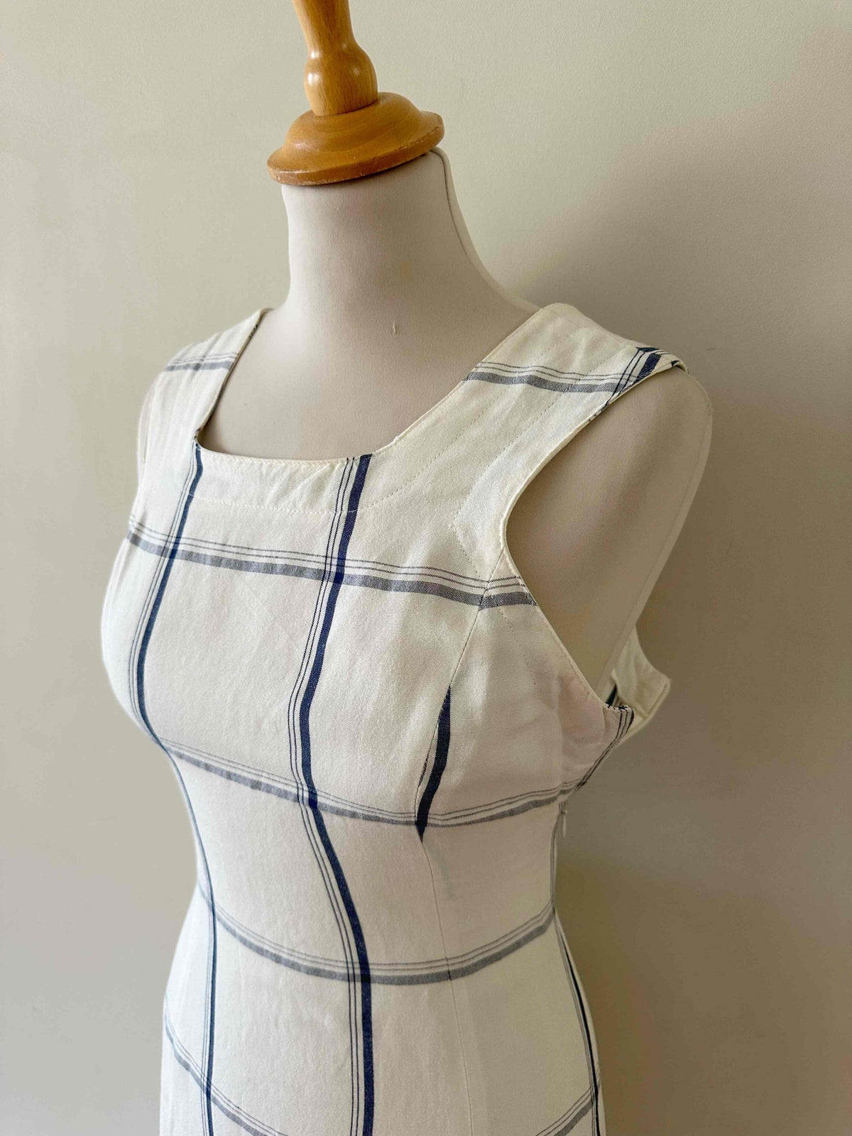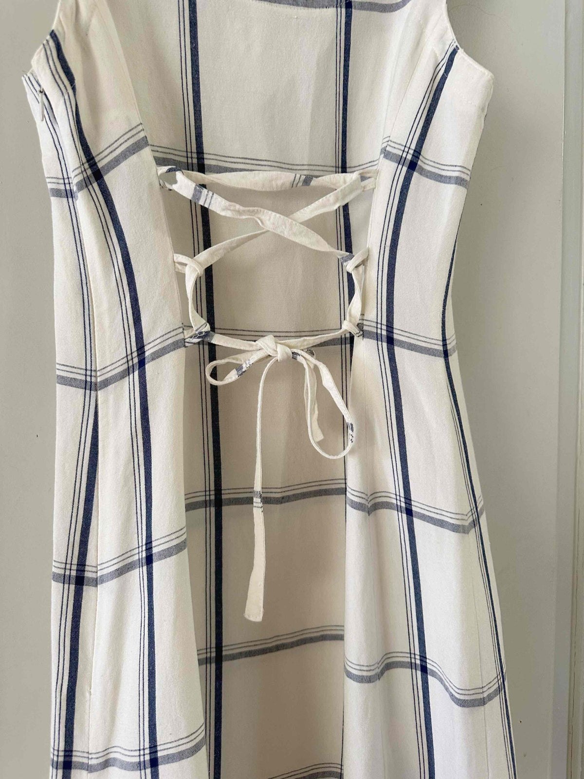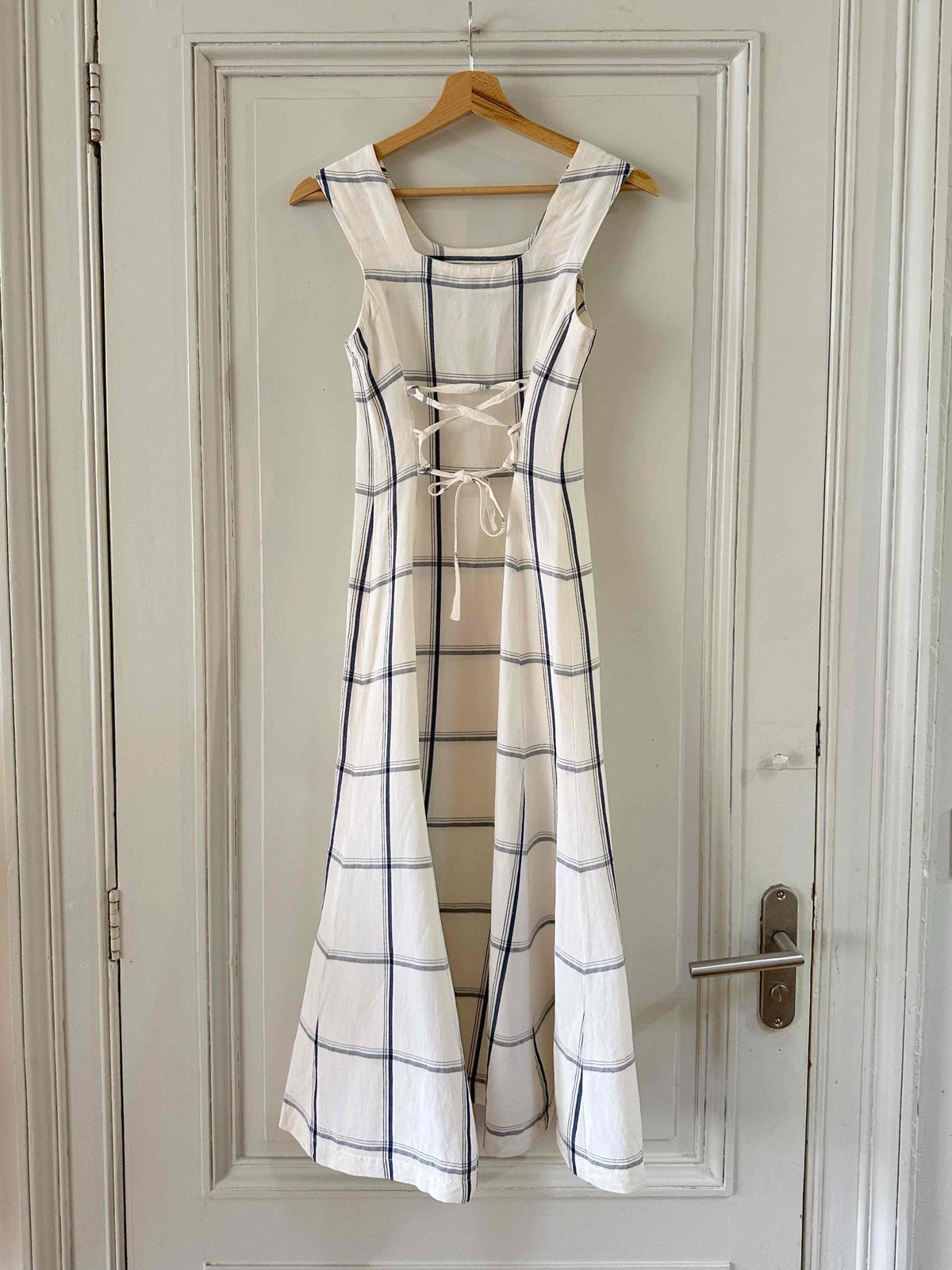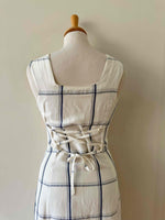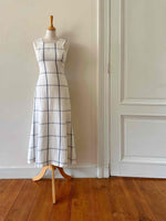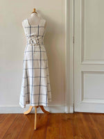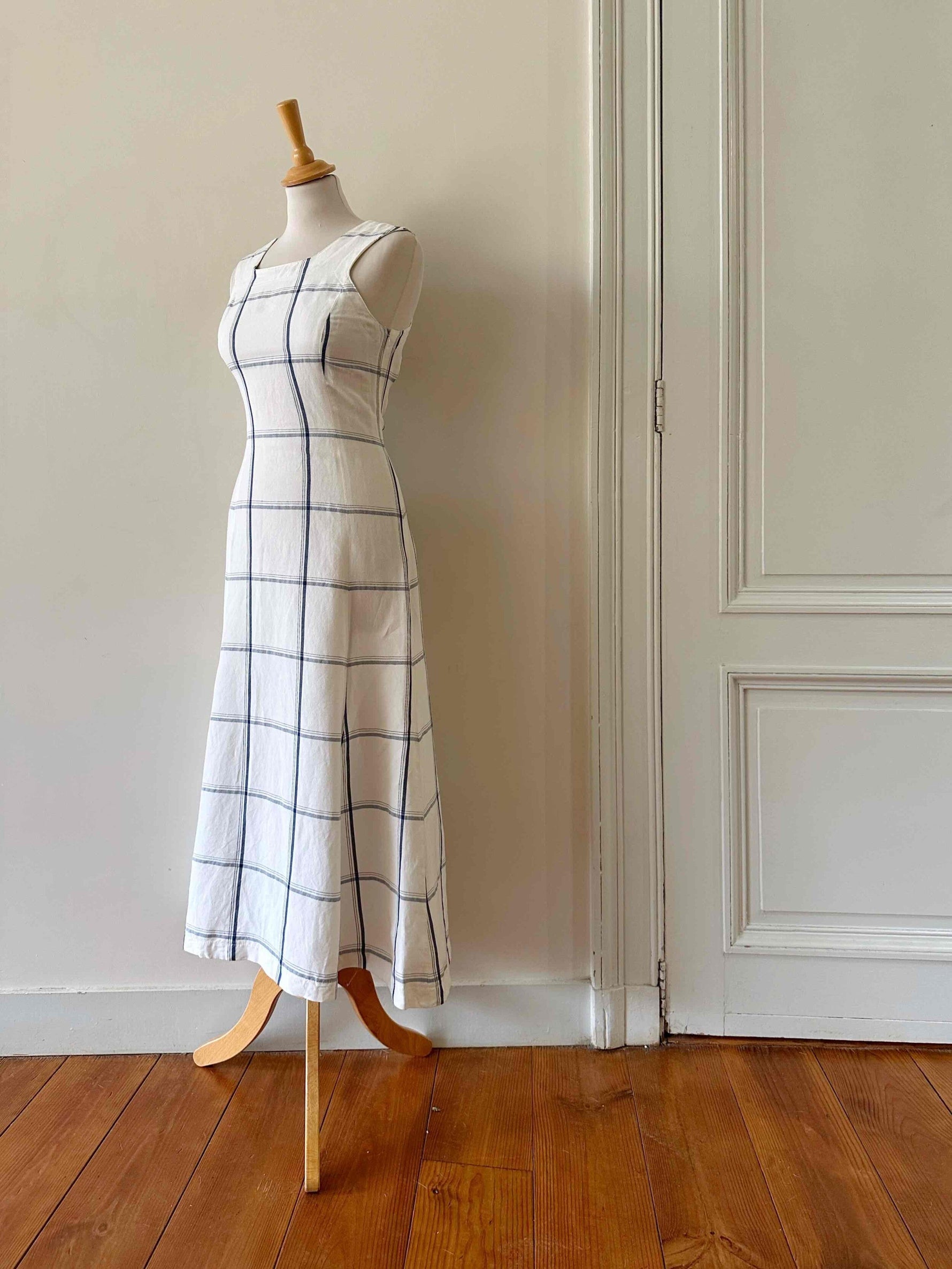 Prix unitaire parRobe vichy en lin, longue, en lin et viscose écru à carreaux tablier bleu foncé, taille dos à lacets, fermeture éclair côté, fabriquée en France, taille 34 portée ici sur un mannequin T36, aisselles 43cm.
