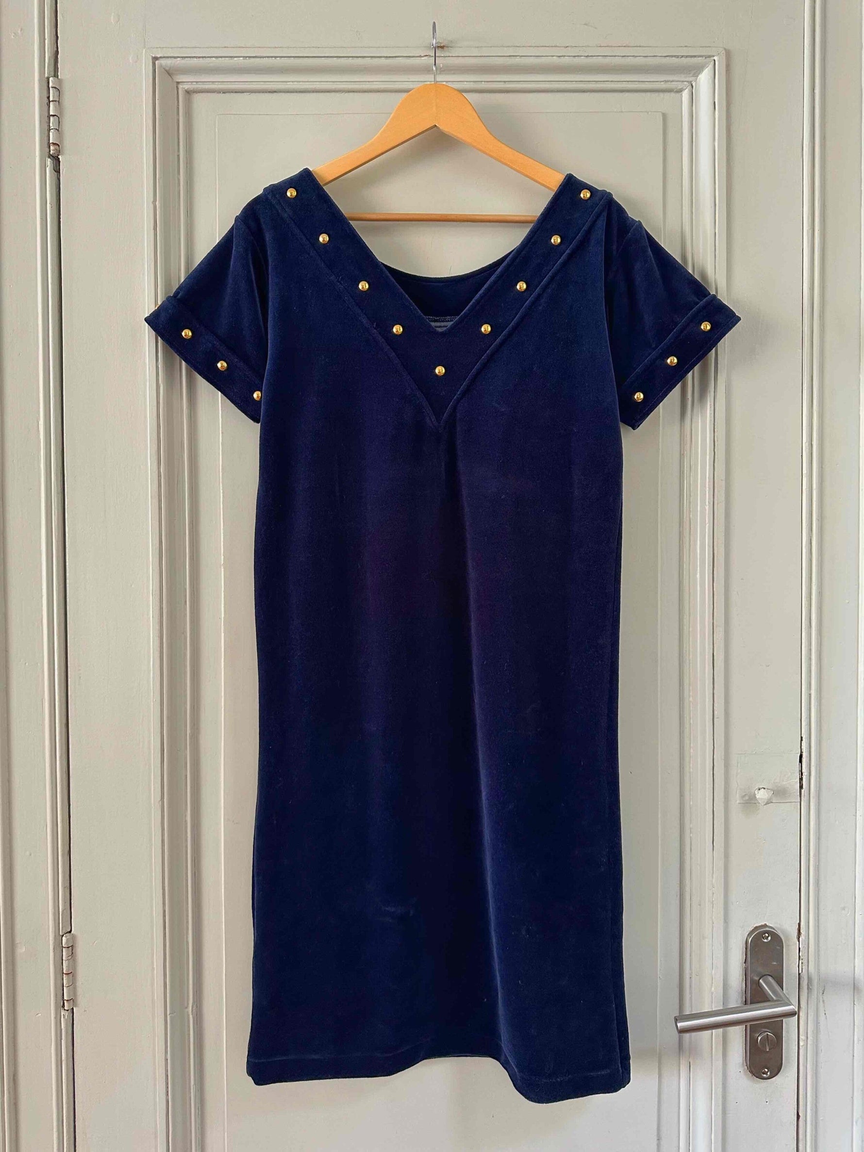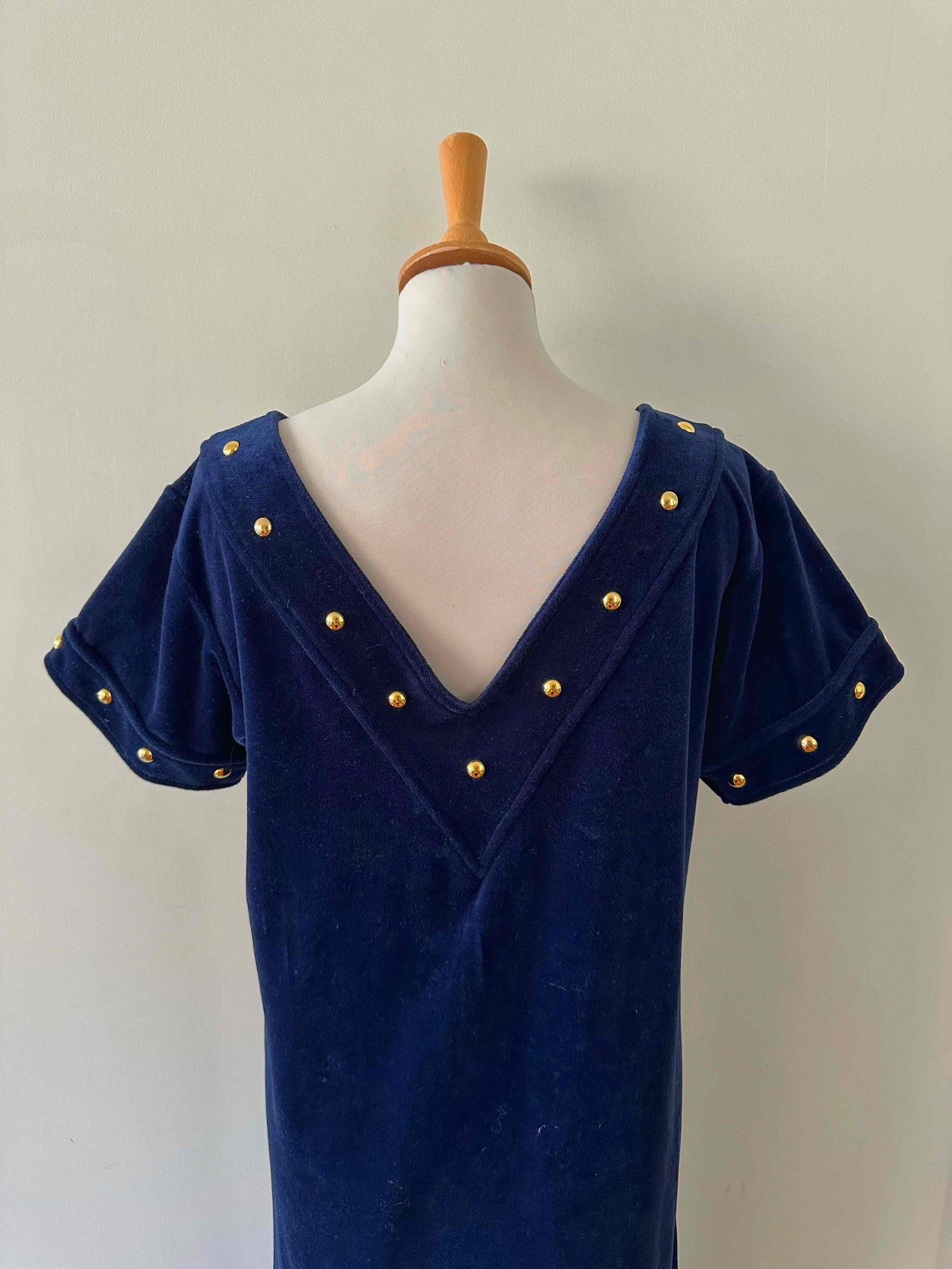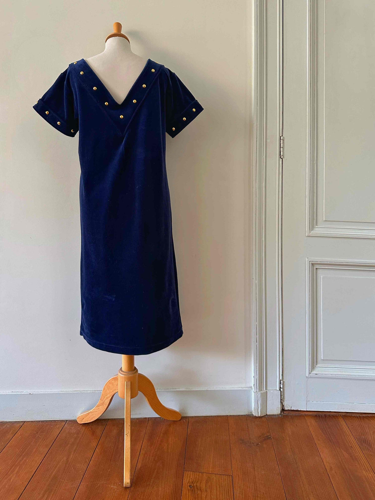 Prix unitaire parRobe Yves Saint Laurent, en velours de coton bleu nuit, encolure et manches clous bijoux dorés, encolure dos denudé en V, fabriquée en France, convient aux tailles 36 et 38 portée ici sur un mannequin T36.