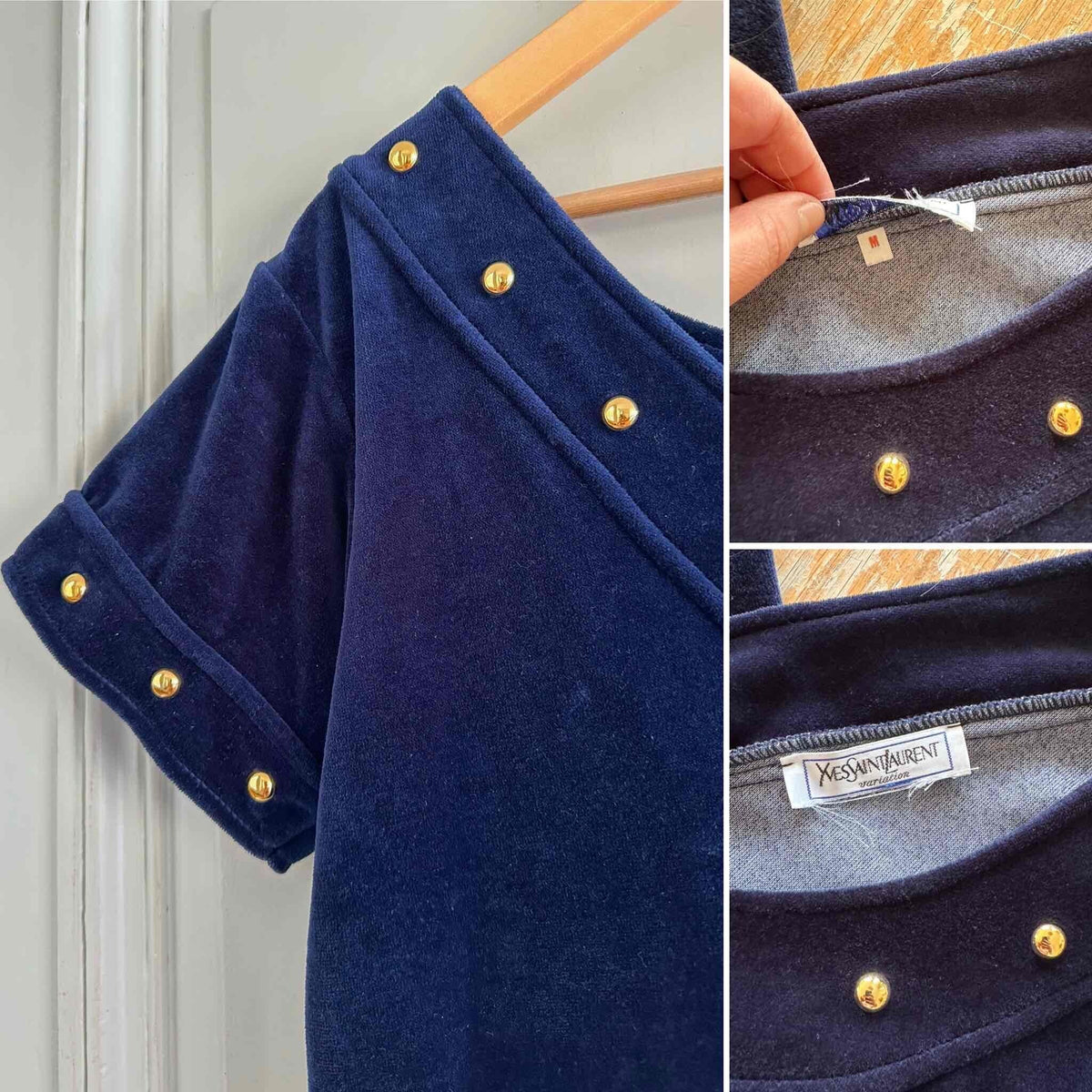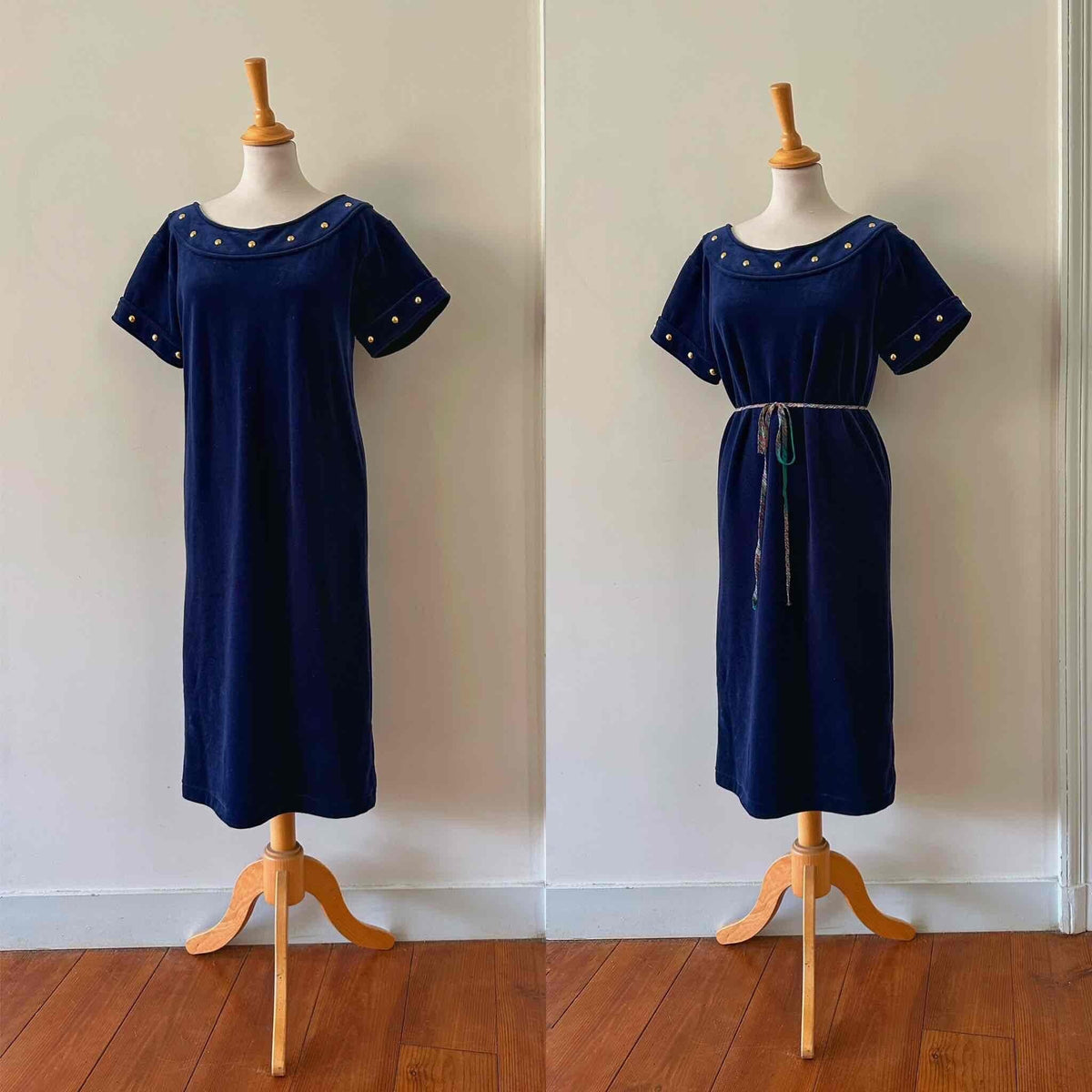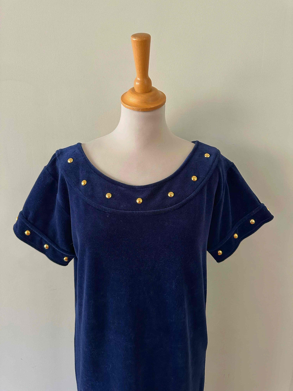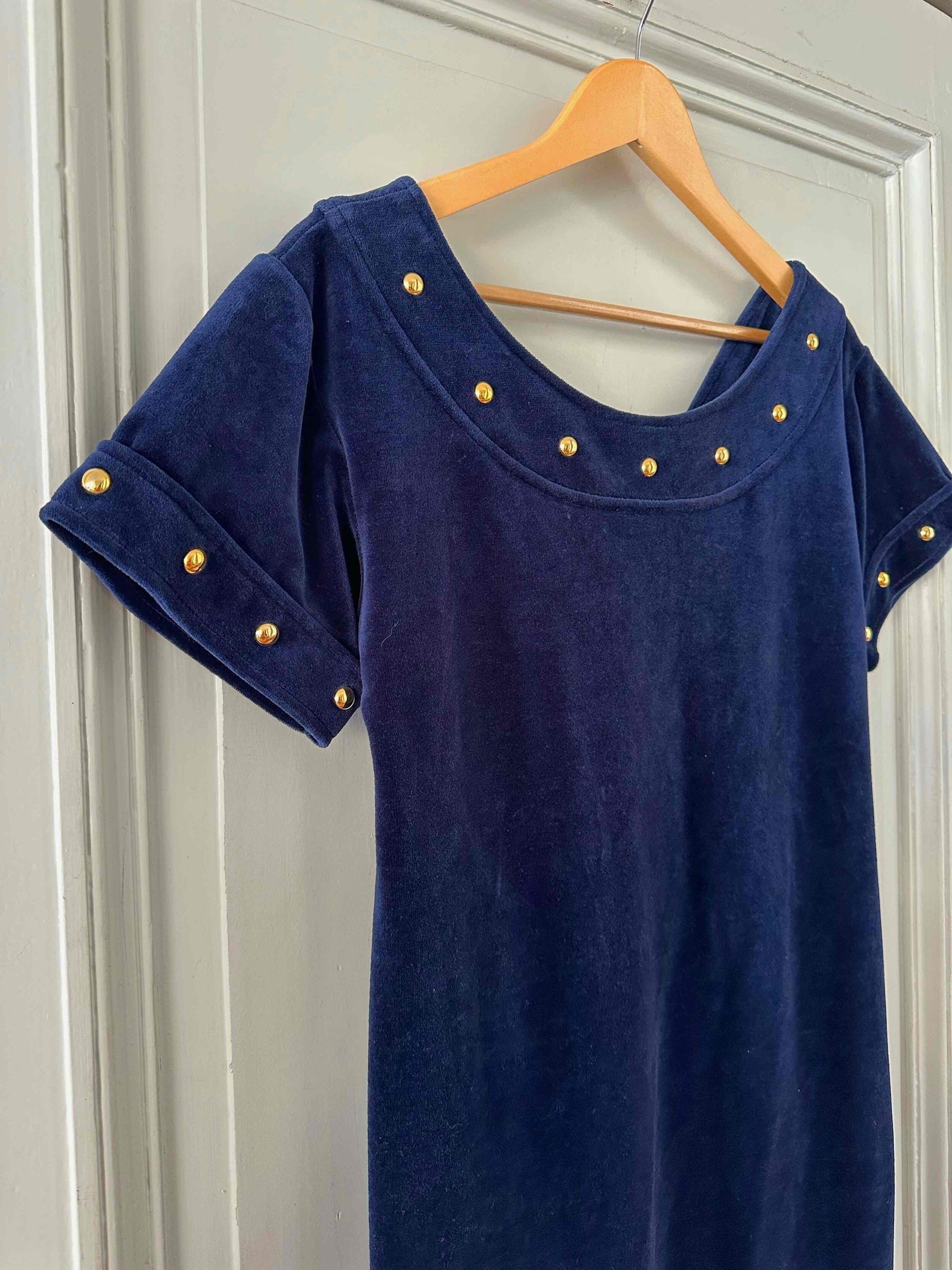 Prix unitaire parRobe Yves Saint Laurent, en velours de coton bleu nuit, encolure et manches clous bijoux dorés, encolure dos denudé en V, fabriquée en France, convient aux tailles 36 et 38 portée ici sur un mannequin T36.