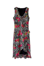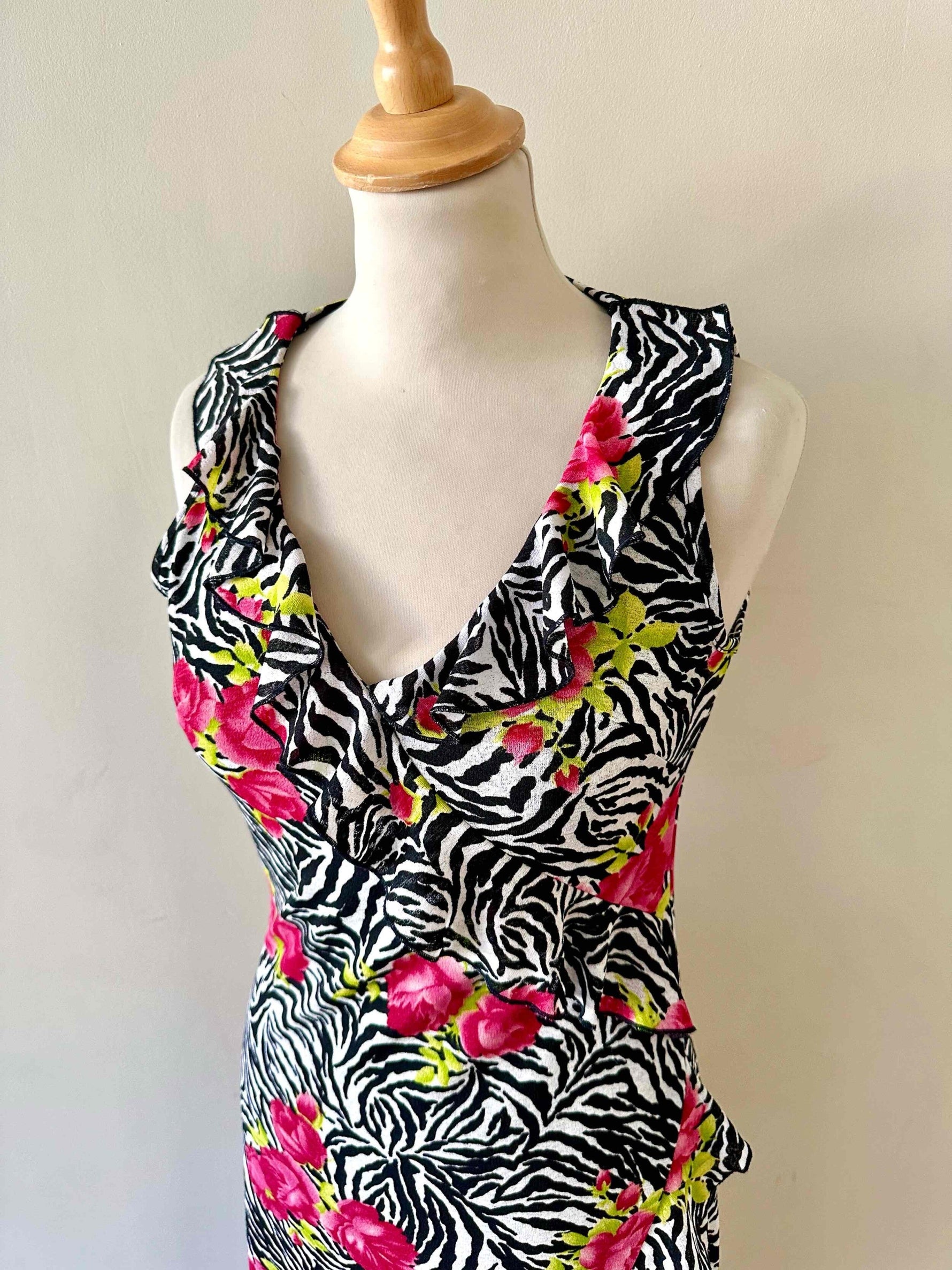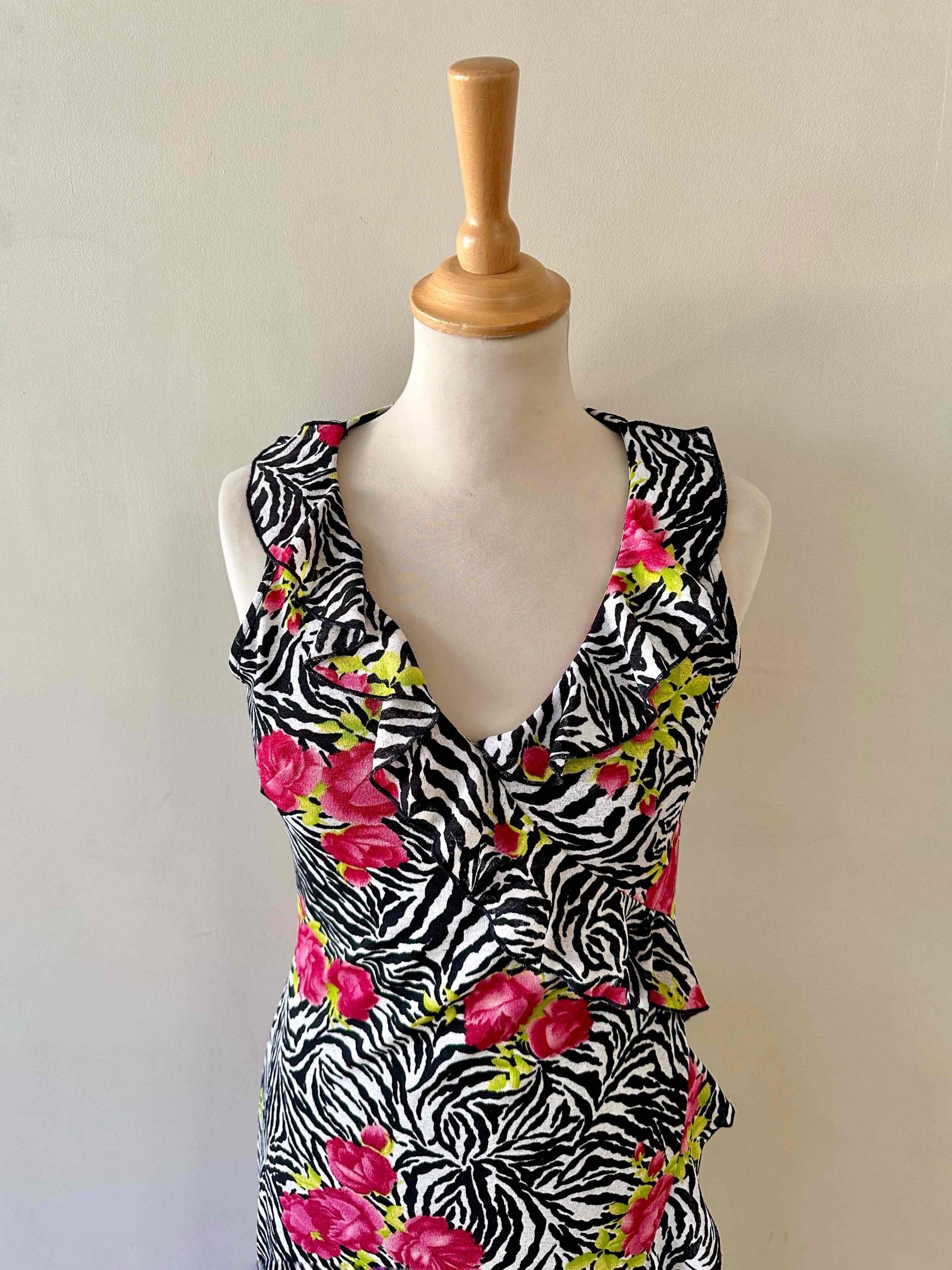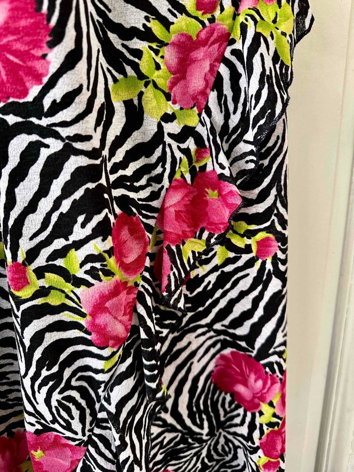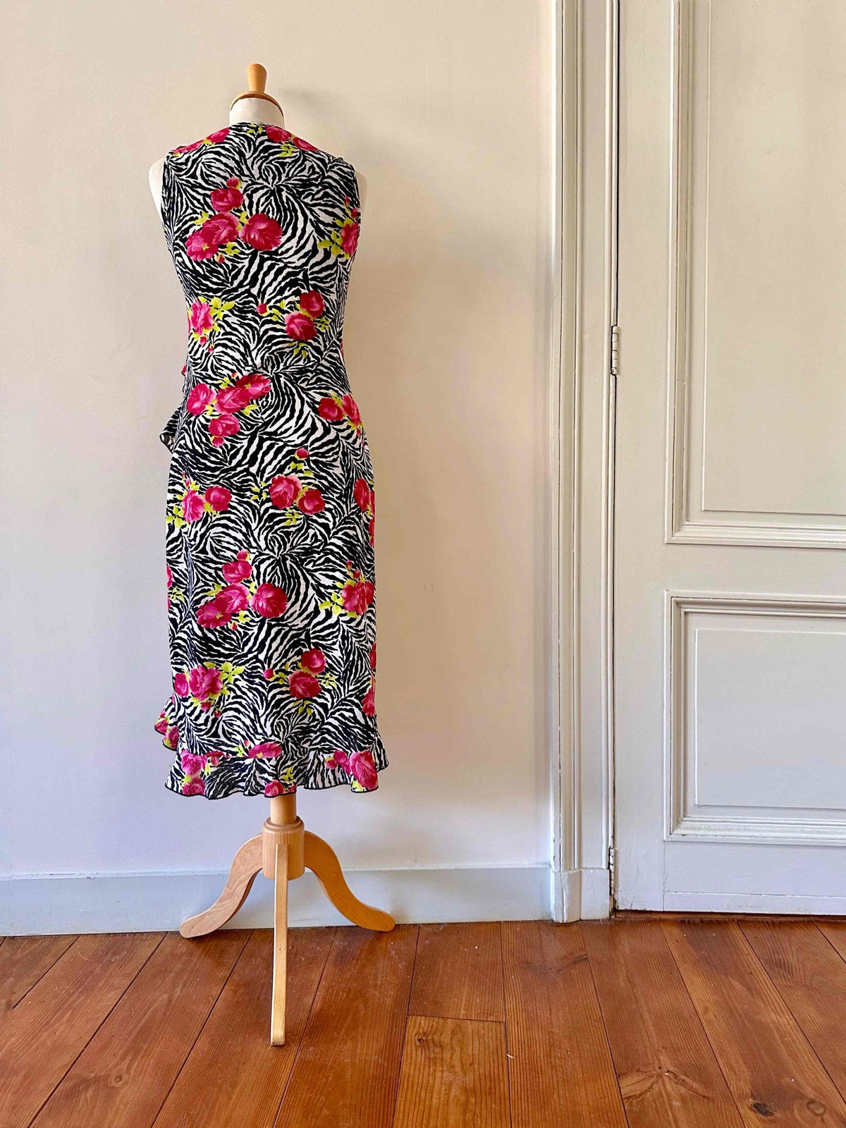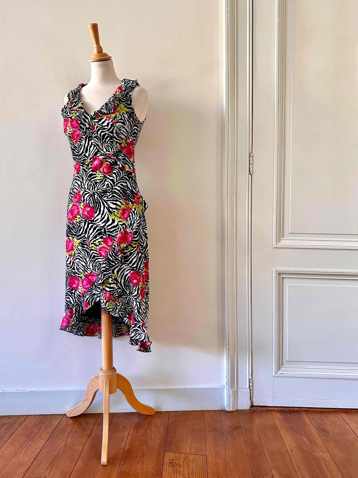Prix unitaire parRobe zebre et fleurs, en mesh polyamide motifs zébrés noirs, blancs, et fleurs roses fuschias et vertes, détails de volants croisés et asymétriques effet portefeuille, fabriquée en France, taille 36 portée ici sur un mannequin T36, aisselles 43cm.