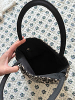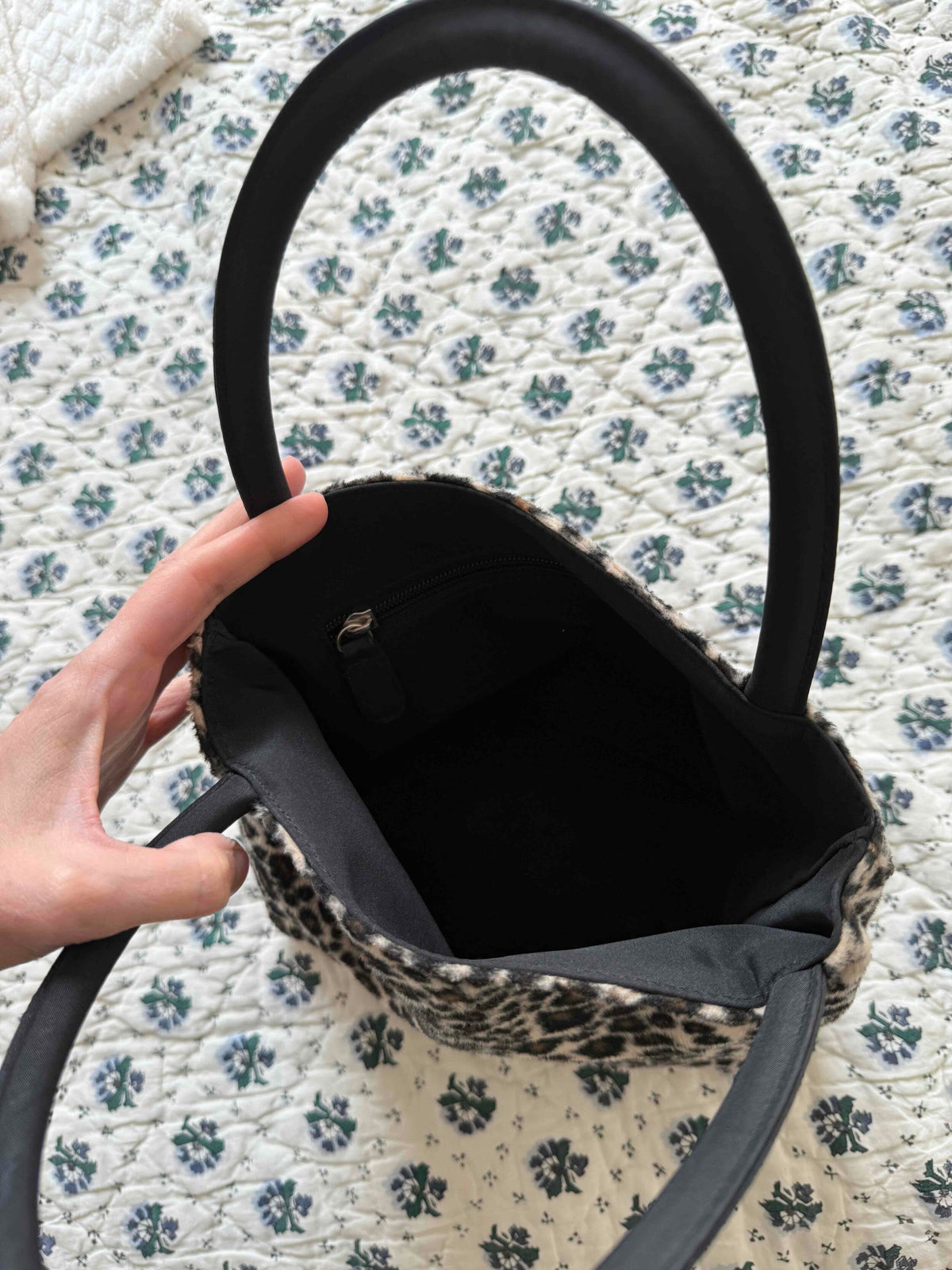 Prix unitaire parMini sac en fourrure léopard, anses noires, intérieur en tissu noir, petite poche fermée d’une fermeture éclair.
