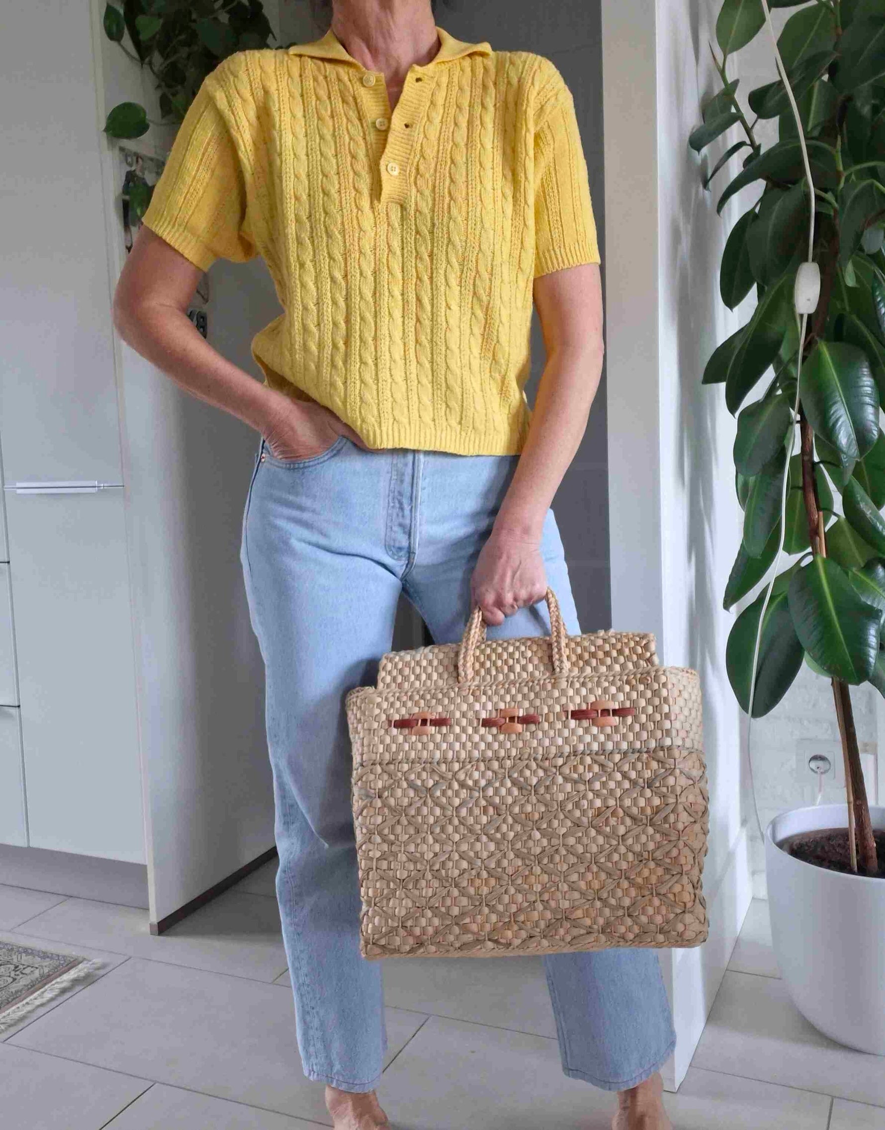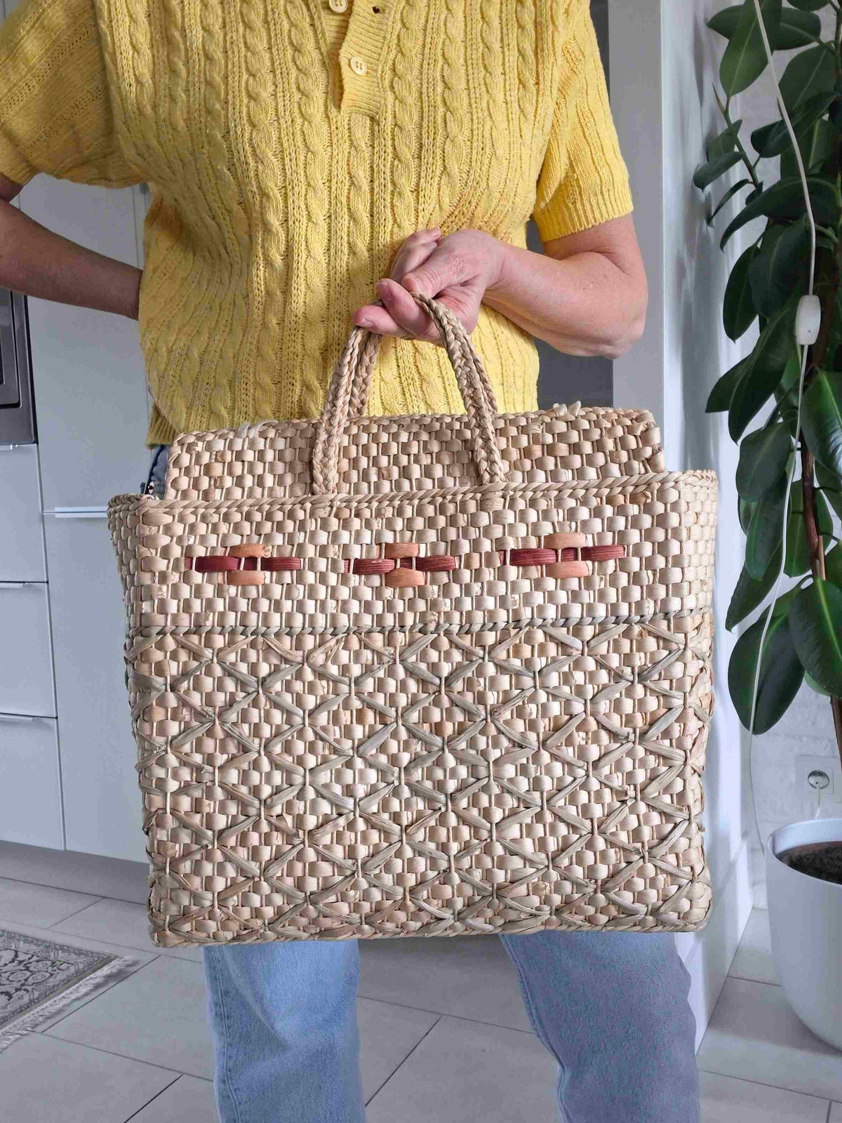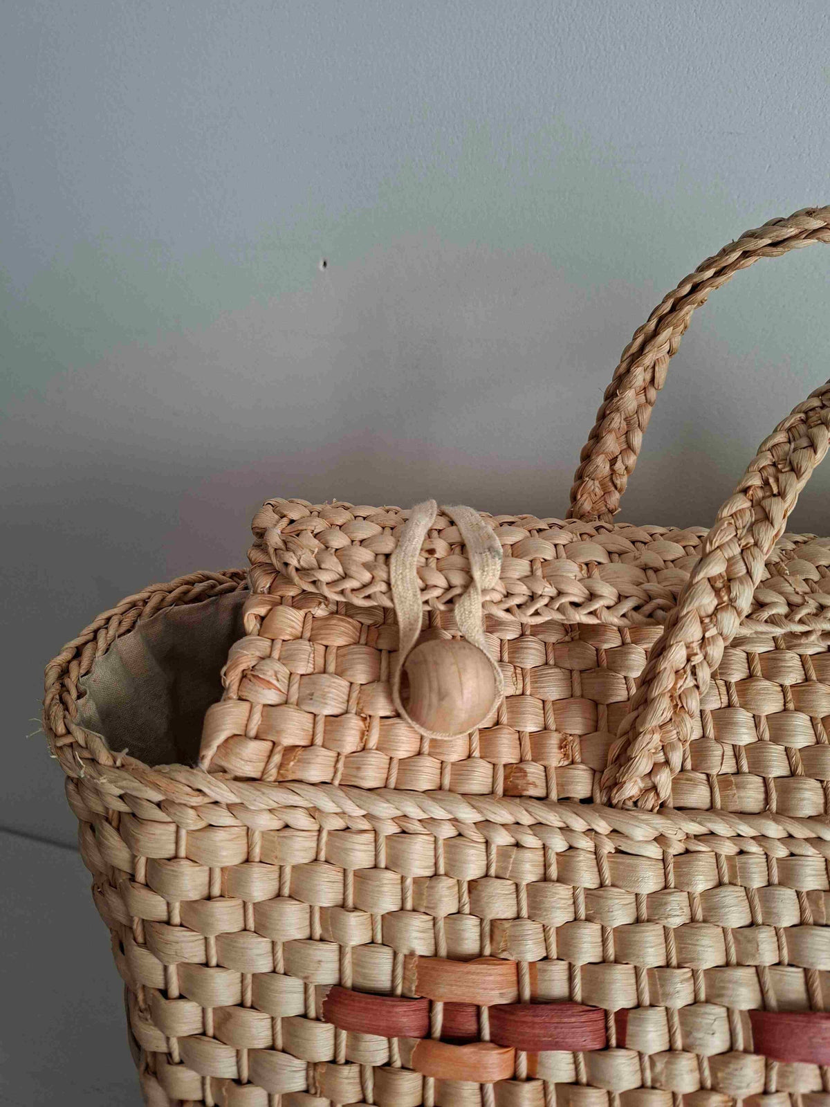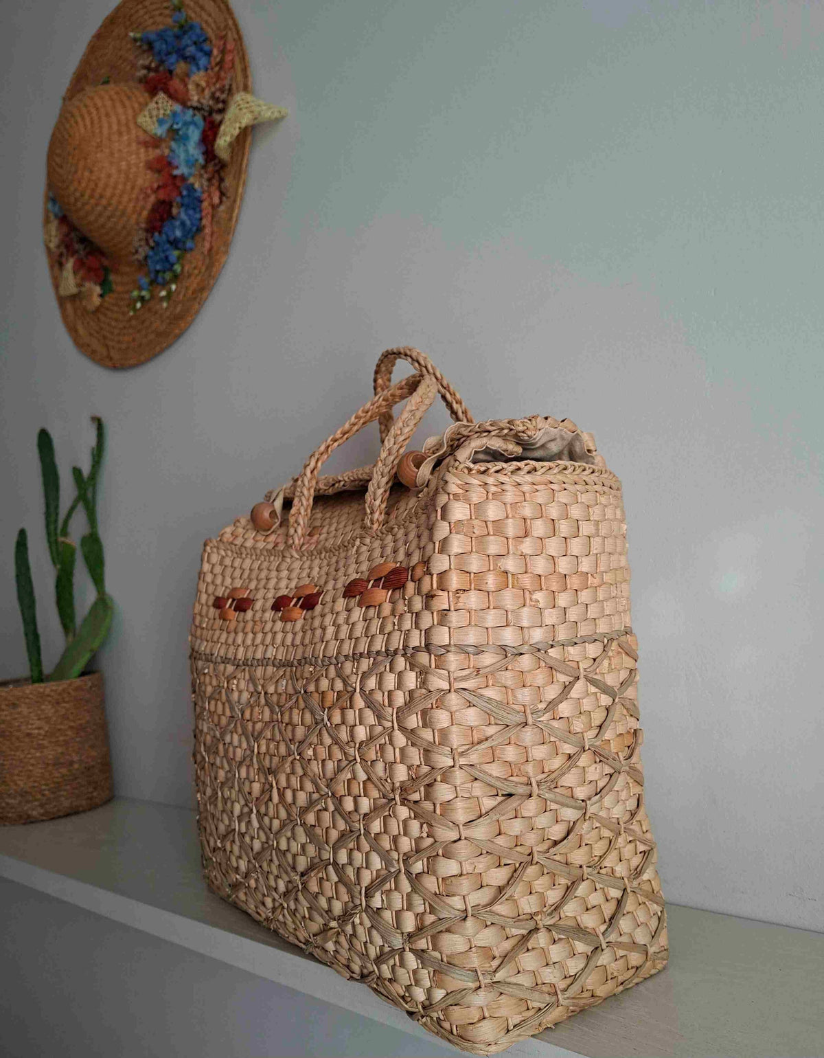 Fermeture par le dessus par 2 grosses perles de bois et brides élastique