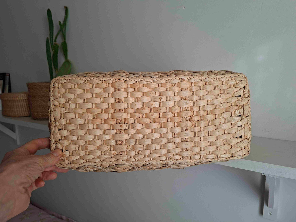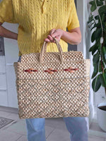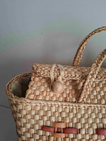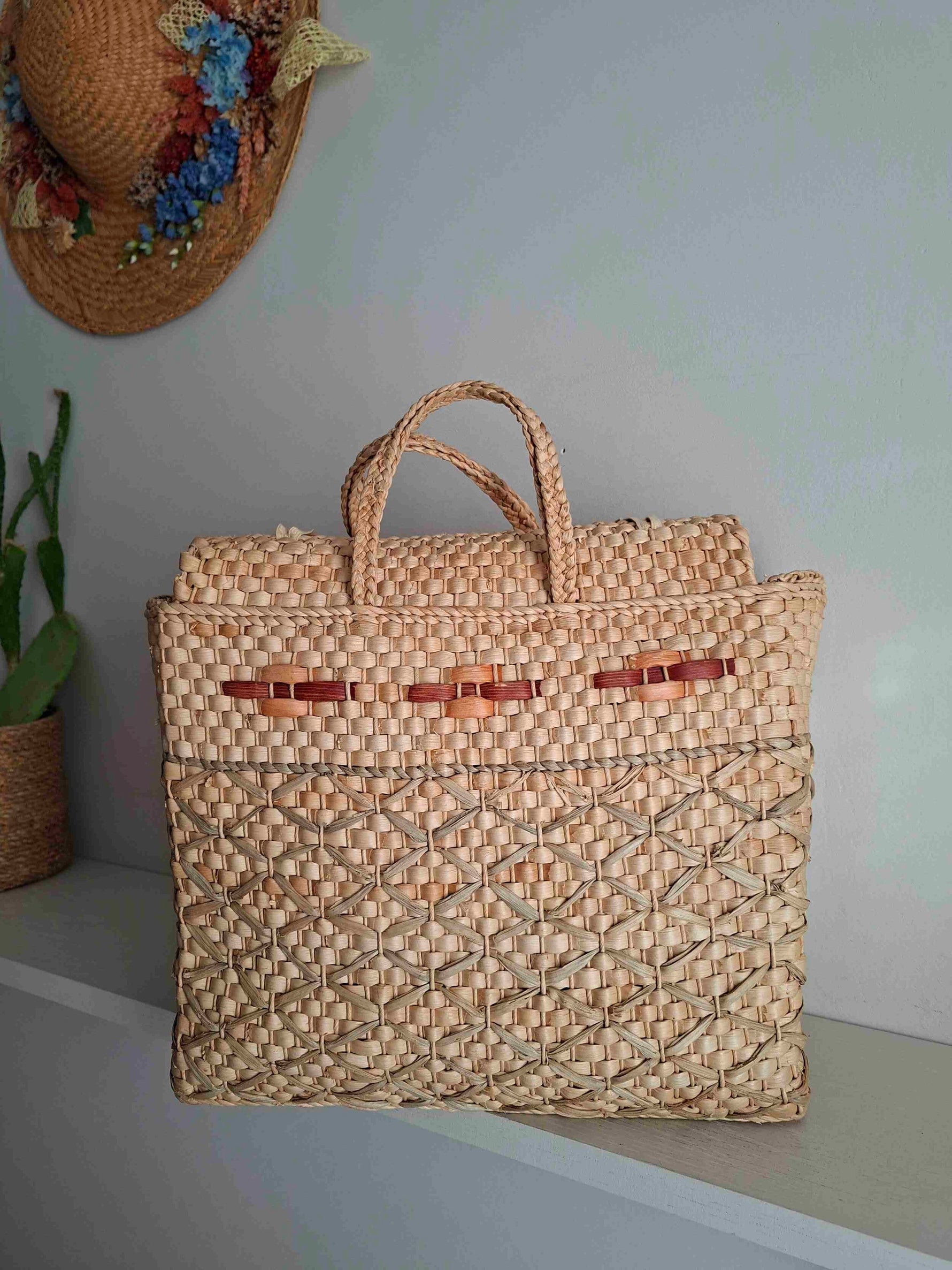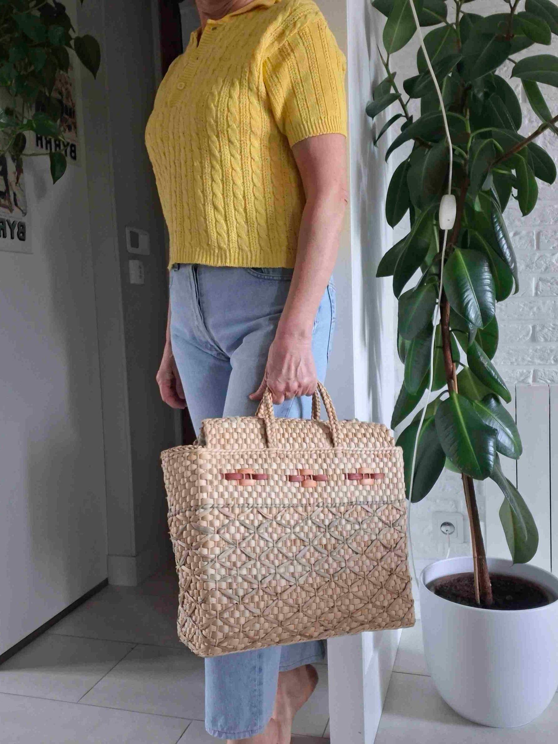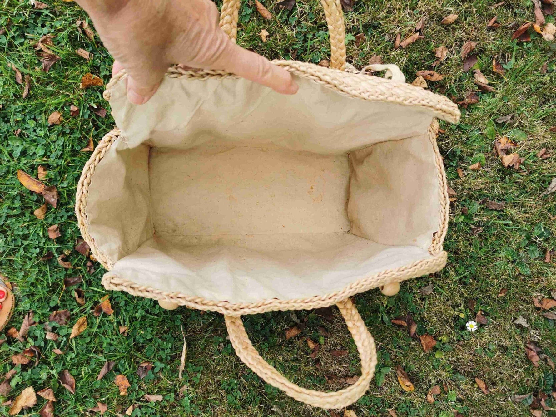 Fermeture par le dessus par 2 grosses perles de bois et brides élastique