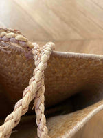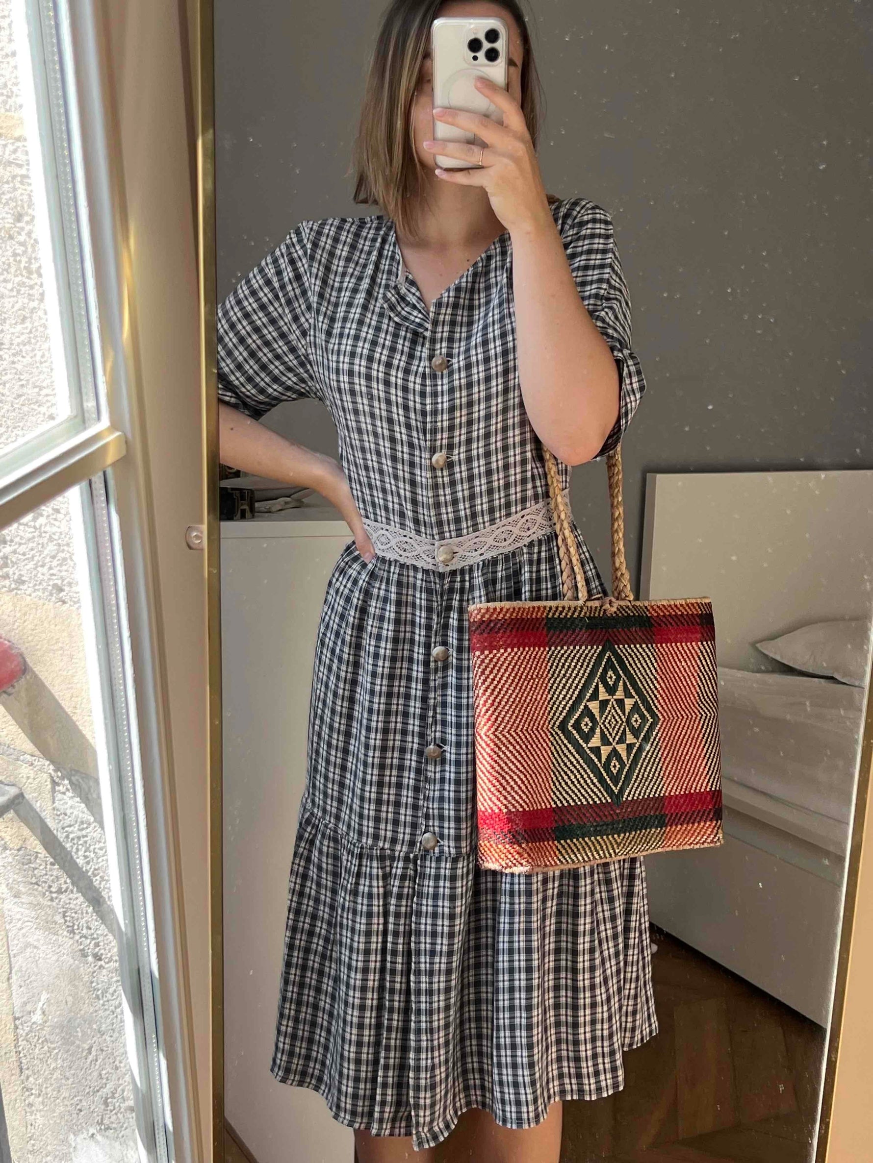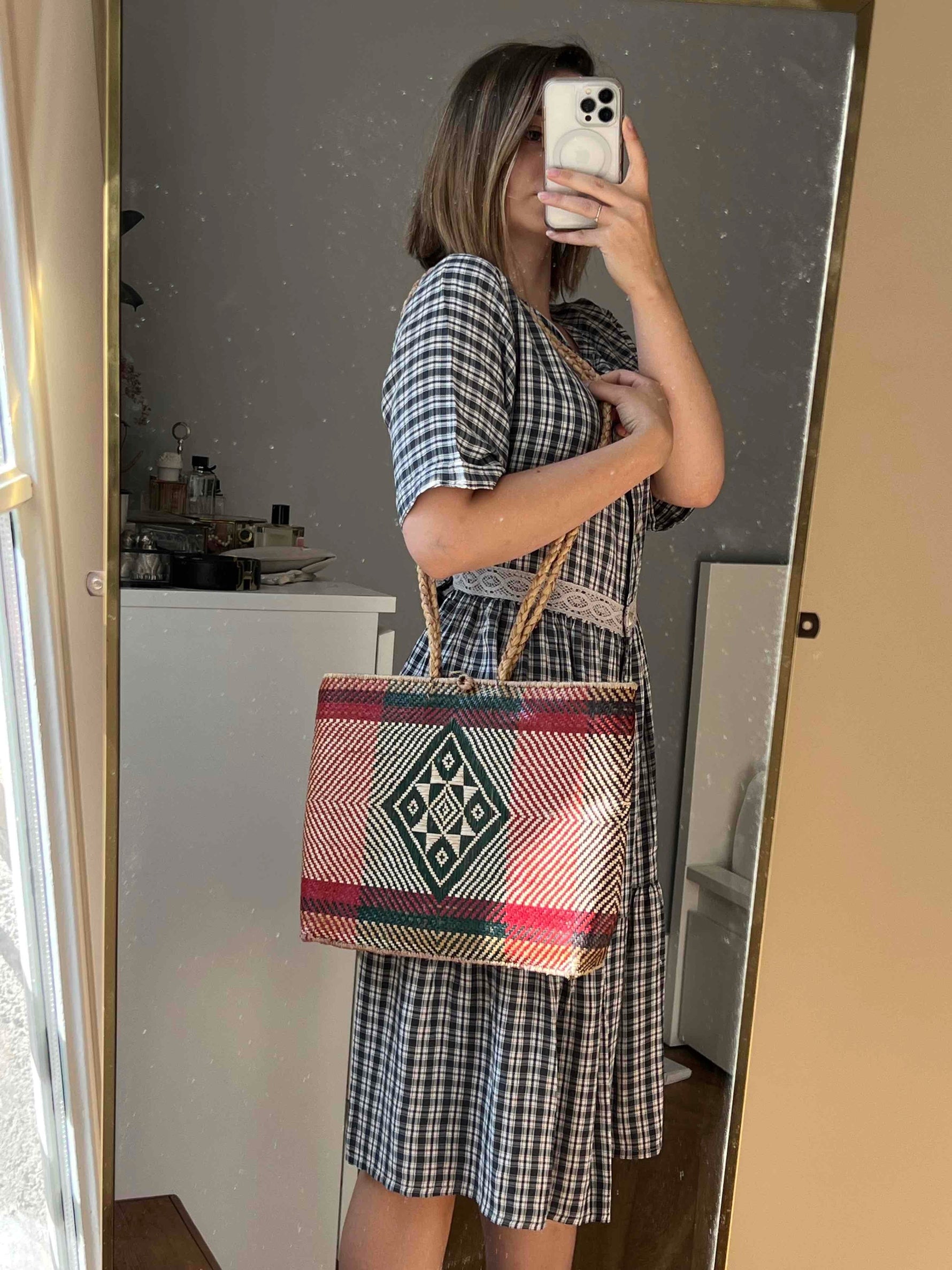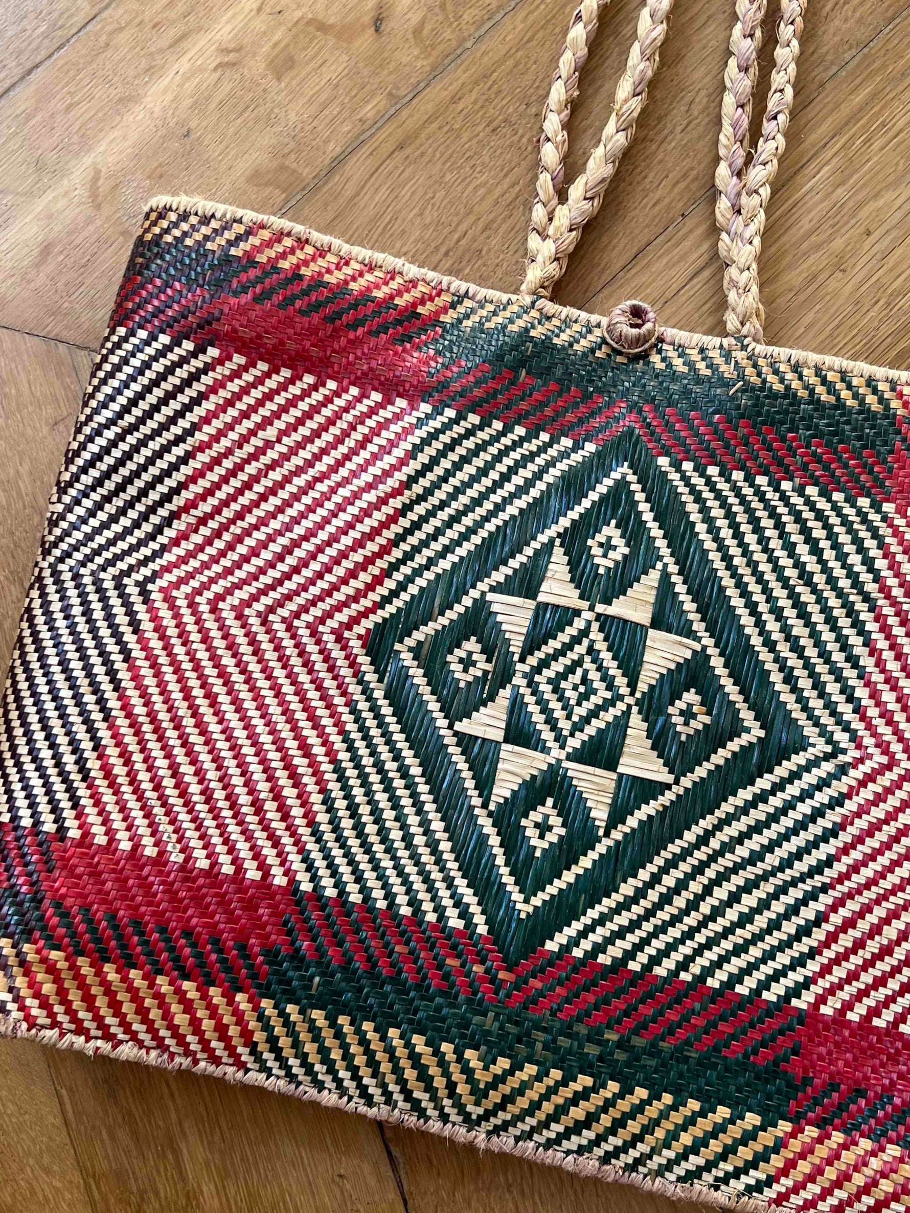 Prix unitaire parPanier en osier/paille beige avec un motif vert foncé et rouge. Longues anses permettant un porte épaule confortable. Fermeture par un petit bouton en osier. Parfait état, aucun défaut dans la paille. Un intemporel idéal pour la plage ou le marché !