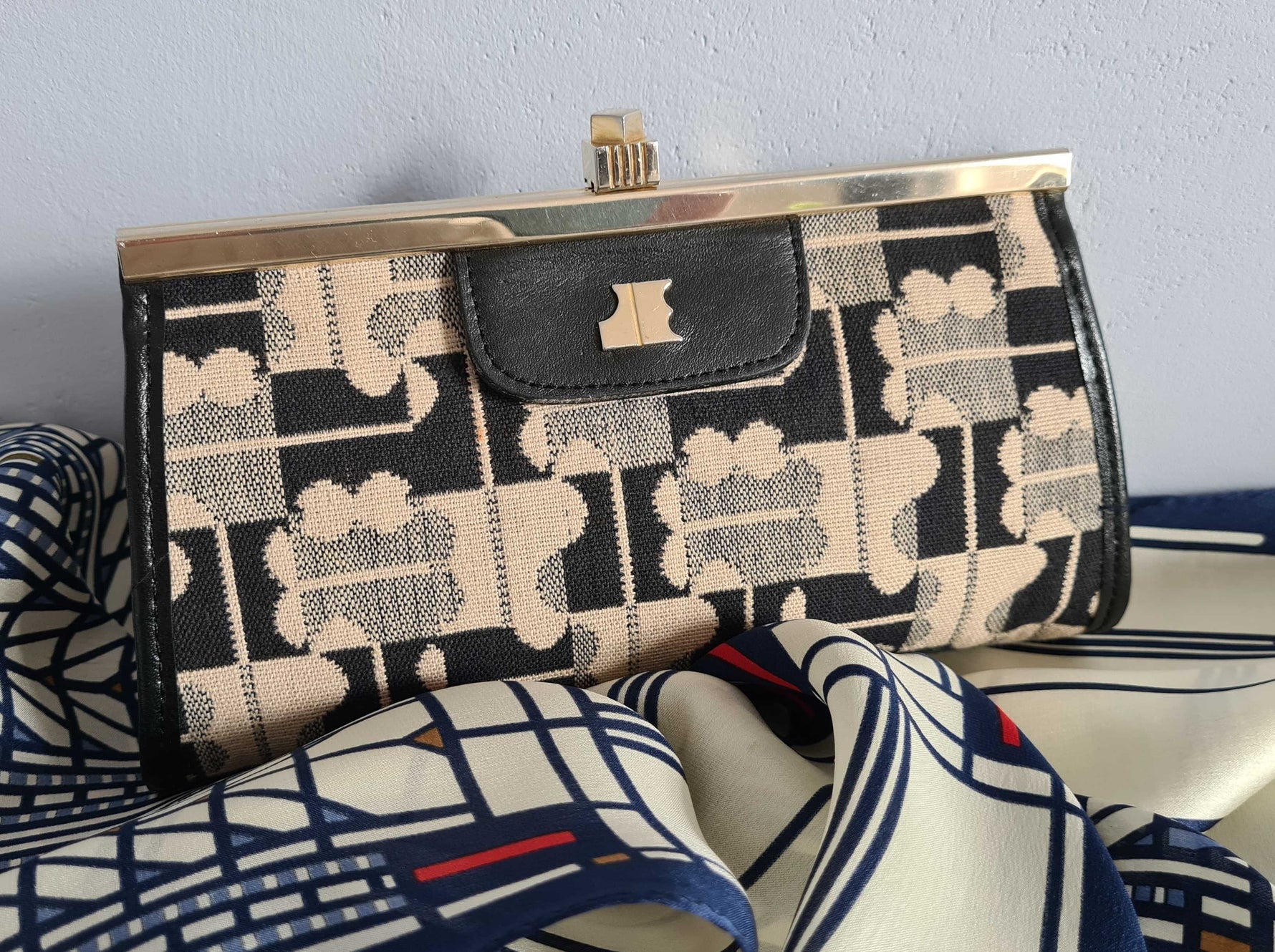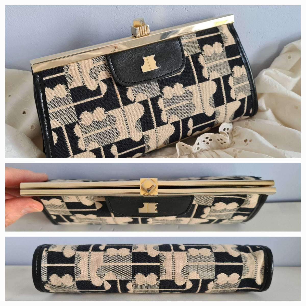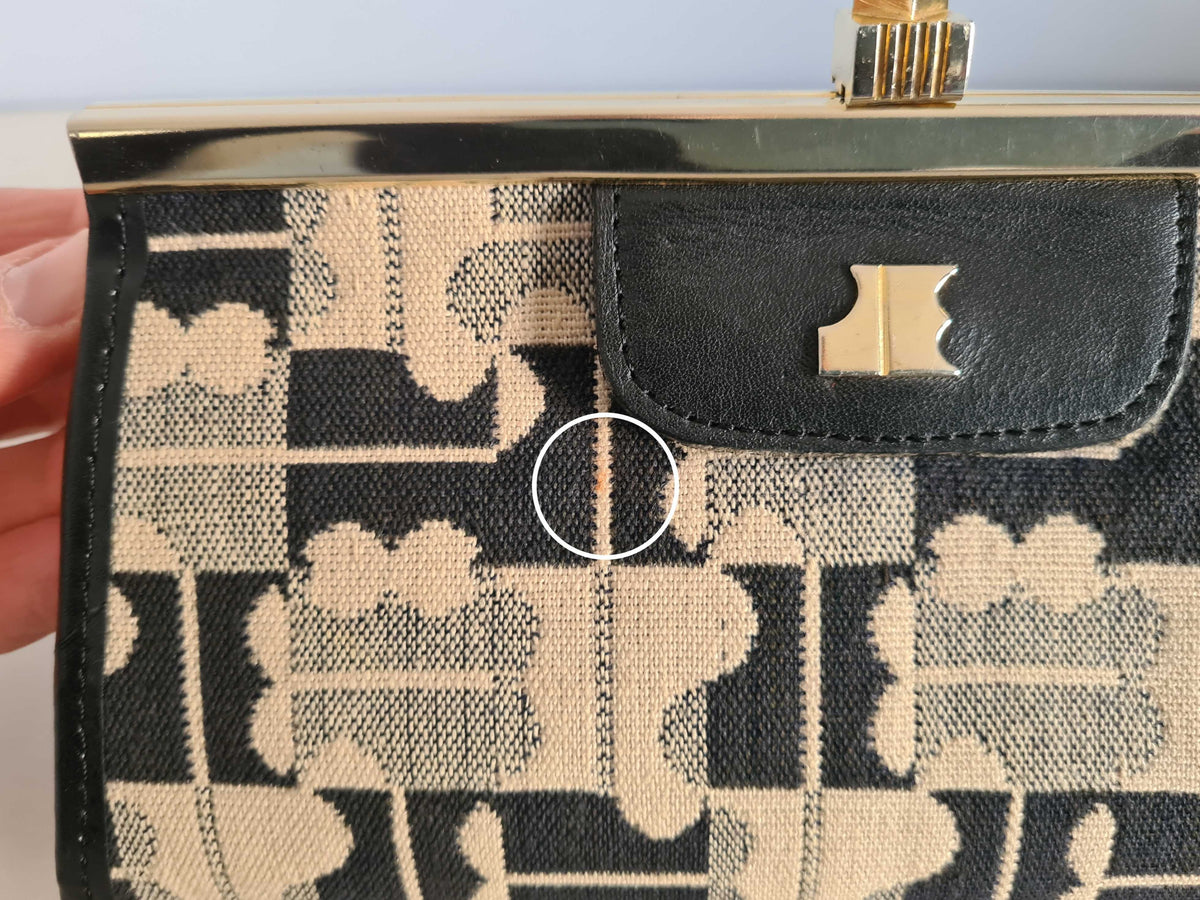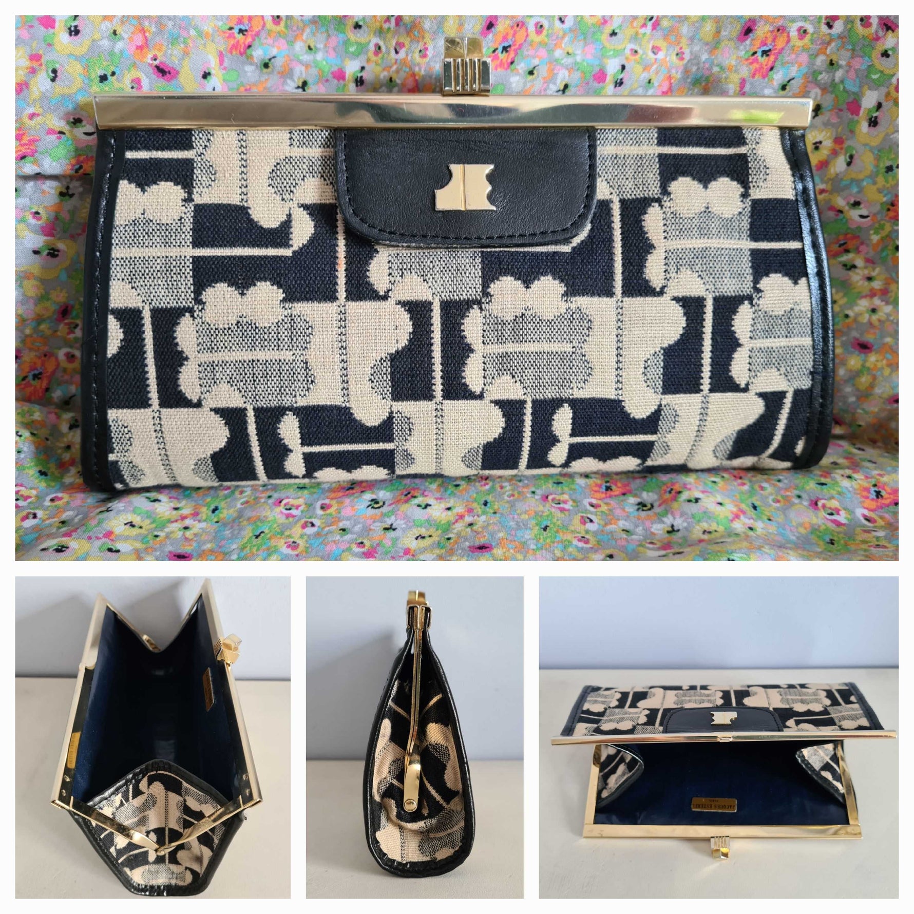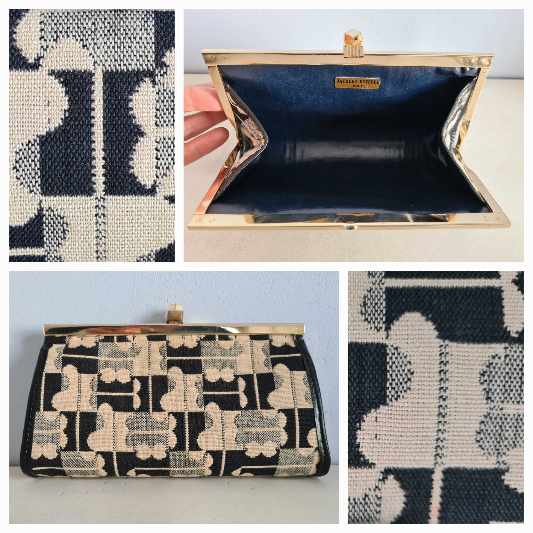 Pochette Jacques Esterel en toile monogrammée bleu nuit et beige des années 70.