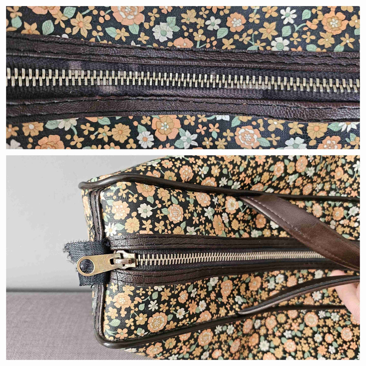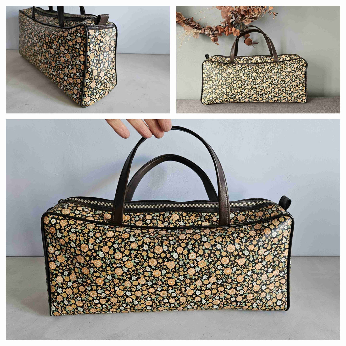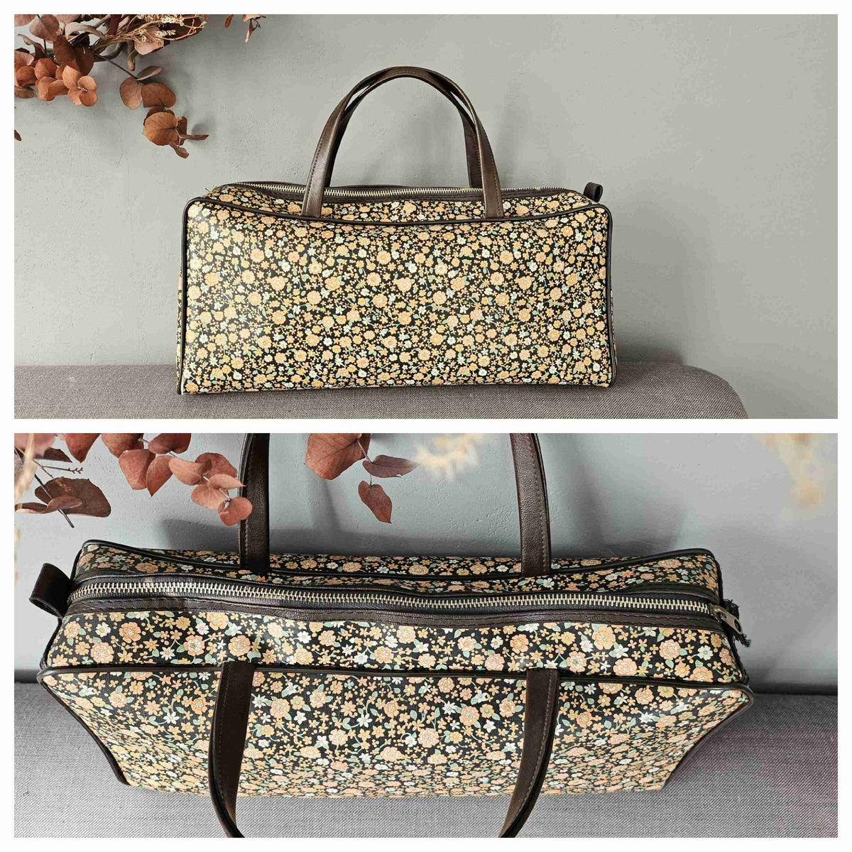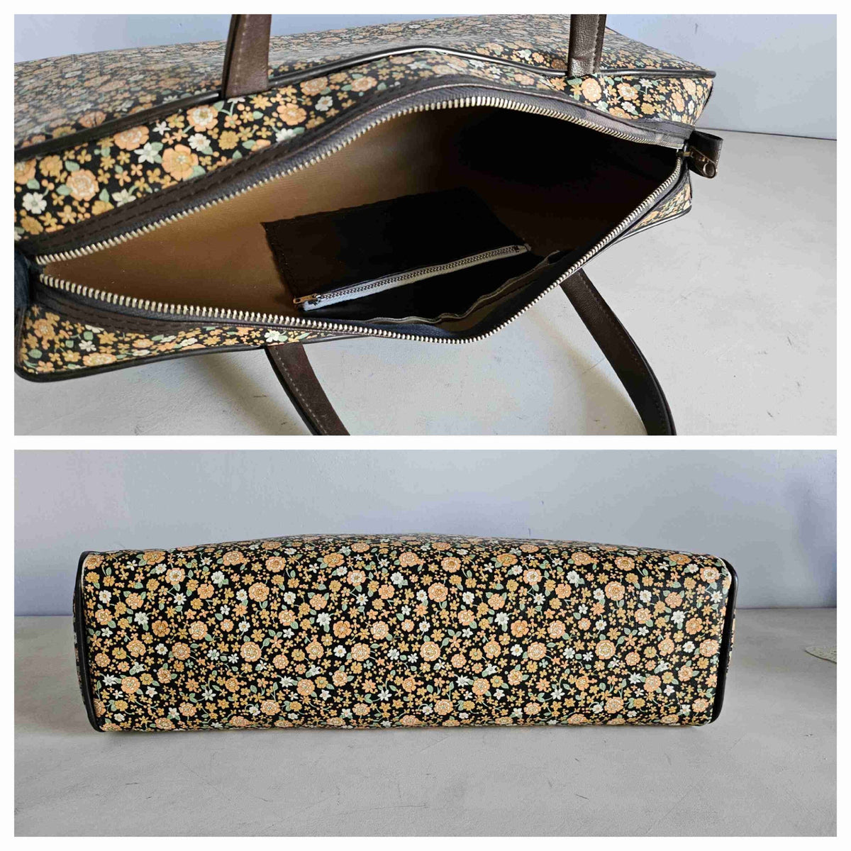 Sac 70' en faux cuir imprimé Liberty abricot, écru et vert tendre sur fond marron, deux anses, fermeture éclair, petite poche intérieure zippée.